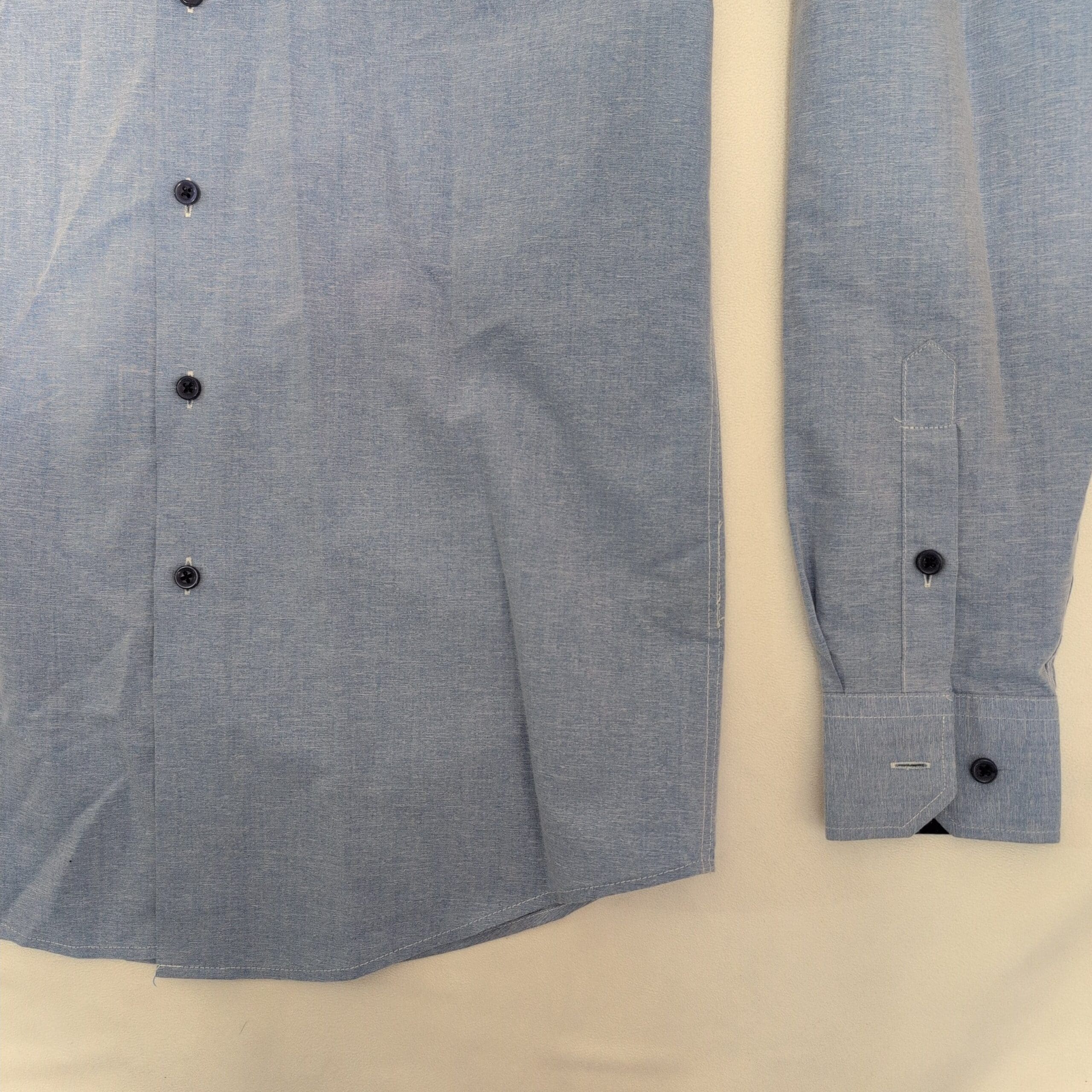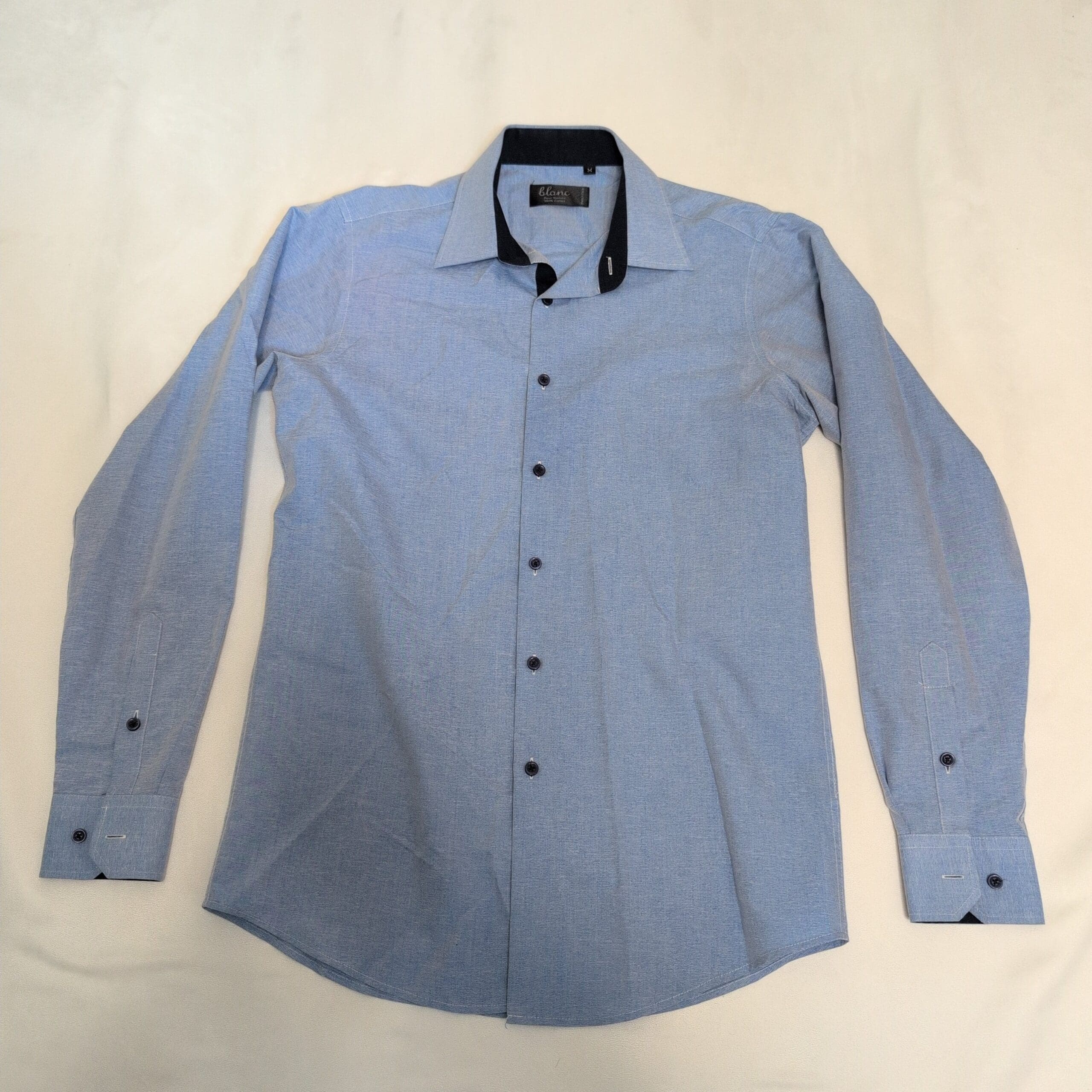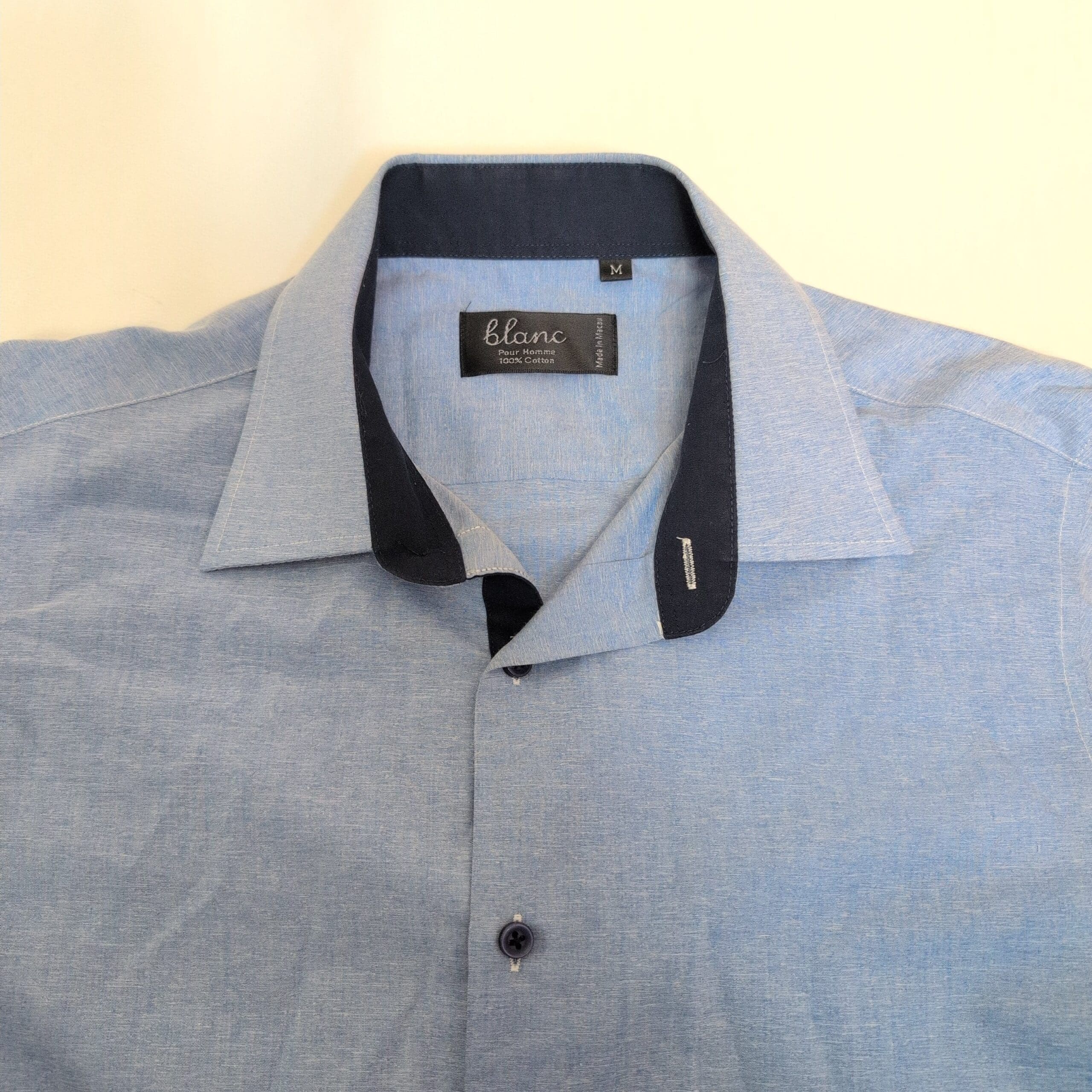 Blanc men’s long-sleeve casual button-down in light heathered blue. Size M (standard). Features a spread collar with contrasting dark inner trim, navy buttons, adjustable cuffs, and a curved hem — versatile for office or smart-casual wear.
