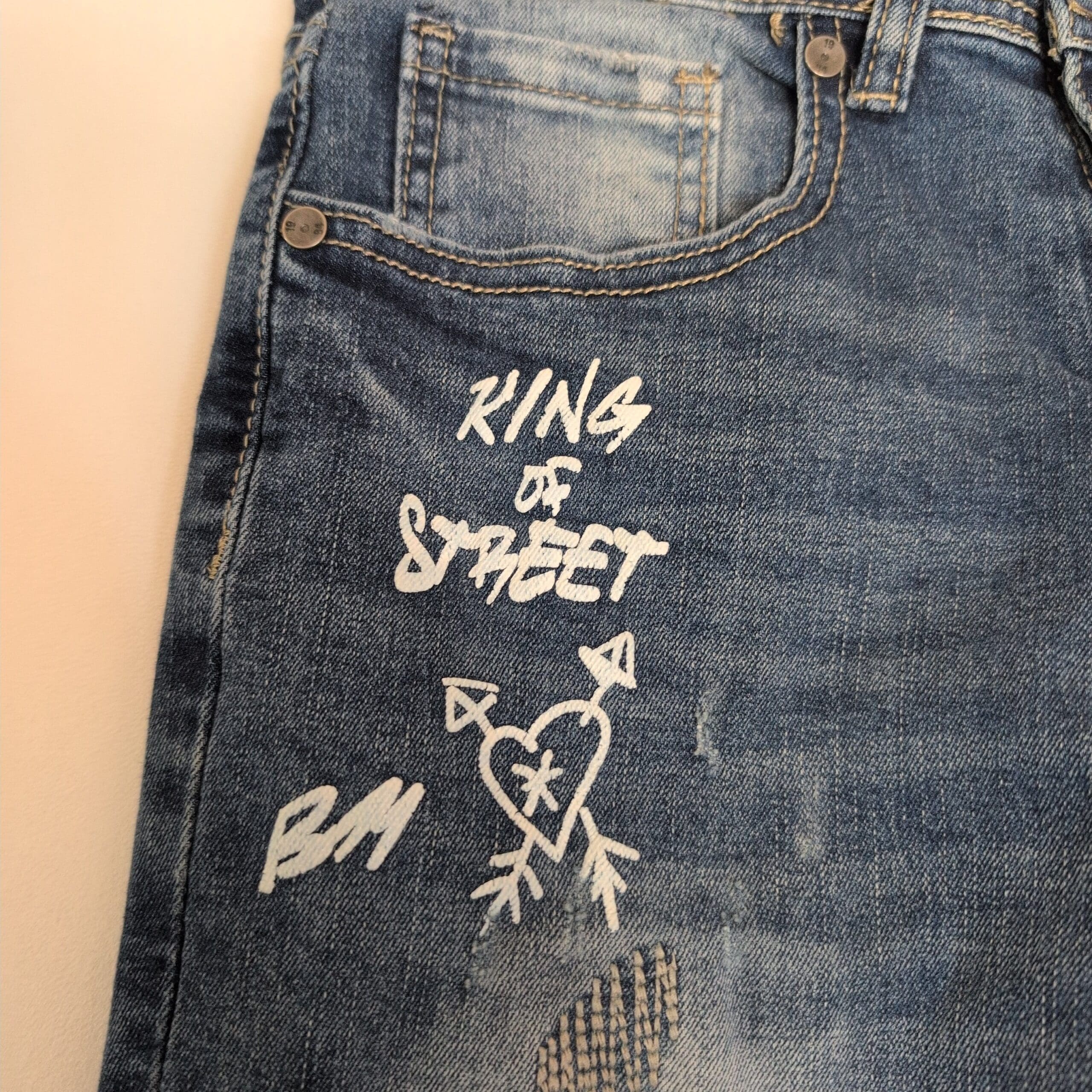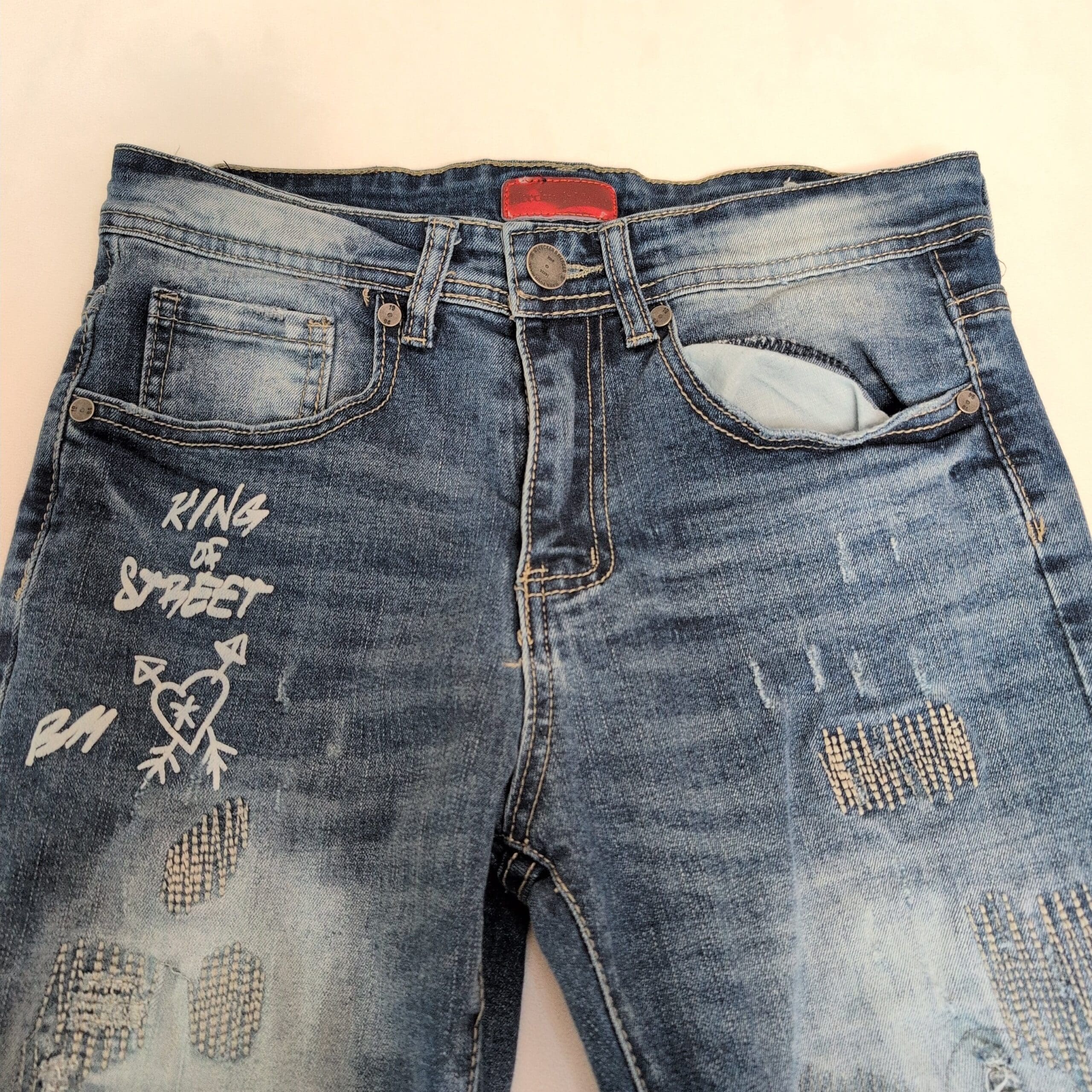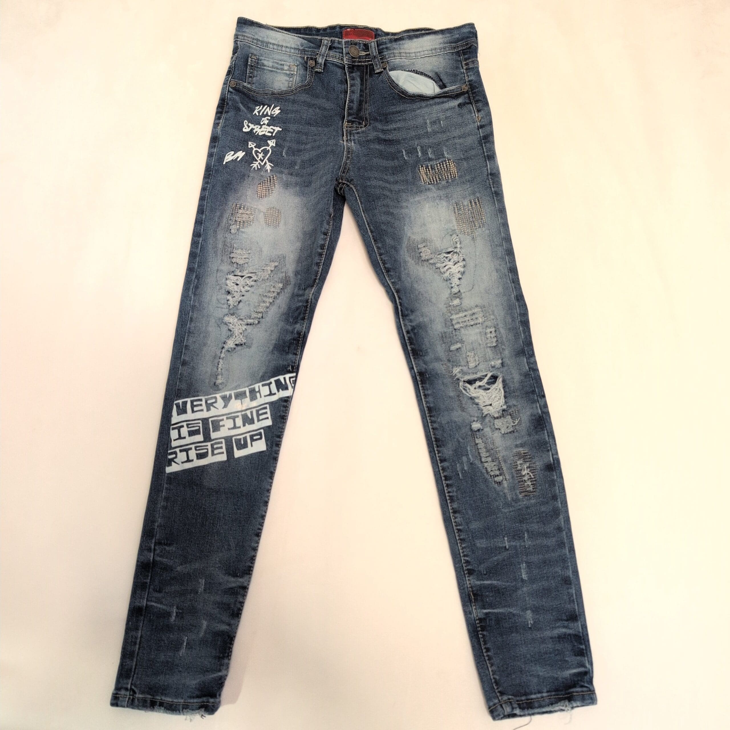 Bleeker & Mercer men’s skinny jeans in blue, waist 29 (standard). Slim, modern skinny silhouette with intentional distressing, patched repairs and white stencil-style graphics on the thigh and lower leg. Features frayed hems, ripped panels and a small graphic near the pocket — these details are part of the designed streetwear look. Red brand label at the waistband. Pre-owned; shows intentional wear consistent with the style but no major damage beyond the designer distressing.