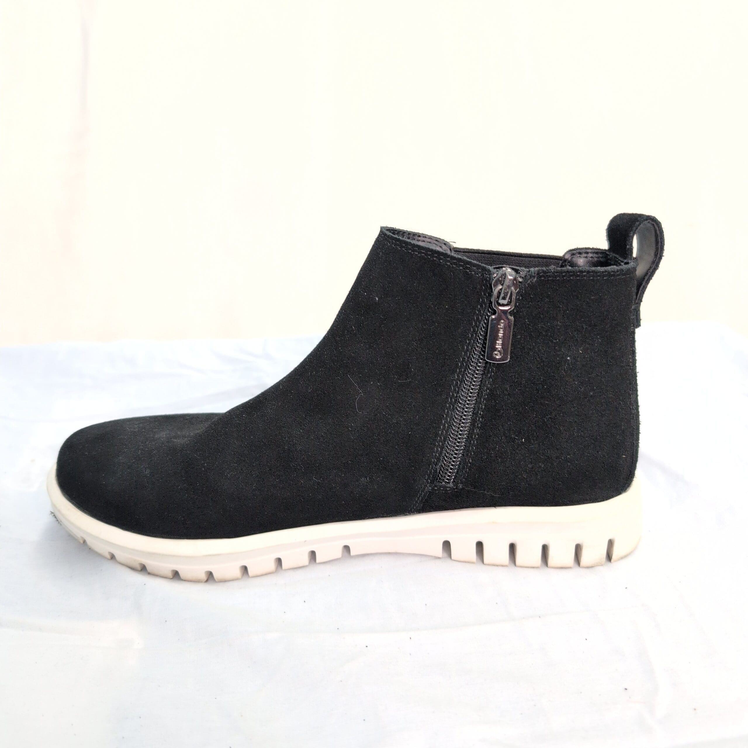 Blondo men’s black suede ankle boots in size 9.5. Chelsea-style silhouette with side zipper and elastic gore for easy on/off, pull tab at the heel, and a light lug rubber sole for traction and everyday wear.