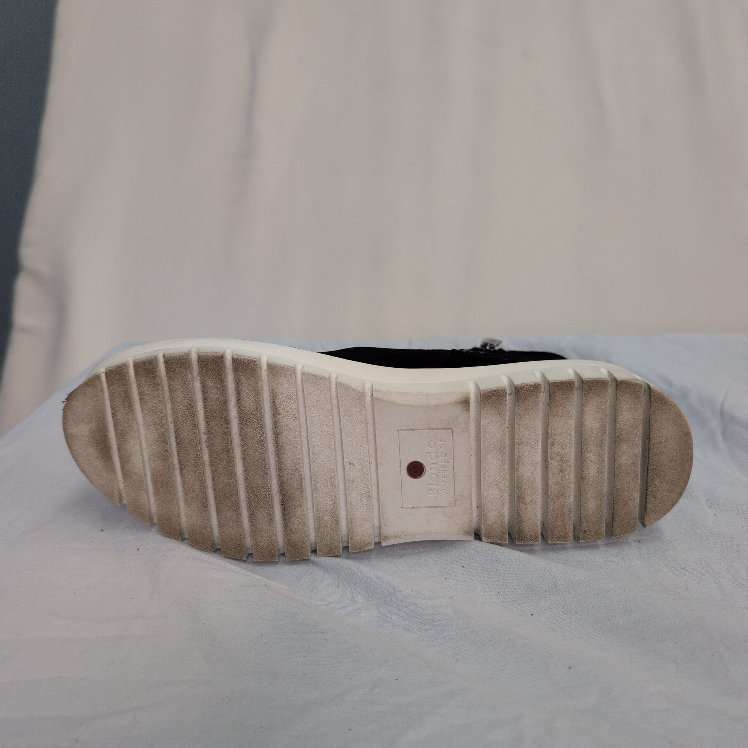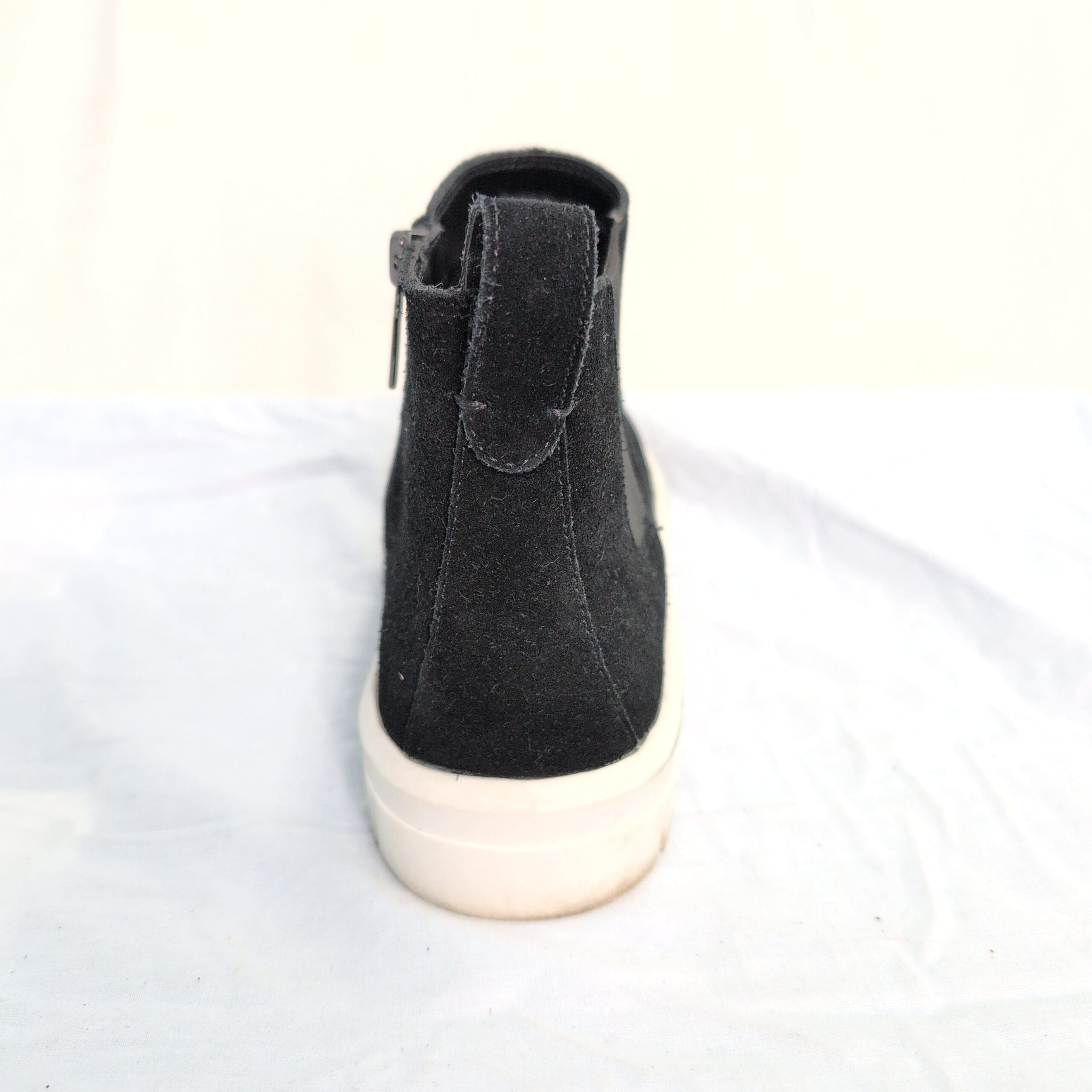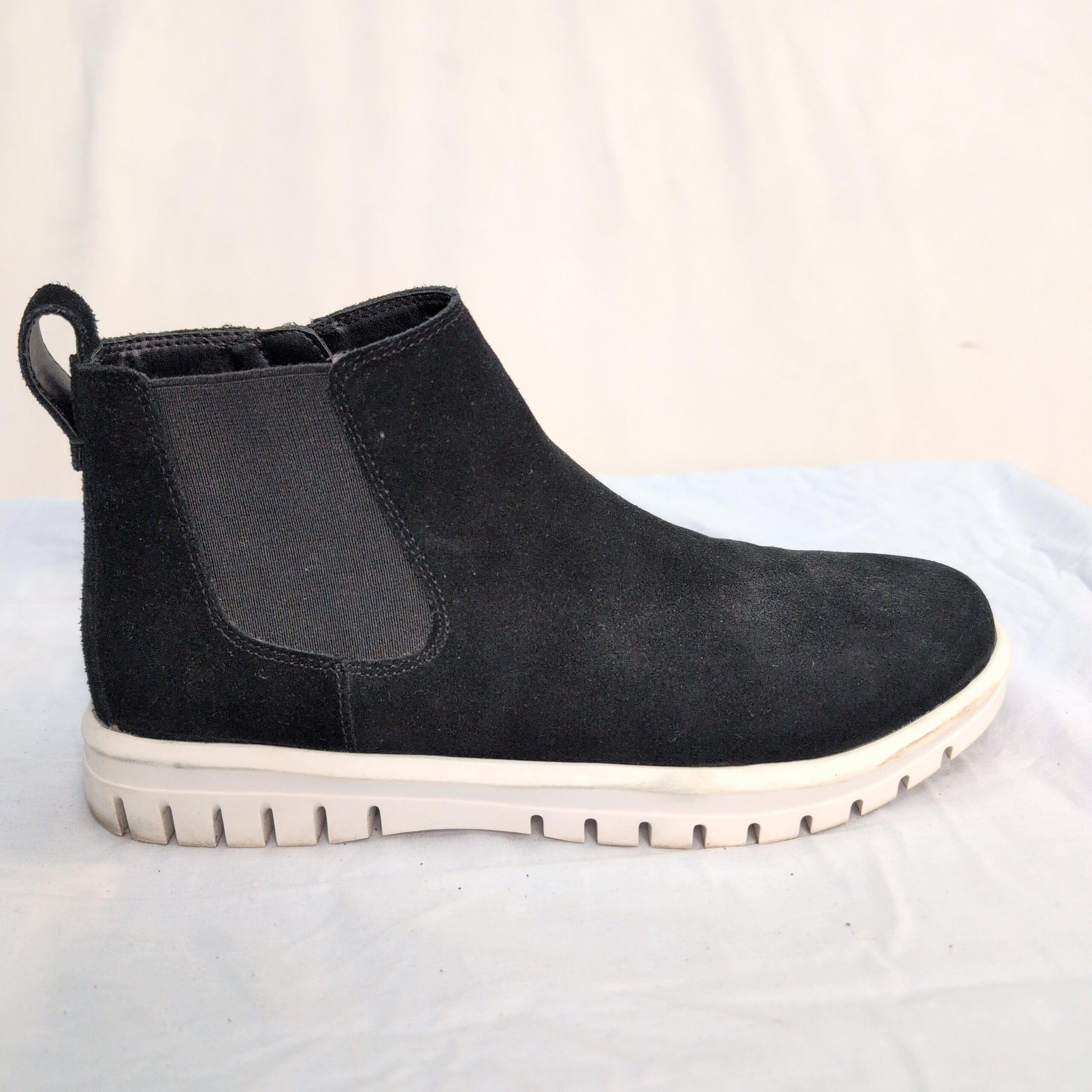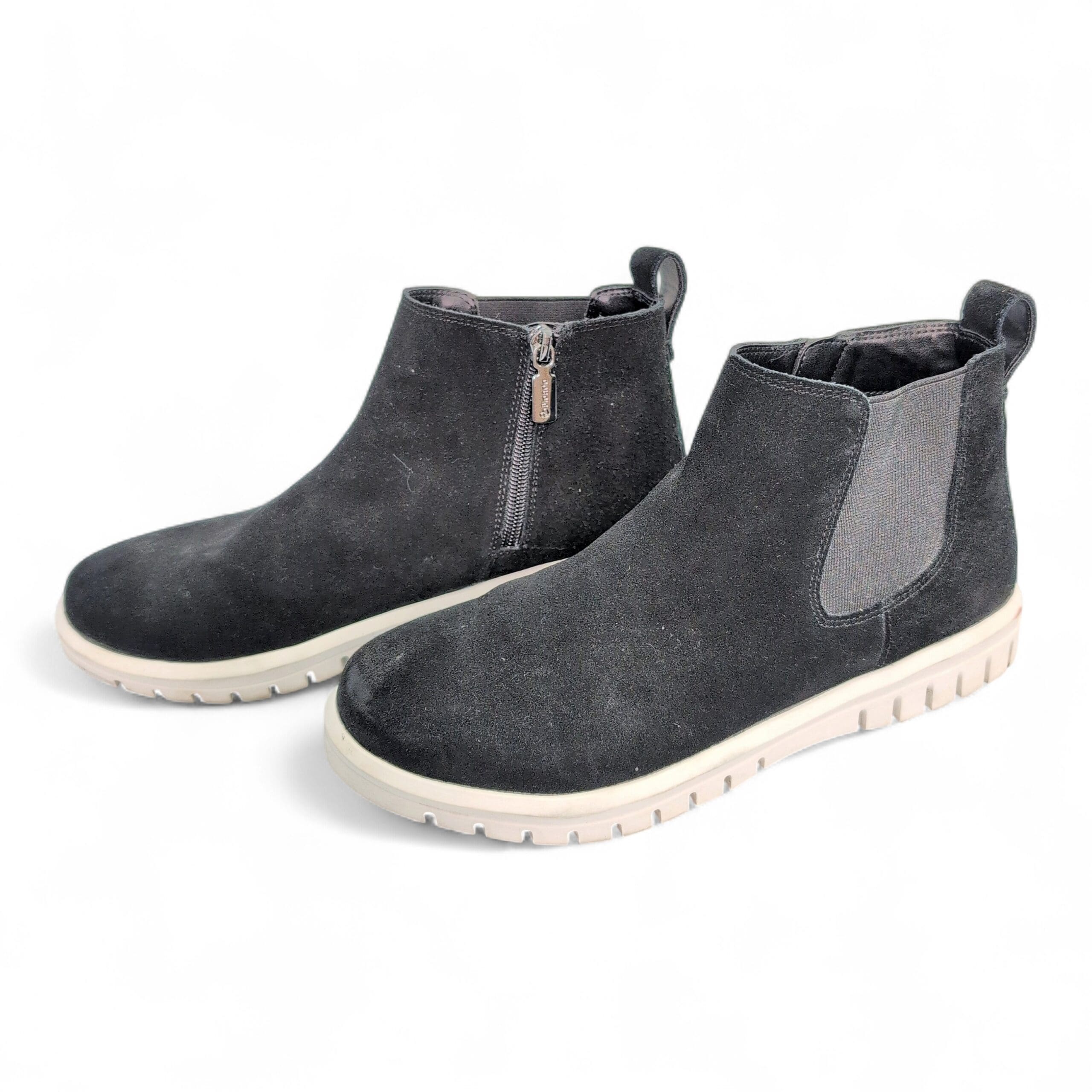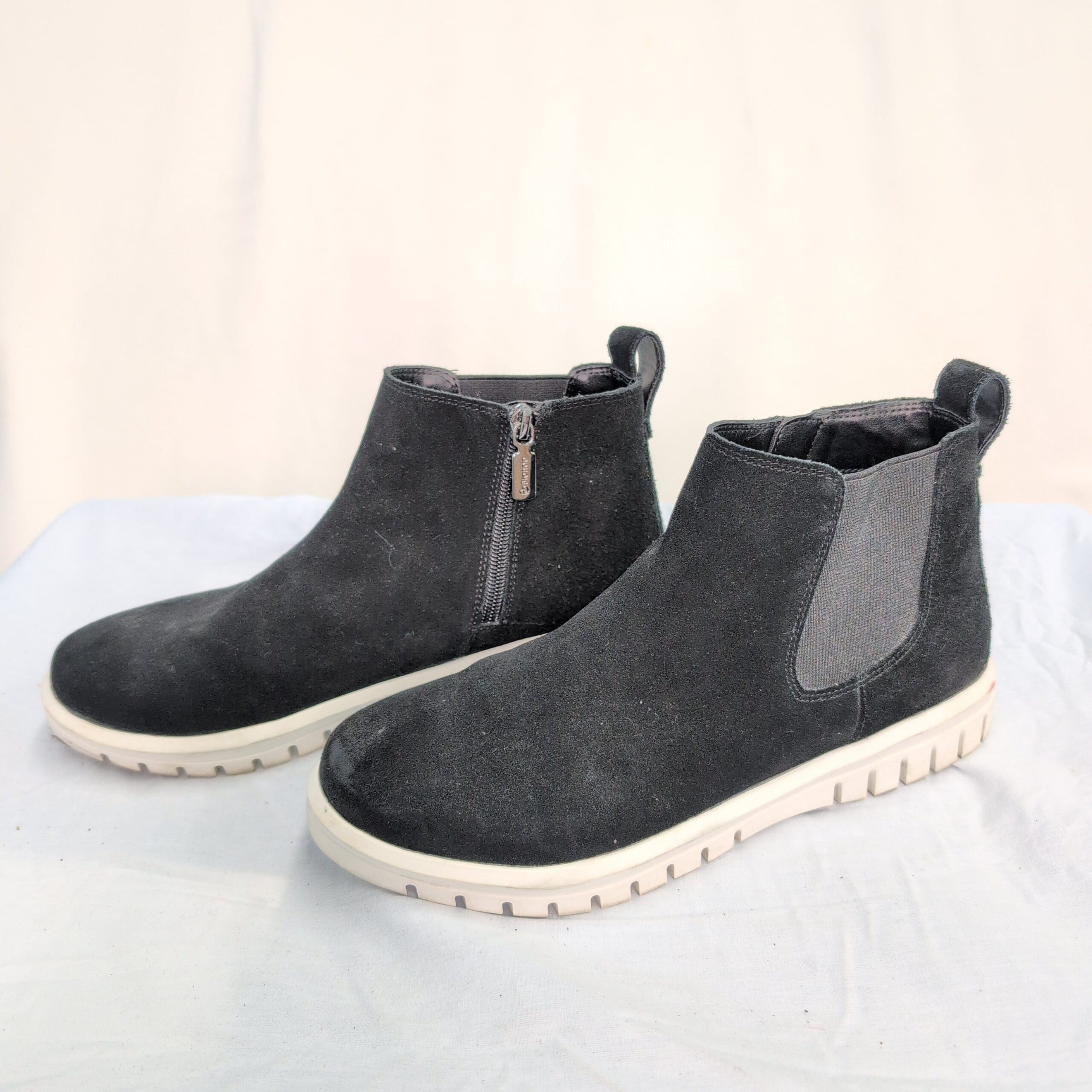 Condition: Gently used and free of major rips, tears, stains, or flaws. Shows typical wear consistent with light use — minor surface scuffs on the suede, some lint/dust, and light soiling on the outsole. Zipper and elastic panels function normally.