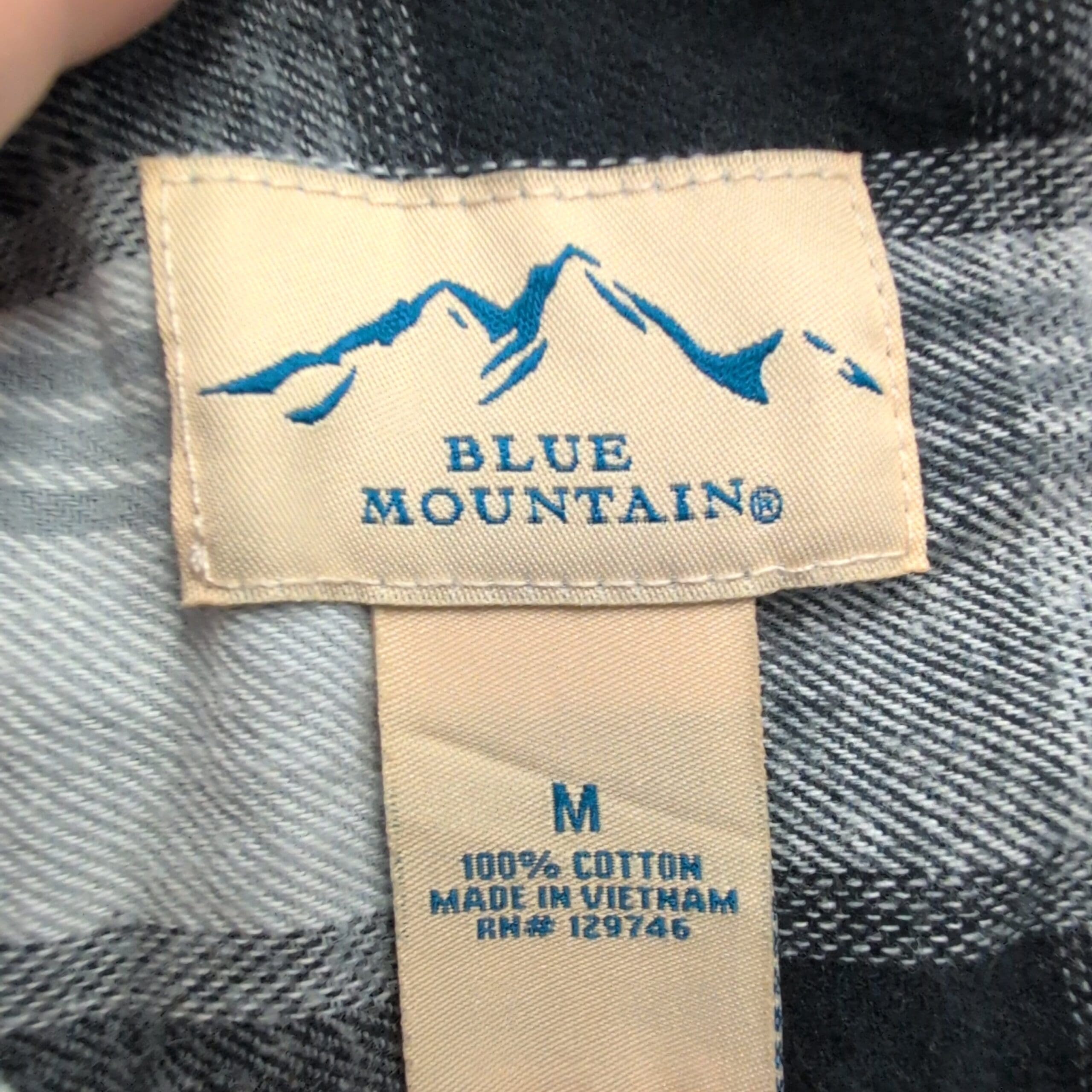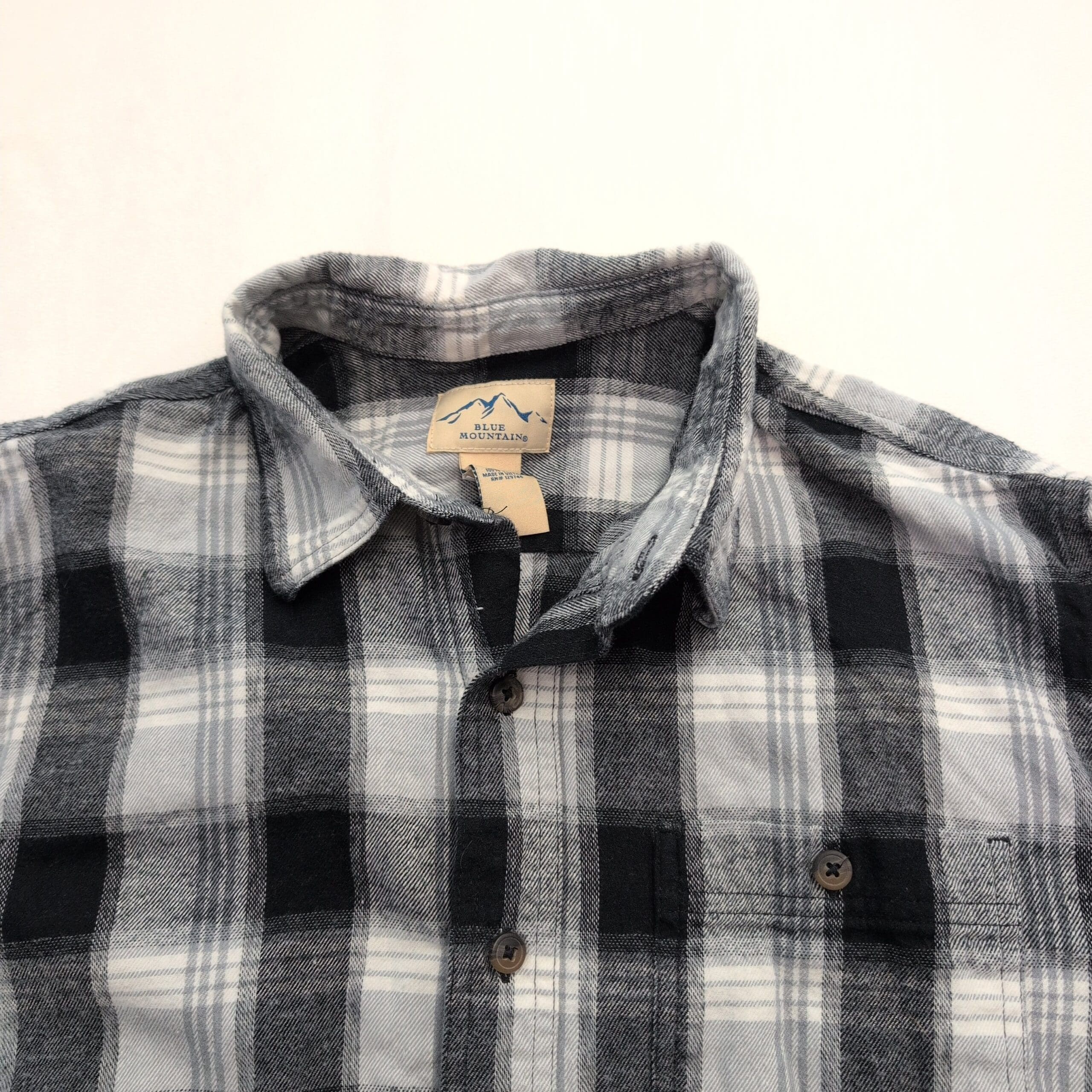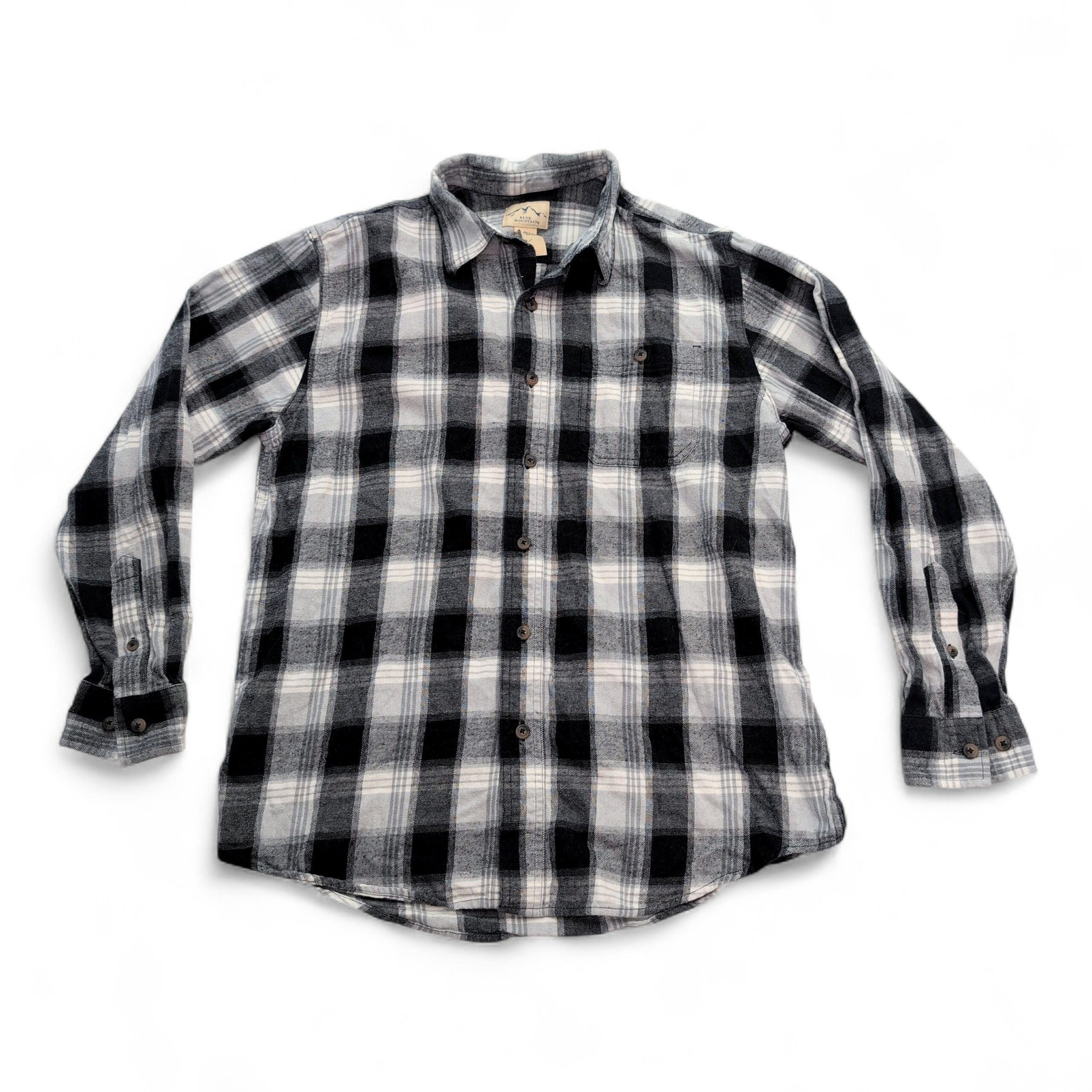 Blue Mountain men’s long-sleeve gray and black plaid flannel button-down in size M. Features a single chest pocket, full button front, button cuffs, and a curved hem — ideal for layering or casual wear. Gently used condition; free of major rips, tears, stains, or flaws. Typical wear may be present — please review photos for details.