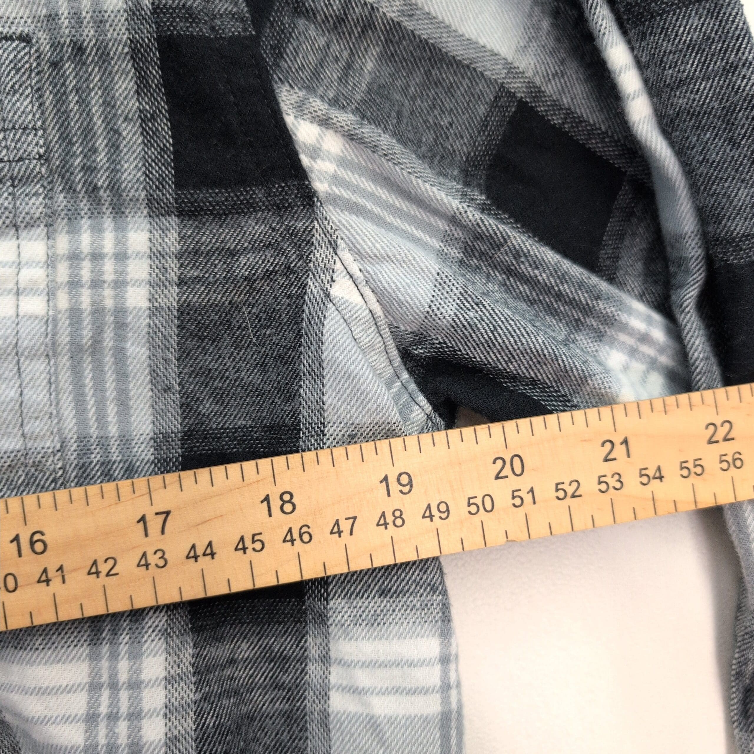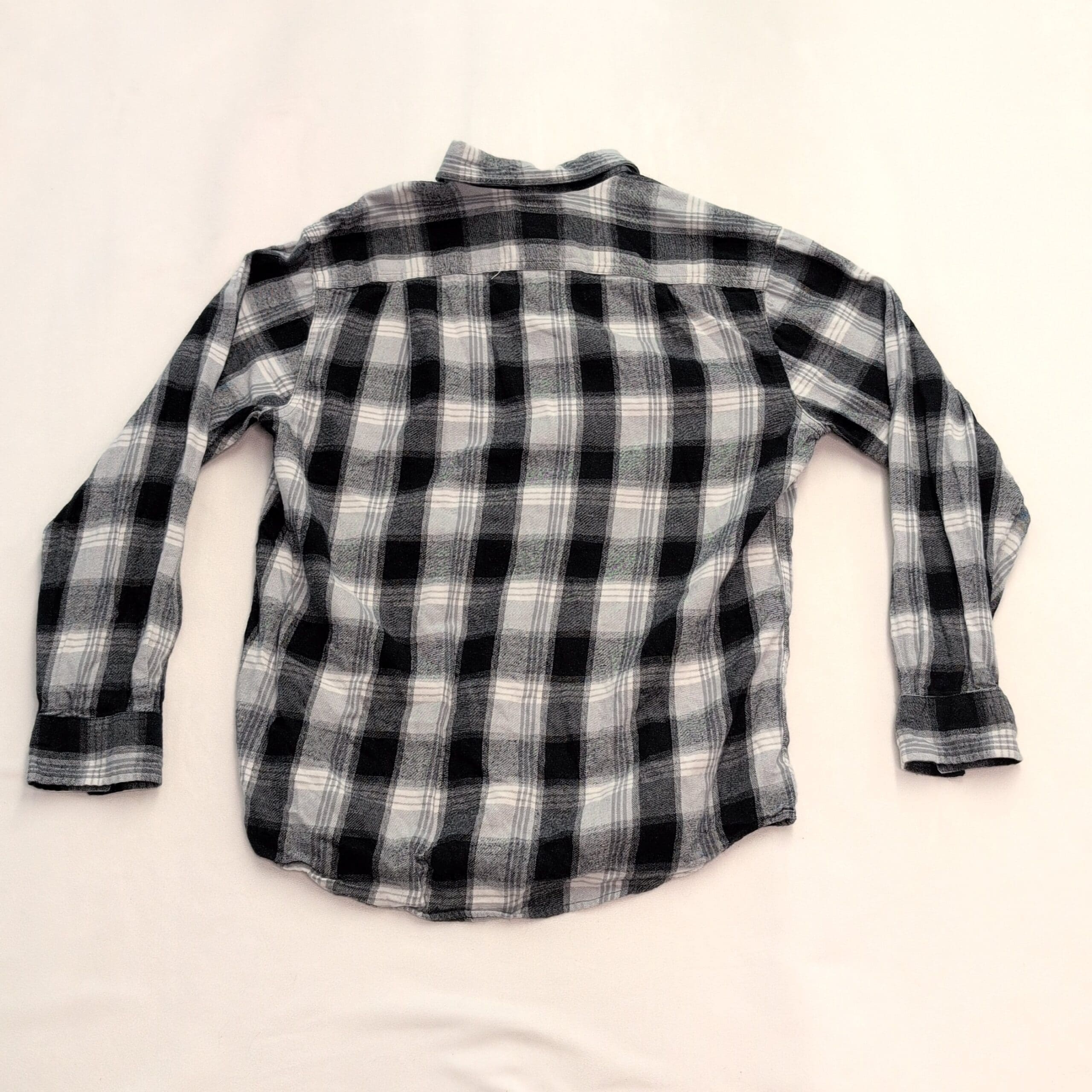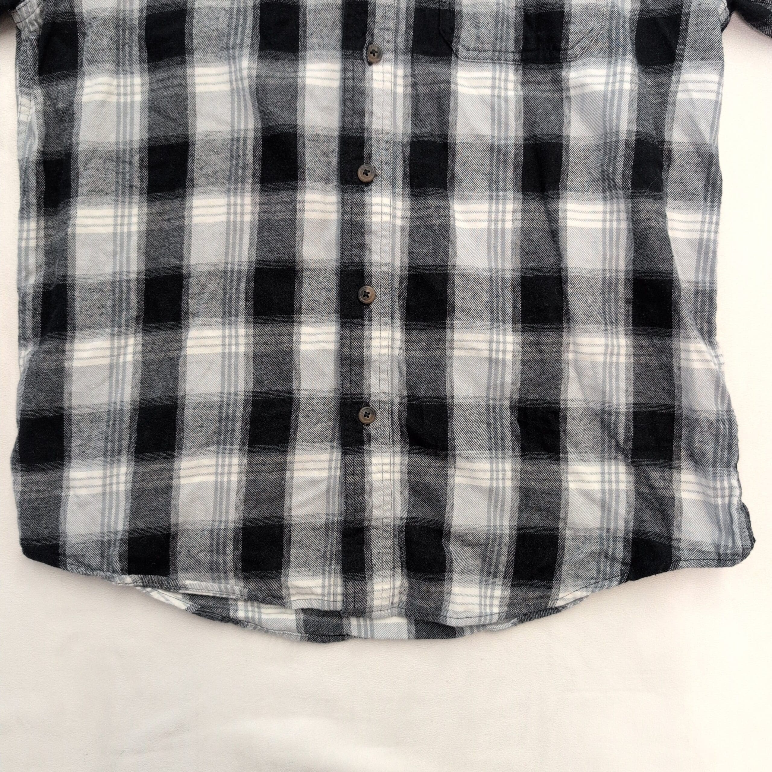 Blue Mountain men’s long-sleeve gray and black plaid flannel button-down in size M. Features a single chest pocket, full button front, button cuffs, and a curved hem — ideal for layering or casual wear. Gently used condition; free of major rips, tears, stains, or flaws. Typical wear may be present — please review photos for details.