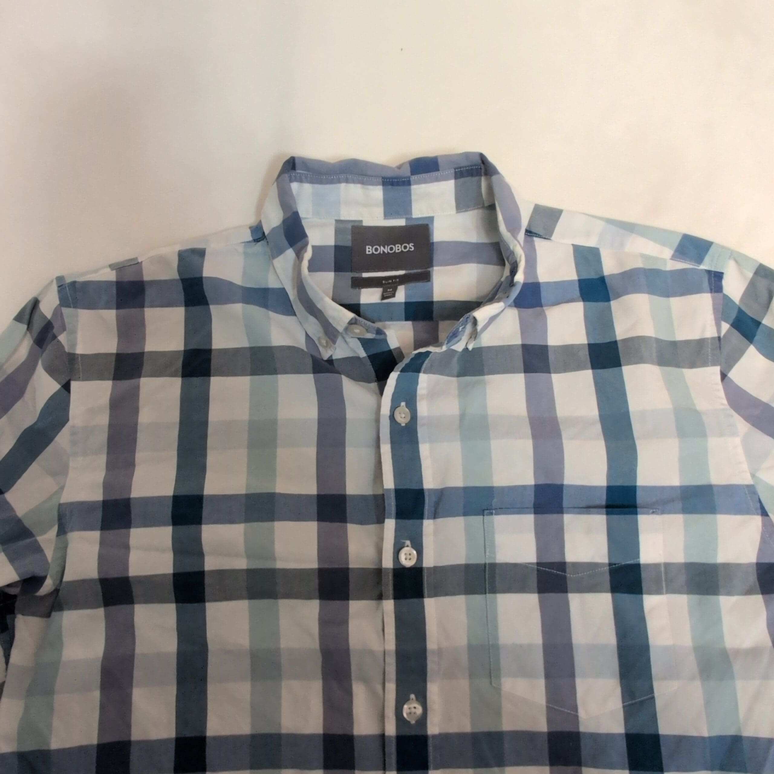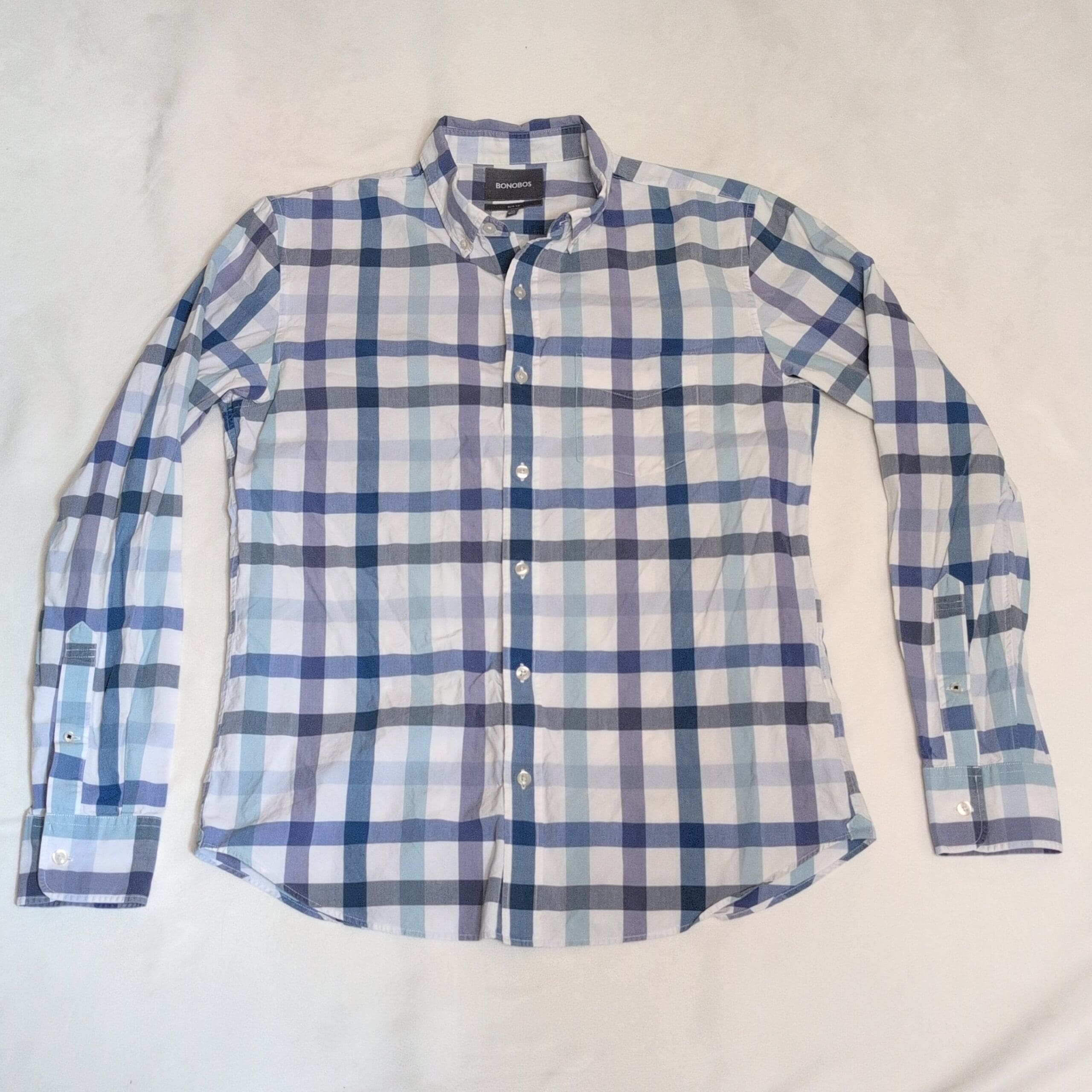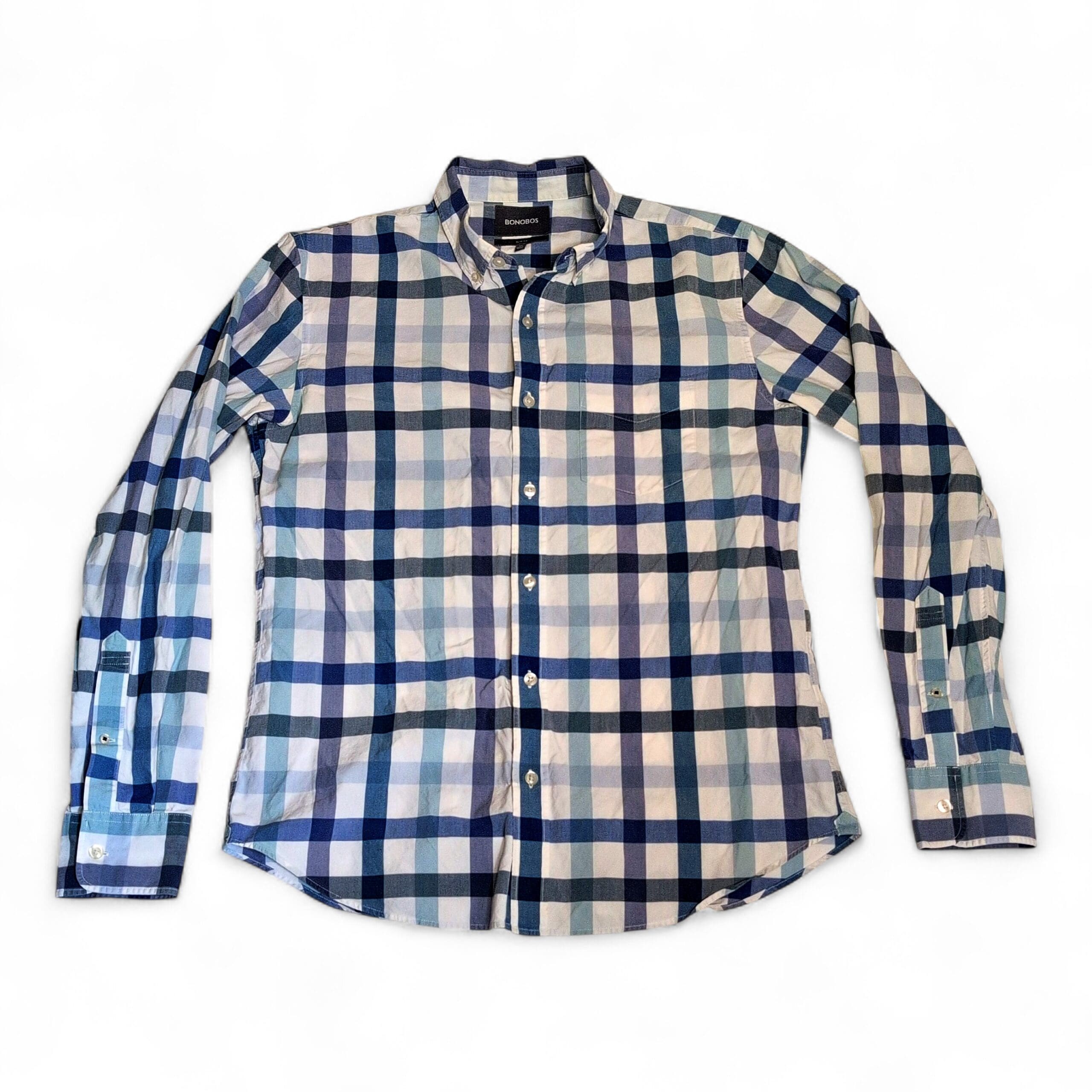Bonobos men’s casual button-down shirt in a blue and white multi-tone plaid with subtle gray accents. Features a button-front, button-down collar, long sleeves with adjustable cuffs, and a curved hem — versatile for casual or smart-casual wear. Gently used condition; free of major rips, tears, stains, or flaws. Typical wear may be present; please review photos for details.