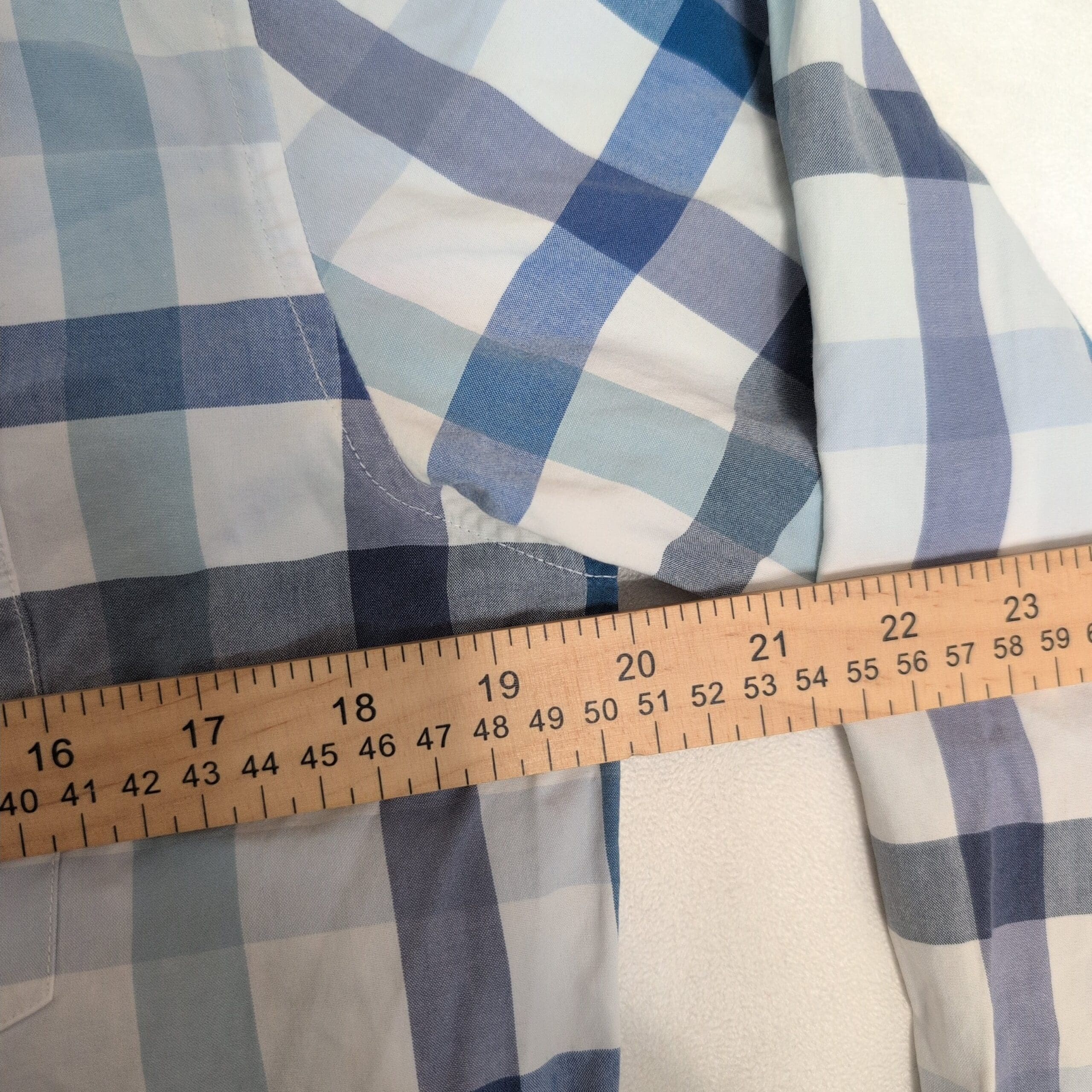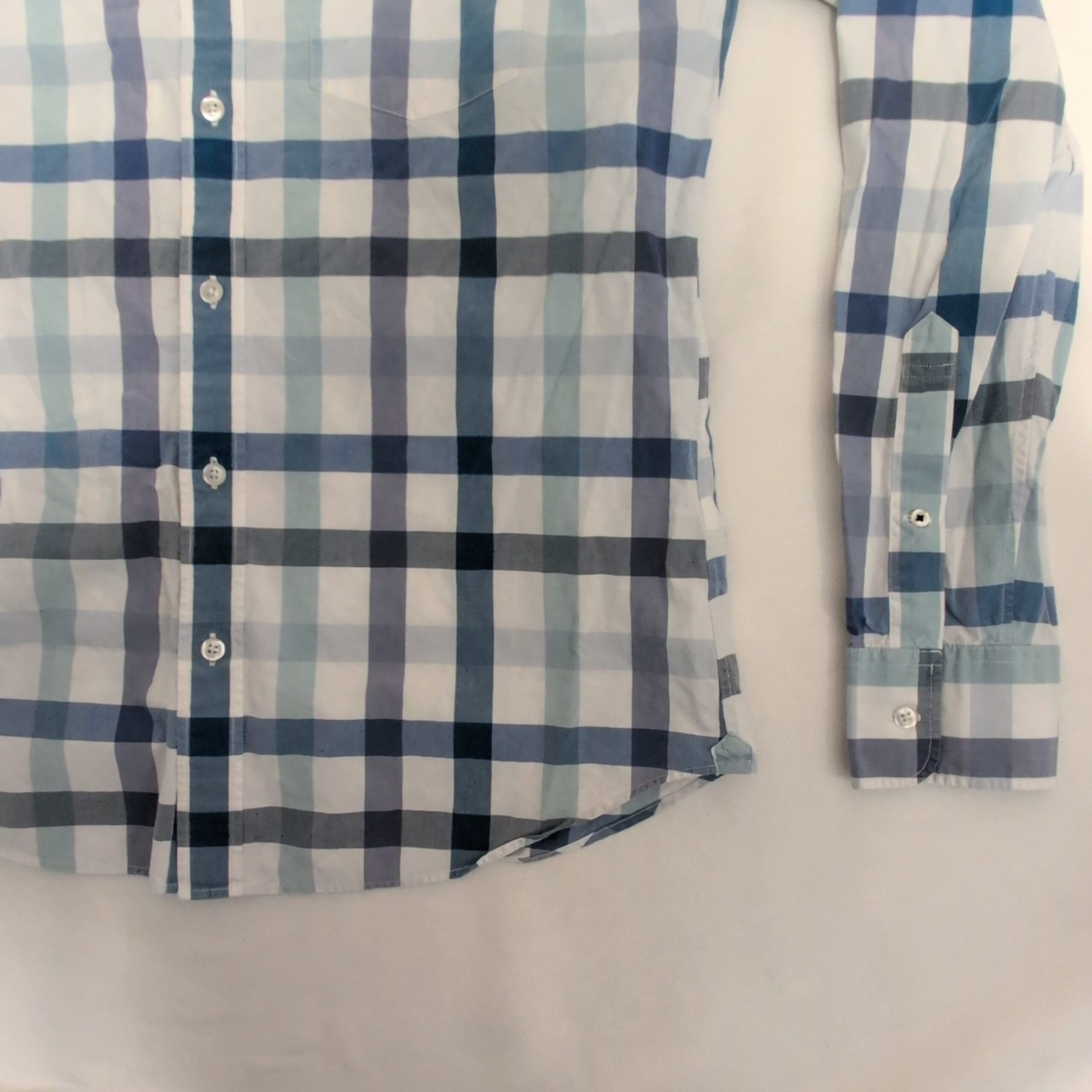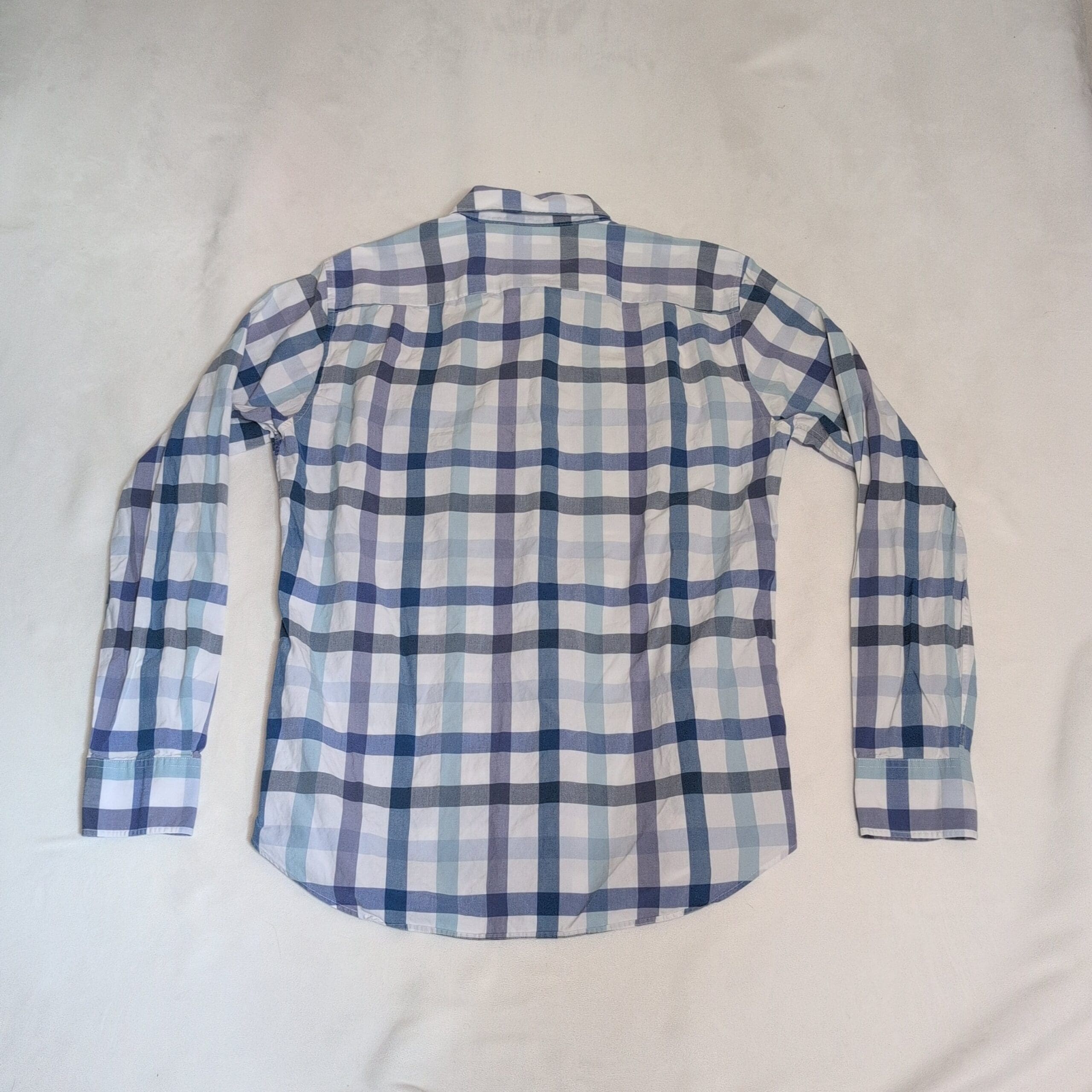 Bonobos men’s casual button-down shirt in a blue and white multi-tone plaid with subtle gray accents. Features a button-front, button-down collar, long sleeves with adjustable cuffs, and a curved hem — versatile for casual or smart-casual wear. Gently used condition; free of major rips, tears, stains, or flaws. Typical wear may be present; please review photos for details.