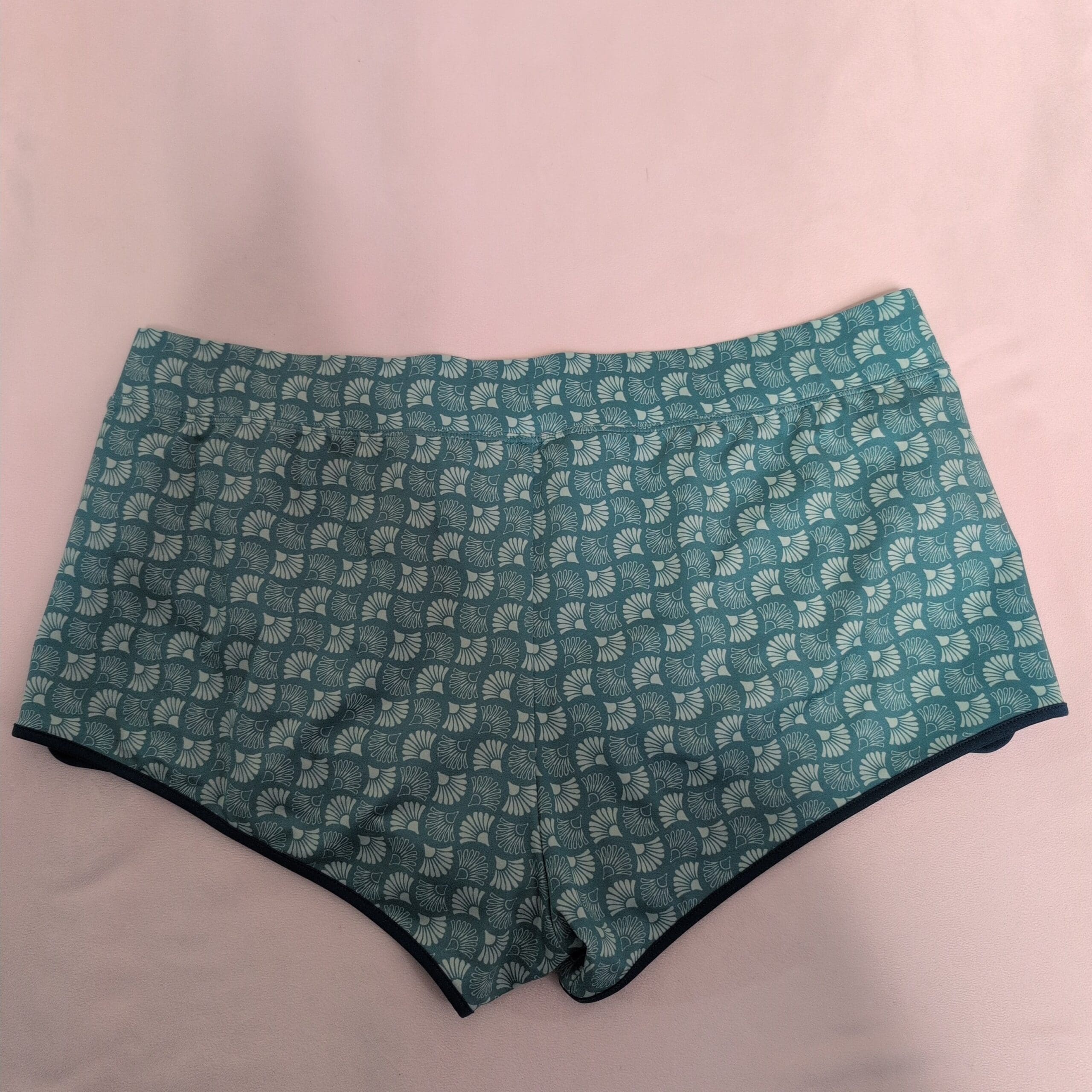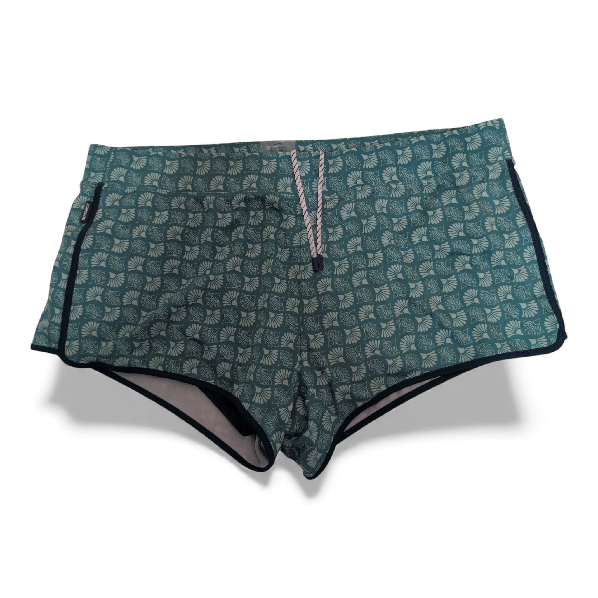 Bonobos women’s athletic shorts in a teal-green geometric print. Features an elastic waistband with an adjustable drawstring, contrast trim and side slits for unrestricted movement. Lightweight, stretchy fabric provides a comfortable fit for running, gym sessions, or everyday athleisure. Size: XL (standard). See photos for details and condition.