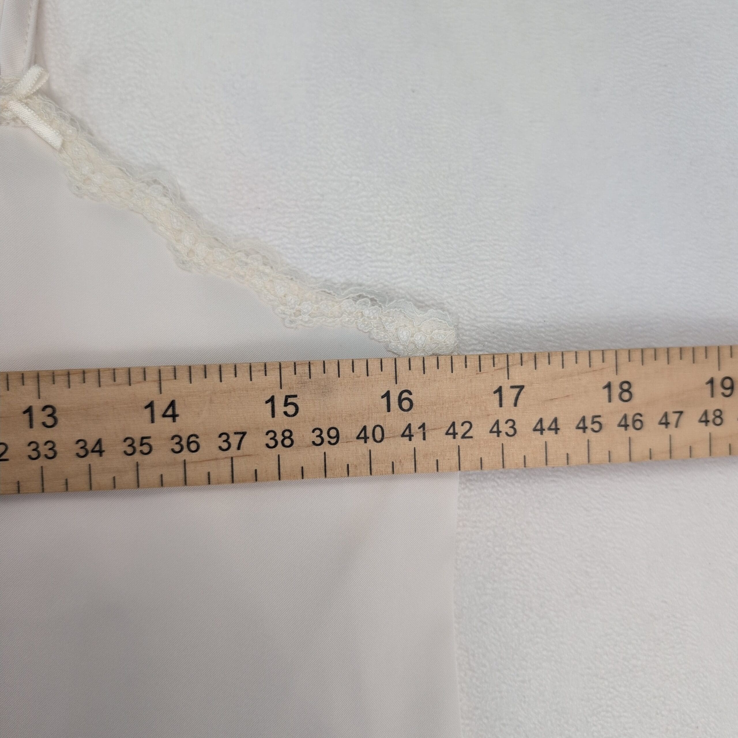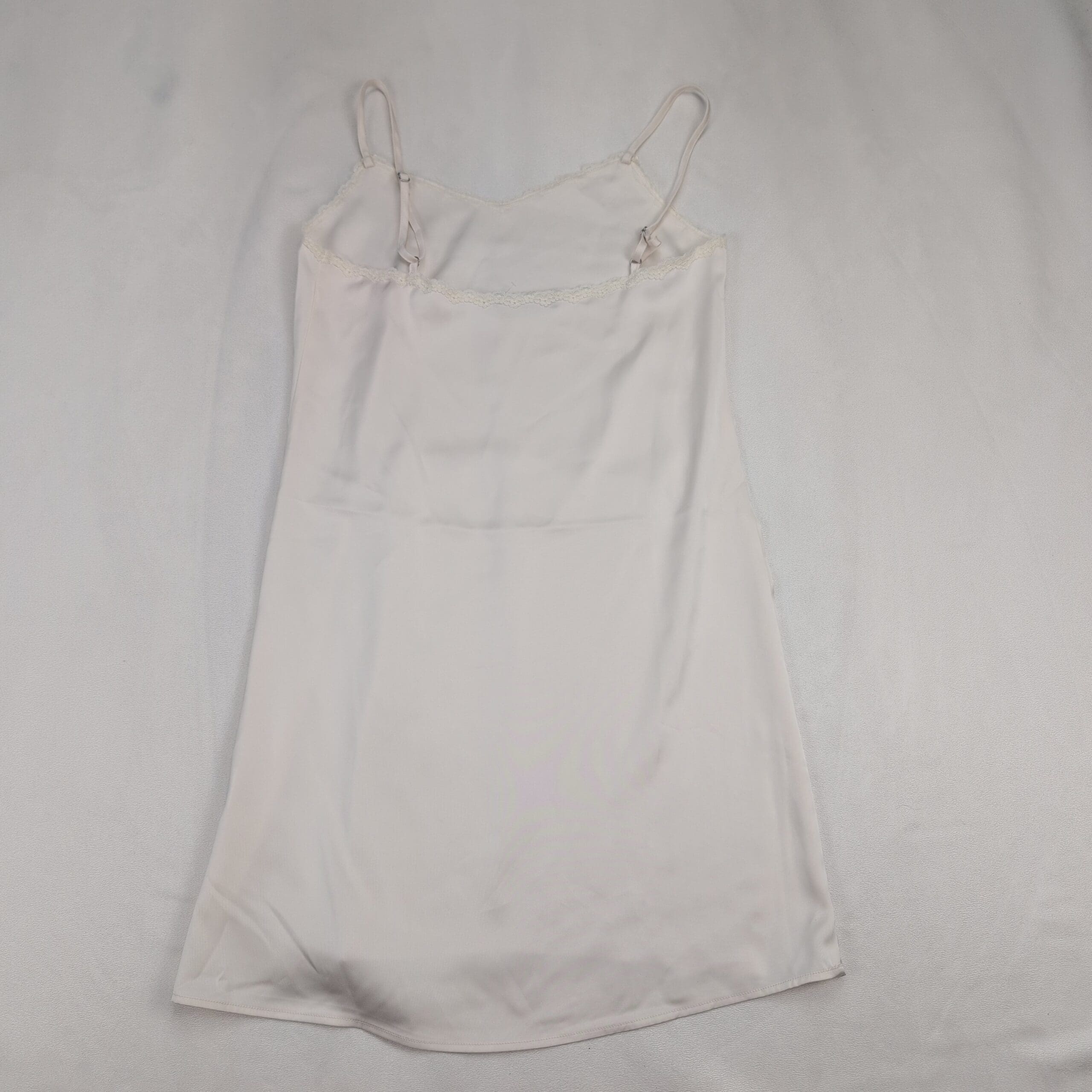 Brandy Melville white lace-trim slip chemise in a lightweight, satin-like fabric. Features delicate lace along the V-neck, thin spaghetti straps, and a softly flared A-line skirt for an easy, flattering silhouette. No size tag — measures like a Medium; please see flat-lay measurements for specific bust details. Excellent used condition and free of major rips, tears, stains, or flaws; typical light wear may be present. Versatile for sleepwear or layered styling.