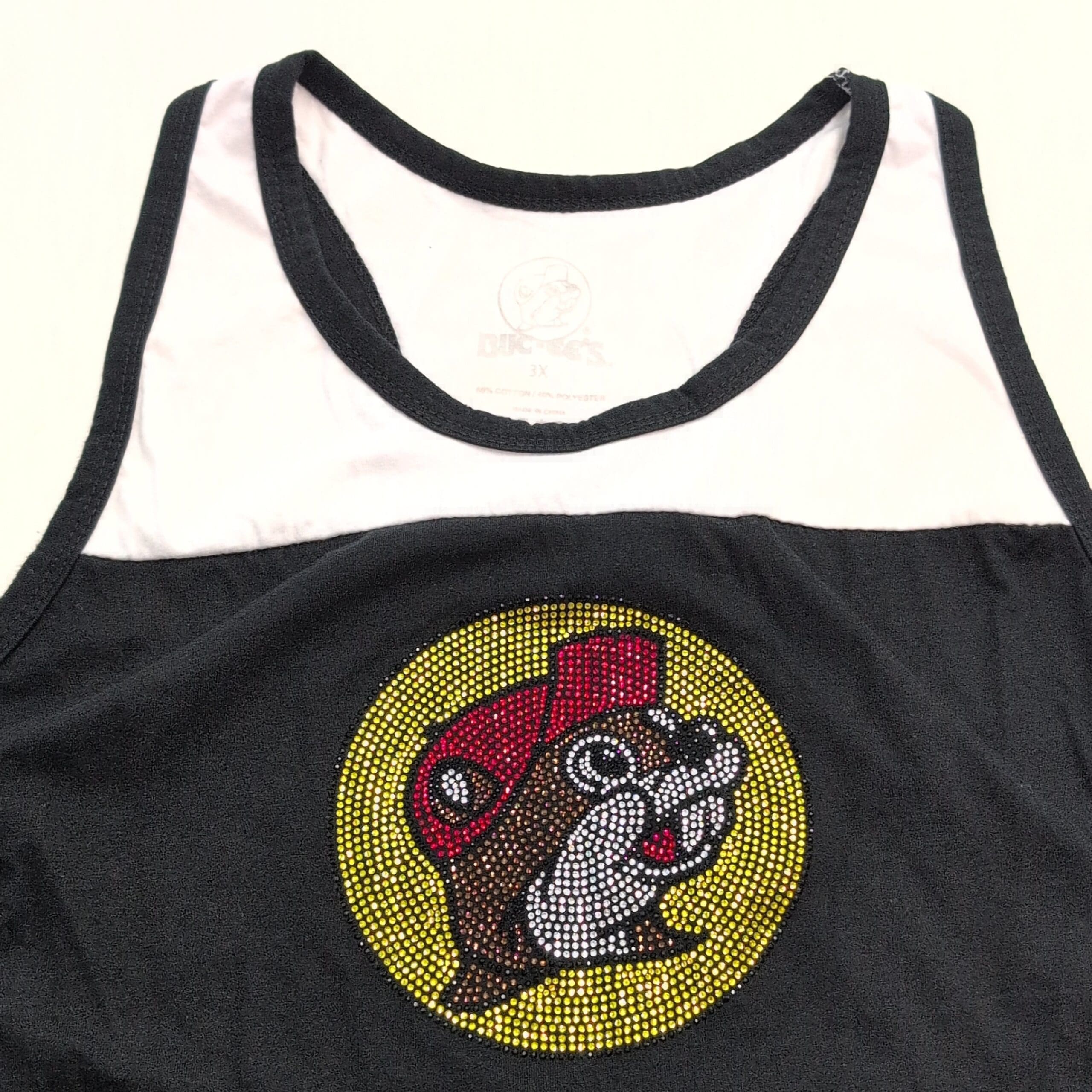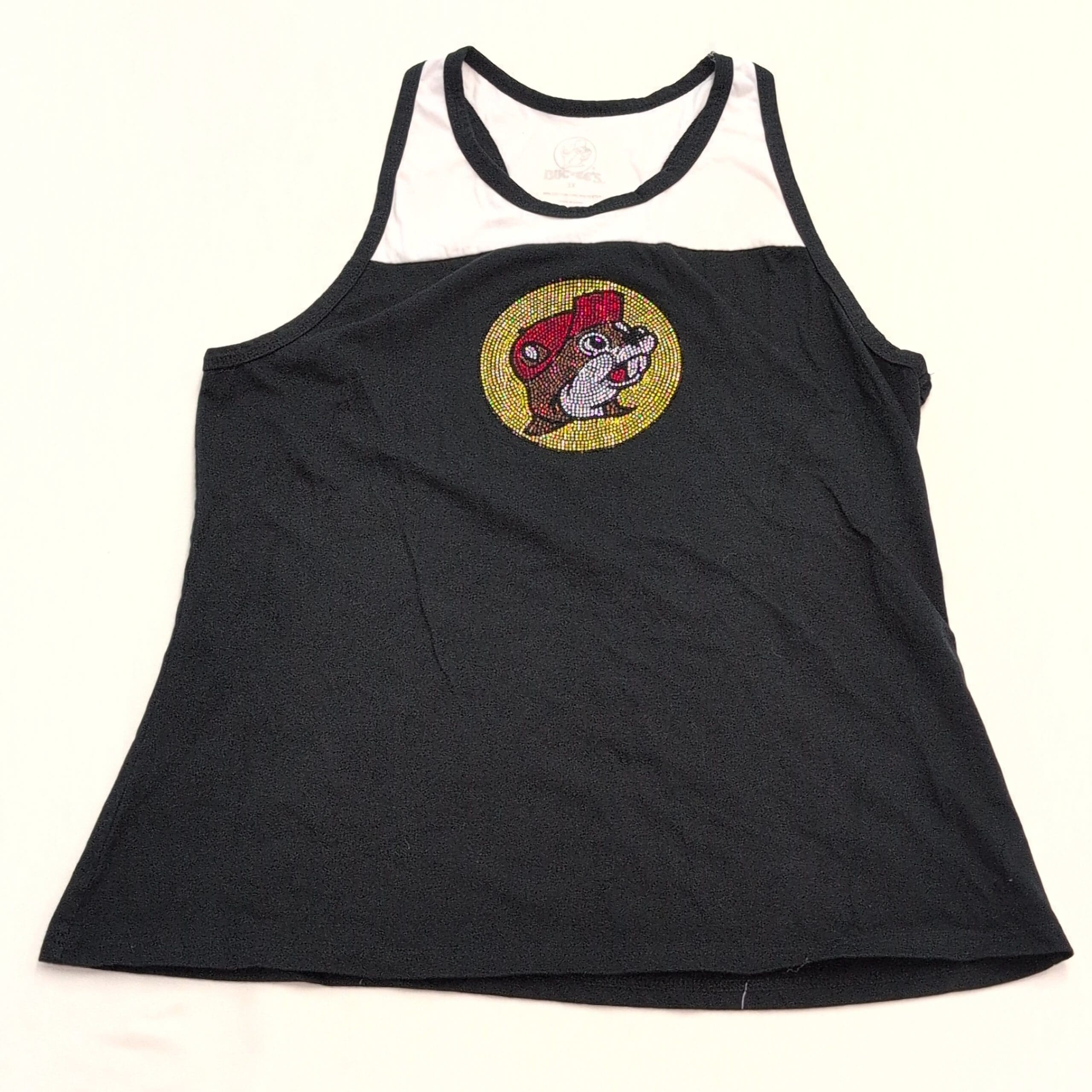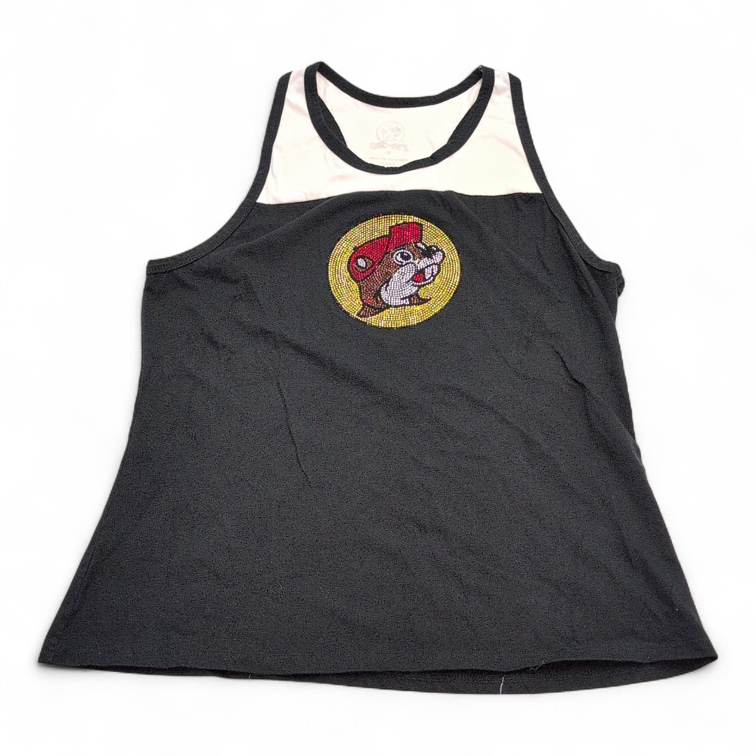 Black Buc-ee’s women’s tank top, size 3X, featuring a bedazzled Buc-ee’s logo centered on the front. Casual sleeveless silhouette with a contrast upper yoke — great for fans and everyday wear. Please review photos for placement and condition of the rhinestone embellishment.