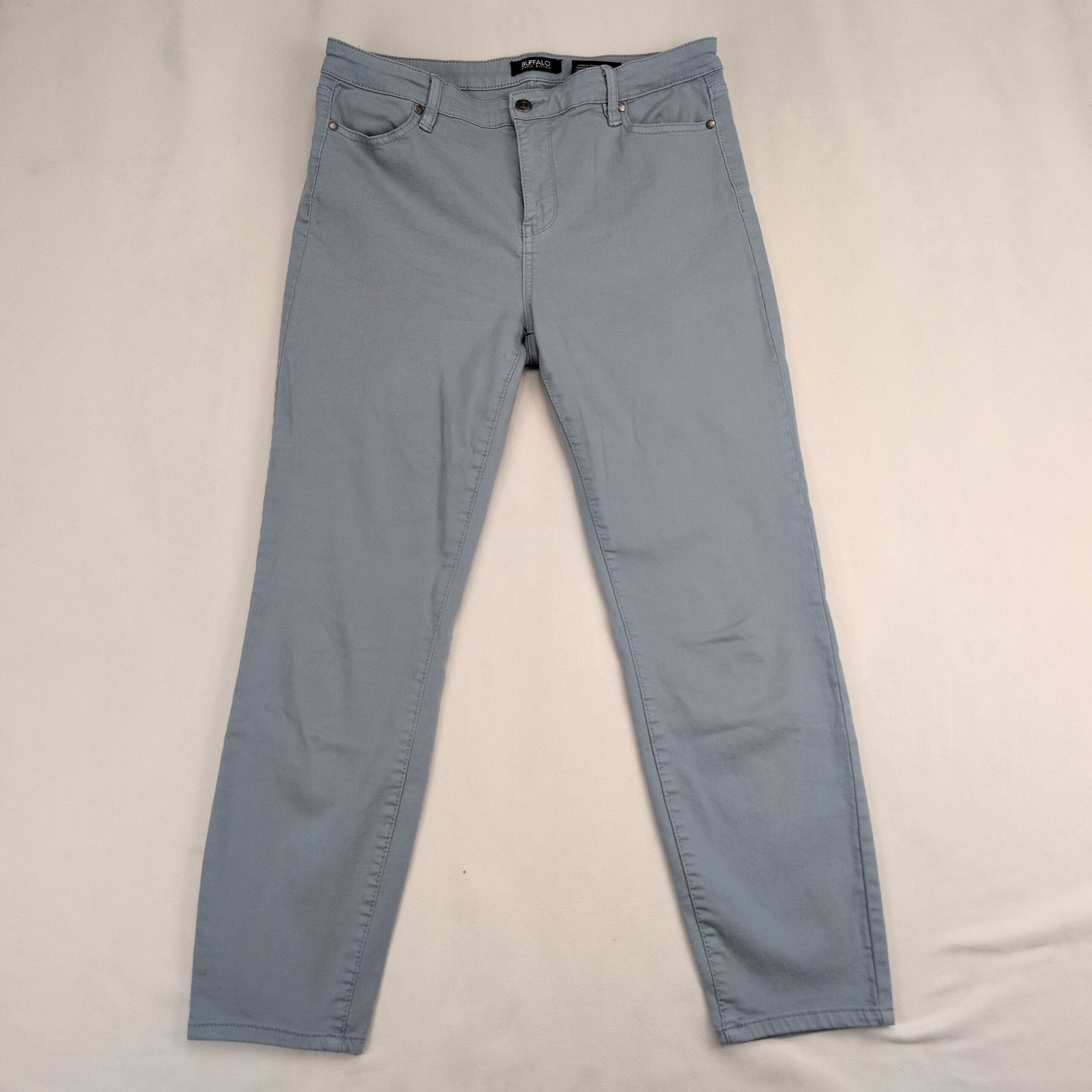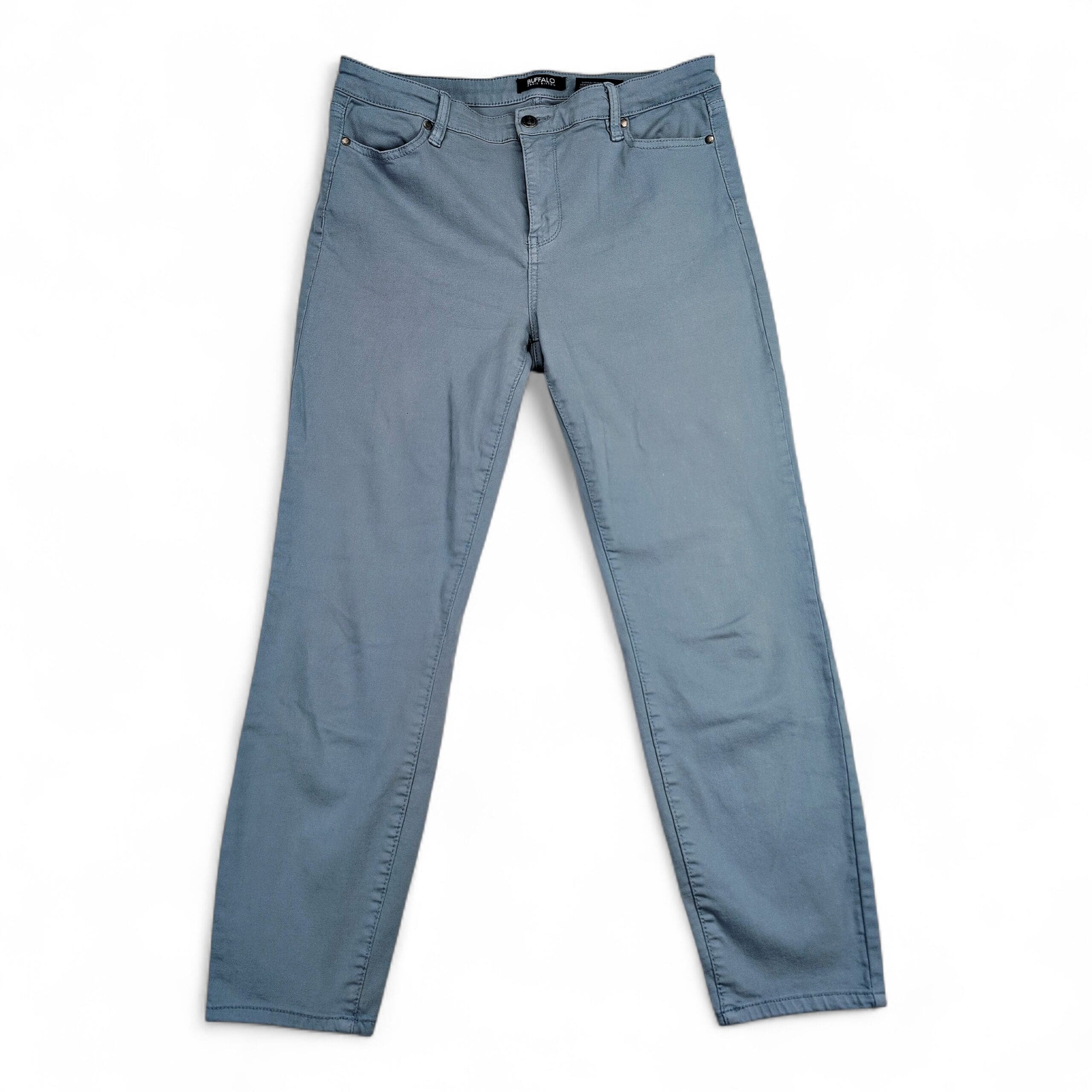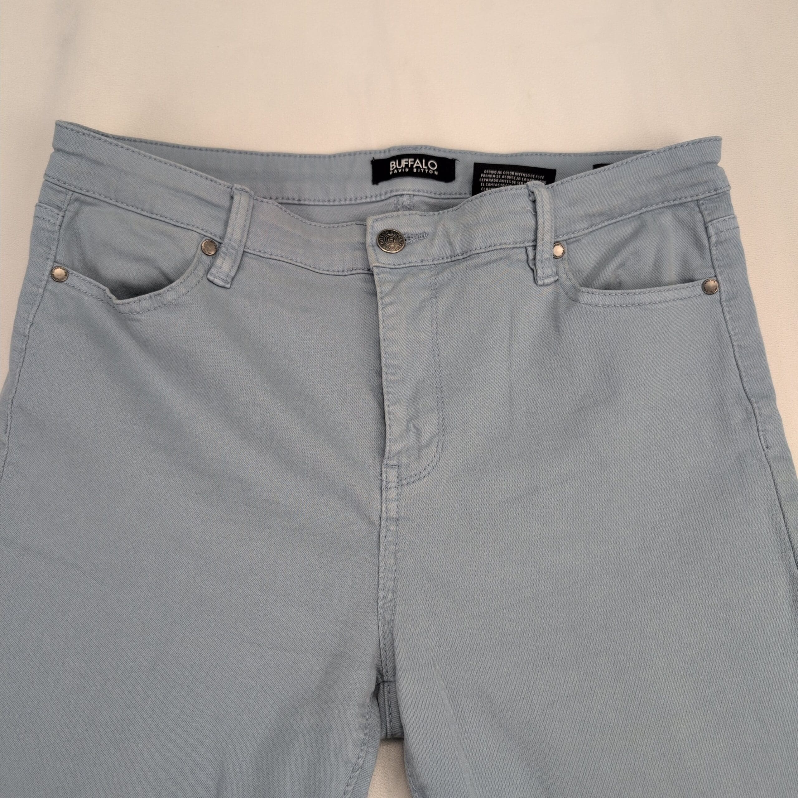Buffalo David Bitton high-rise women’s jeans in a soft light blue. Size 10. Features a high-rise waist, slim/skinny leg, five-pocket styling and zip-fly with button closure. Overall in good used condition with normal light wear. Small white stains on the left pant are pictured—please review photos for placement and size. No rips, tears, or holes; versatile denim that dresses up or down.