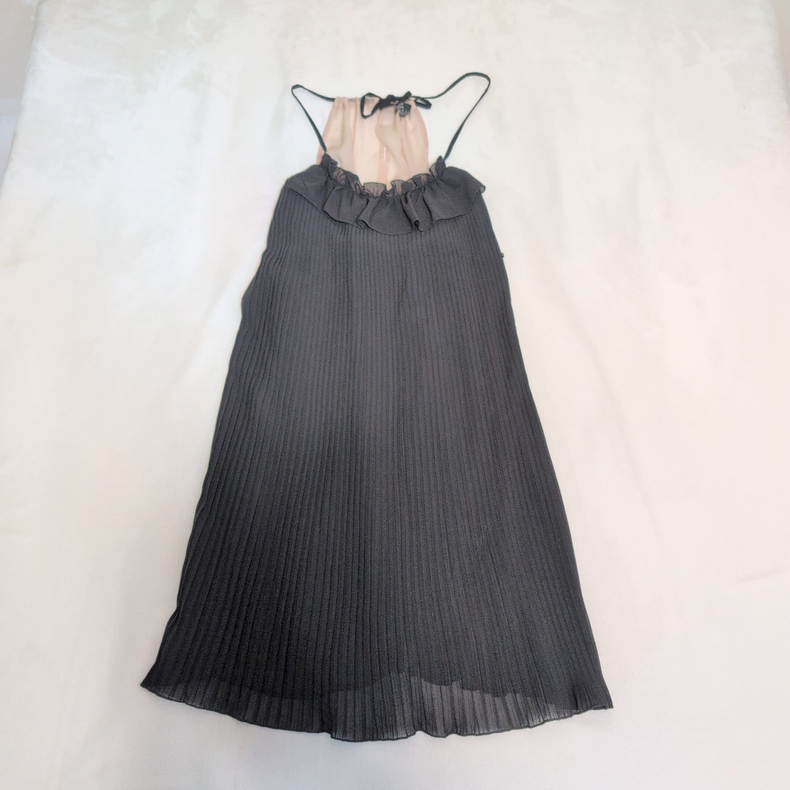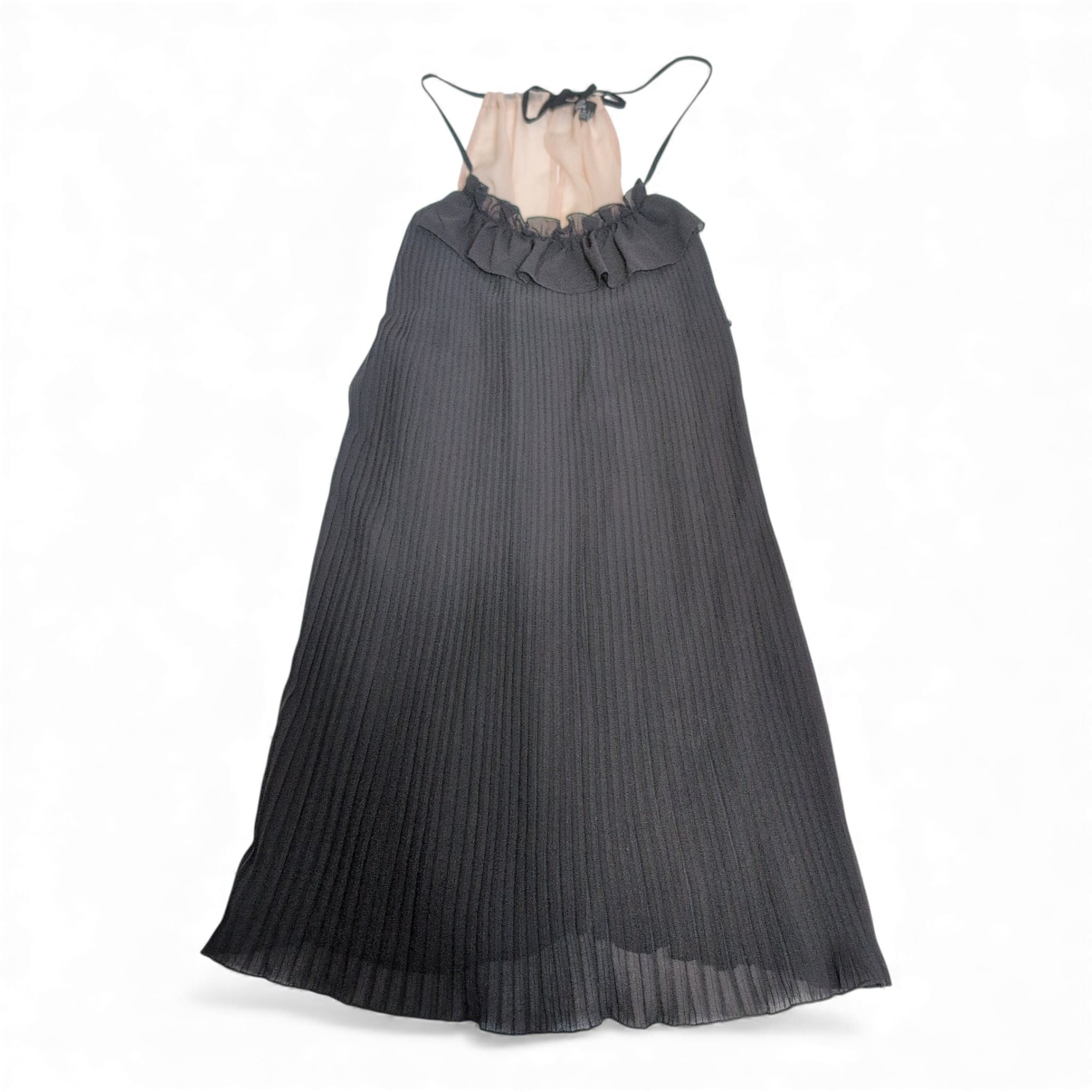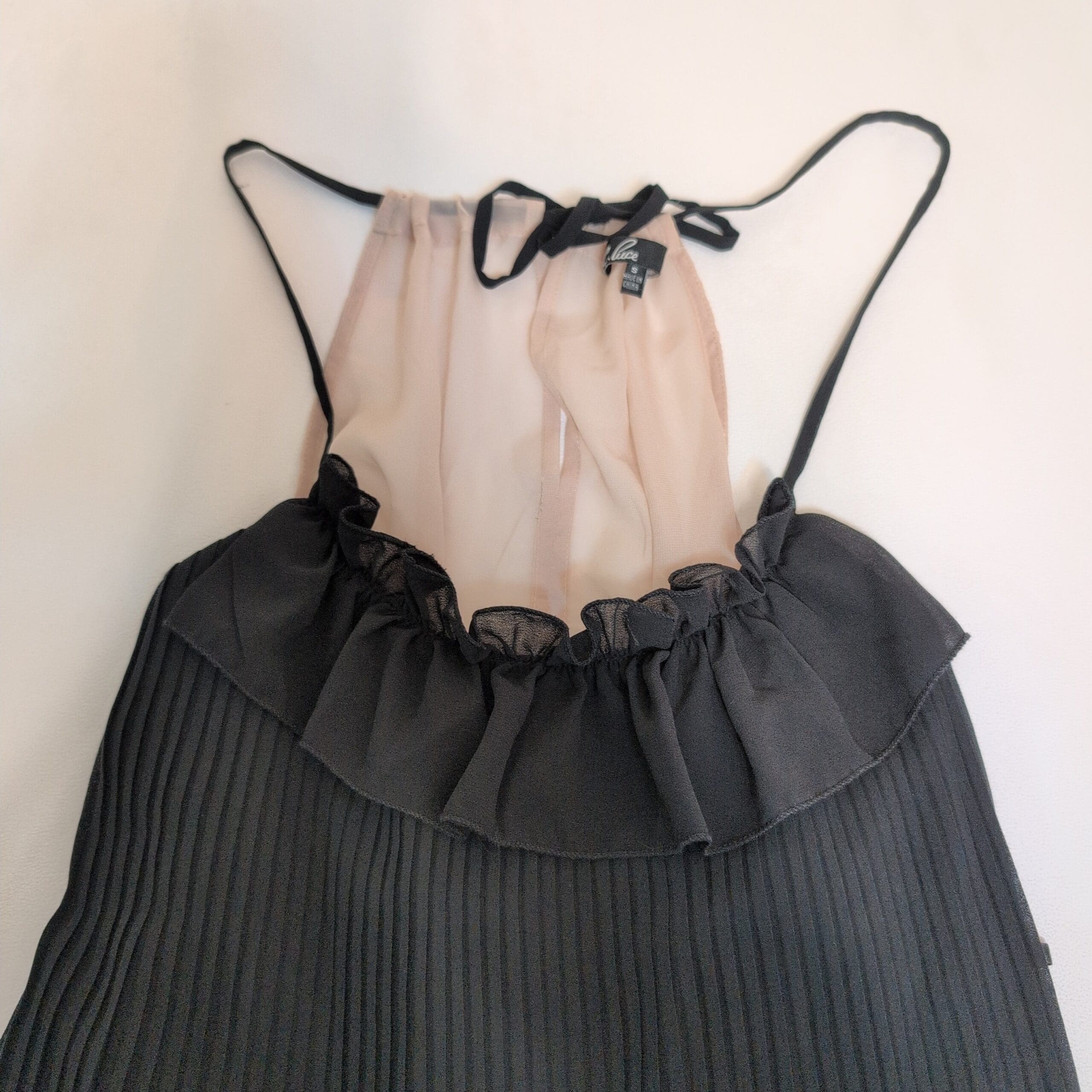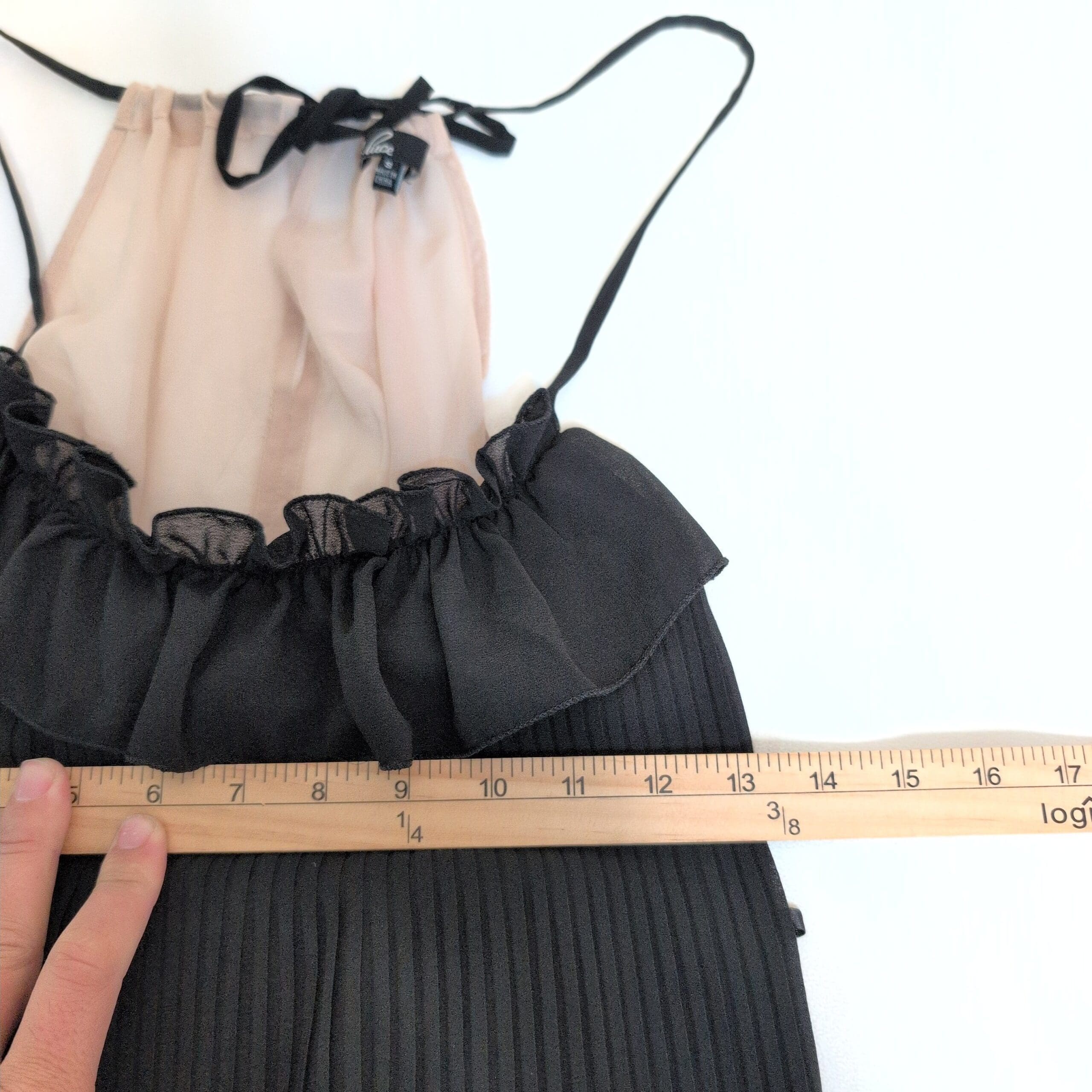 C. luce black pleated halter midi dress, Size S. Features a delicate ruffled neckline, sheer nude halter yoke with tie closure, thin spaghetti straps, and a flowy pleated skirt that moves beautifully. Elegant silhouette perfect for evening events, weddings, or date nights. Lightweight construction; pre-owned in excellent condition.
