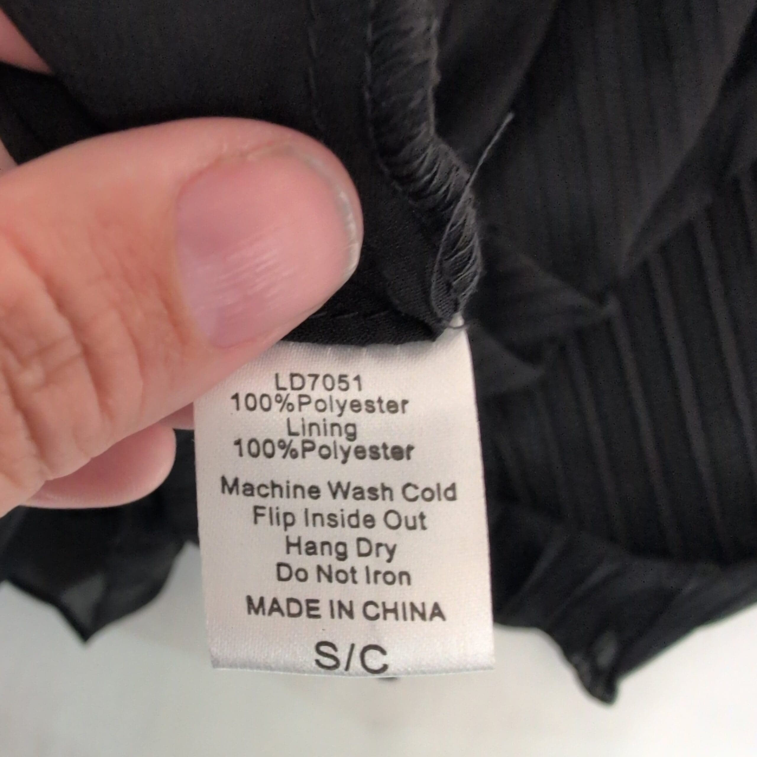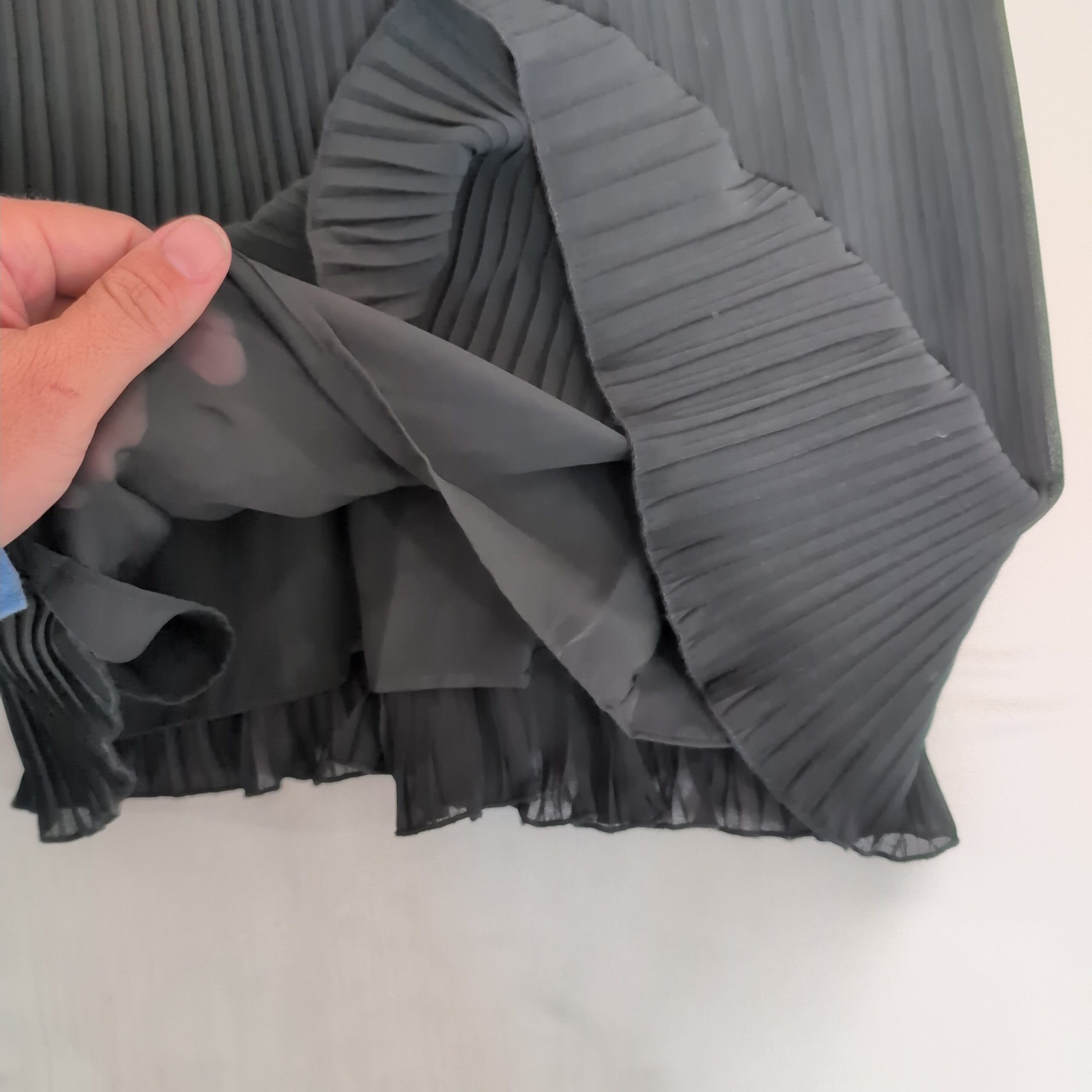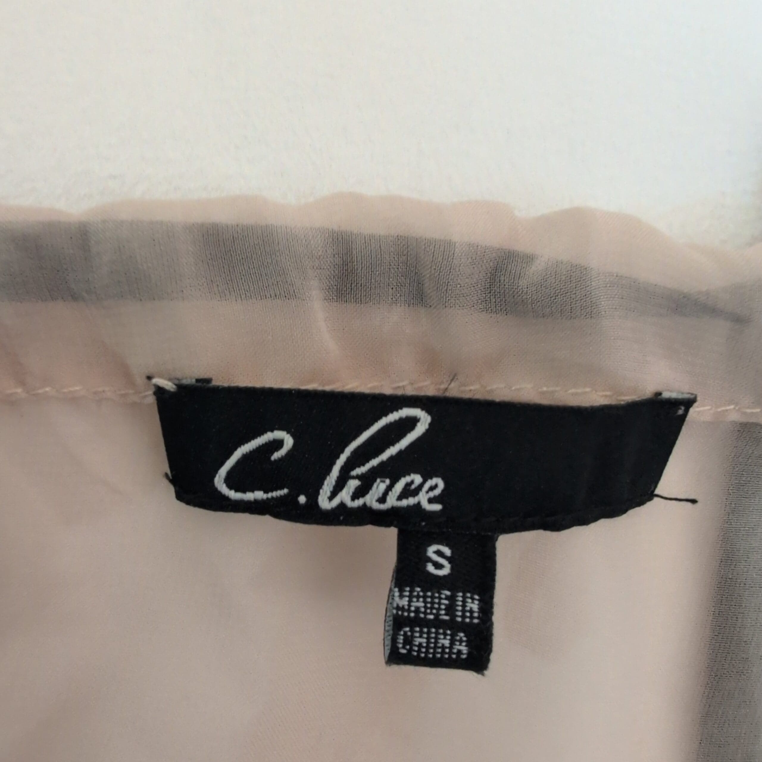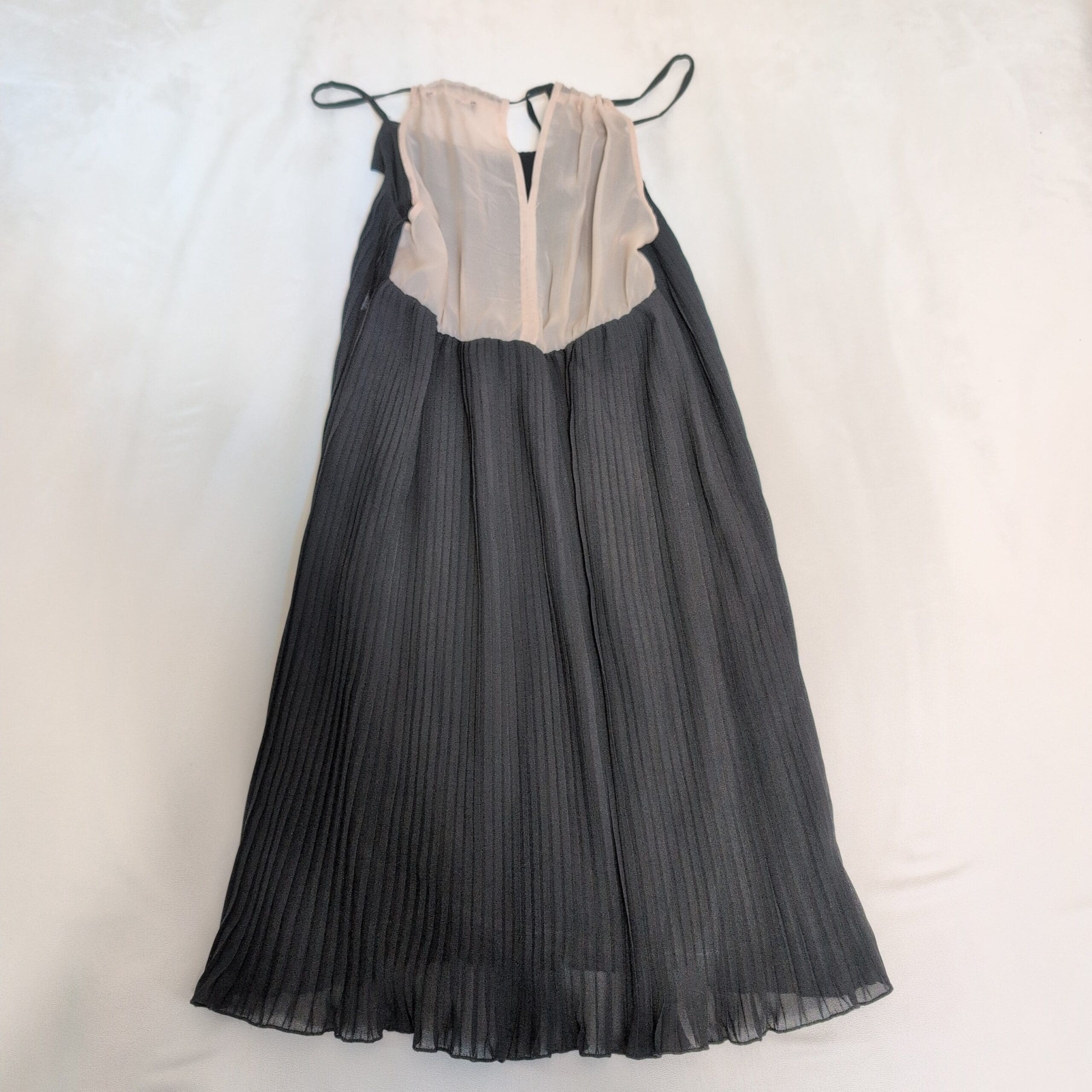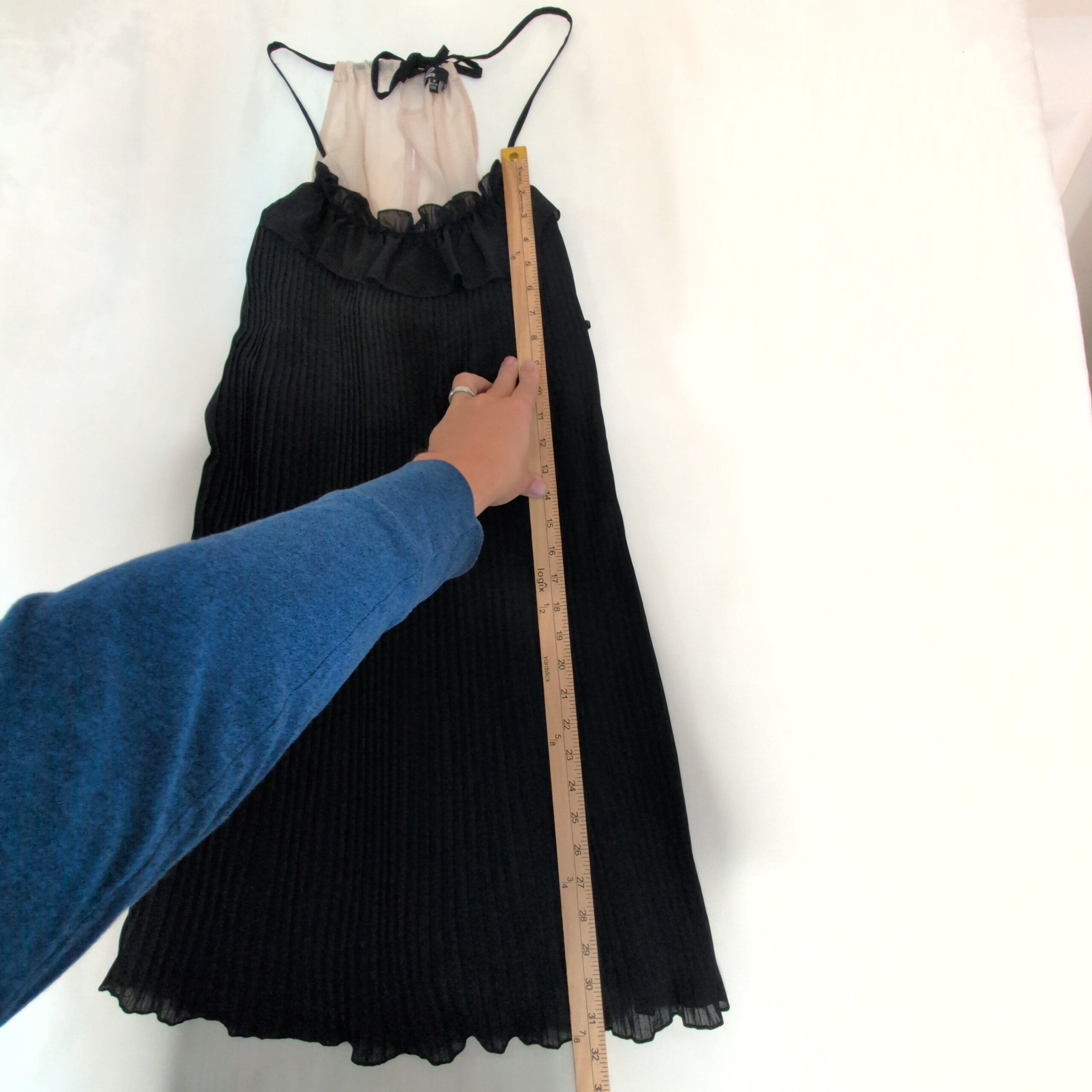 C. luce black pleated halter midi dress, Size S. Features a delicate ruffled neckline, sheer nude halter yoke with tie closure, thin spaghetti straps, and a flowy pleated skirt that moves beautifully. Elegant silhouette perfect for evening events, weddings, or date nights. Lightweight construction; pre-owned in excellent condition.