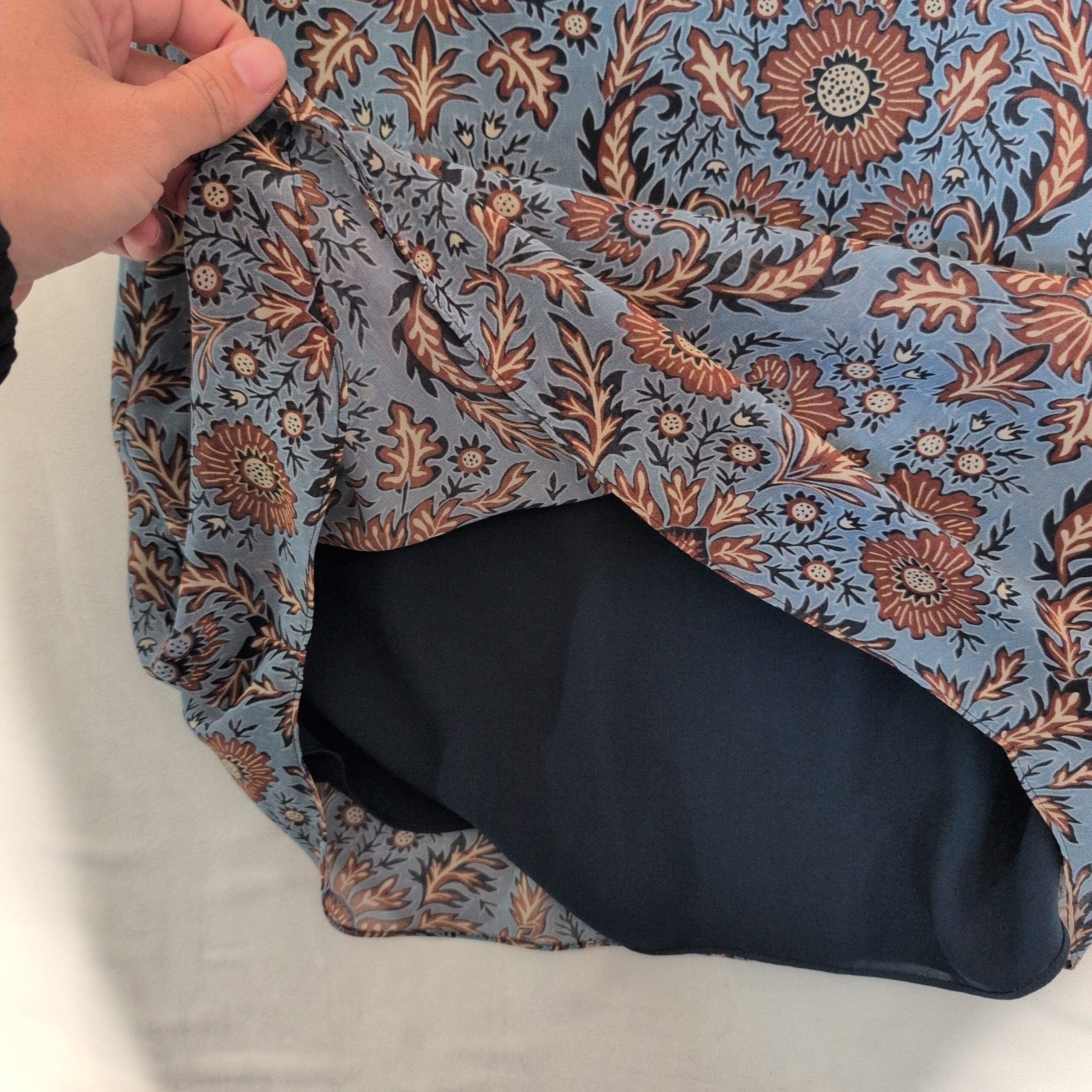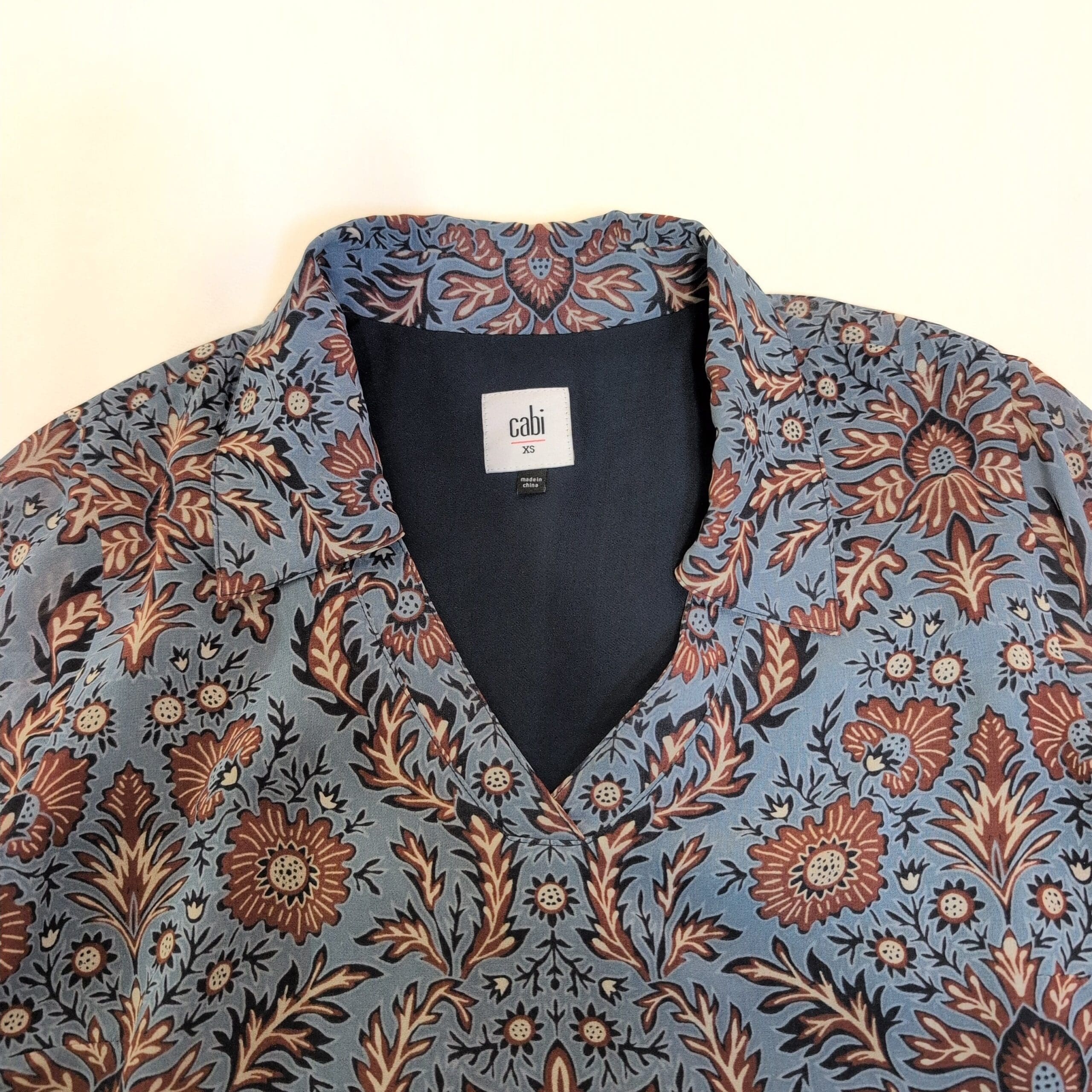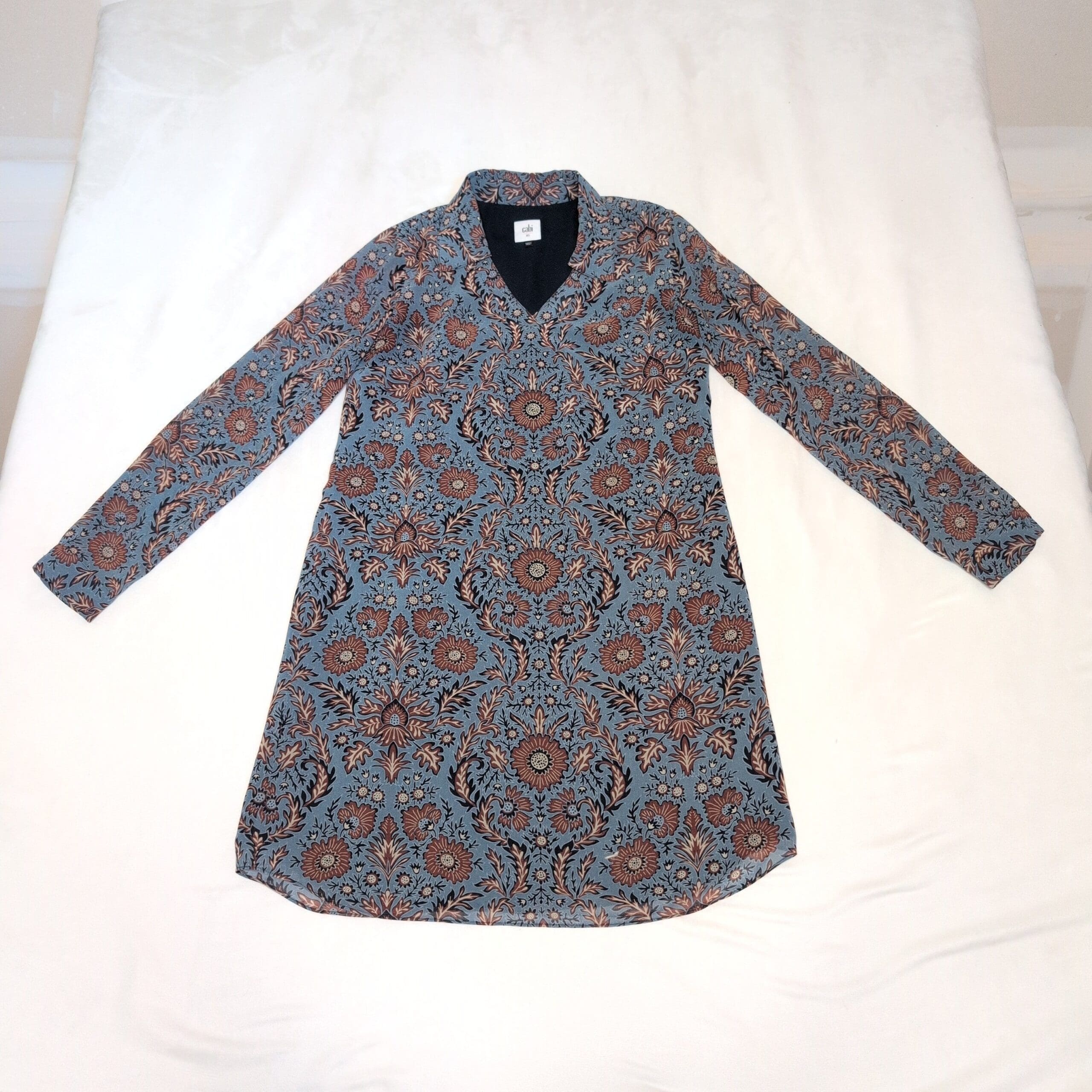 Cabi long-sleeve V-neck dress in a blue floral medallion print. Tunic-length A-line silhouette with long sleeves and a subtle V neckline — versatile for work or weekend looks. Size XS (standard).