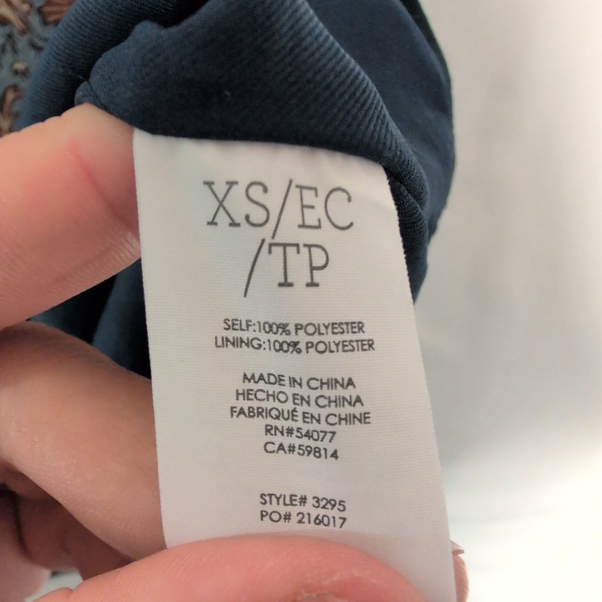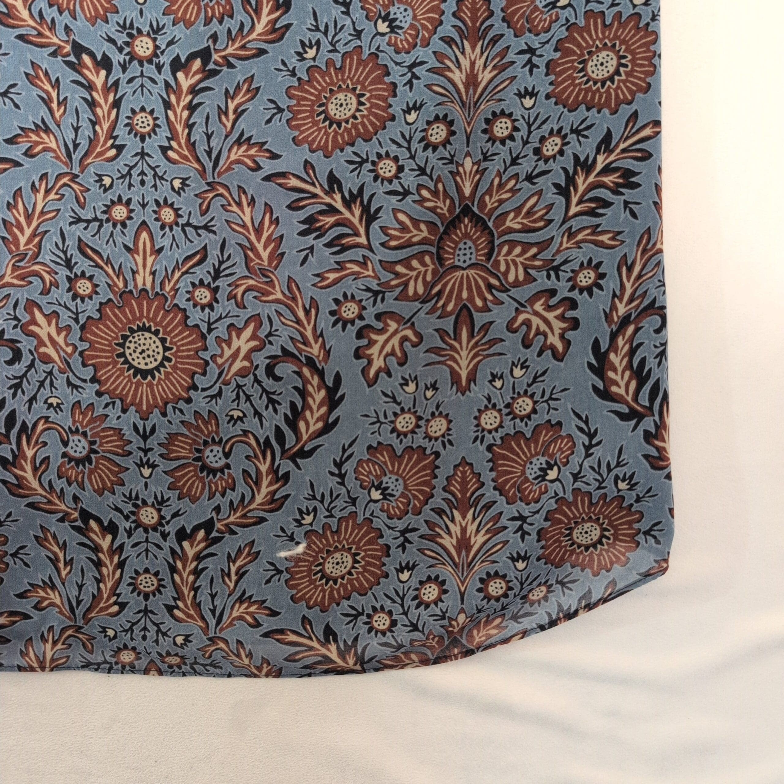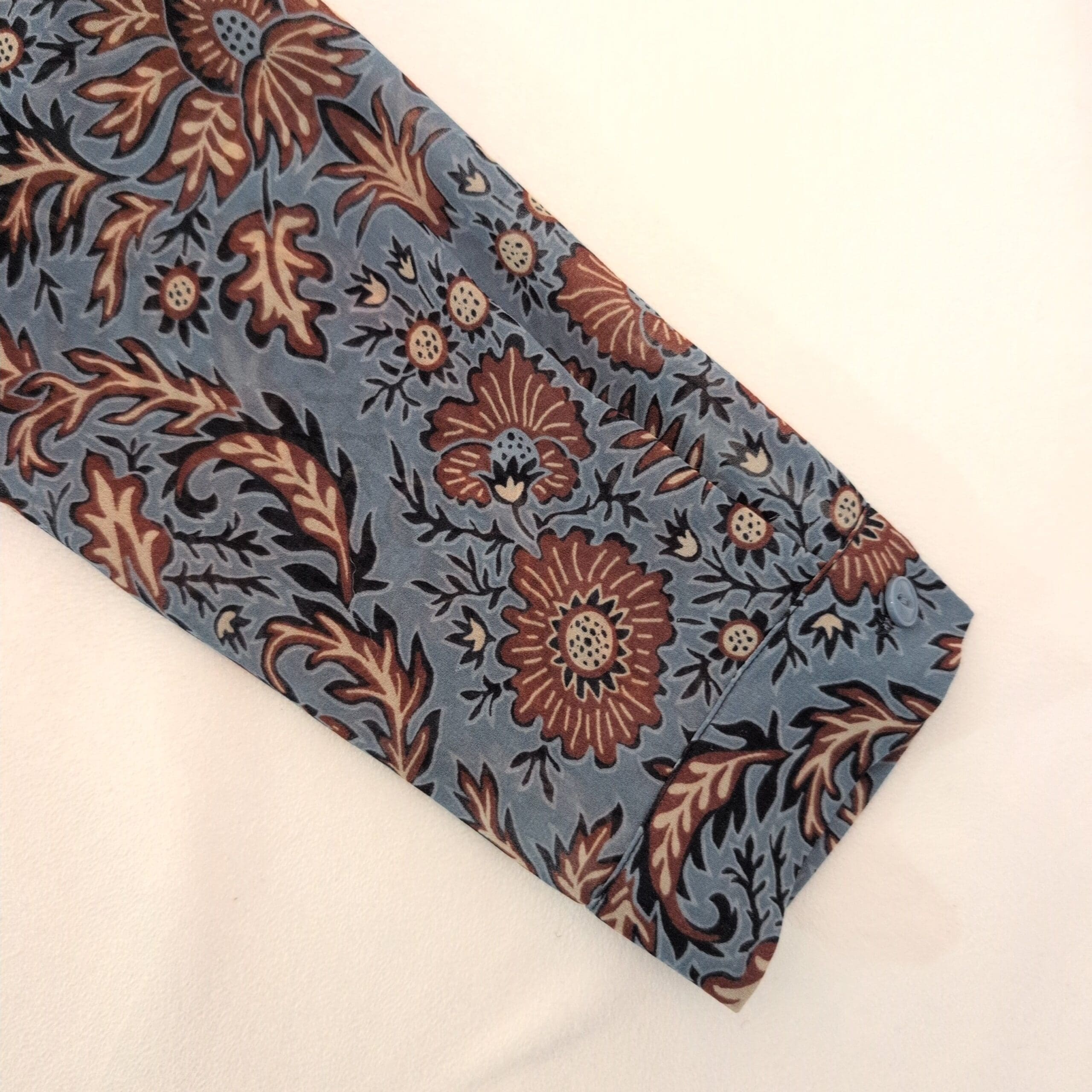 Cabi long-sleeve V-neck dress in a blue floral medallion print. Tunic-length A-line silhouette with long sleeves and a subtle V neckline — versatile for work or weekend looks. Size XS (standard).