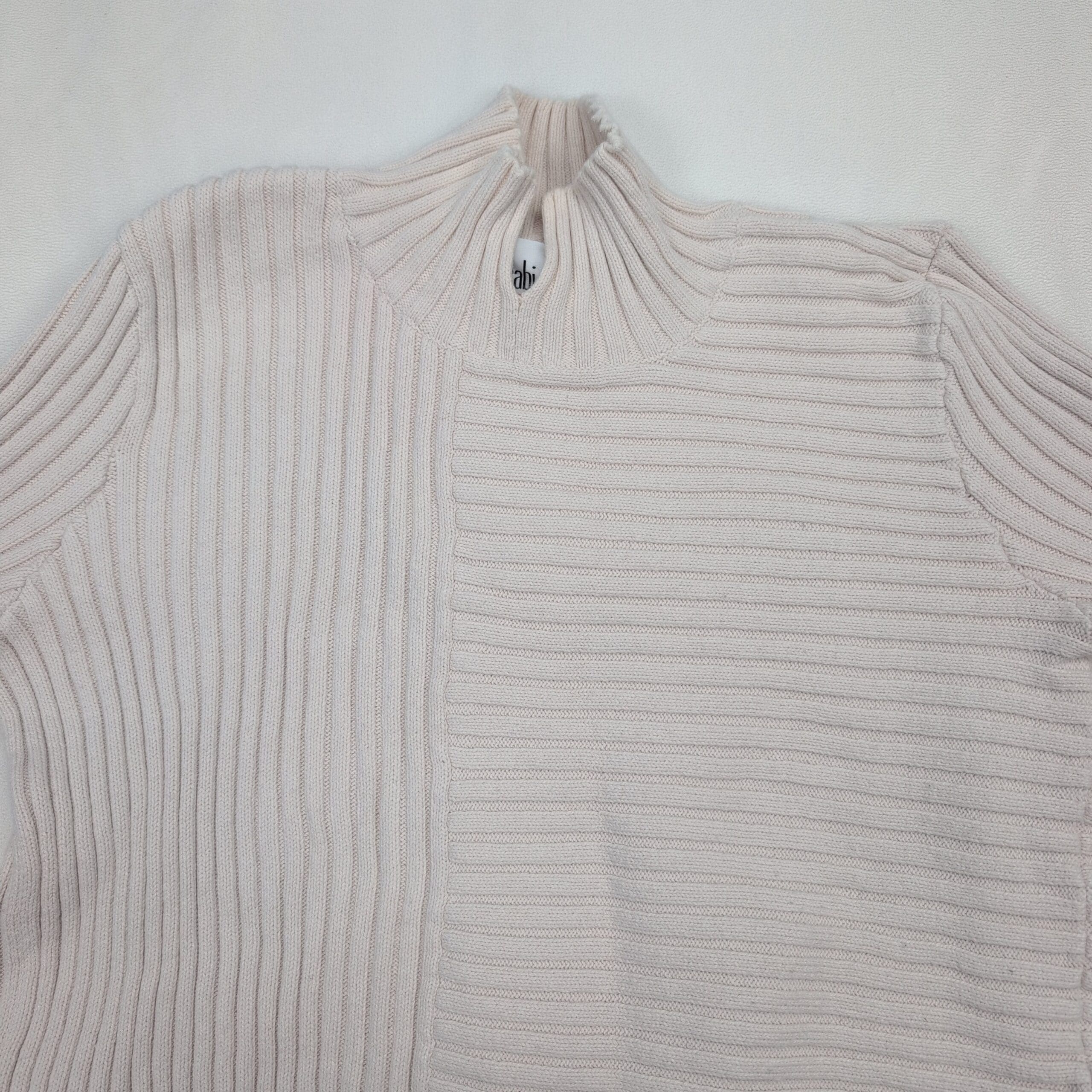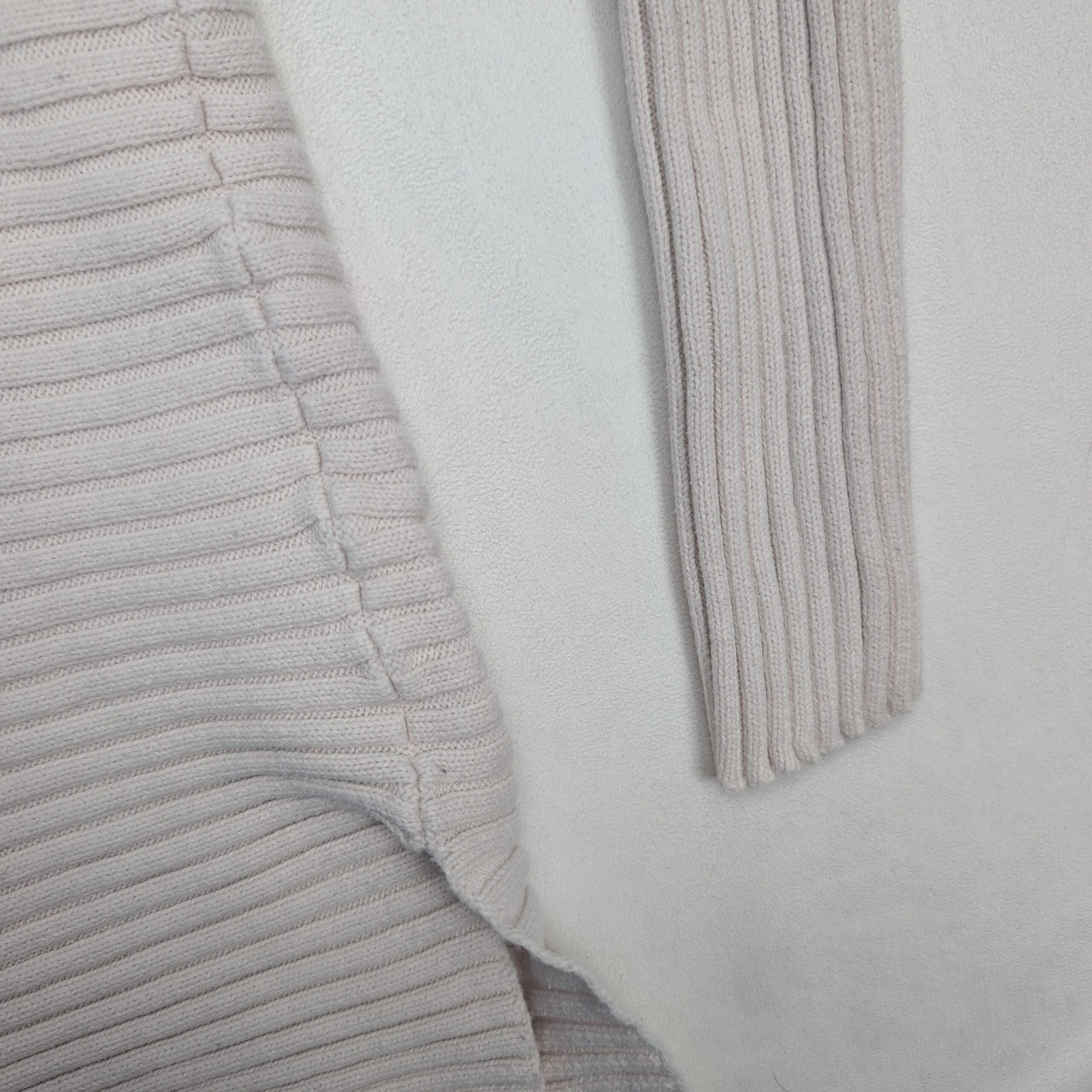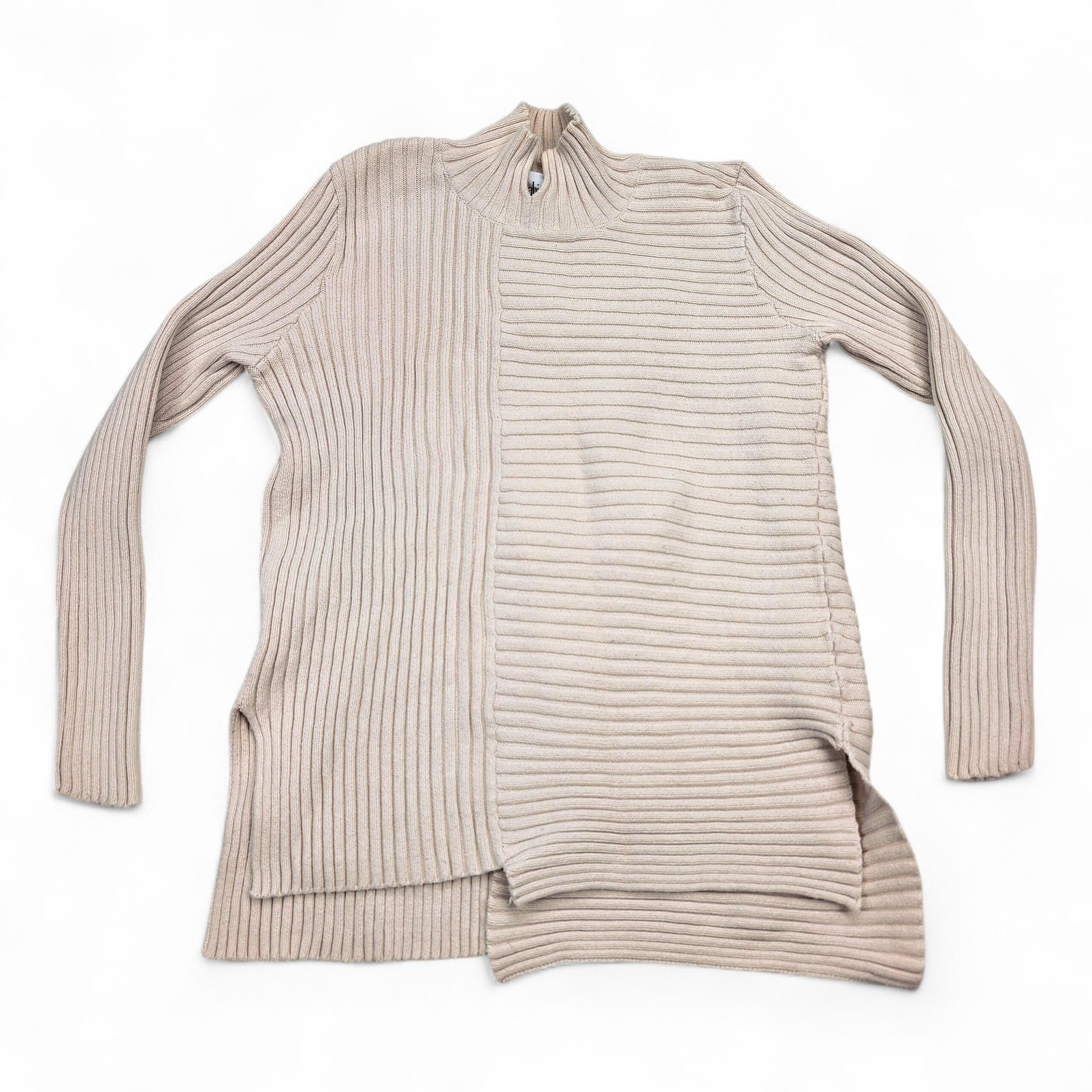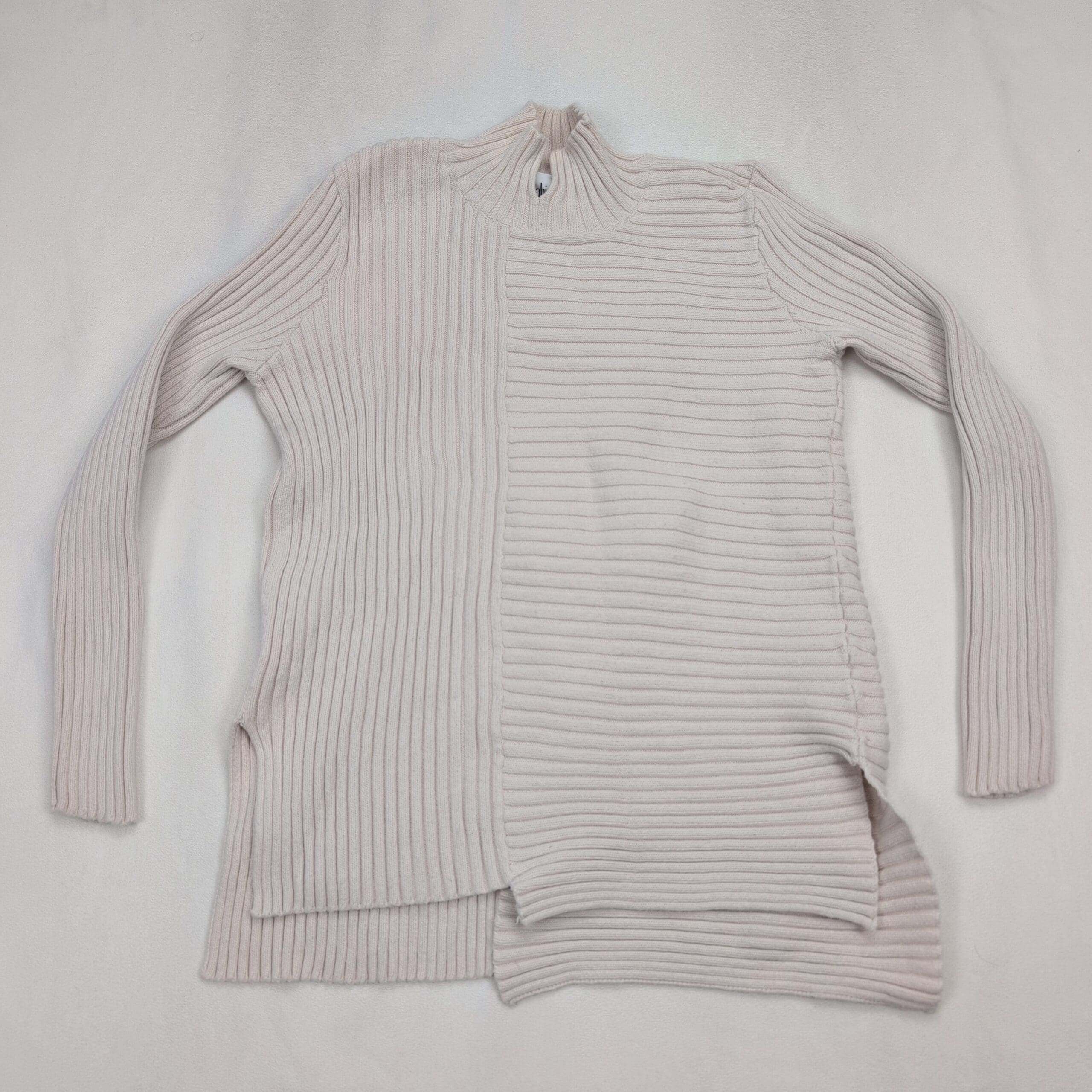 Cabi ribbed mixed-panel mock neck sweater in soft cream. Size S. Features contrasting vertical and horizontal ribbed knit, long fitted sleeves, mock neck collar, and an asymmetrical layered hem with side slit for a modern, sculpted silhouette ideal for layering.