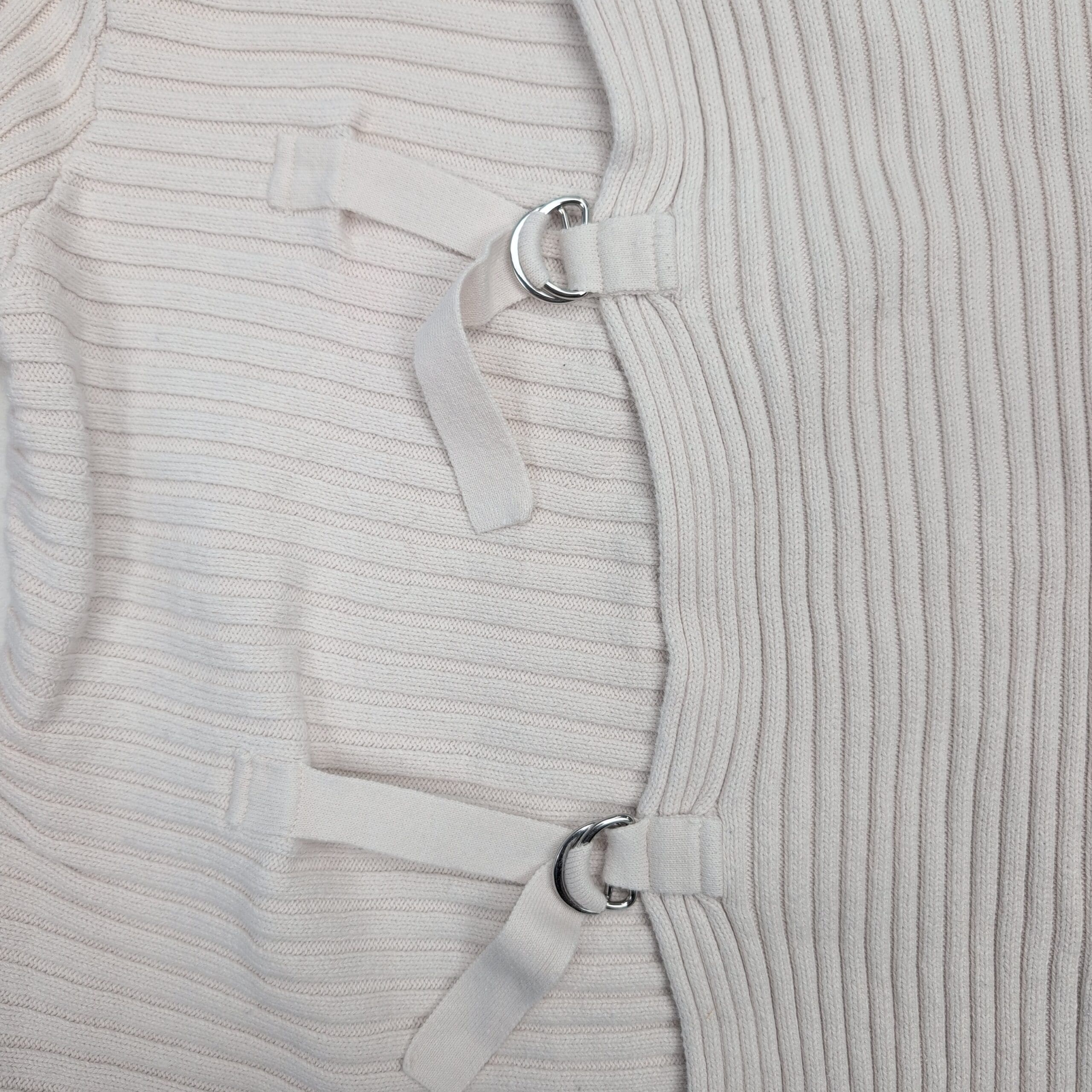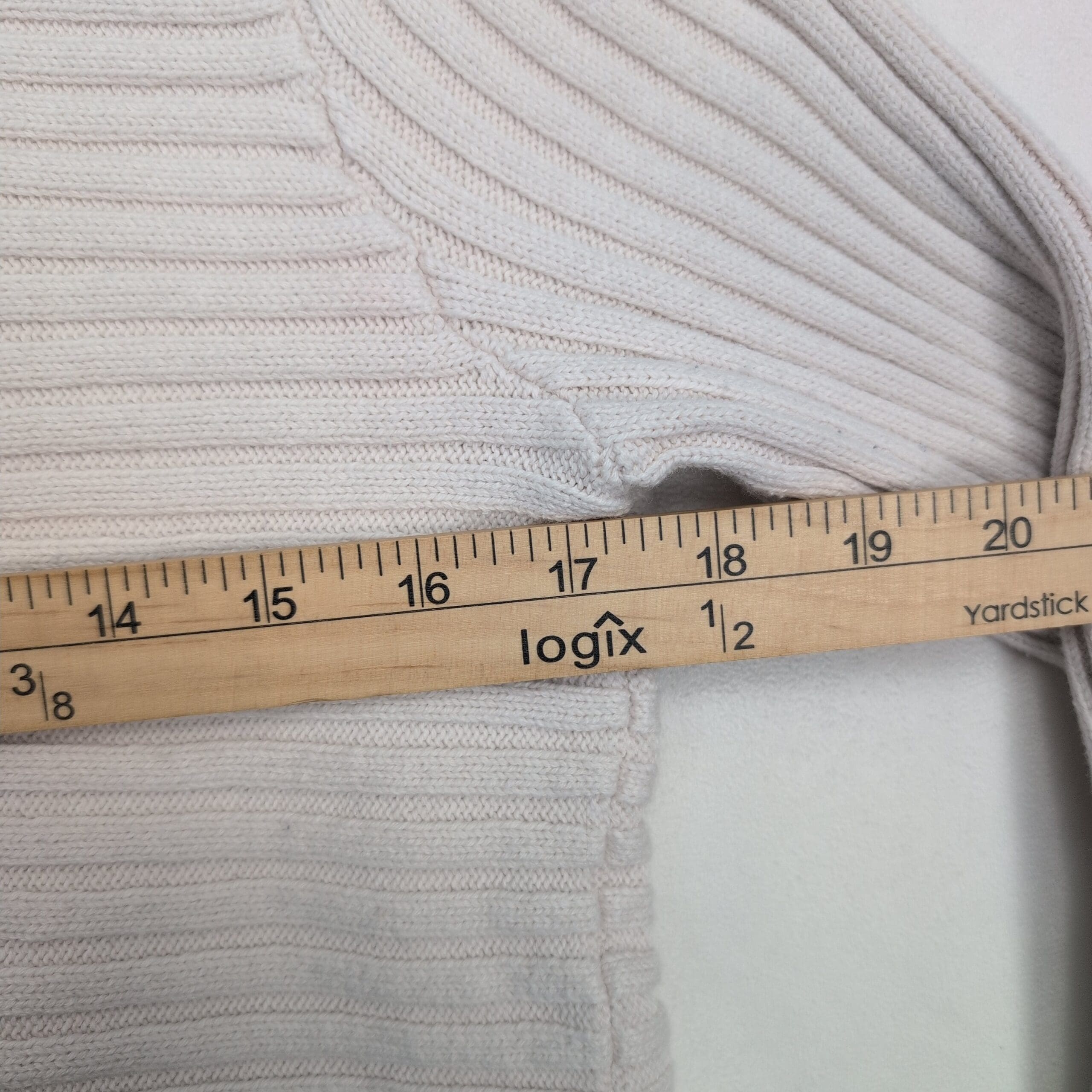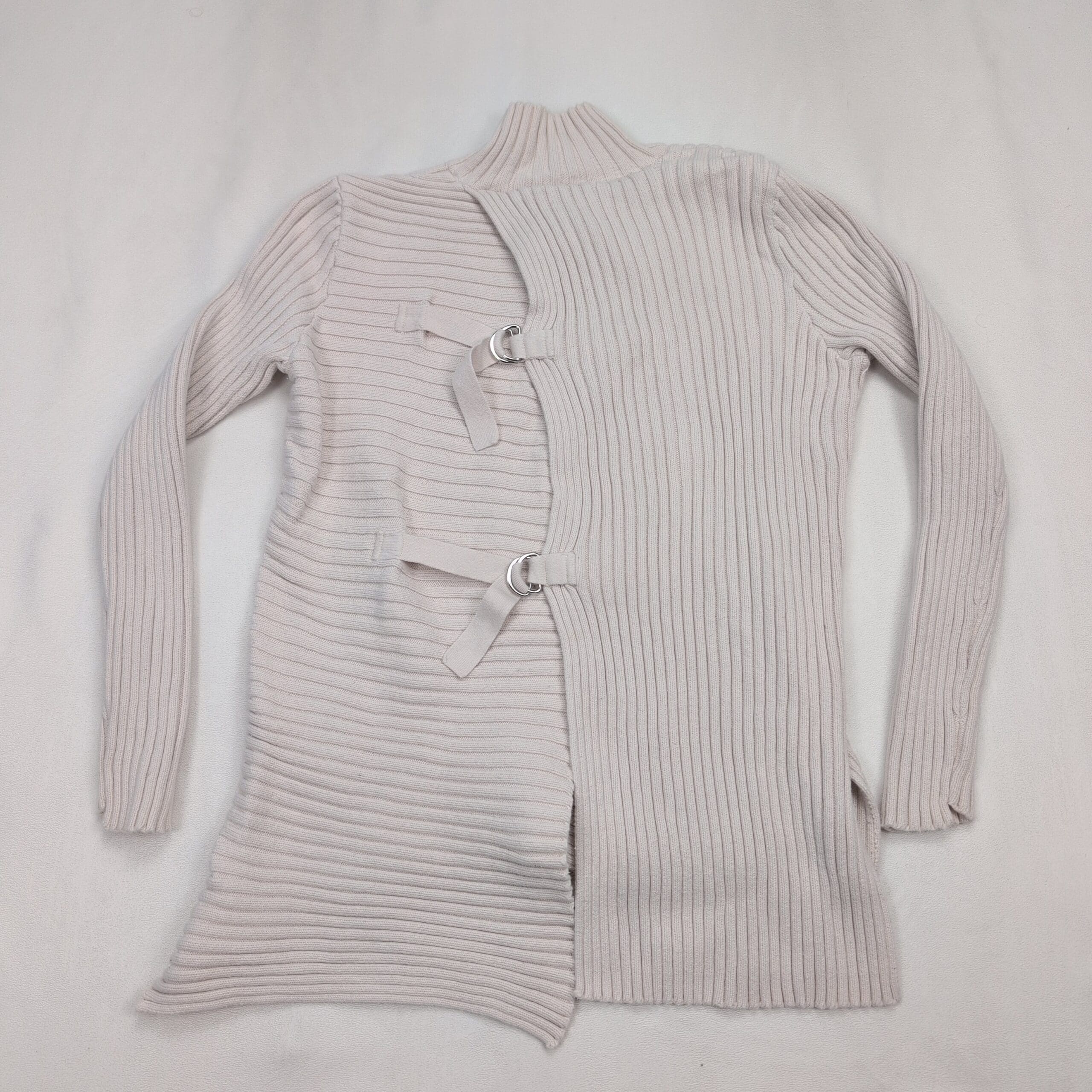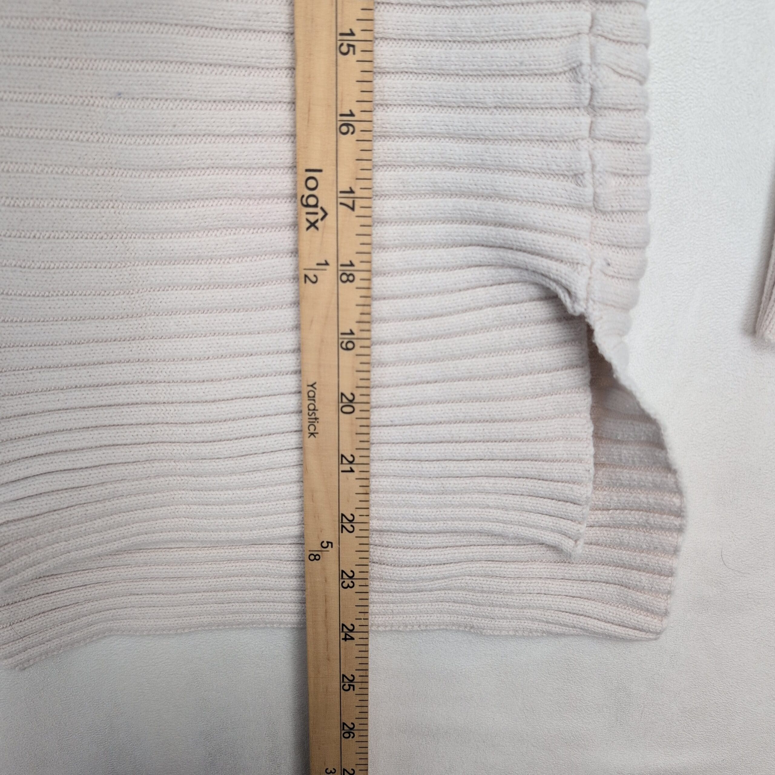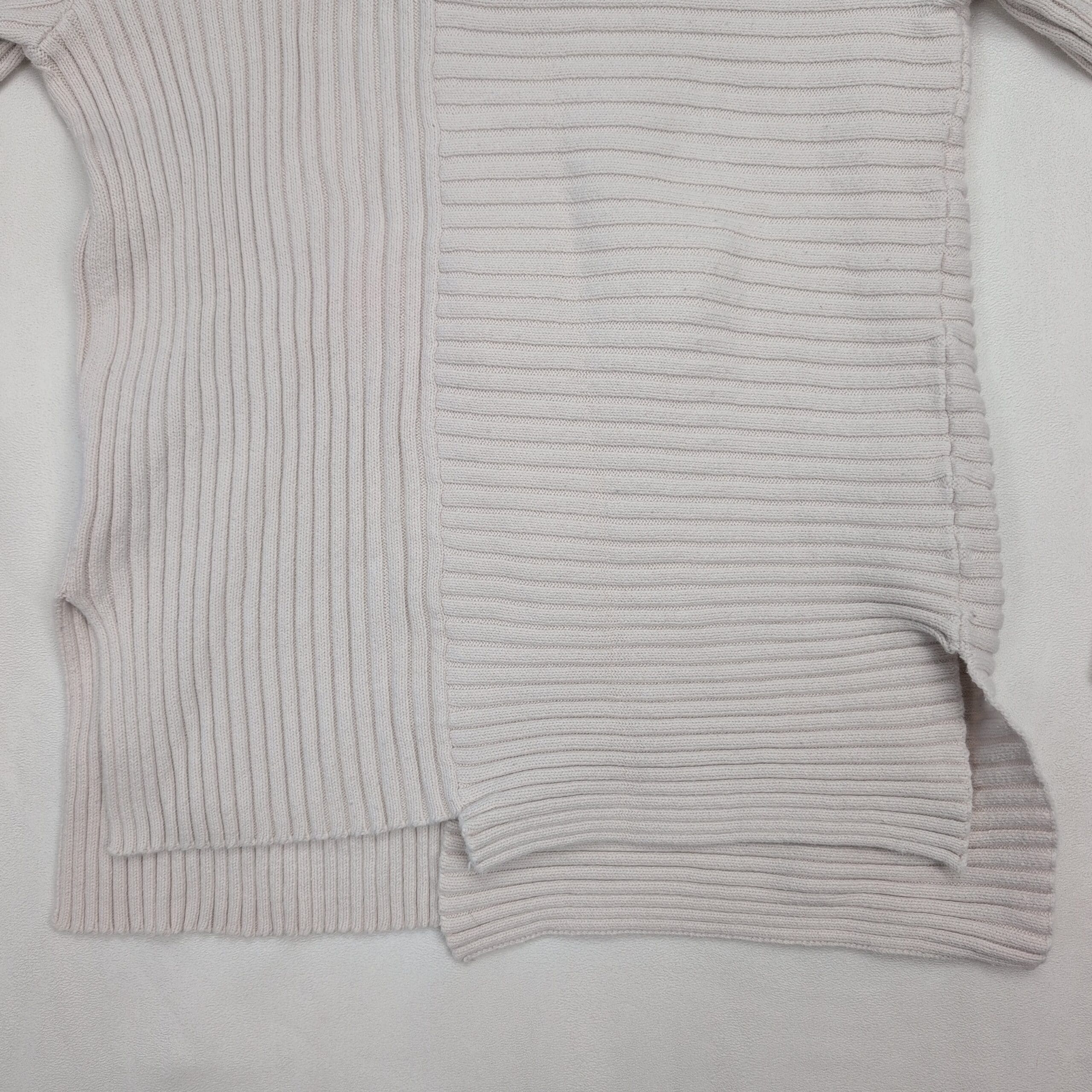 Cabi ribbed mixed-panel mock neck sweater in soft cream. Size S. Features contrasting vertical and horizontal ribbed knit, long fitted sleeves, mock neck collar, and an asymmetrical layered hem with side slit for a modern, sculpted silhouette ideal for layering.