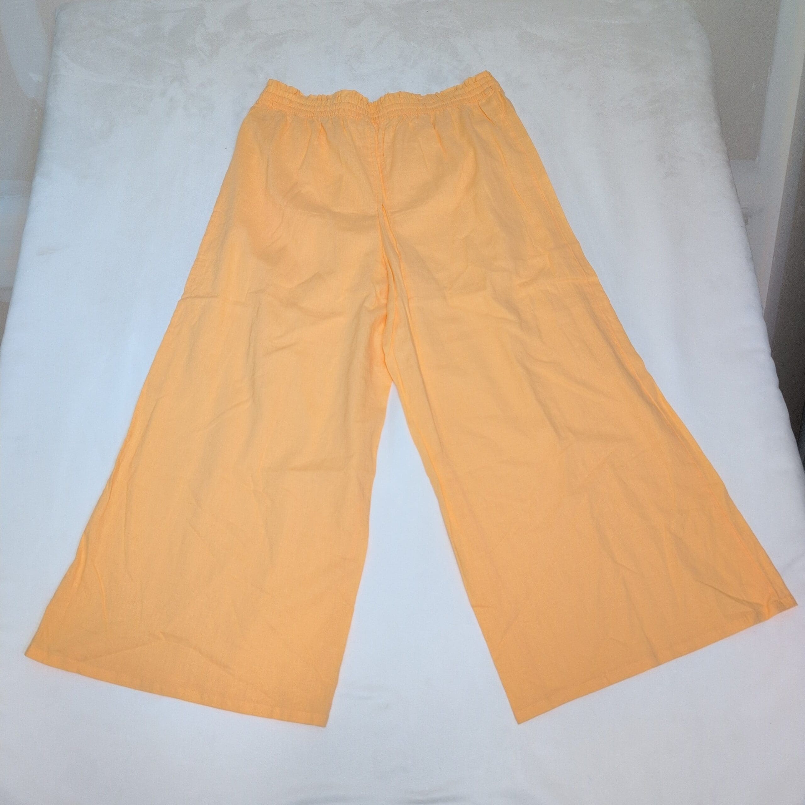 Bright orange wide-leg pants by Calia by Carrie Underwood in size XL. Lightweight woven fabric with an elastic drawstring waist for a comfortable, adjustable fit and a flowing, relaxed silhouette. Functional side pockets and a breezy wide leg make these perfect for lounging, casual days, or warm-weather outfits. Pre-owned, very good condition — no noticeable stains or holes; light wrinkles from storage that will relax with washing or steaming.