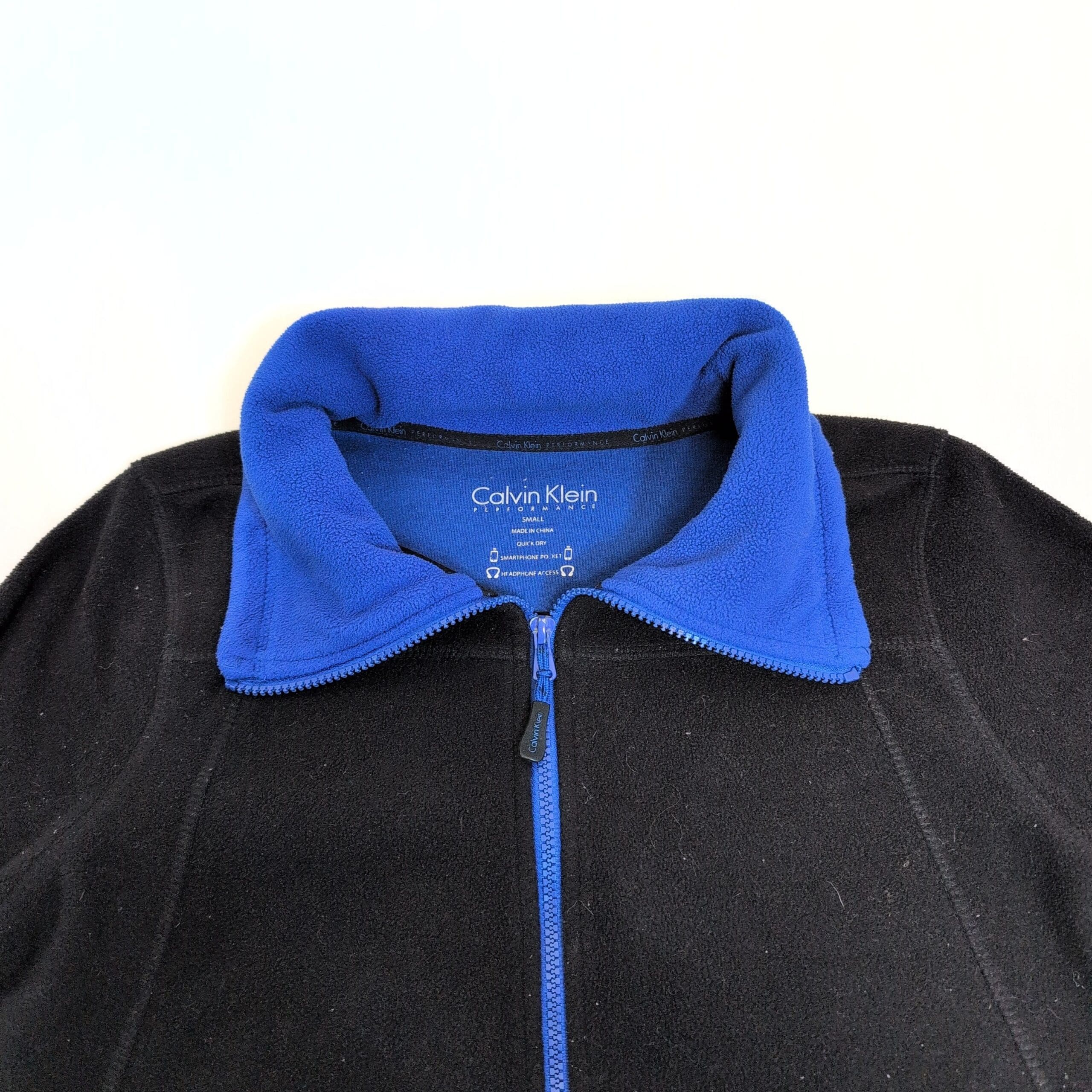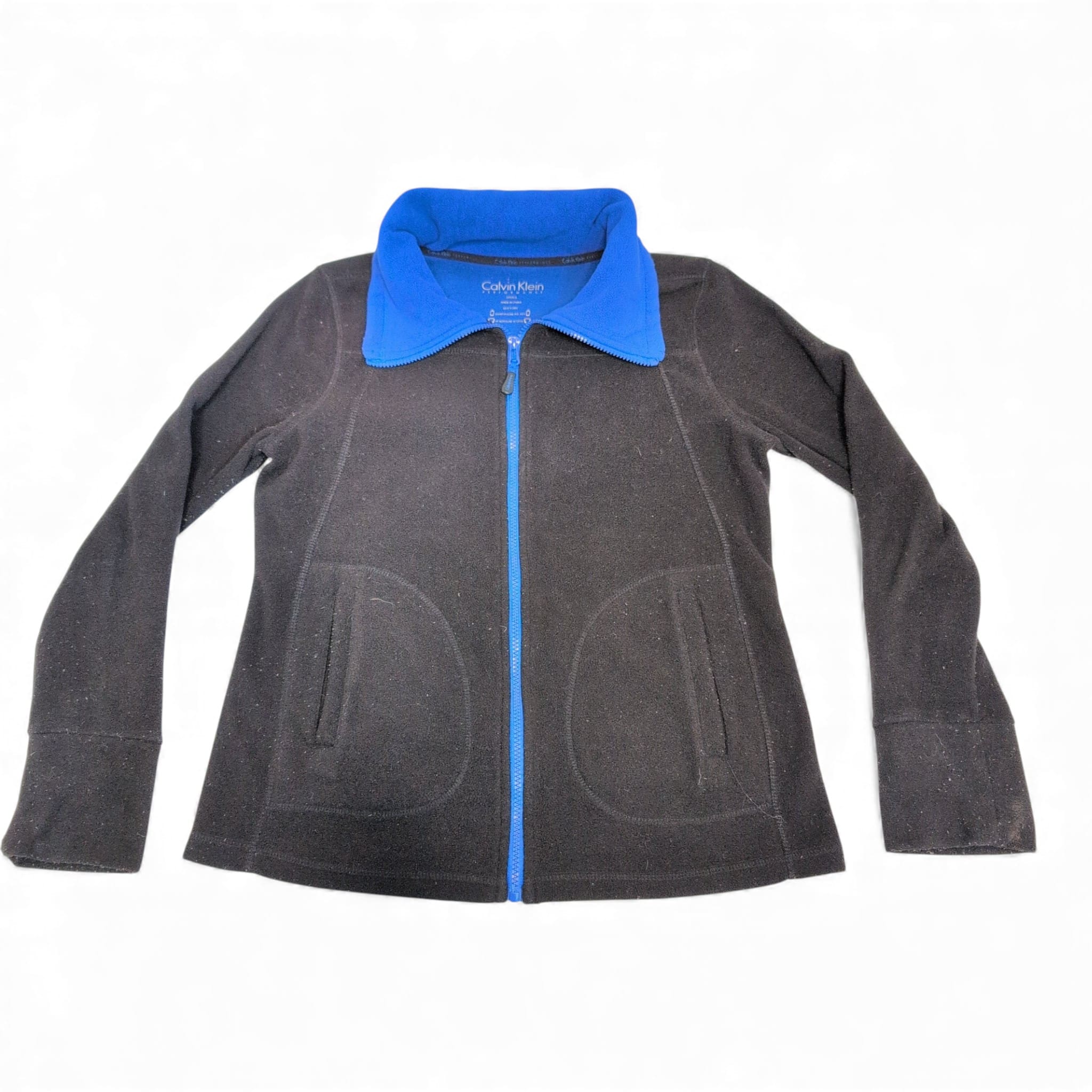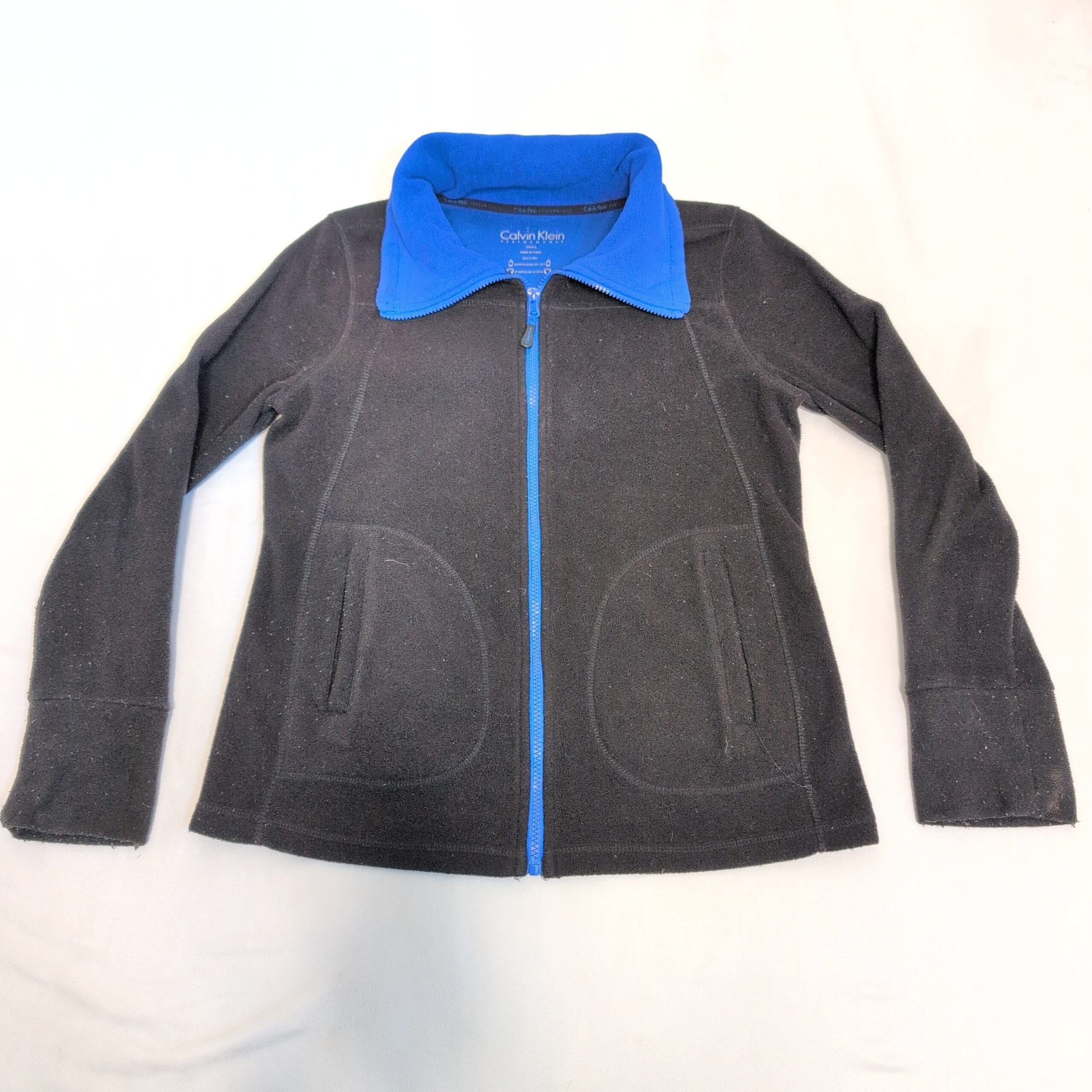 Calvin Klein women’s black fleece zip-up jacket in size S. Features a contrasting blue collar and zipper, front welt pockets, and contoured seam lines for a flattering fit. Soft, warm fleece ideal for layering and everyday wear. Overall good pre-owned condition with normal light wear; minor discoloration on one sleeve cuff (see photos) and light surface pilling. Zipper functions smoothly.