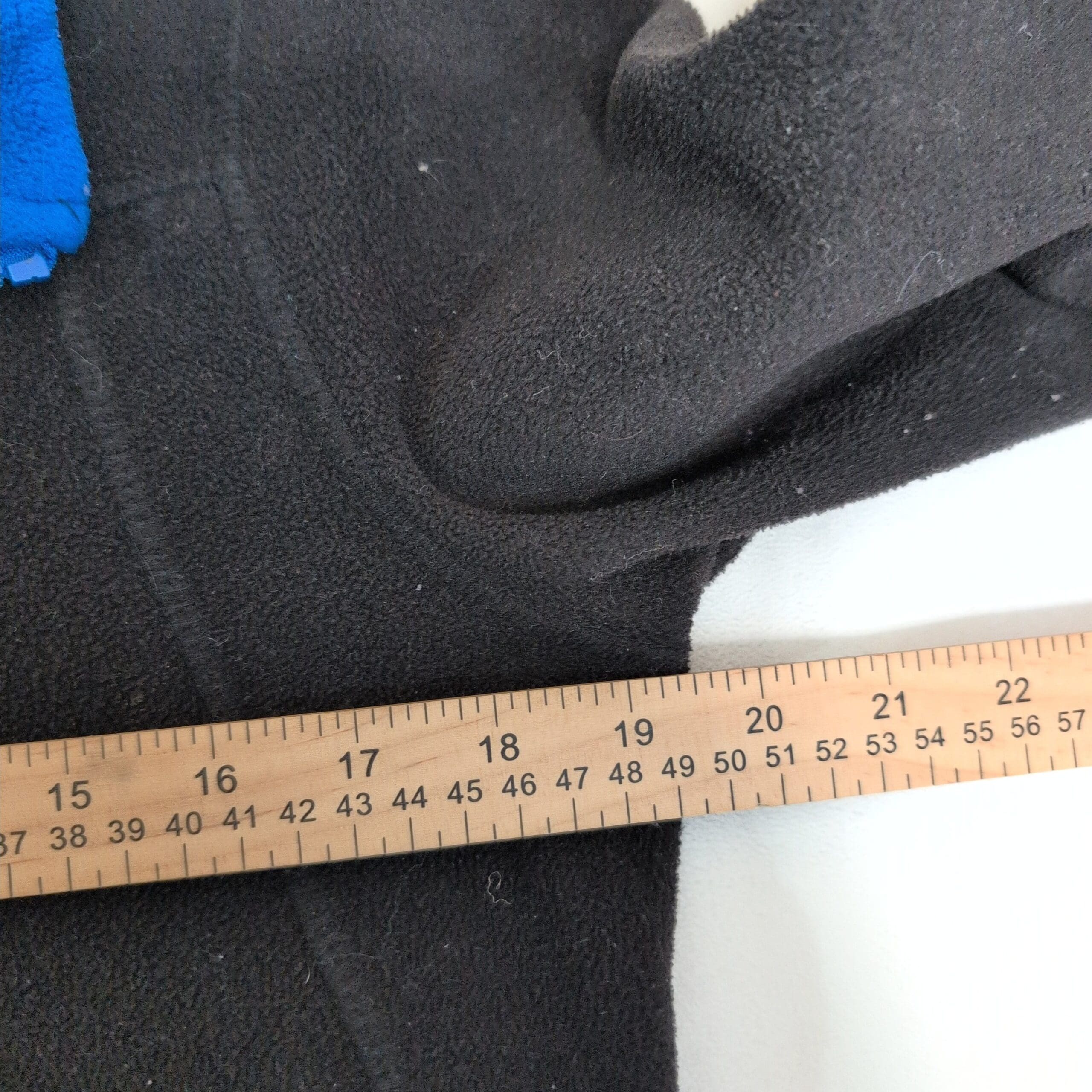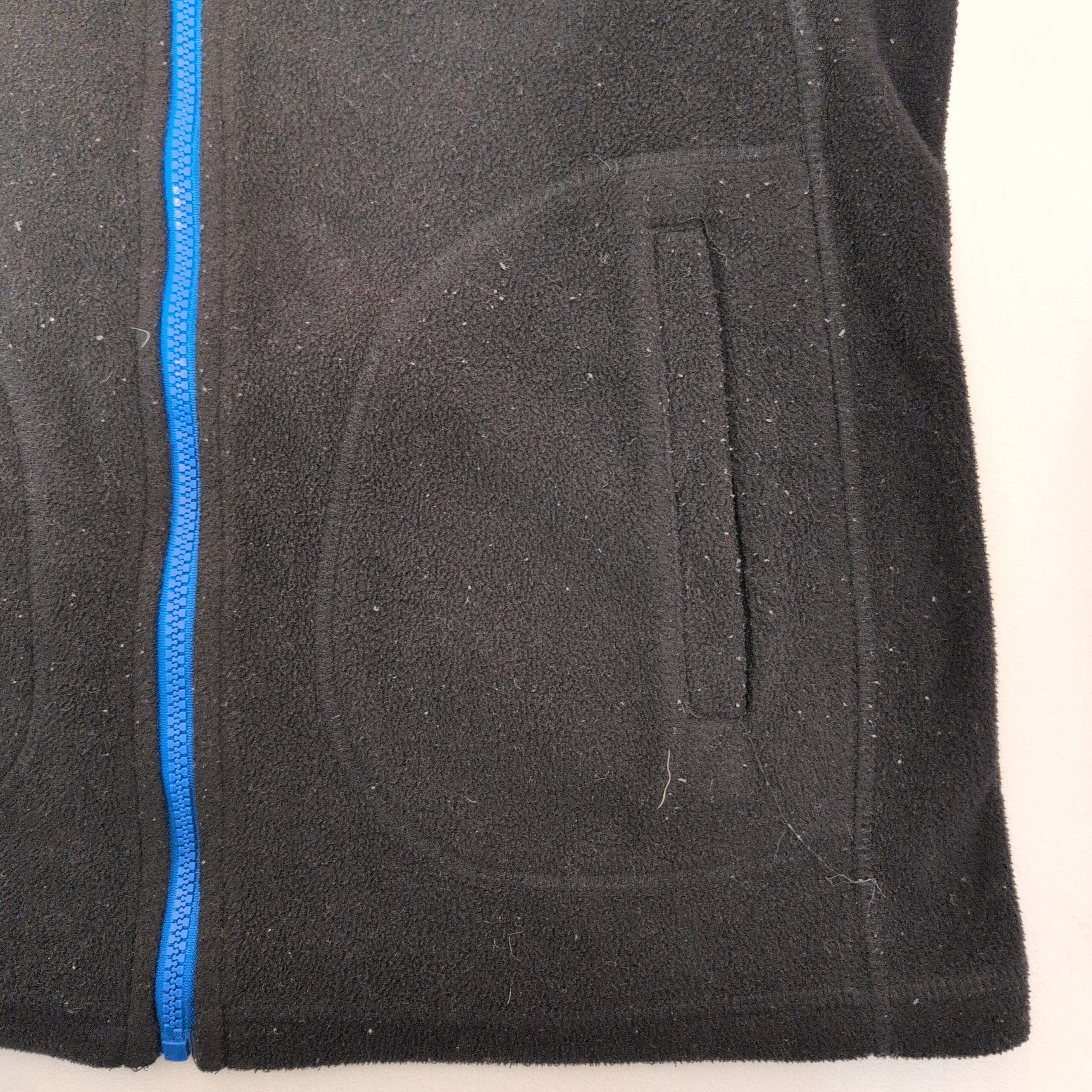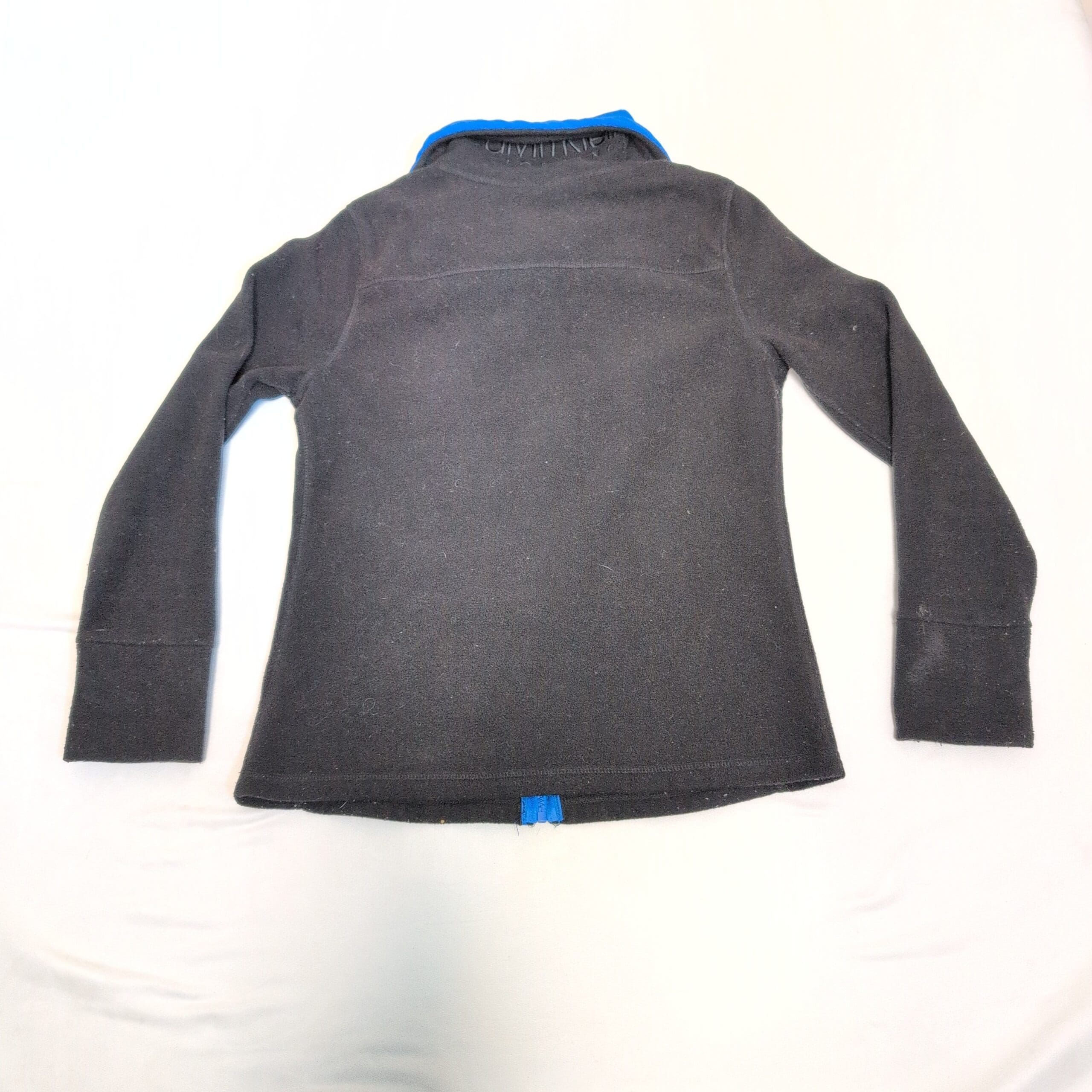 Calvin Klein women’s black fleece zip-up jacket in size S. Features a contrasting blue collar and zipper, front welt pockets, and contoured seam lines for a flattering fit. Soft, warm fleece ideal for layering and everyday wear. Overall good pre-owned condition with normal light wear; minor discoloration on one sleeve cuff (see photos) and light surface pilling. Zipper functions smoothly.