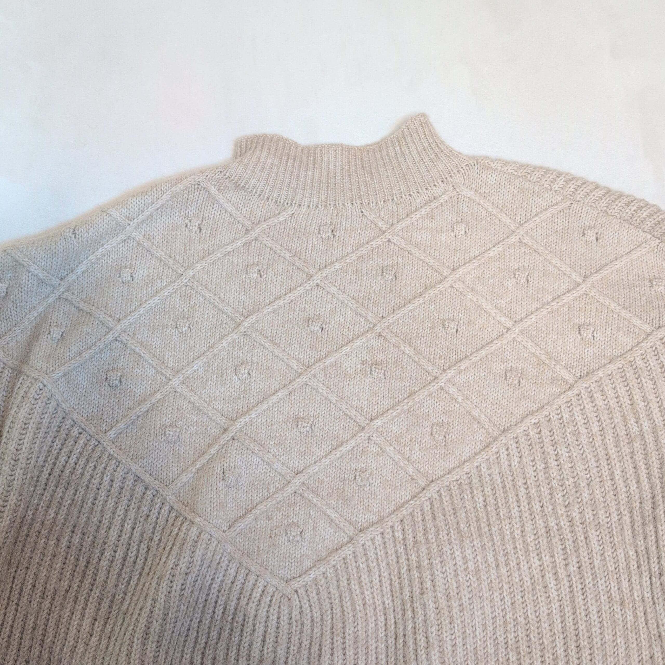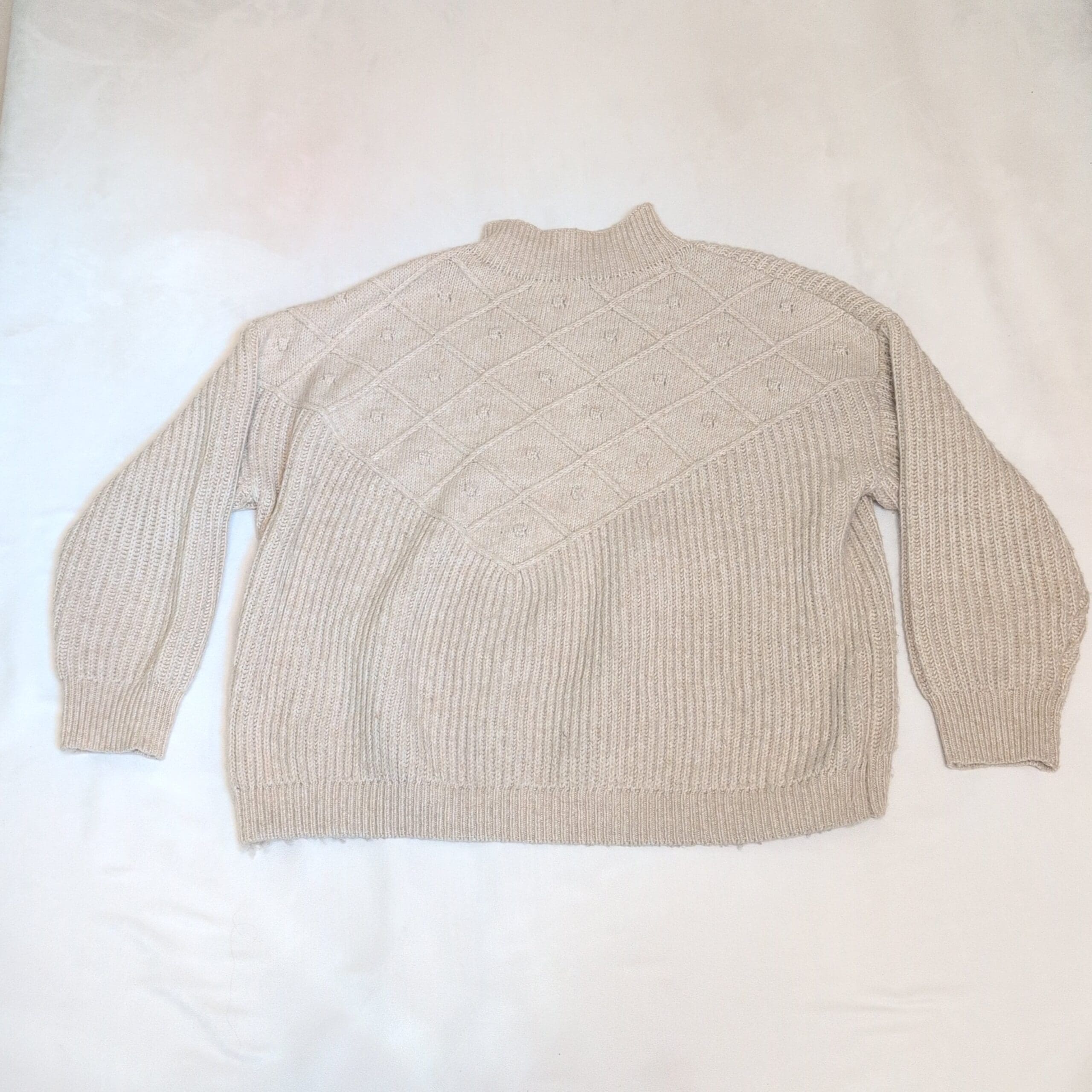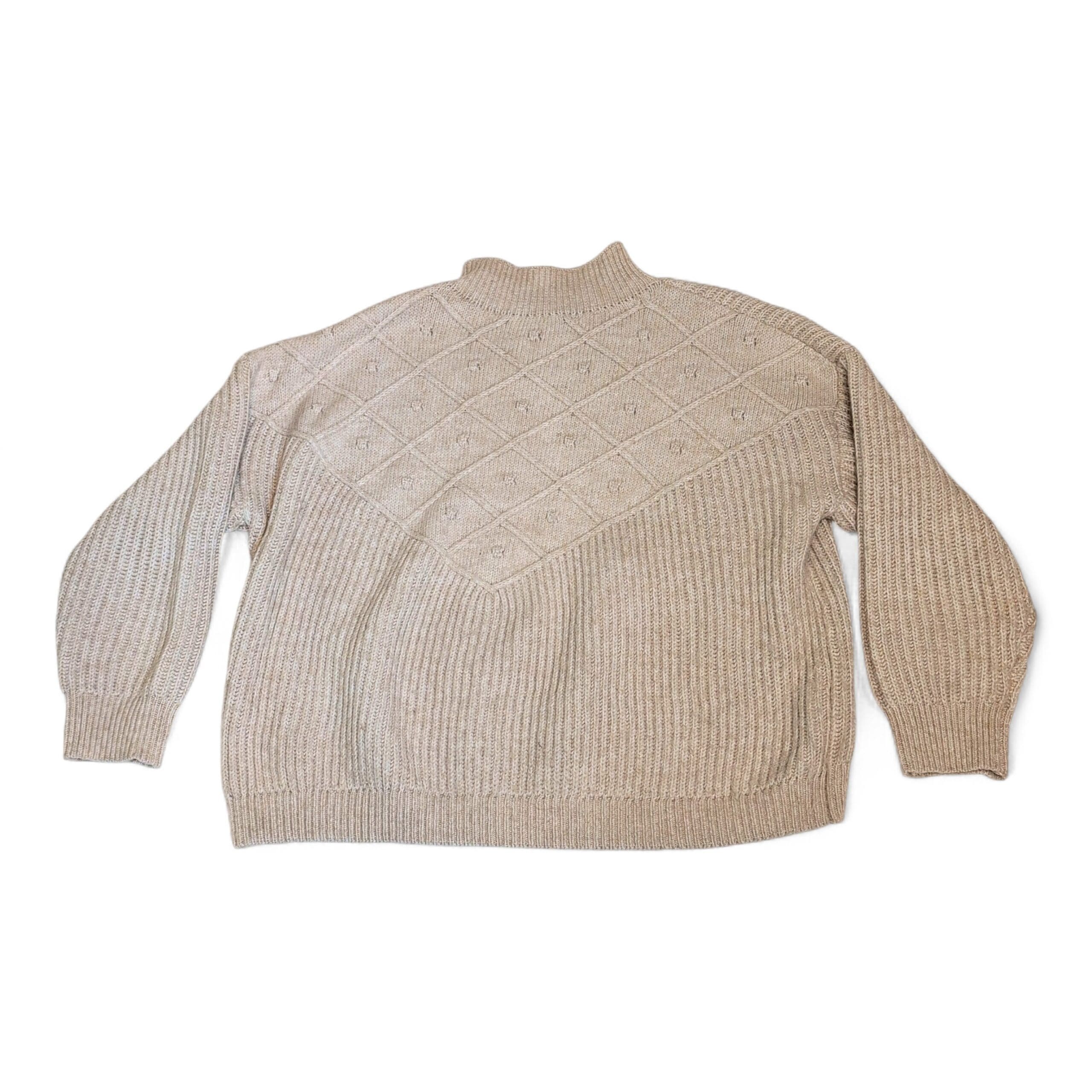 Calvin Klein women’s tan knit sweater in size L. Features a mock neck, diamond-textured yoke, and ribbed body and cuffs for a timeless, cozy look. Medium-weight knit with a relaxed, slightly boxy silhouette — ideal for layering over shirts or worn solo for a neutral, polished outfit.