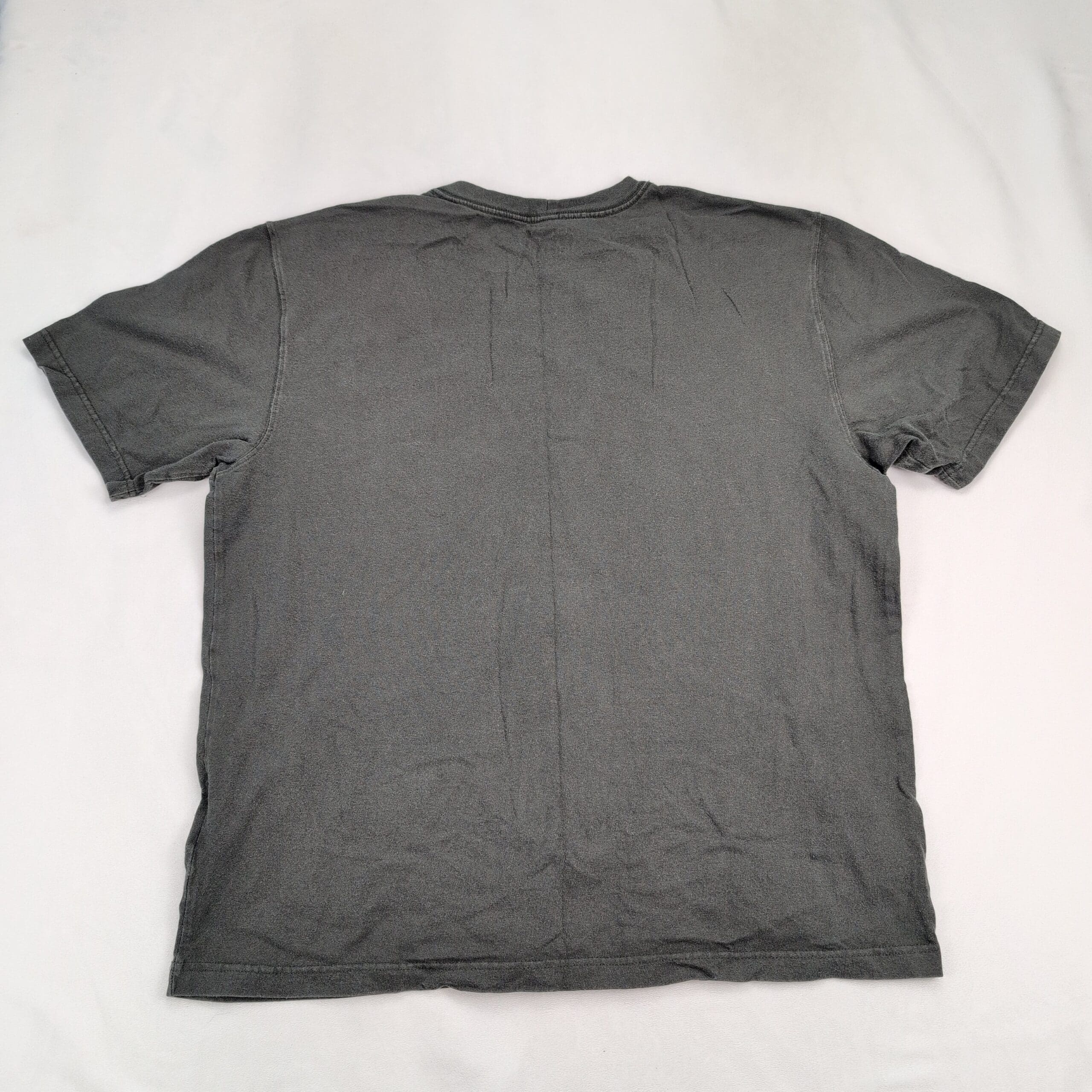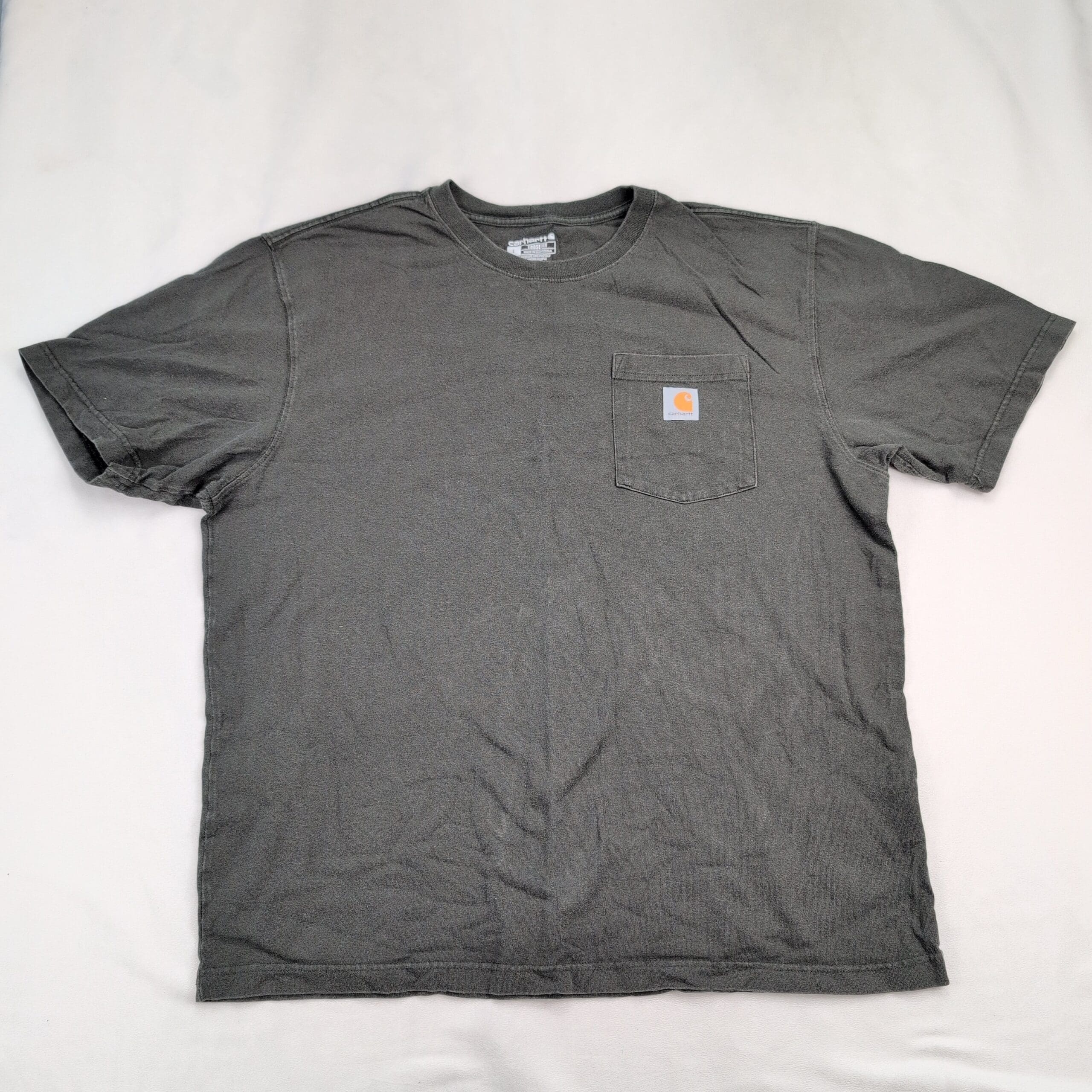 Carhartt men’s short sleeve pocket tee in size L (standard). Charcoal/stonewashed appearance with a crewneck and front chest pocket featuring the signature Carhartt logo patch. Loose, relaxed fit — ideal for layering or everyday workwear. Excellent used condition with normal light wear and softening consistent with previous use; free of major rips, stains, or flaws. See photos for color and condition details.