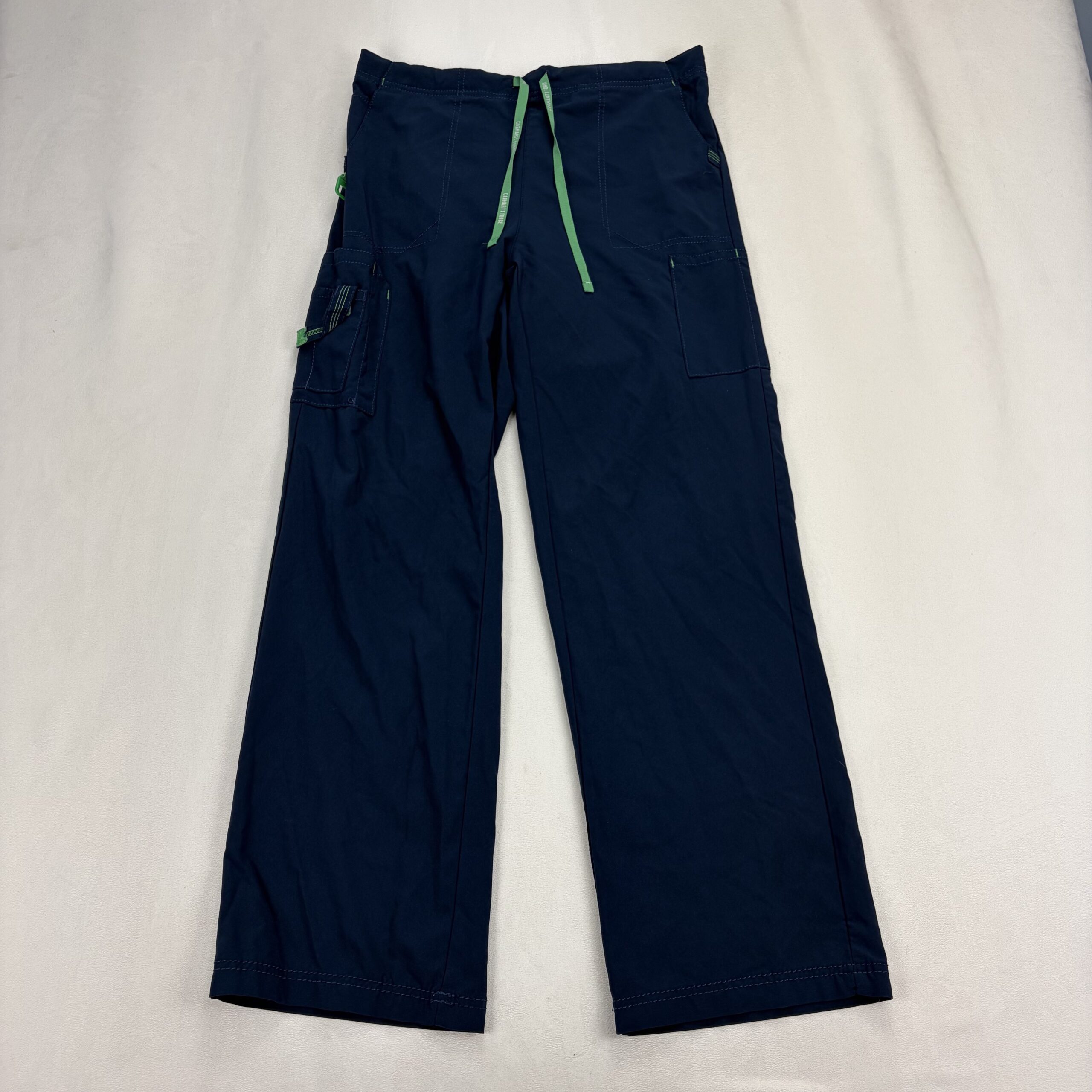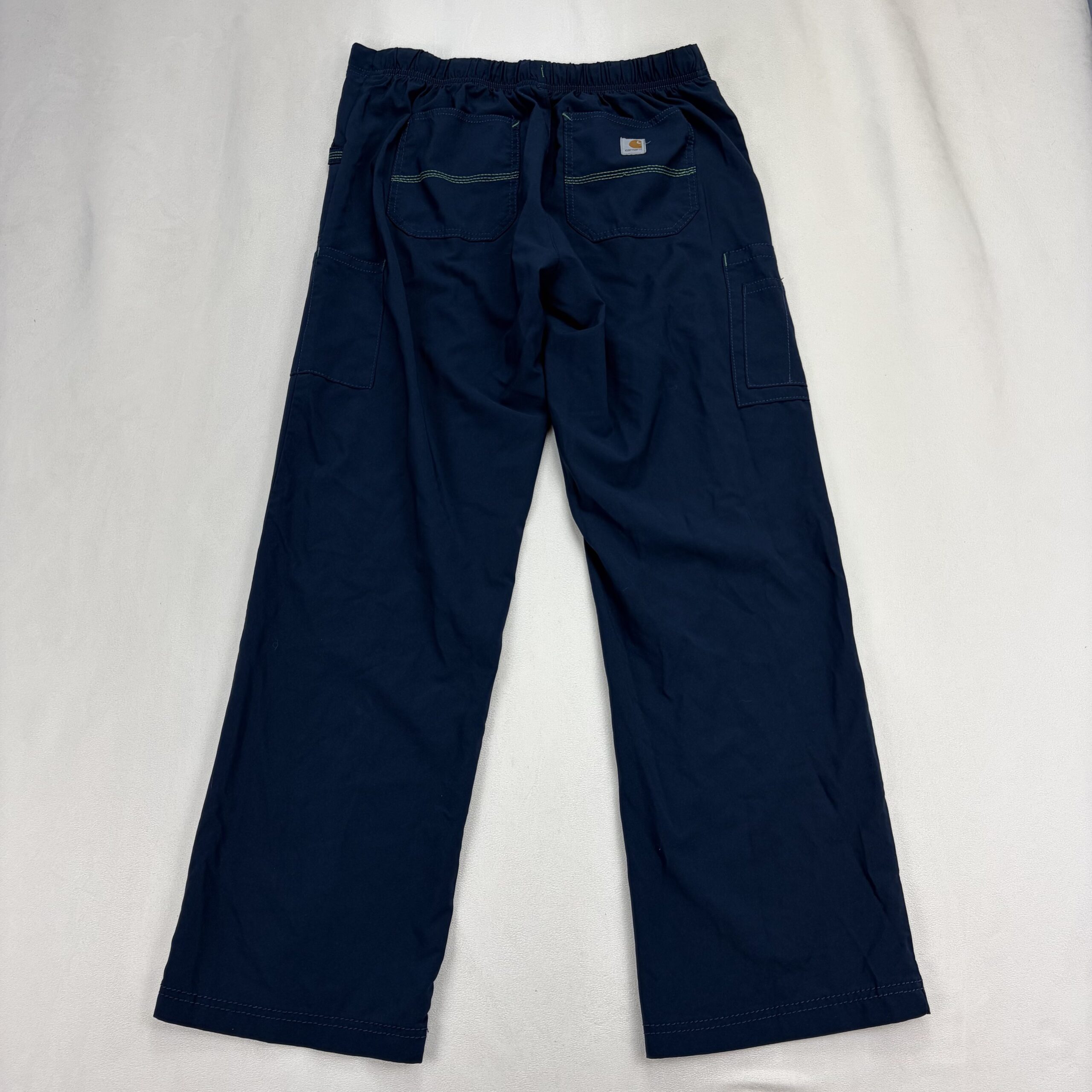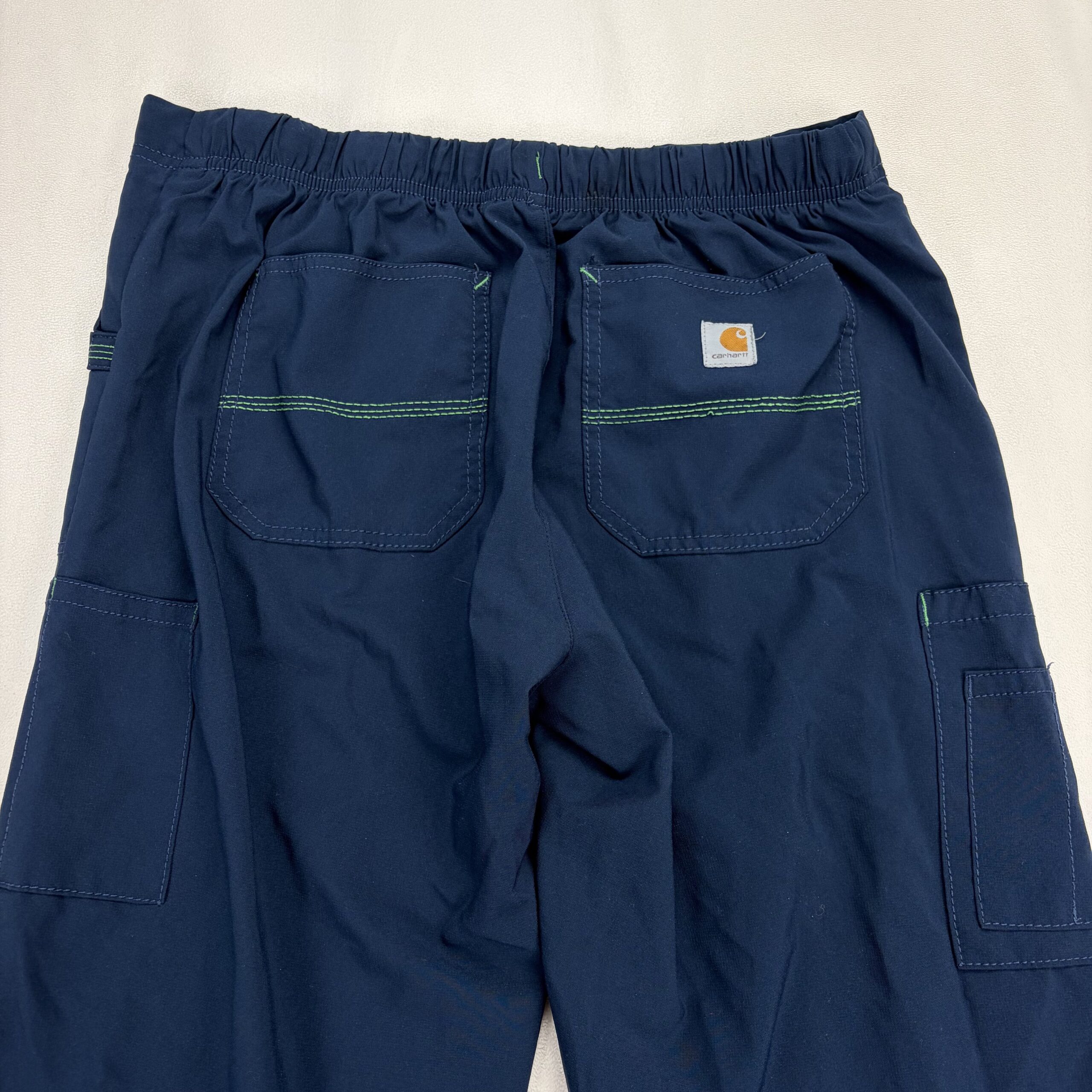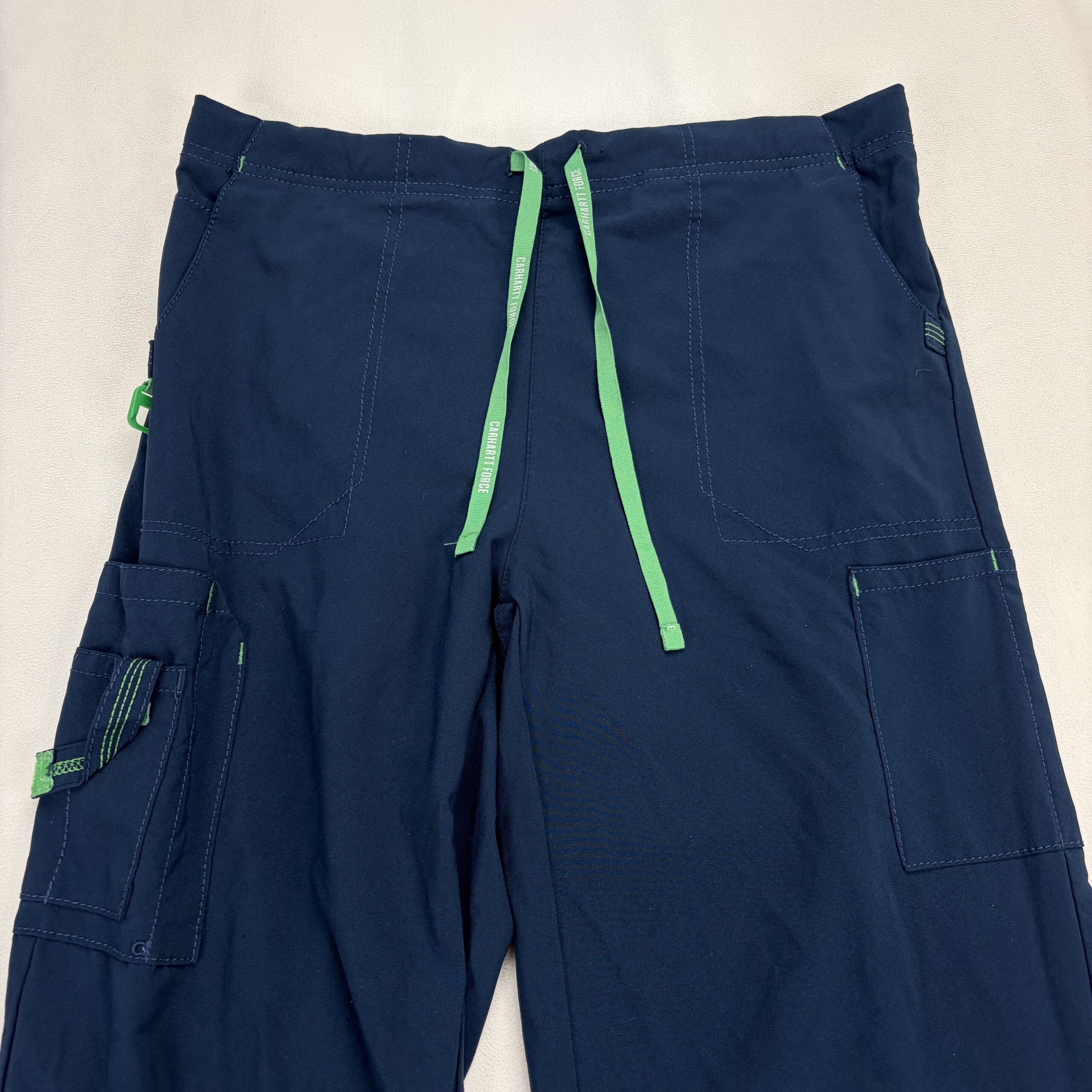 Carhartt women’s cargo jogger pants in size M. Navy with contrasting green drawstring and accent tabs. Features an elastic waistband with adjustable drawstring, multiple utility pockets including side cargo pocket and pen/tool loop, and a straight leg silhouette. Durable construction typical of Carhartt. Excellent used condition — free of major rips, tears, or stains; light, normal wear may be present. See photos for details.