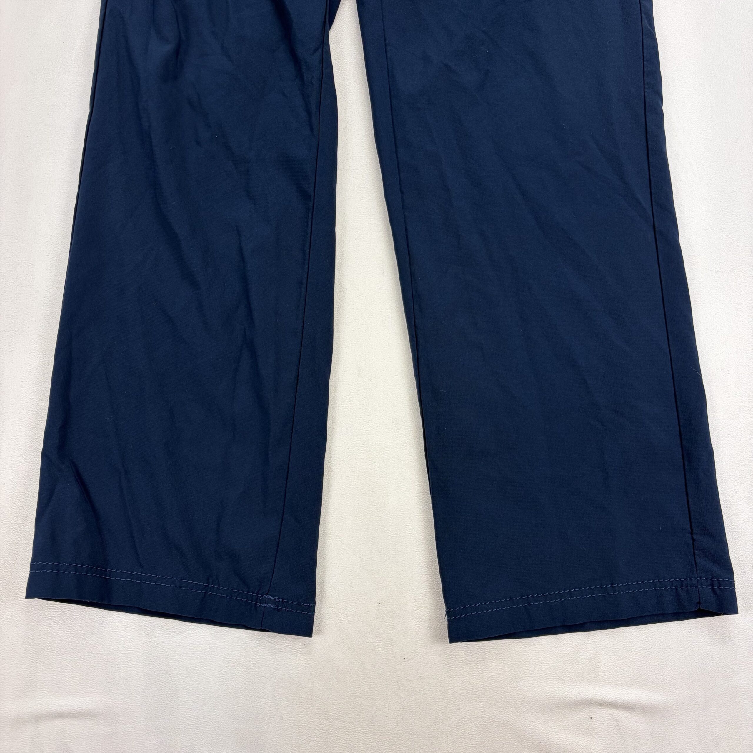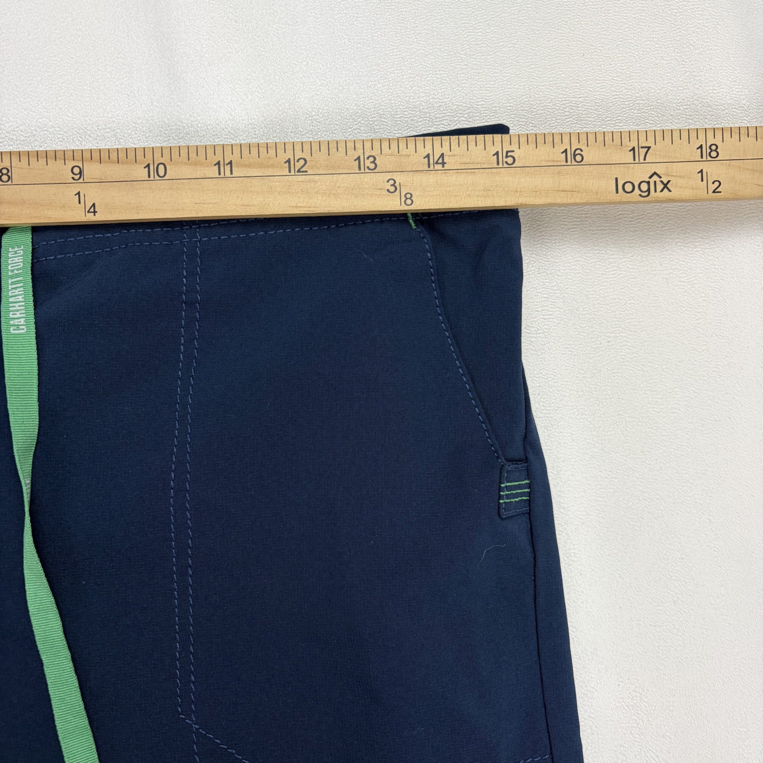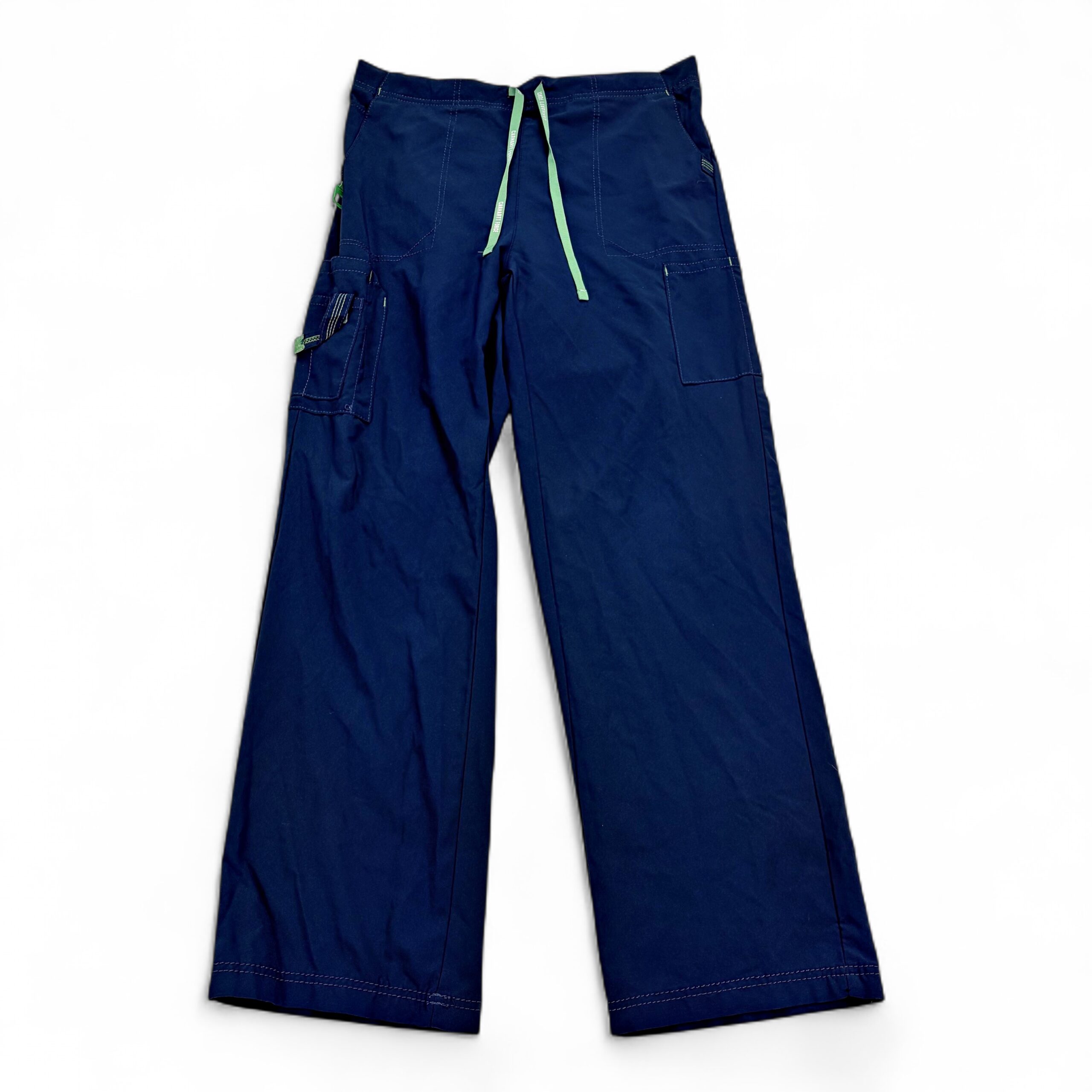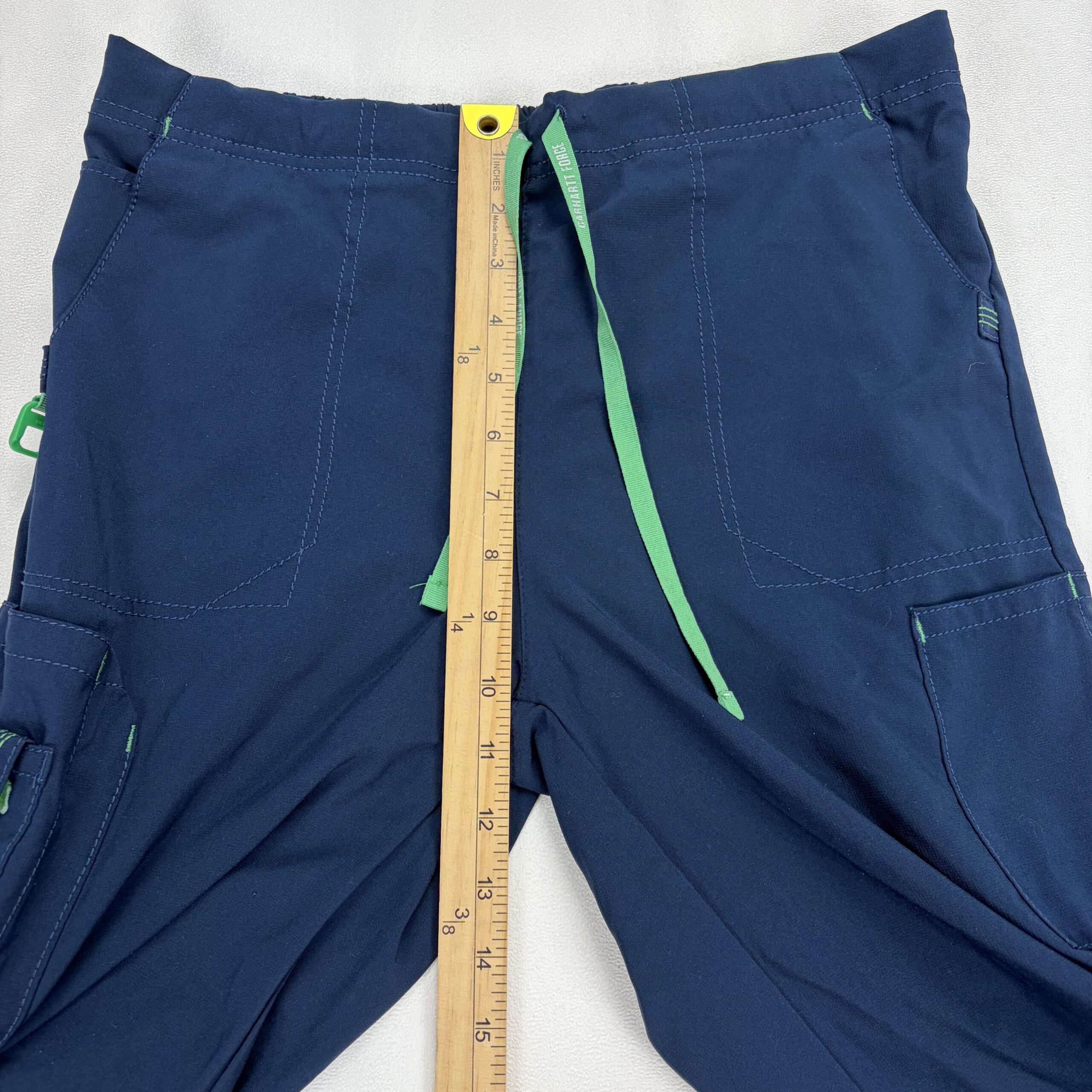 Carhartt women’s cargo jogger pants in size M. Navy with contrasting green drawstring and accent tabs. Features an elastic waistband with adjustable drawstring, multiple utility pockets including side cargo pocket and pen/tool loop, and a straight leg silhouette. Durable construction typical of Carhartt. Excellent used condition — free of major rips, tears, or stains; light, normal wear may be present. See photos for details.