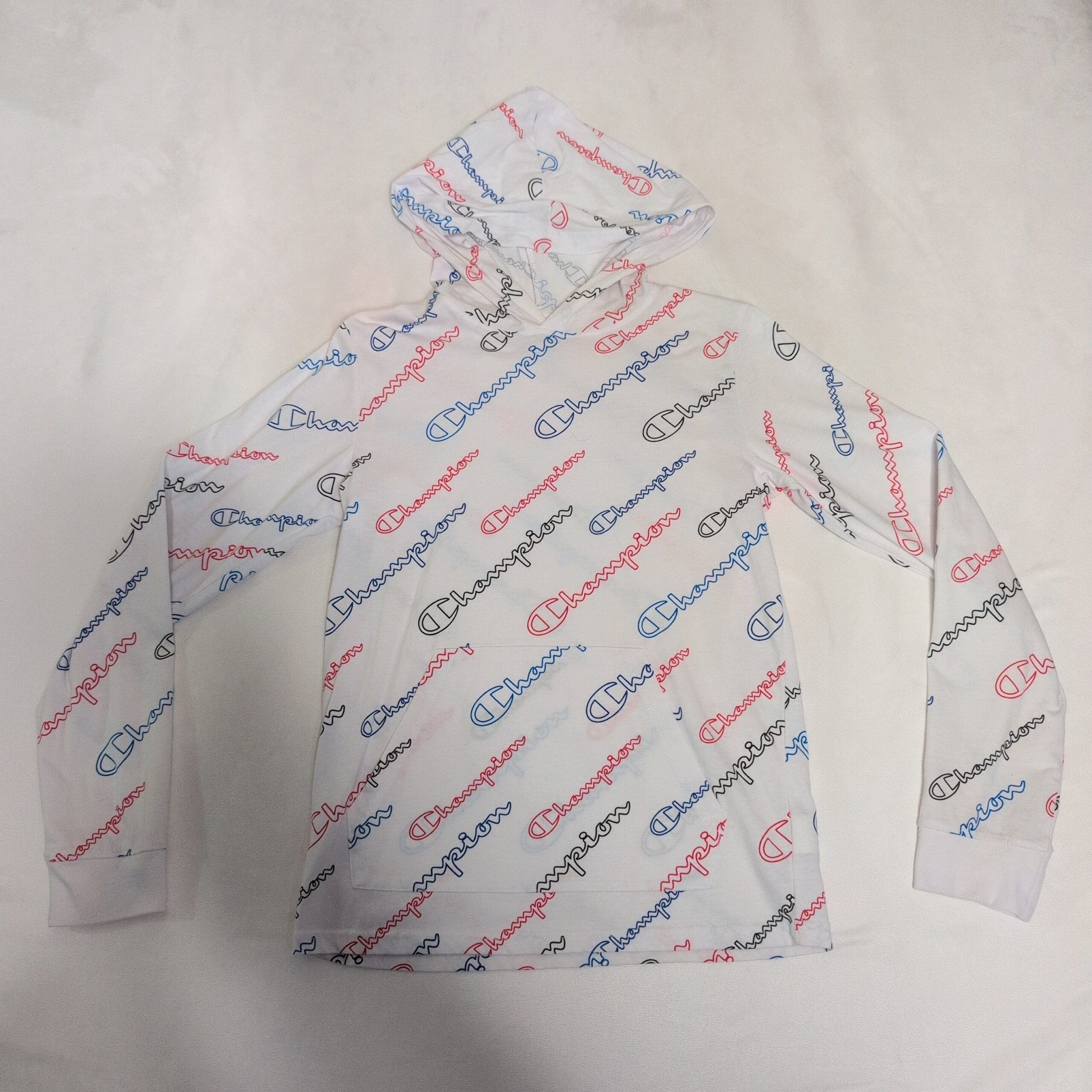 White Champion kids hooded long sleeve tee in XL (Boys). Pullover style with attached hood and multicolor all-over Champion script logo for a bold athletic look. Ribbed cuffs and a comfortable fit make it great for layering or everyday wear. Pre-owned, gently used — please review photos for details and condition before purchasing.