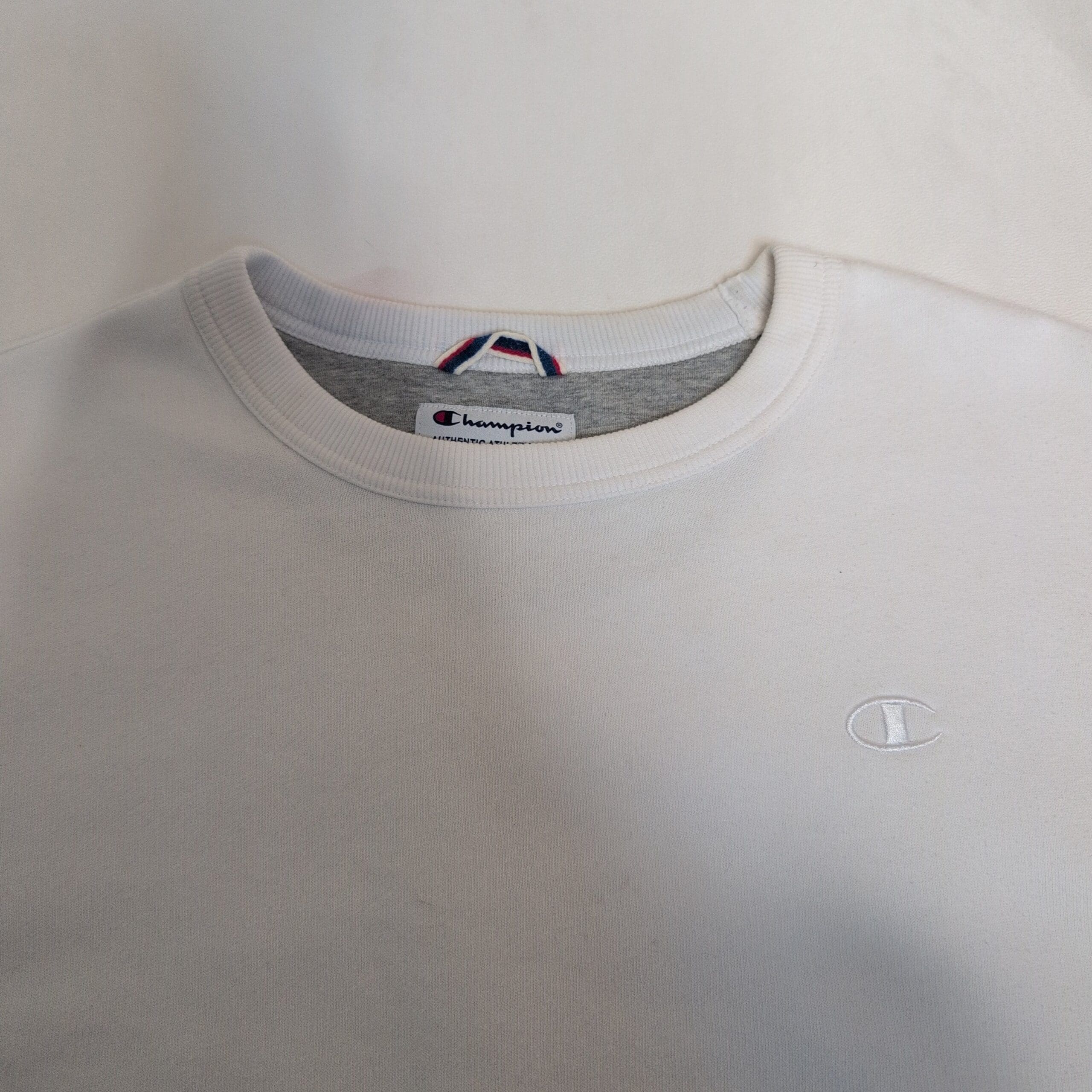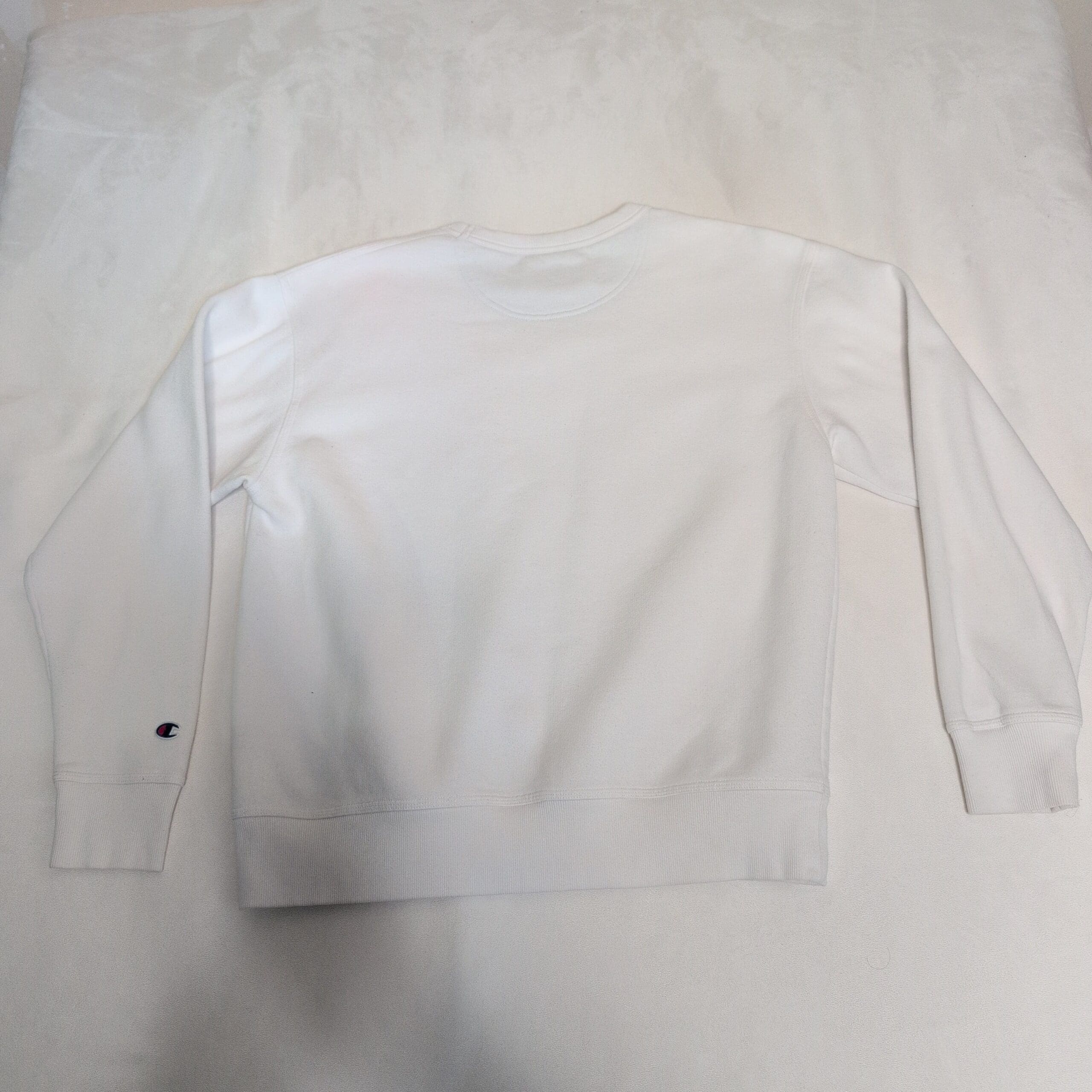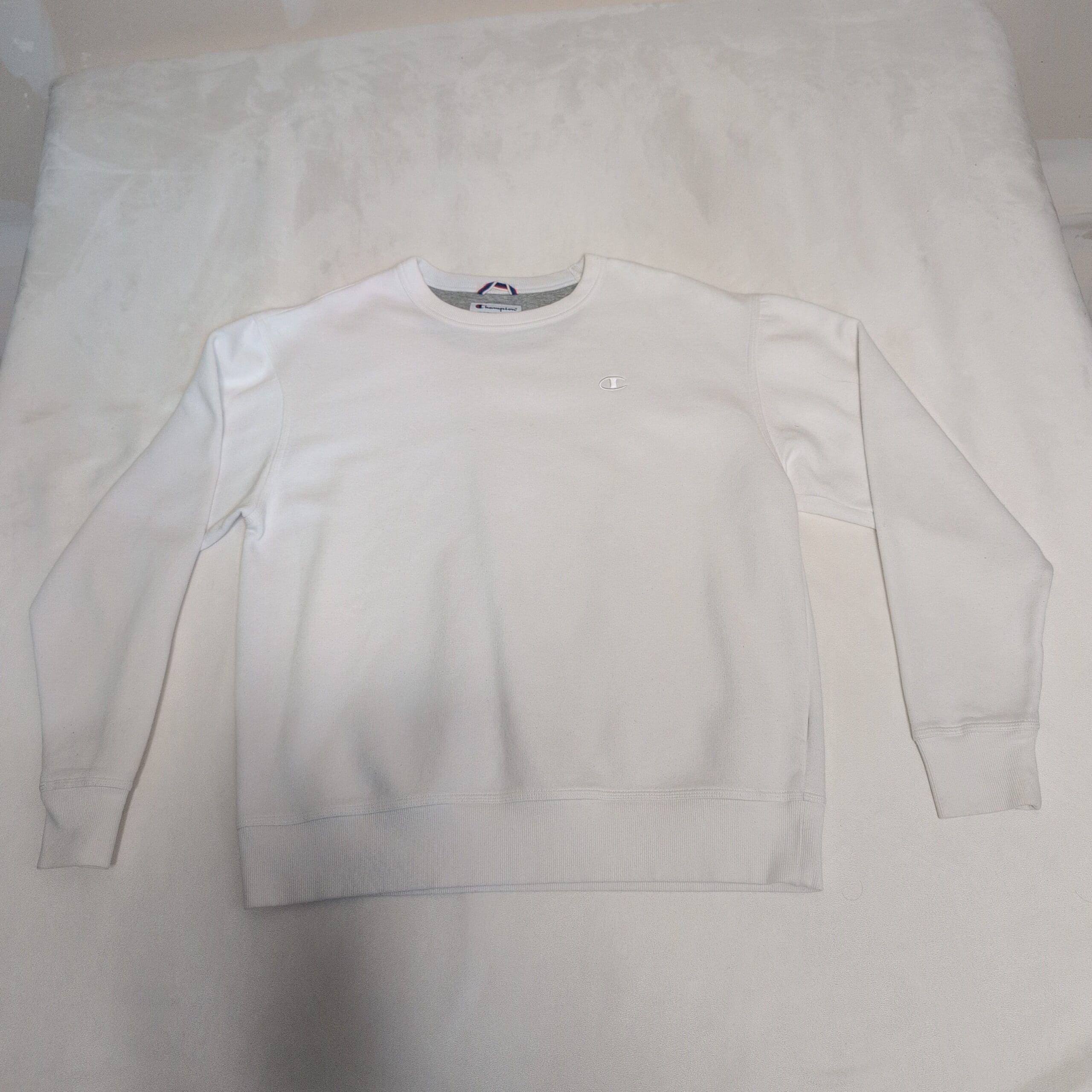 Champion men’s crewneck sweatshirt in classic white, size L. Clean, minimalist design with the small embroidered Champion “C” on the left chest, ribbed cuffs and hem, and a relaxed, everyday fit. Lightly pre-owned with a few minor scuffs and very faint marks that were difficult to capture in photos — please review images for condition details. Comfortable staple for casual wear or layering.