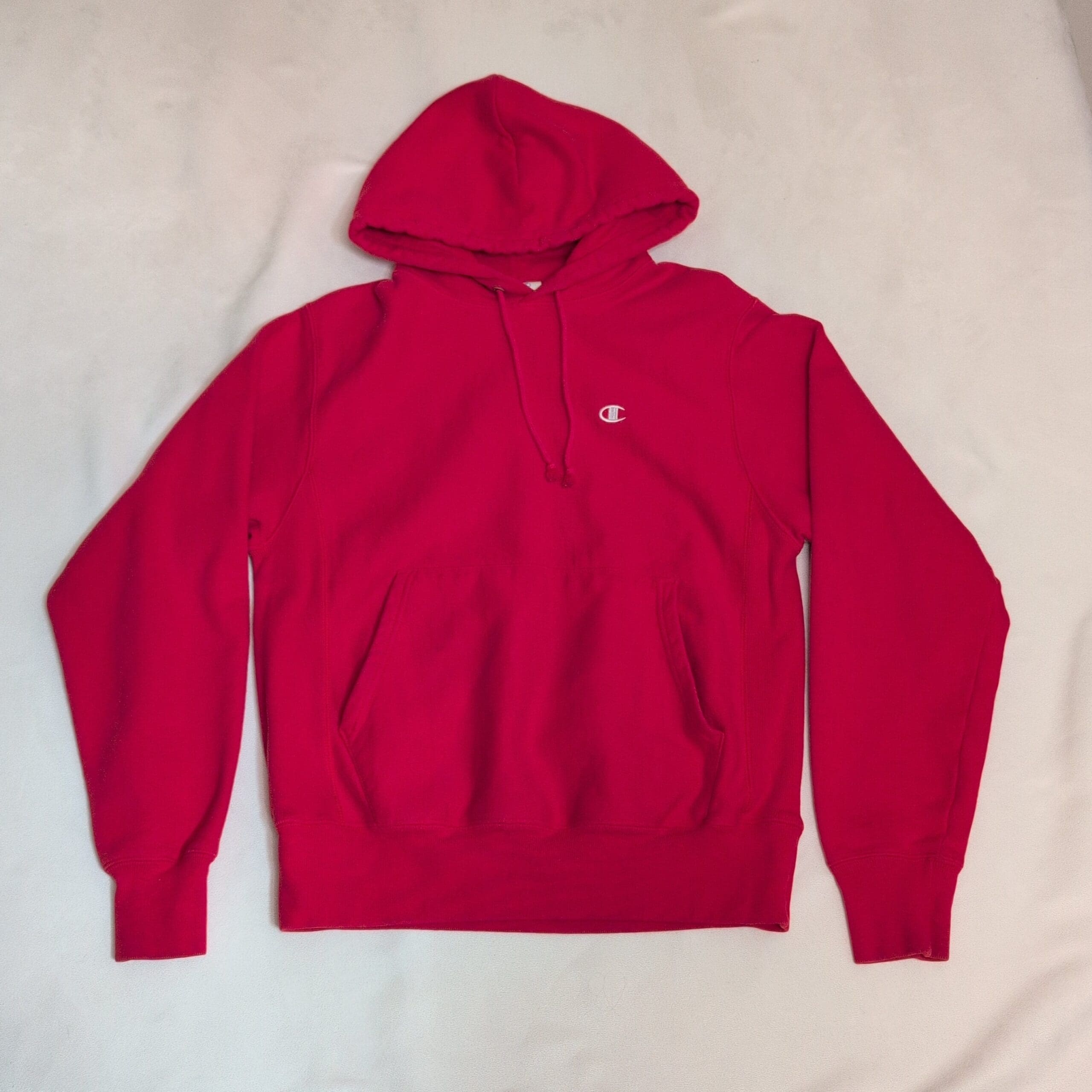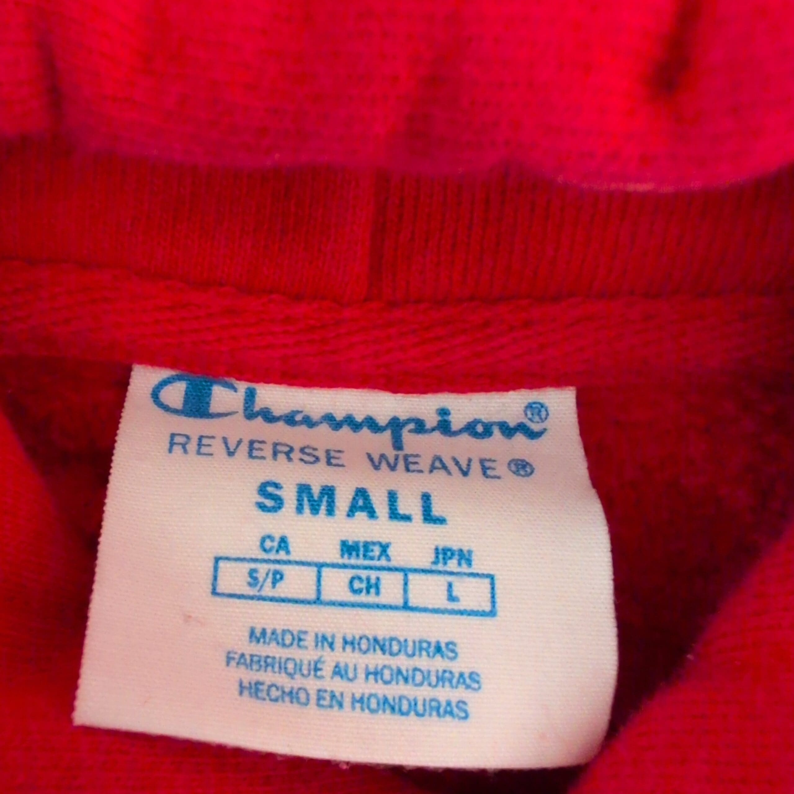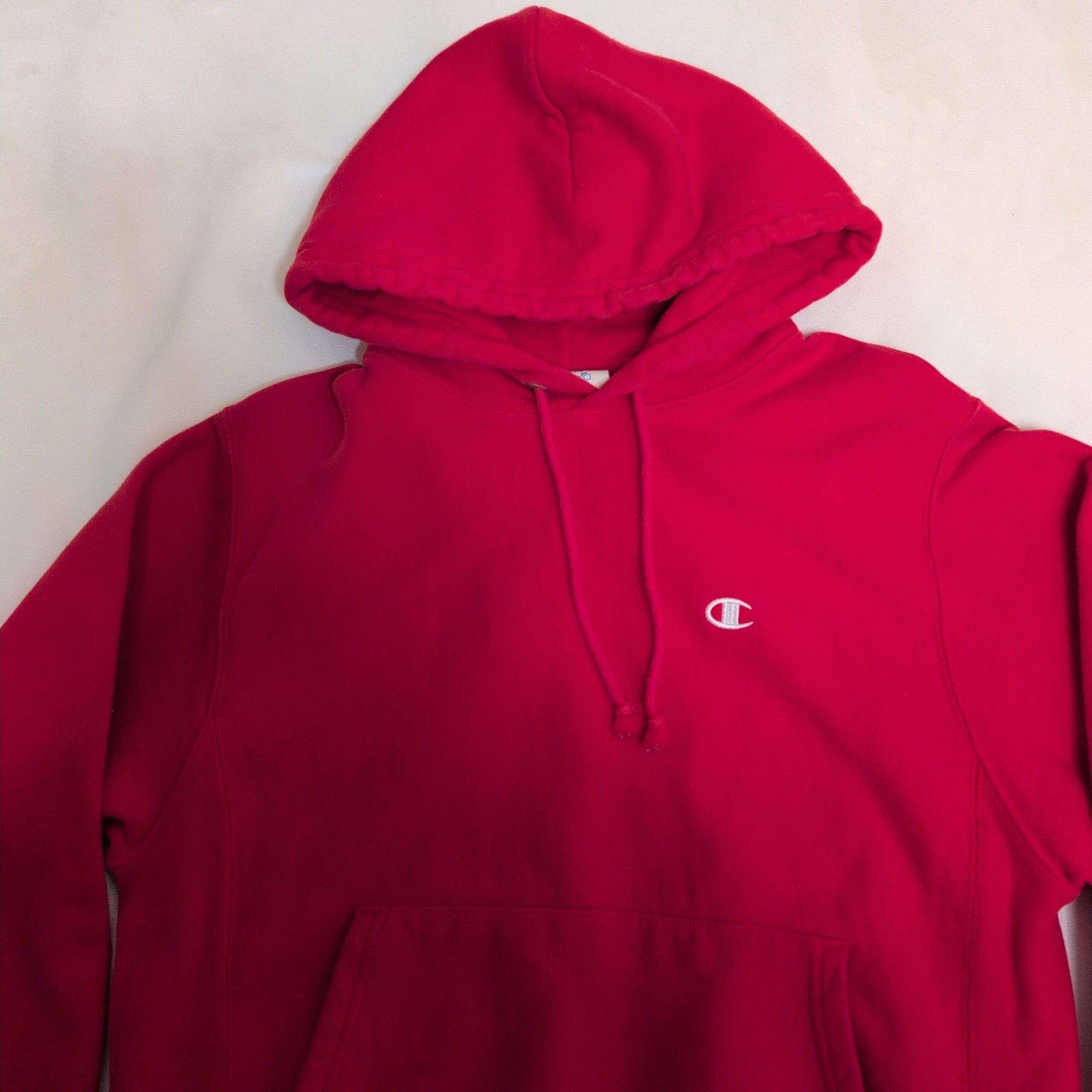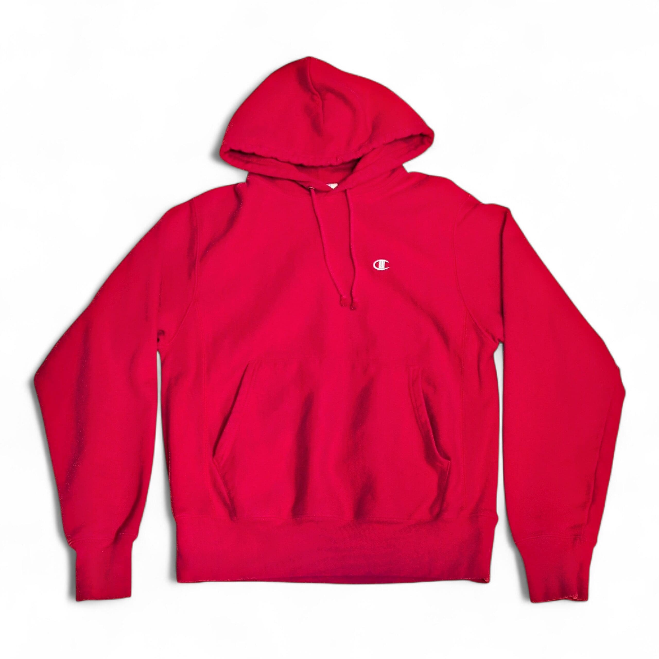 Men’s Champion pullover hoodie in vibrant red, size S. Classic pullover design with drawstring hood, kangaroo pocket, and ribbed cuffs and hem. Features the small embroidered Champion “C” logo at the chest. Gently used — free of major rips, tears, or stains; typical wear such as light pilling or slight fading may be present. Please review photos for color and condition.