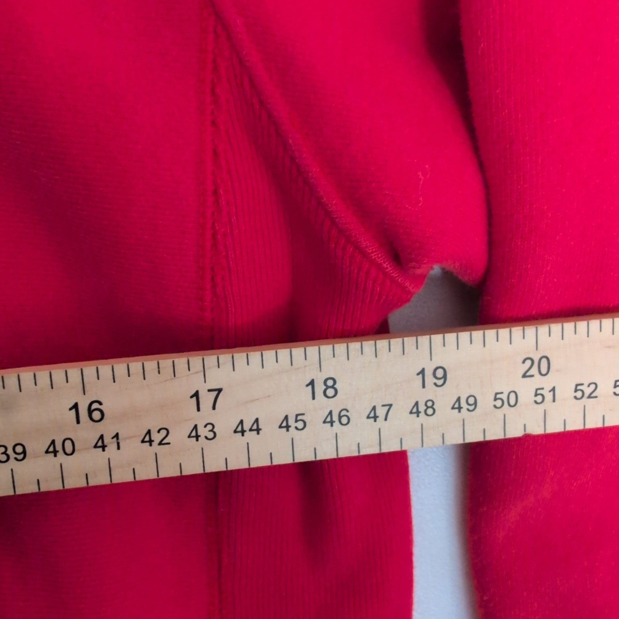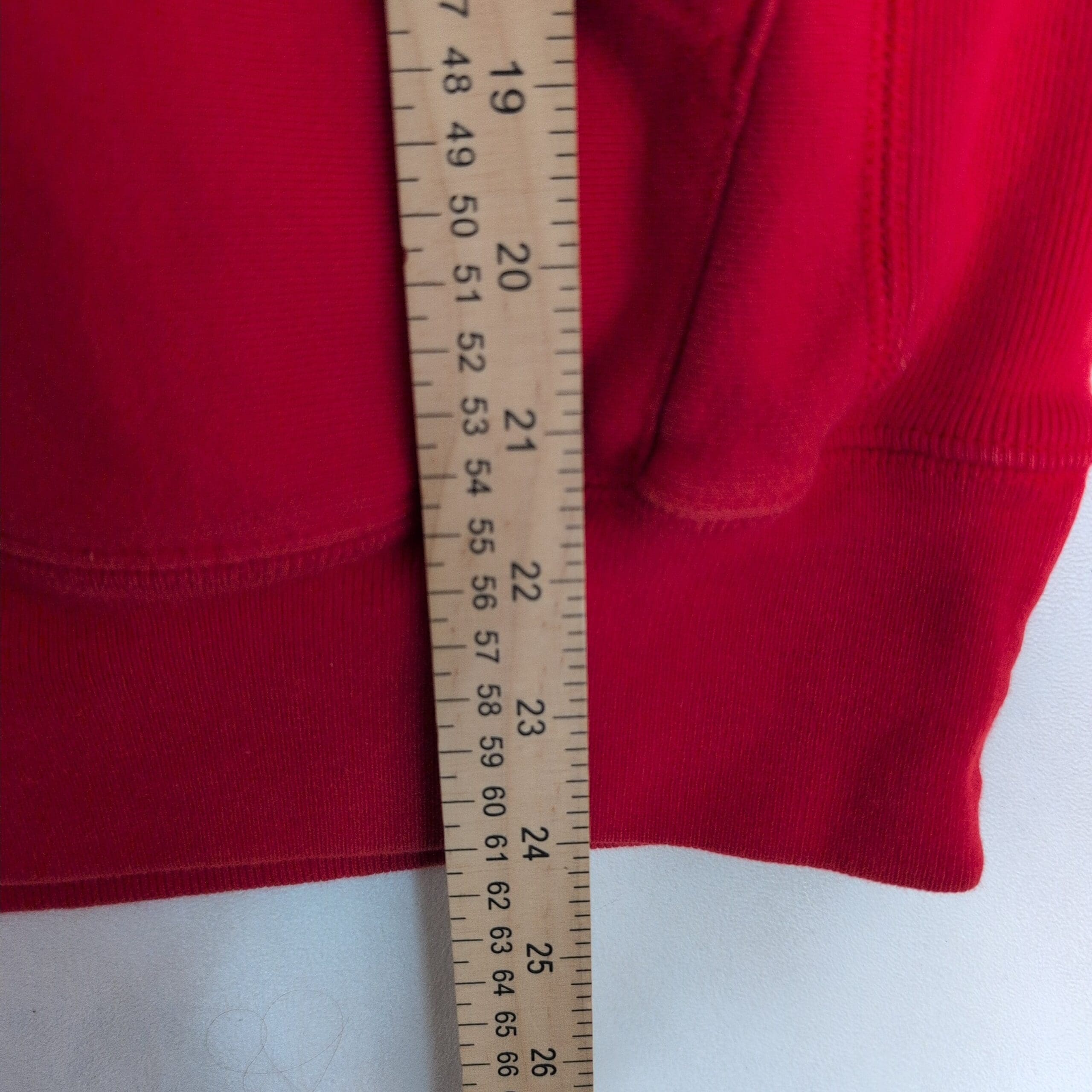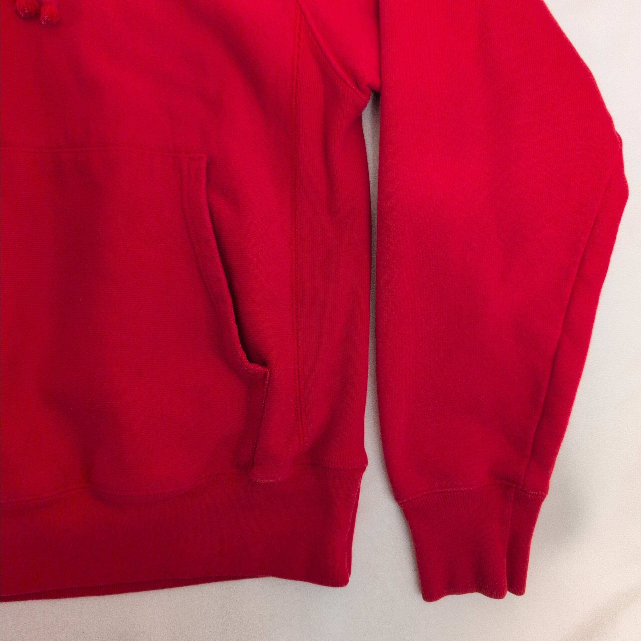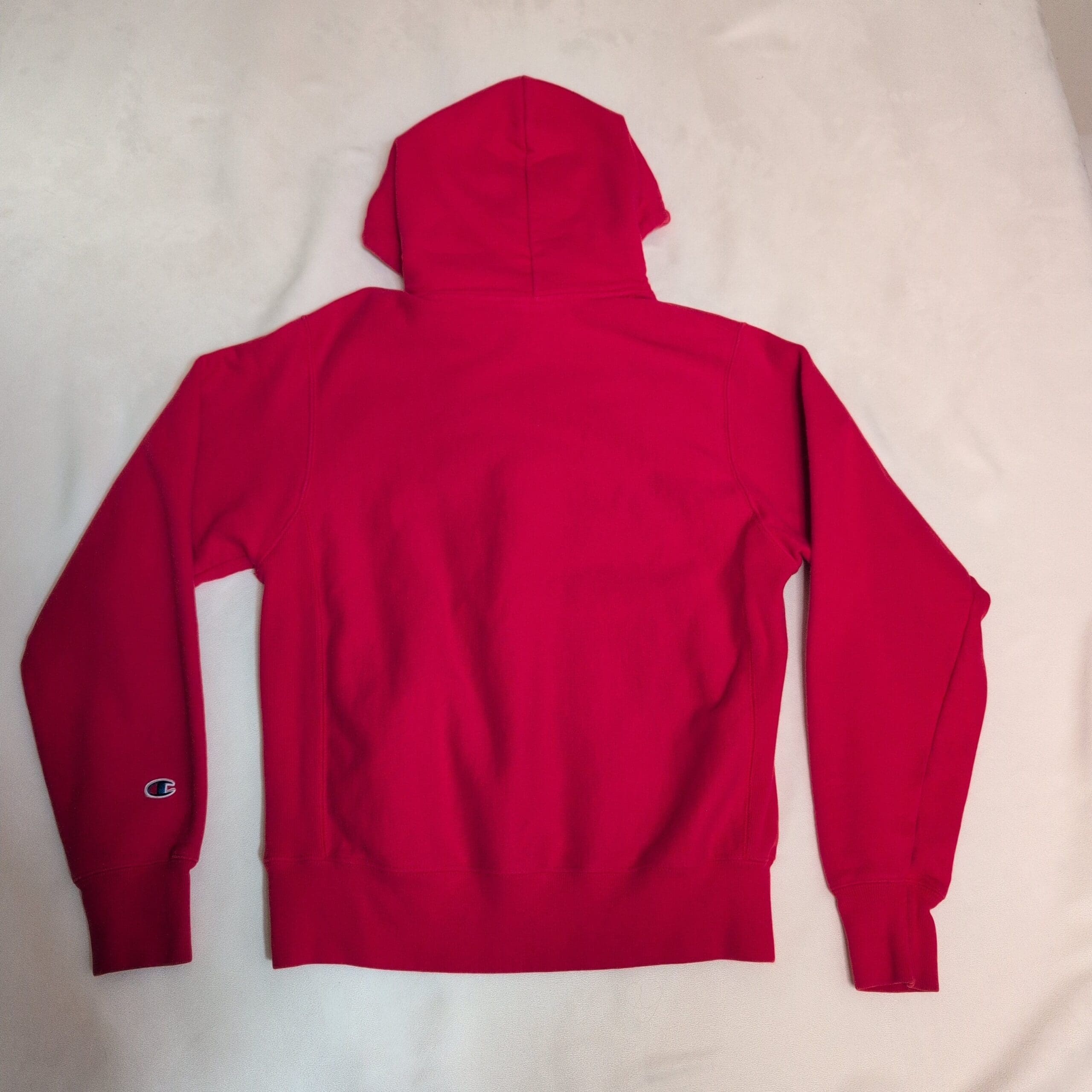 Men’s Champion pullover hoodie in vibrant red, size S. Classic pullover design with drawstring hood, kangaroo pocket, and ribbed cuffs and hem. Features the small embroidered Champion “C” logo at the chest. Gently used — free of major rips, tears, or stains; typical wear such as light pilling or slight fading may be present. Please review photos for color and condition.