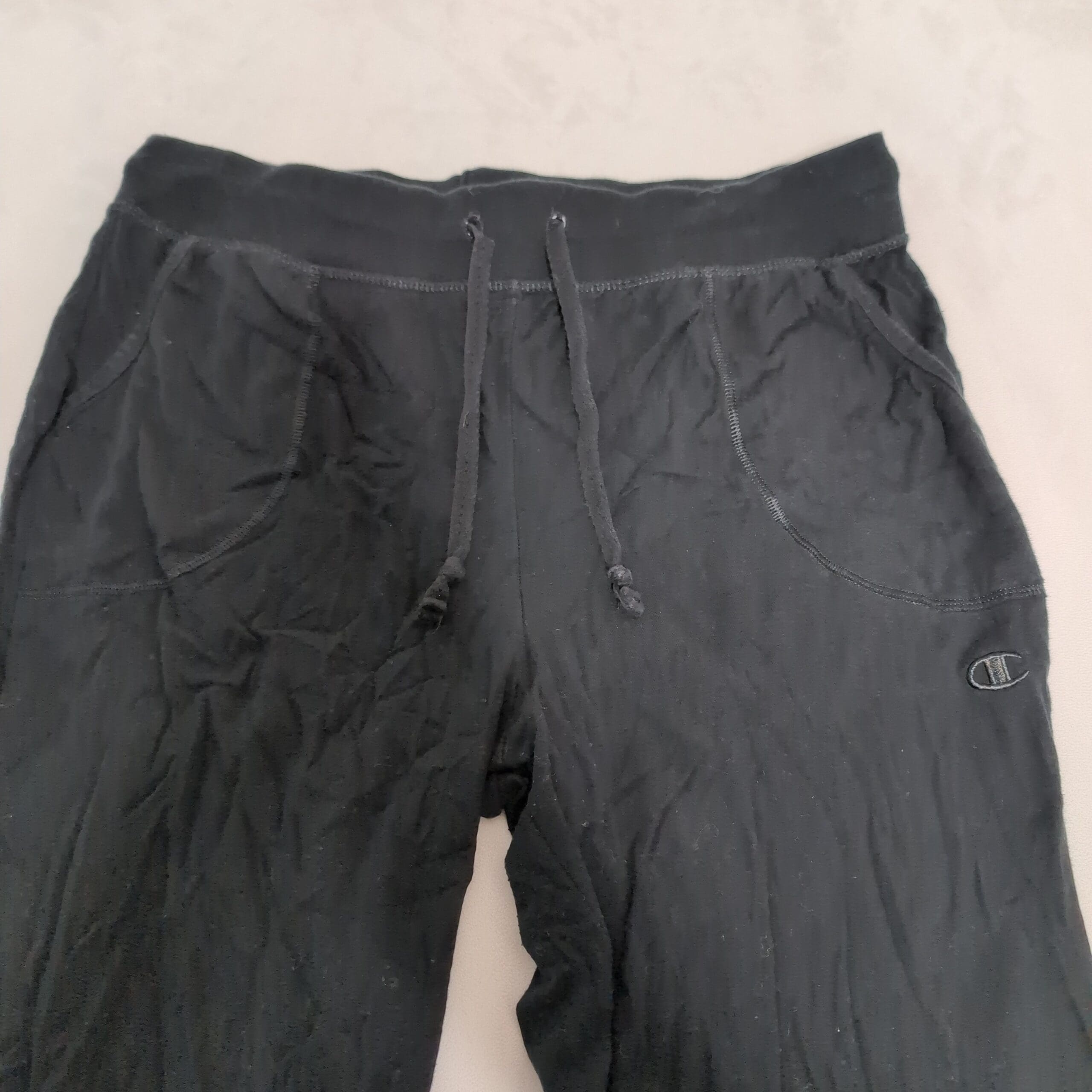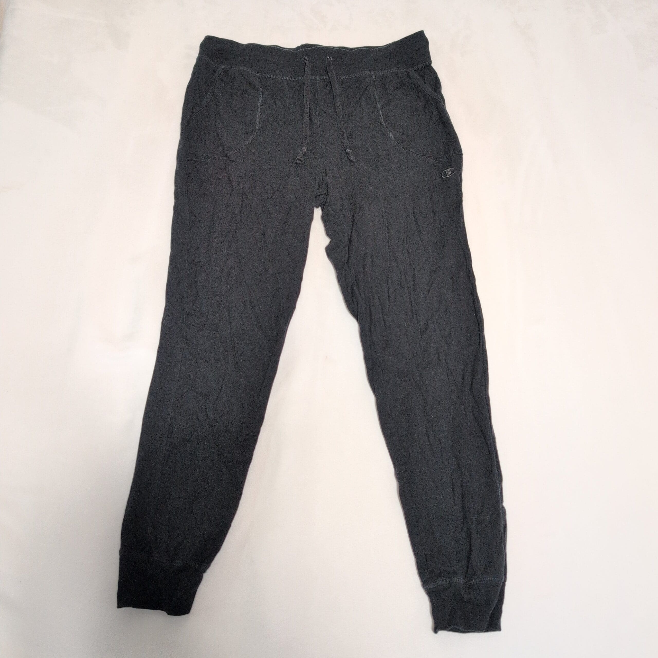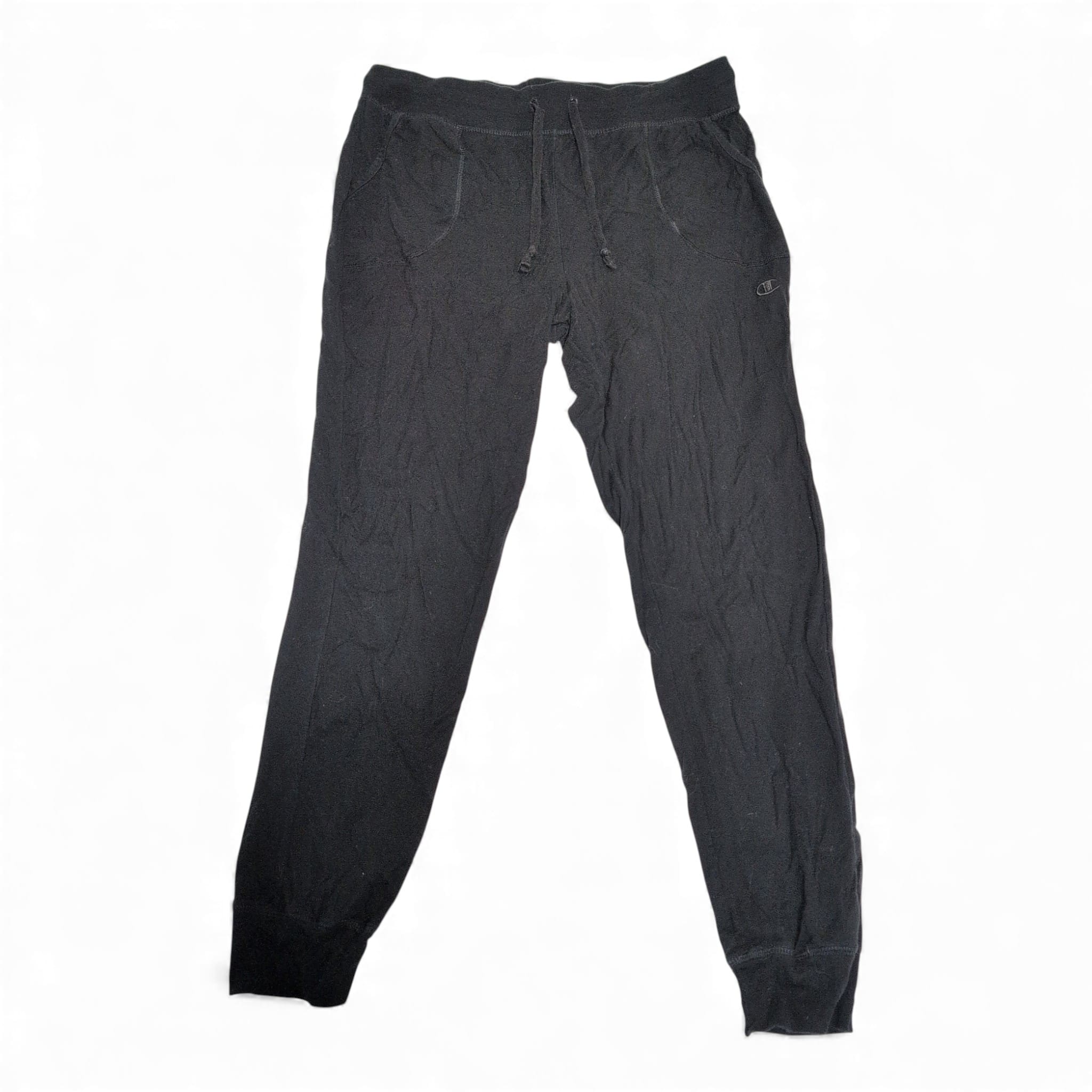 Classic Champion women’s black joggers in size L. Soft midweight fabric with an elastic waistband, adjustable drawstring, side pockets, and cuffed ankles for a tapered fit. Embroidered Champion “C” logo at the left thigh. Pre-owned and gently worn with light surface wear and mild fading consistent with normal use; no rips or stains visible and all elastic and seams are intact. Perfect for everyday athleisure, workouts, or lounging.