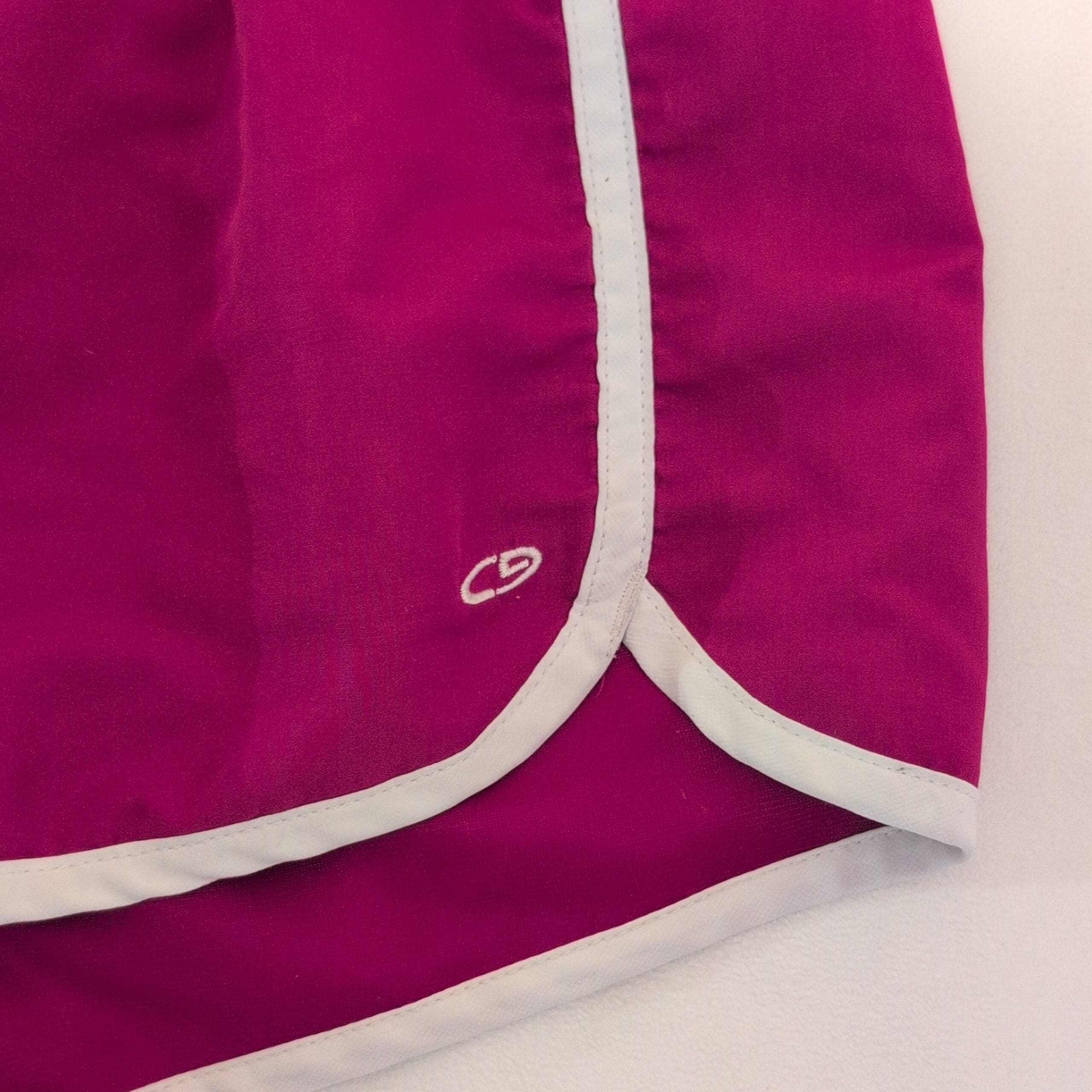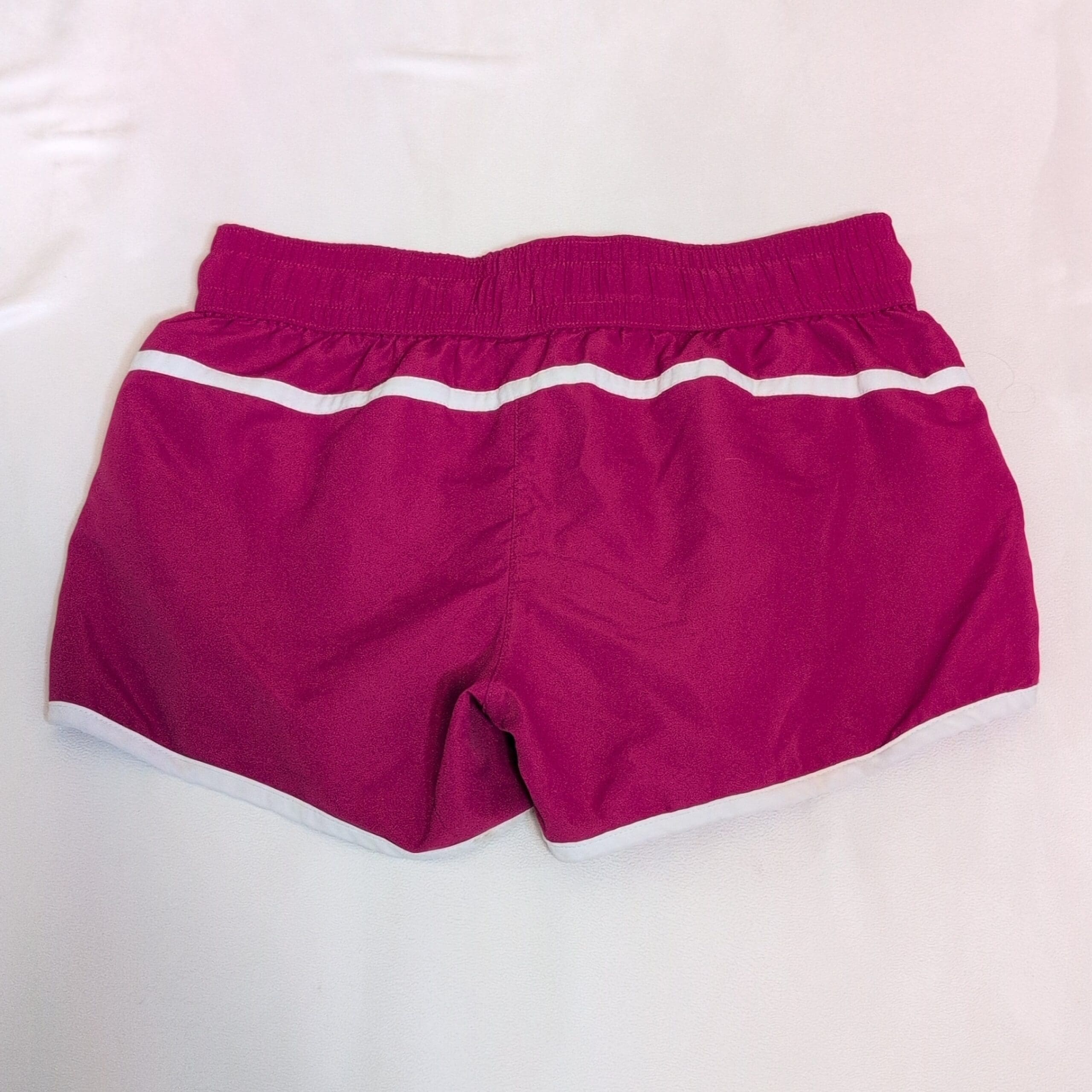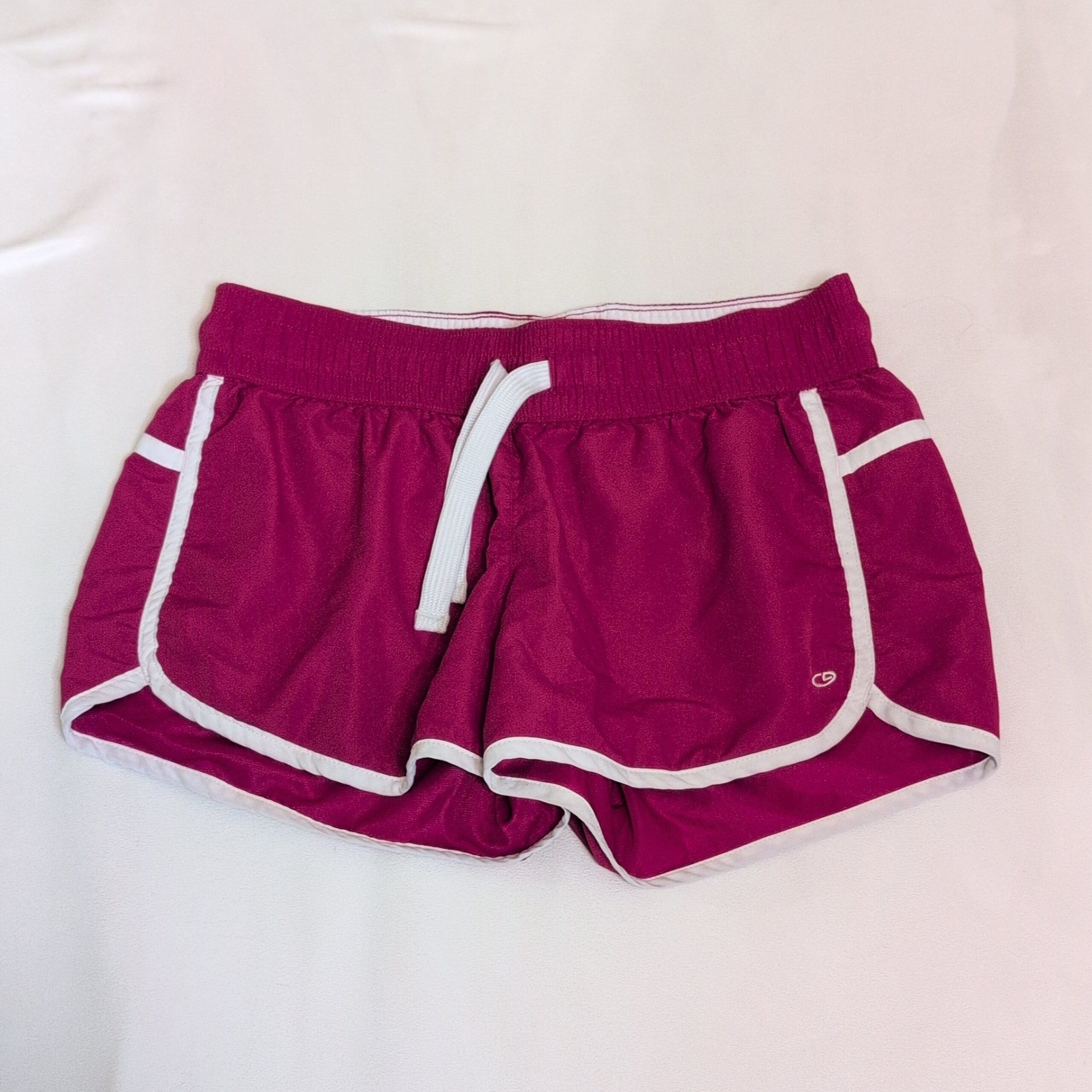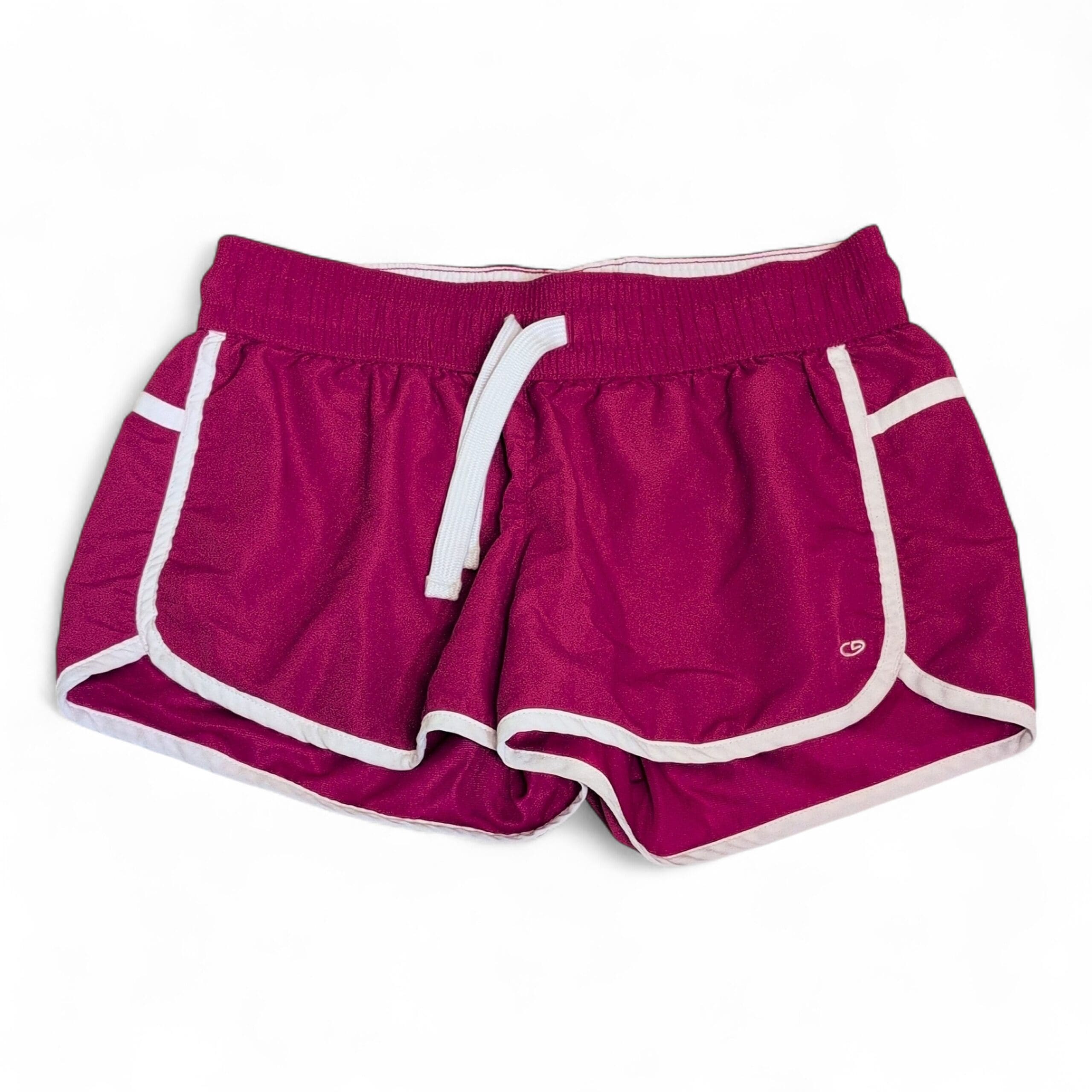 Champion women’s athletic shorts in bright pink with white contrast piping. Features an elastic waistband with adjustable white drawstring, curved side hems for ease of movement, and a small Champion logo at the hem. Lightweight performance-style shorts ideal for running, gym workouts, or casual wear. Gently used condition; free of major rips, tears, stains, or flaws. Typical wear may be present.
