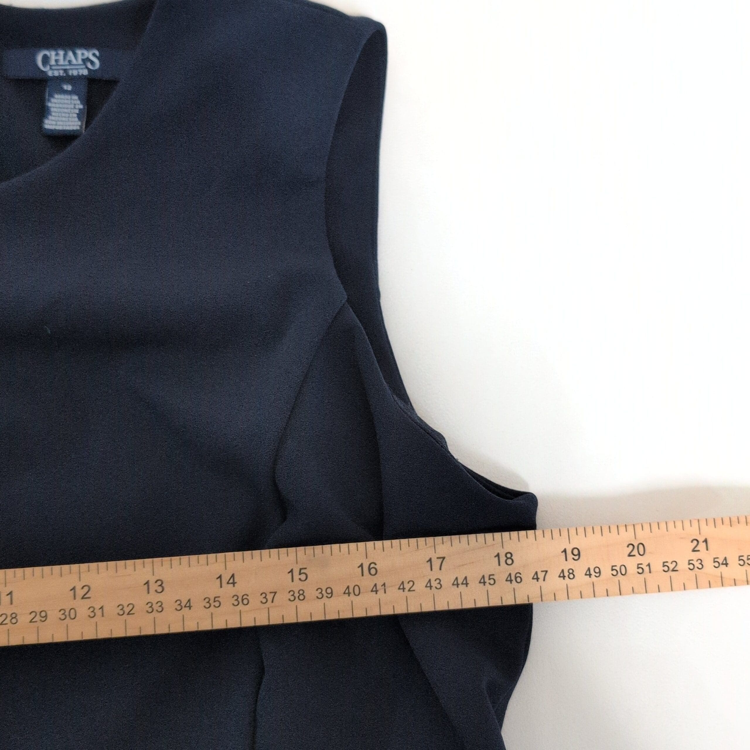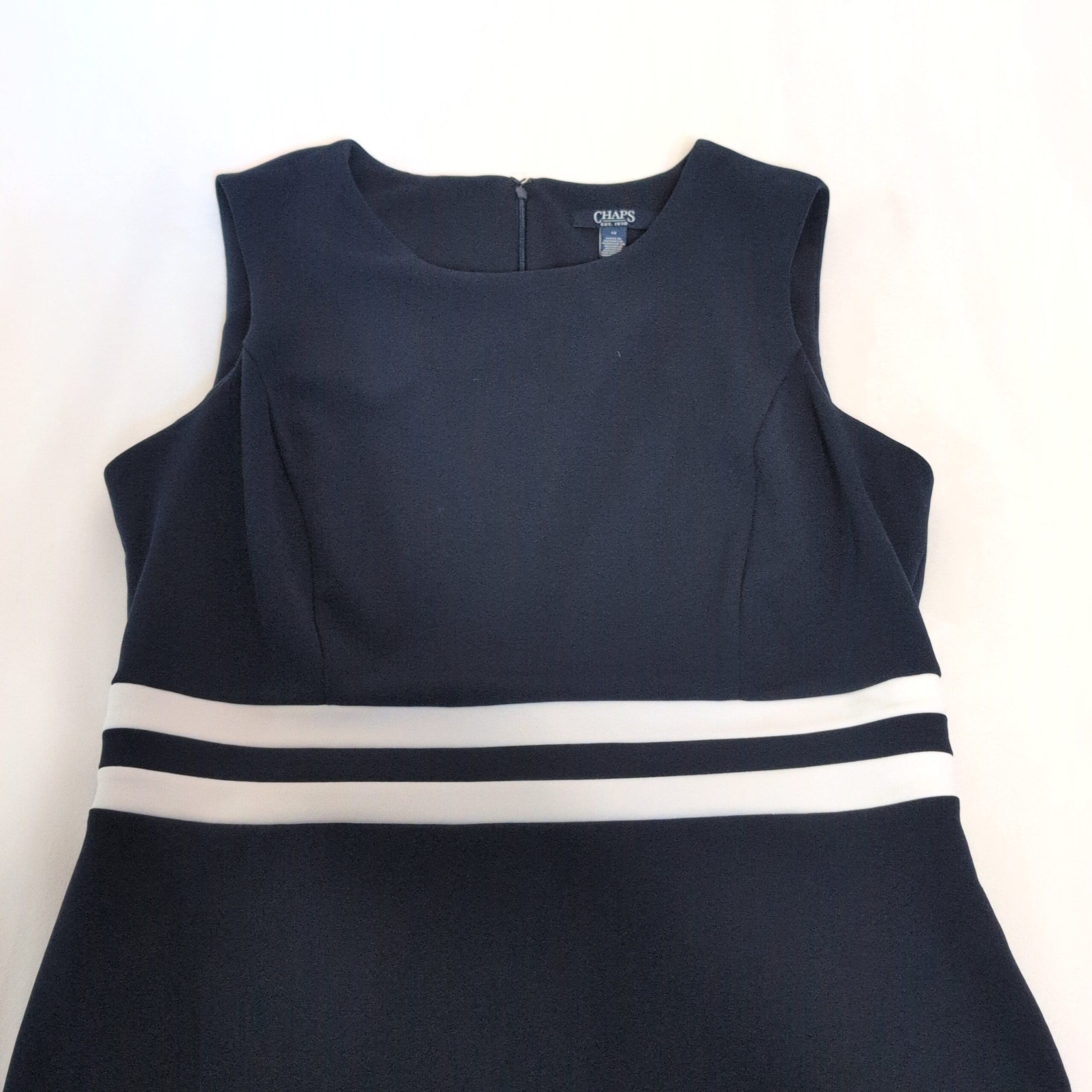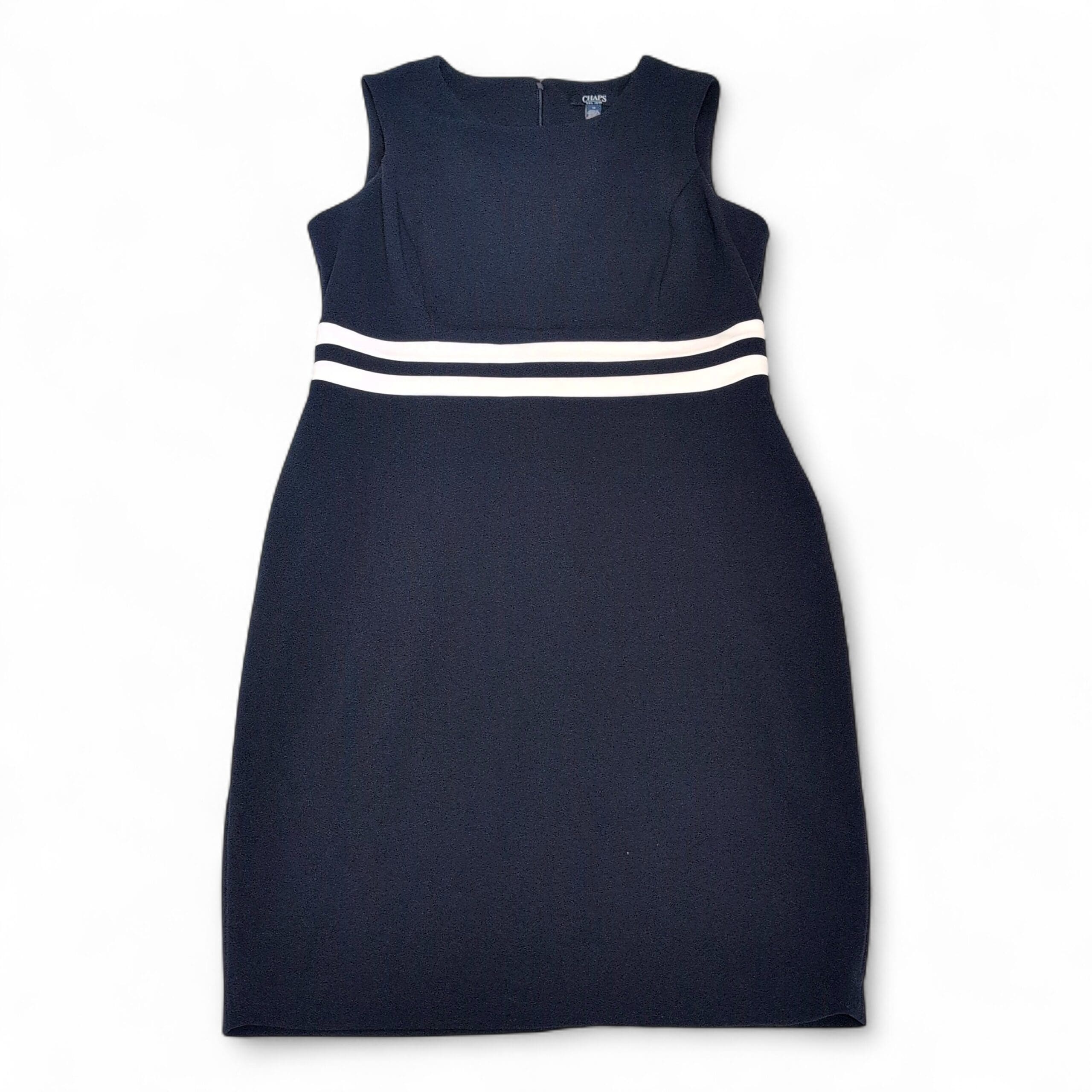 Classic Chaps sleeveless sheath dress in navy with contrasting white double waist stripes. Size 12 (standard). Features a crew neckline, fitted waist, back zipper closure, and a straight knee-length skirt for a polished, office-ready silhouette. Slightly textured knit fabric provides light structure and comfortable wear. Great for work, meetings, or dressed-up casual events.