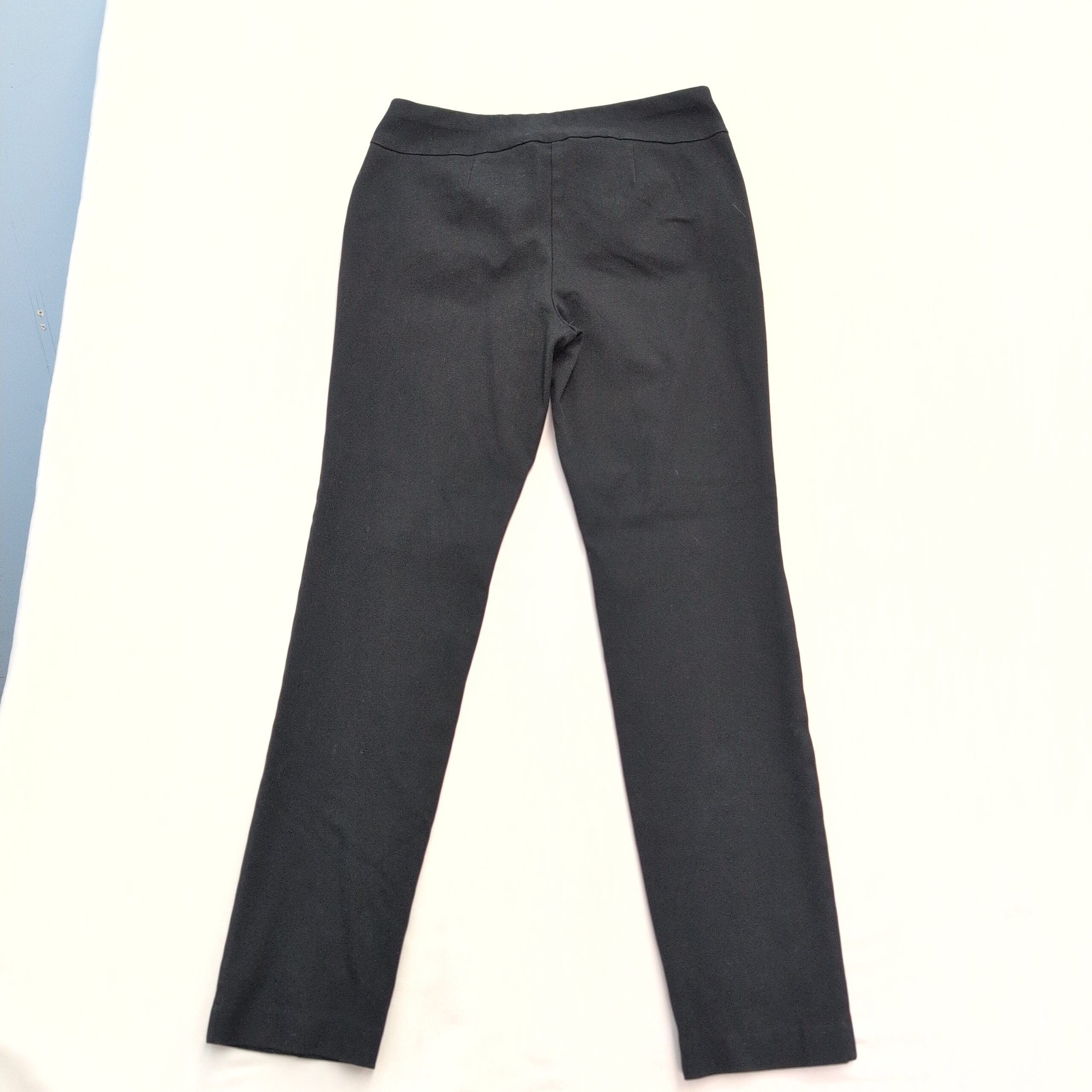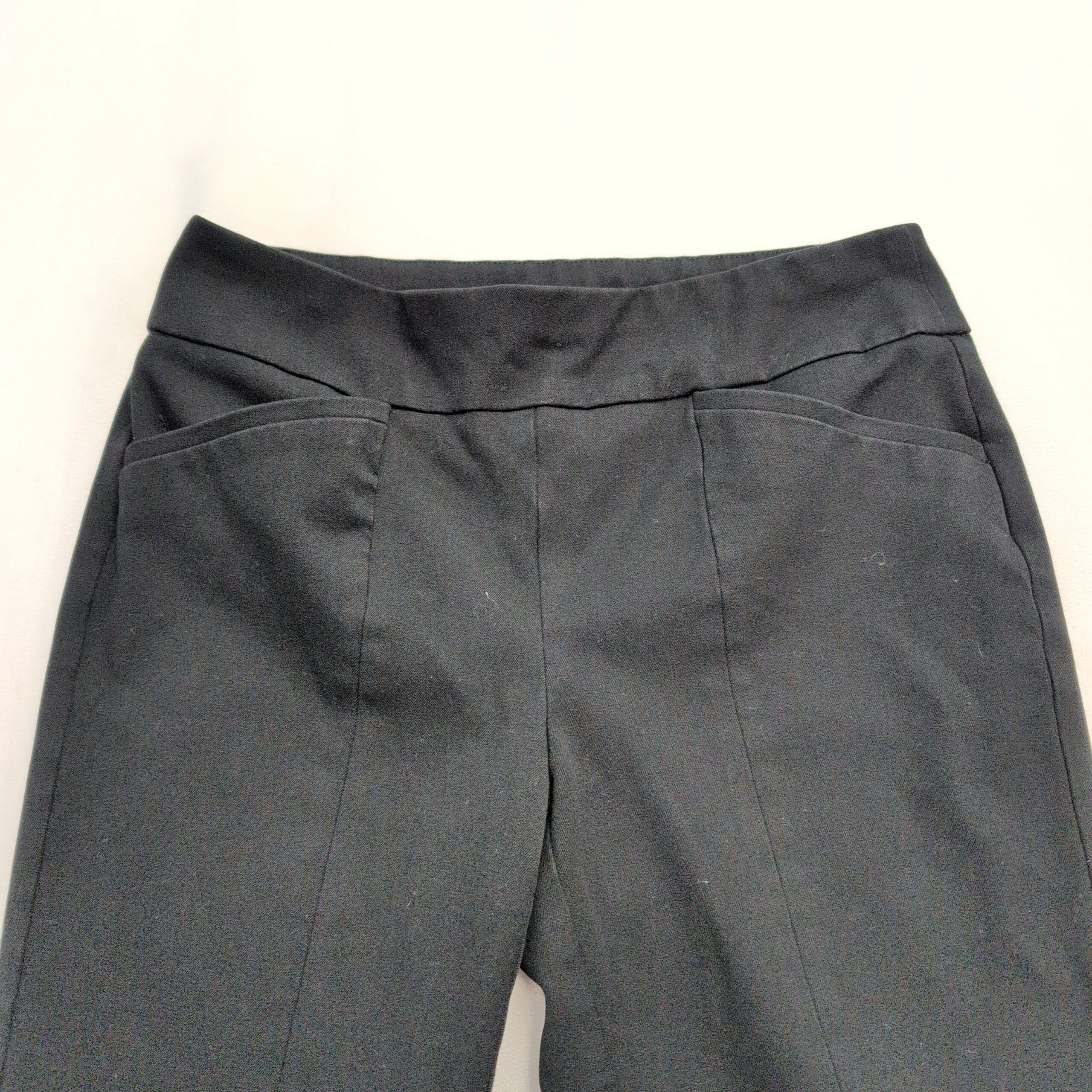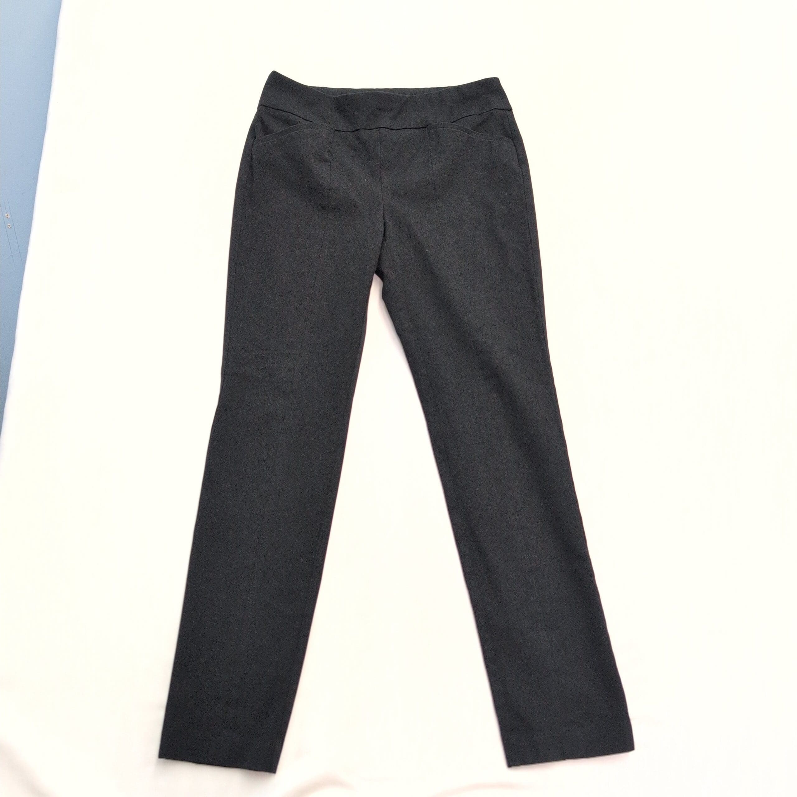 Classic black slim dress pants from Chico’s with a polished, tailored look. Features a comfortable pull-on waistband, clean front seam detailing and a slim full-length leg — great for work or dressier occasions. Labeled size S (Standard); note that Chico’s sizing runs small and this piece fits like a Chico’s 0 for a slimming silhouette.