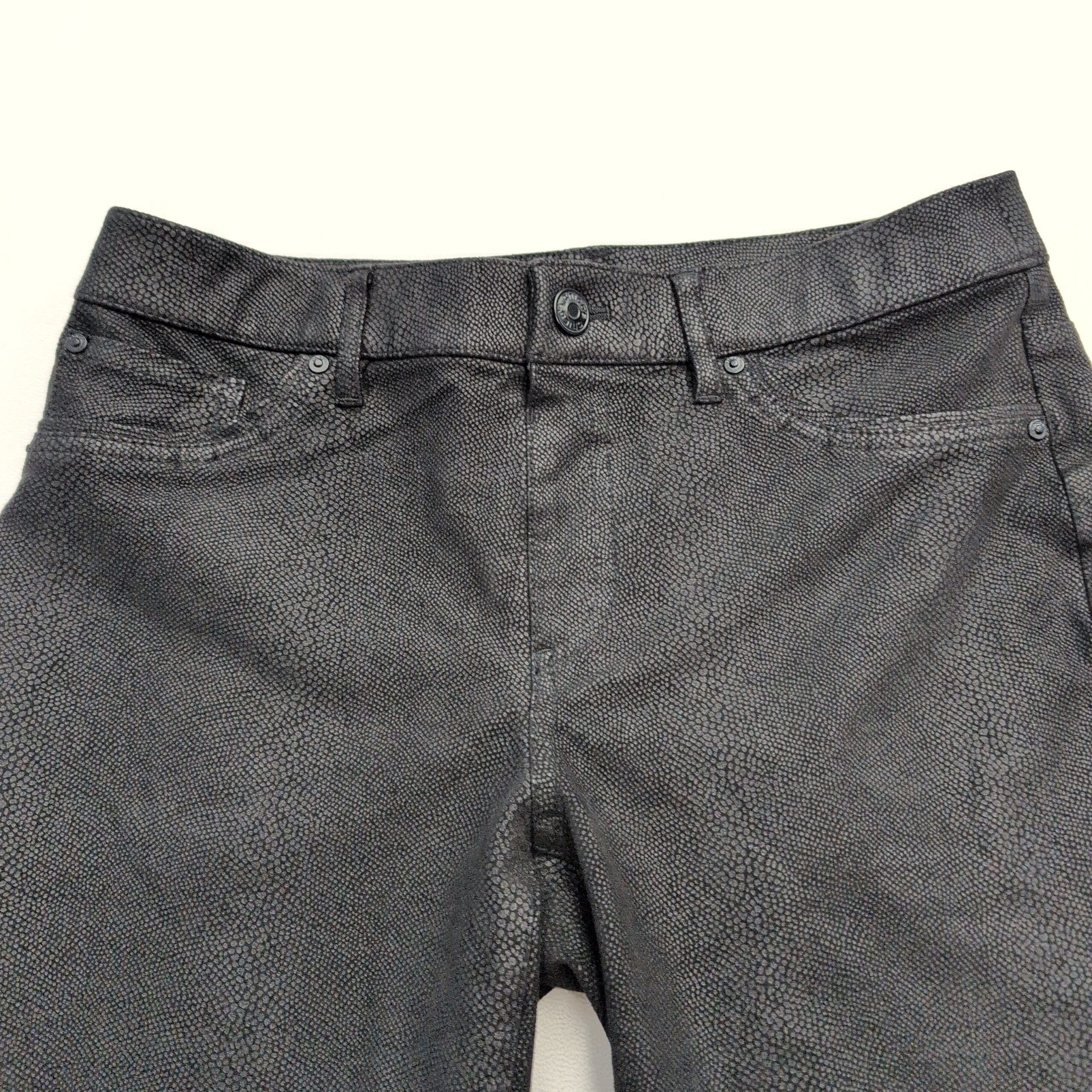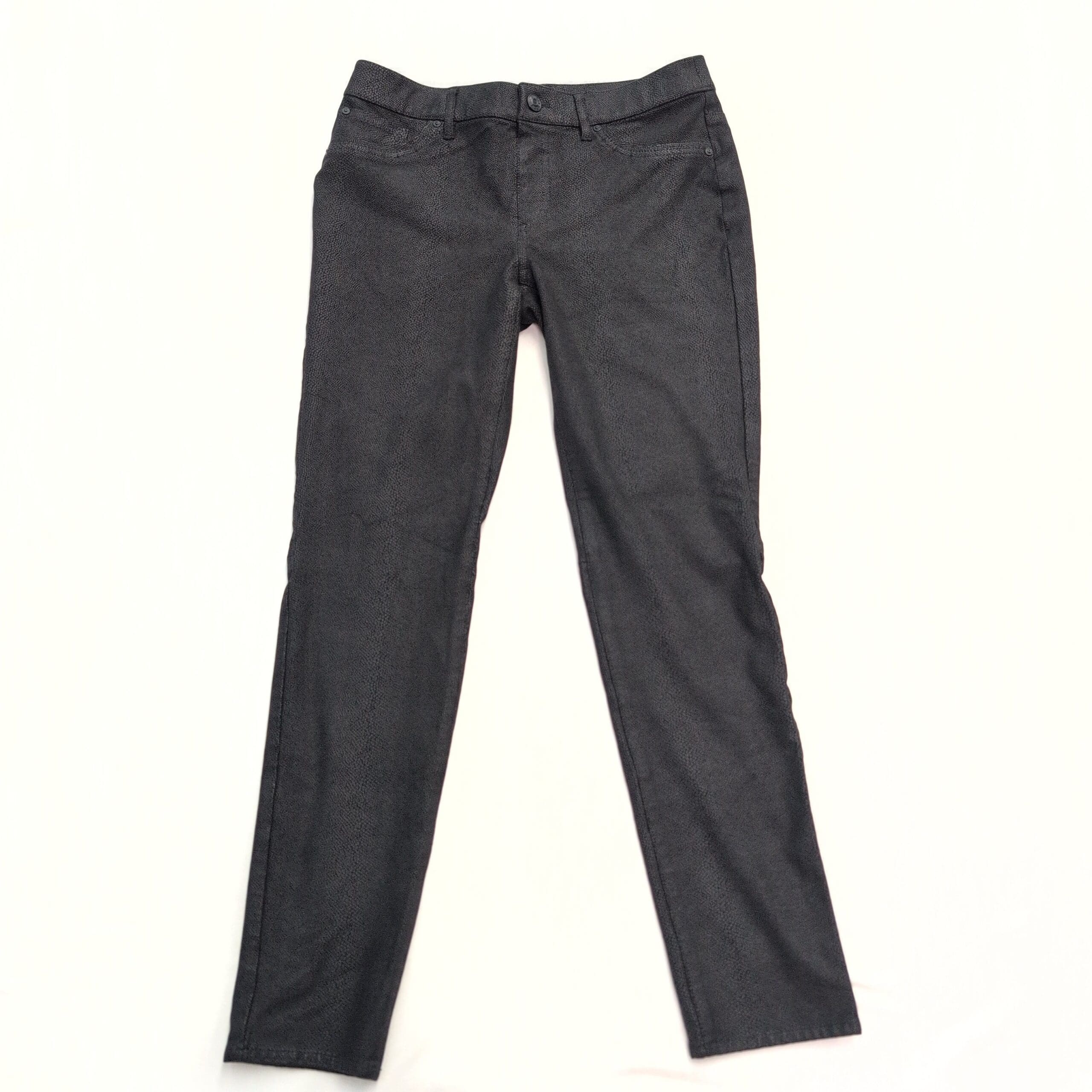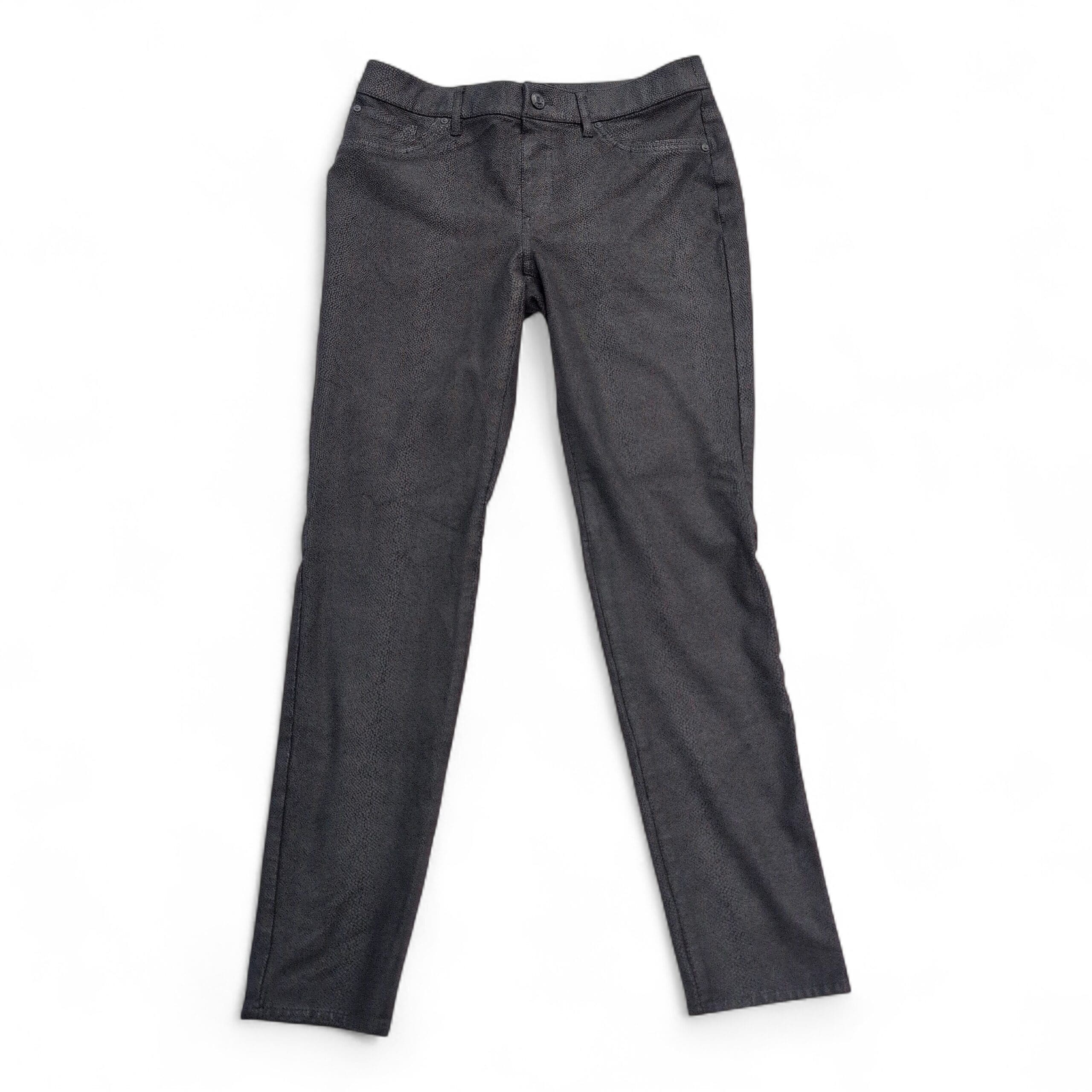 Chico’s women’s pants in size 00 (S). Sleek slim-straight silhouette in black with a subtle allover snake-skin texture for an elevated, versatile look. Visible front pockets, belt loops, and a button-and-zip closure; soft hand with slight stretch (fiber content not provided).