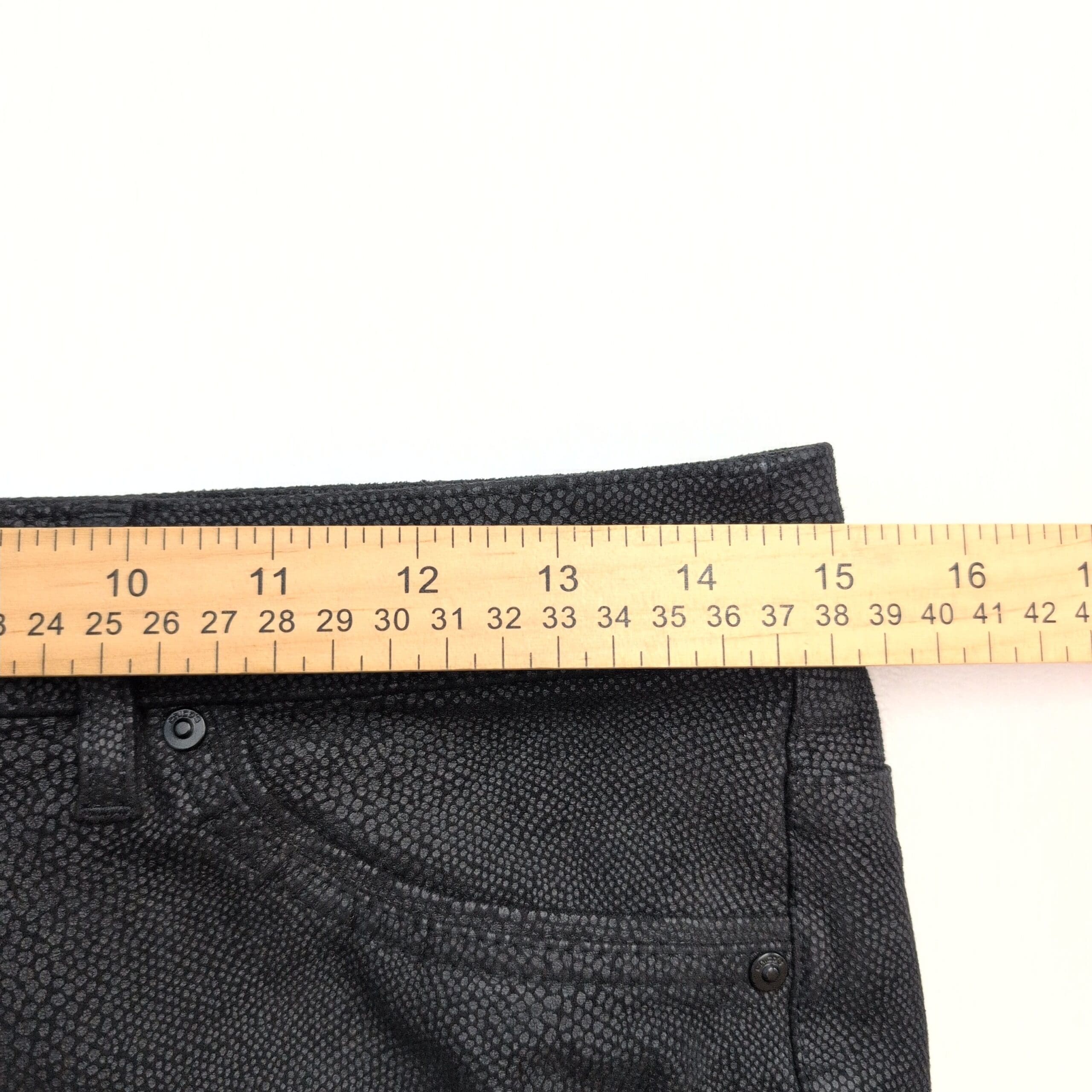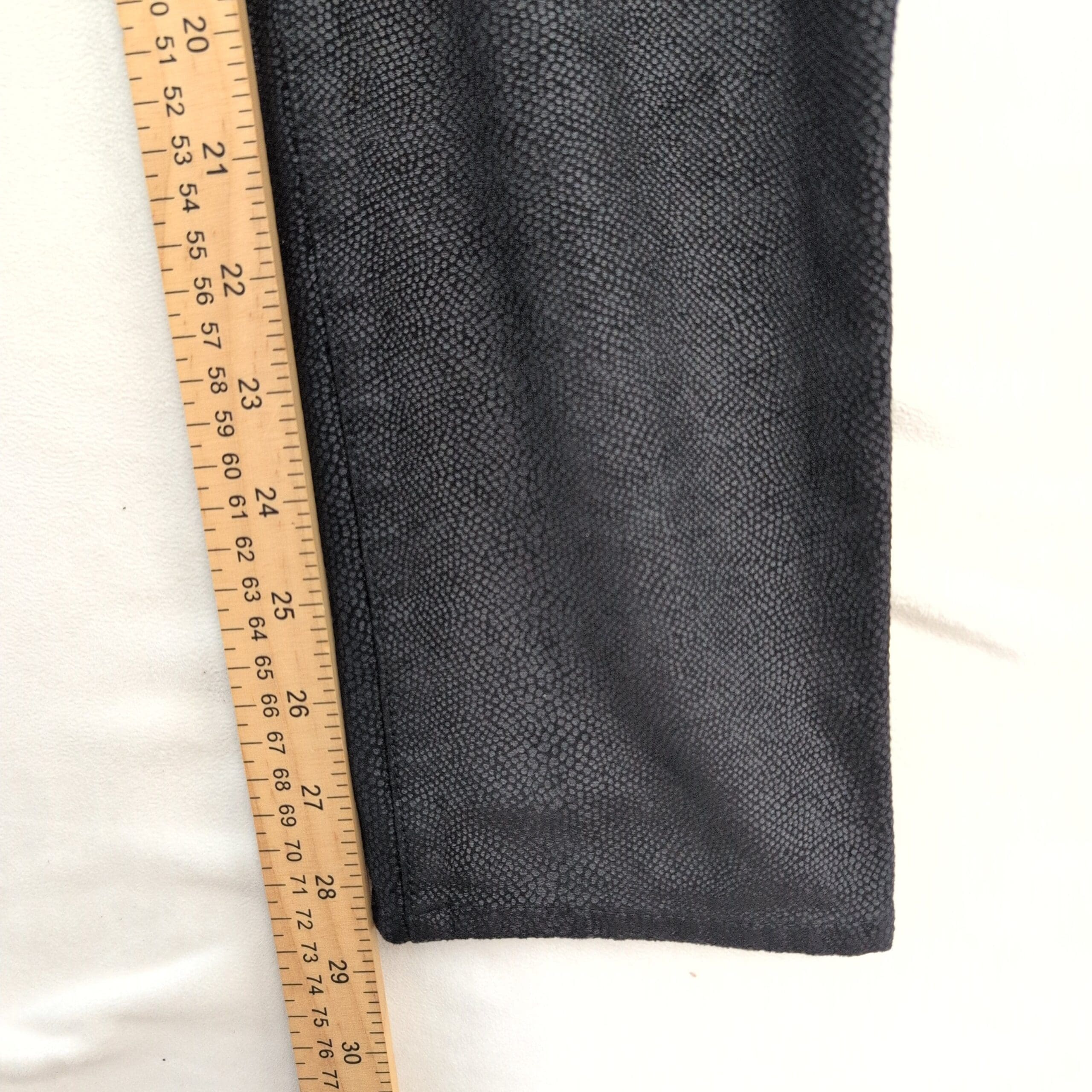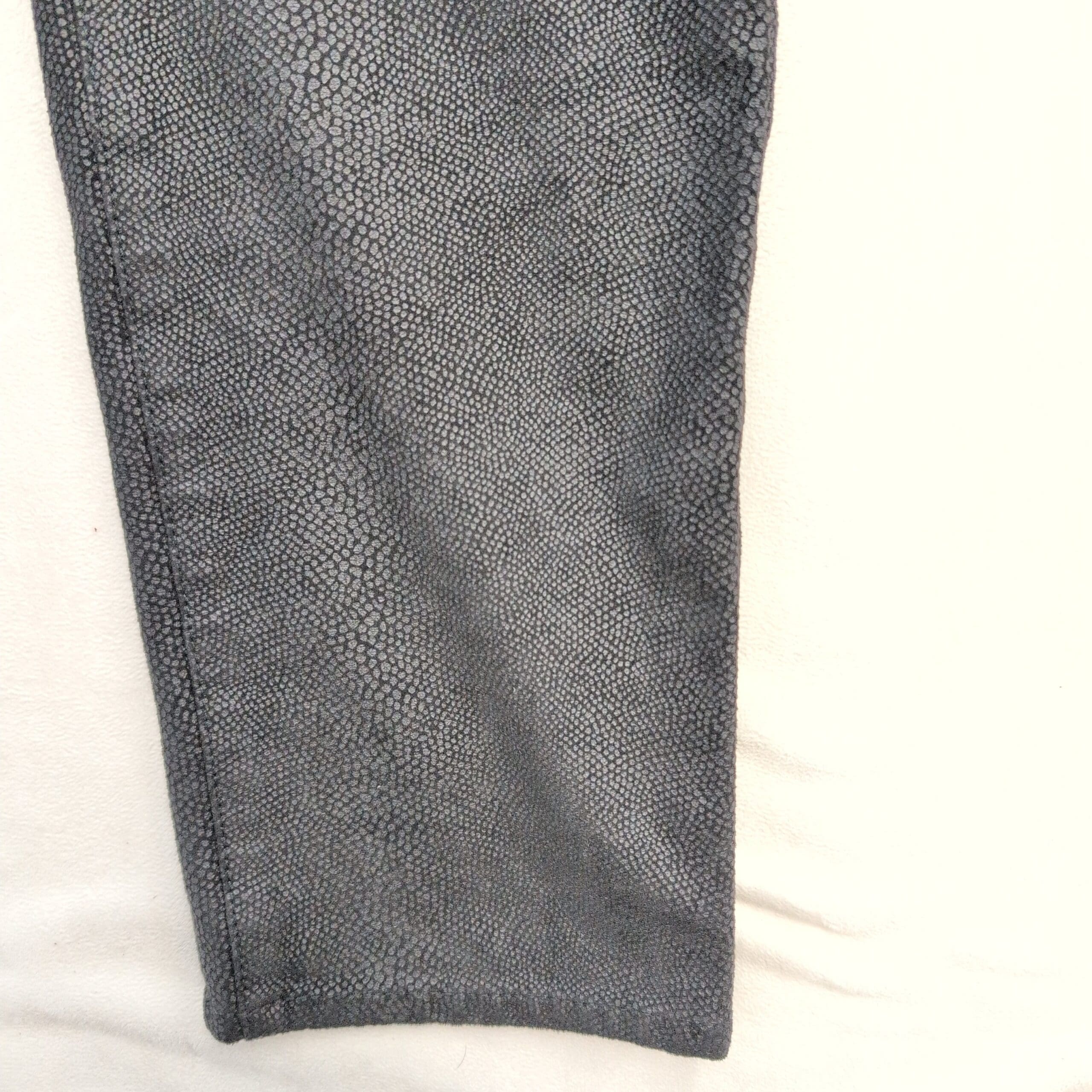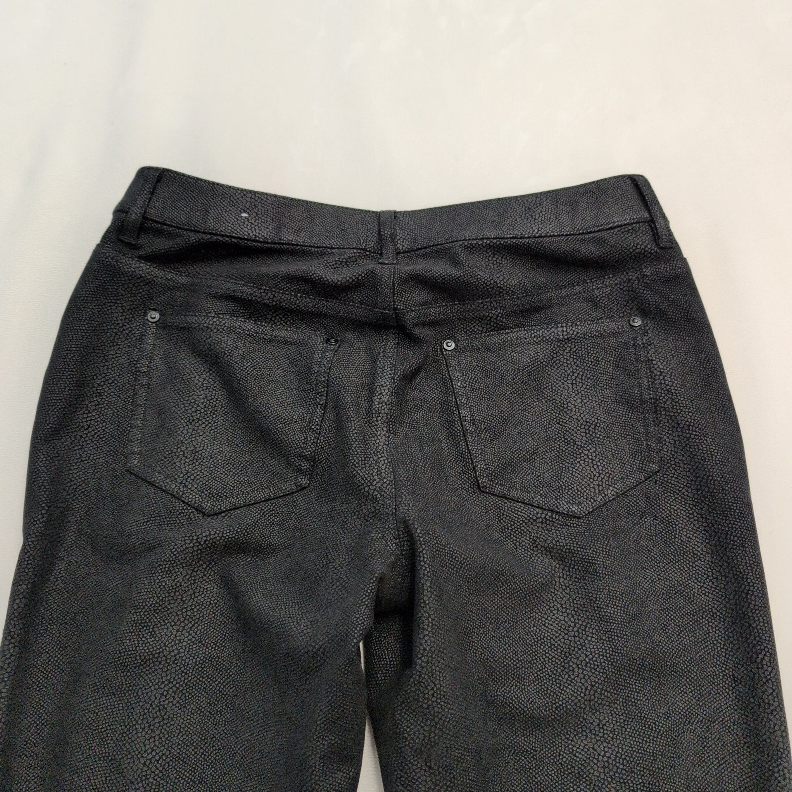 Chico’s women’s pants in size 00 (S). Sleek slim-straight silhouette in black with a subtle allover snake-skin texture for an elevated, versatile look. Visible front pockets, belt loops, and a button-and-zip closure; soft hand with slight stretch (fiber content not provided).