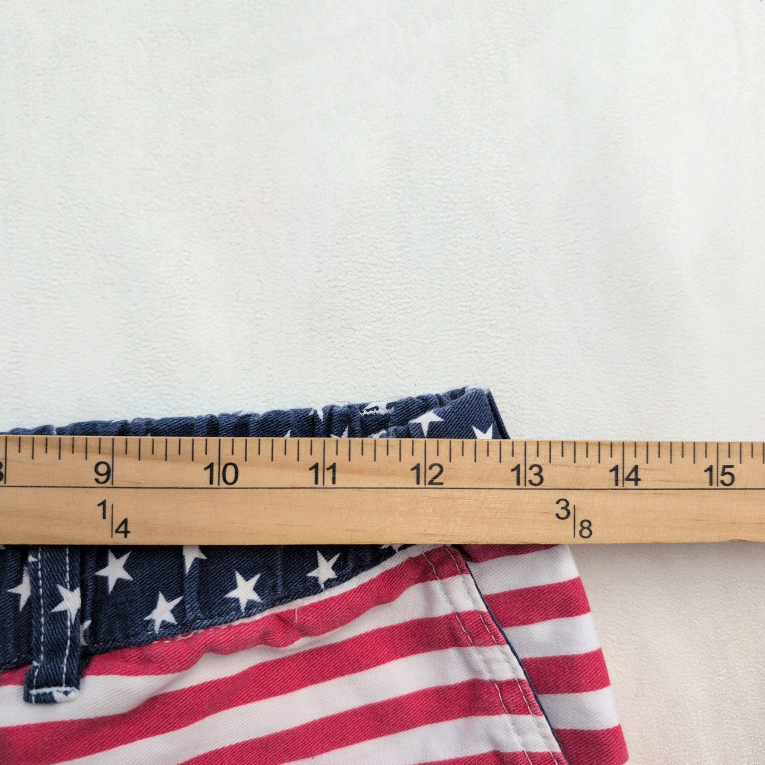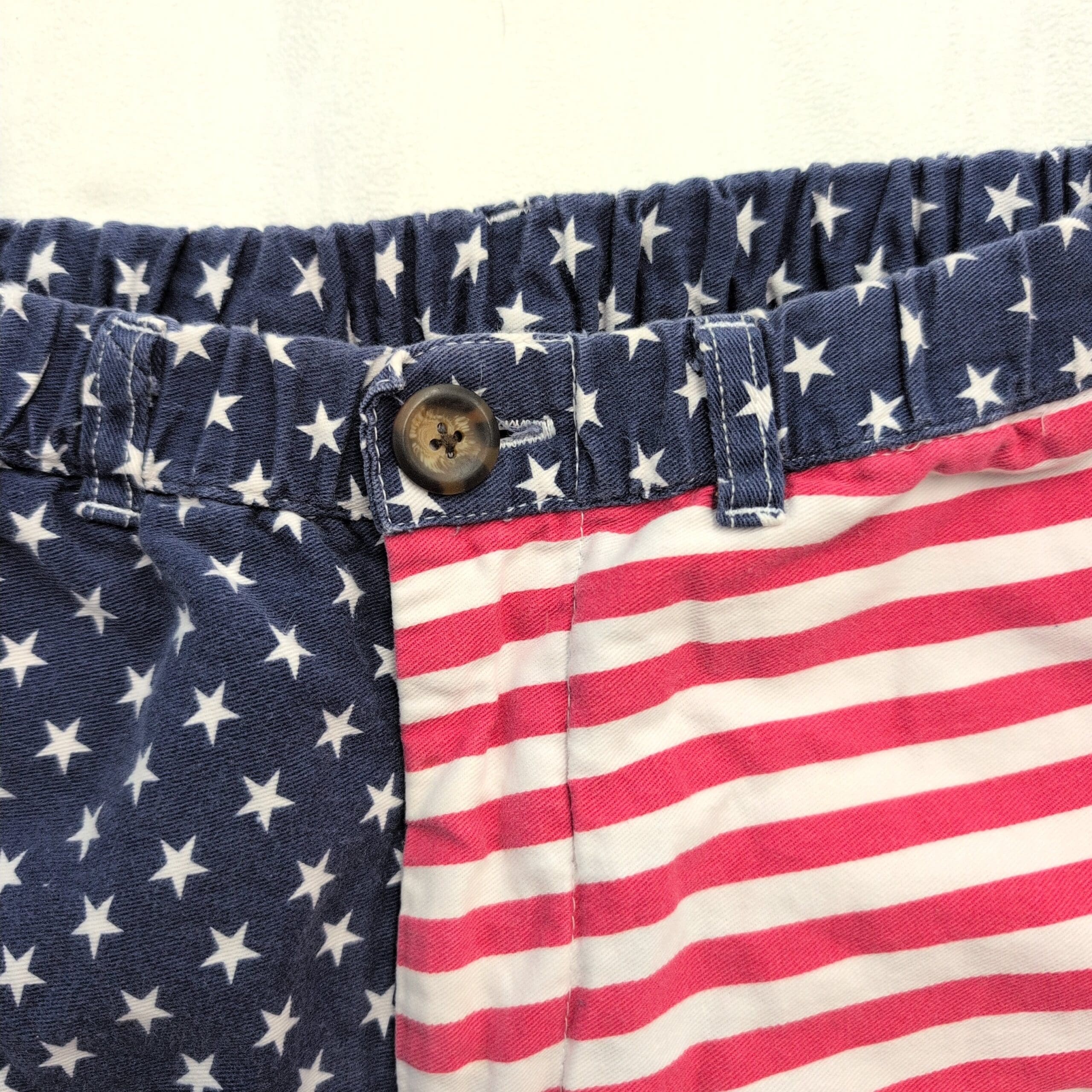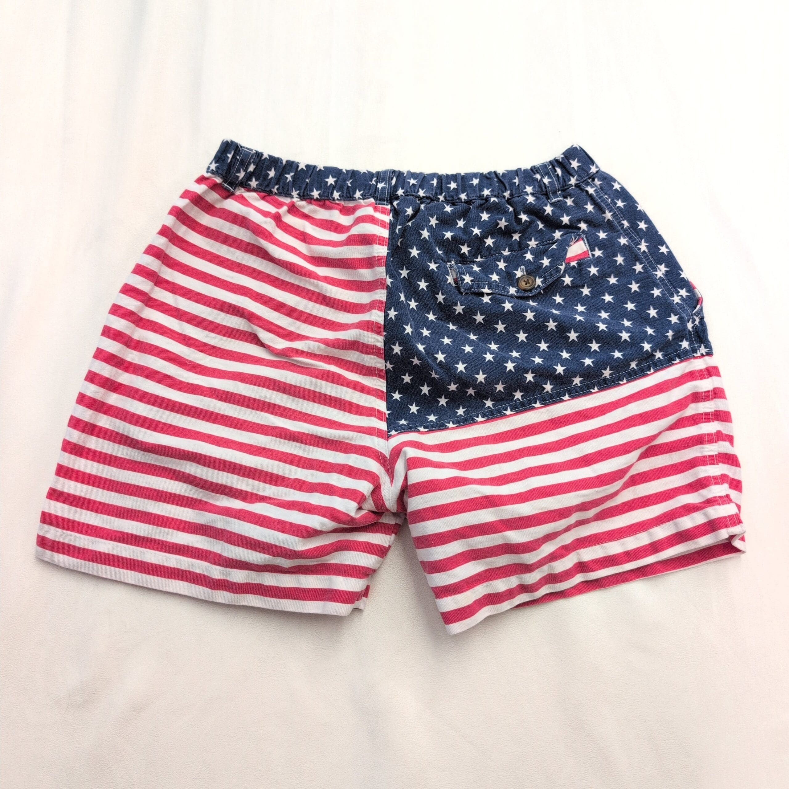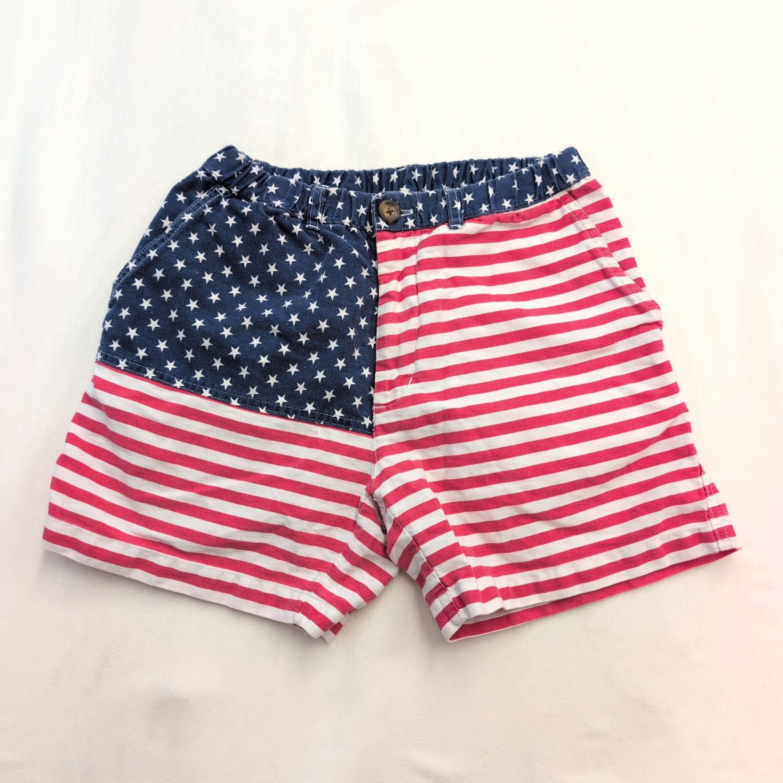 Excellent used condition Chubbies women’s shorts, size S. Patriotic American flag design with navy star panel and red-and-white stripes. Elasticized back waist with button-front and belt loops; two front pockets. Casual summer shorts perfect for 4th of July or everyday wear. Free of major rips, tears, stains, or flaws; typical light wear may be present. See photos for details.