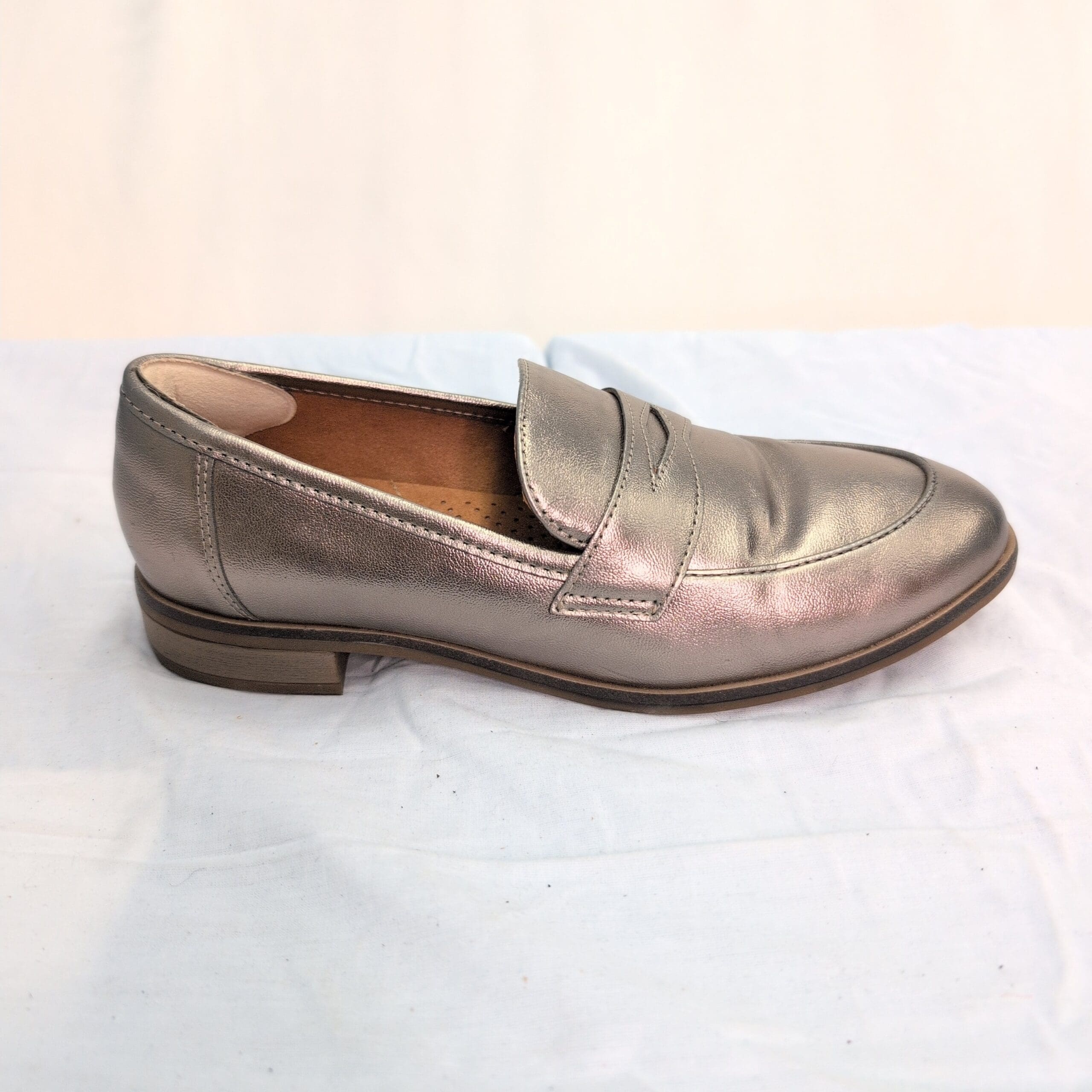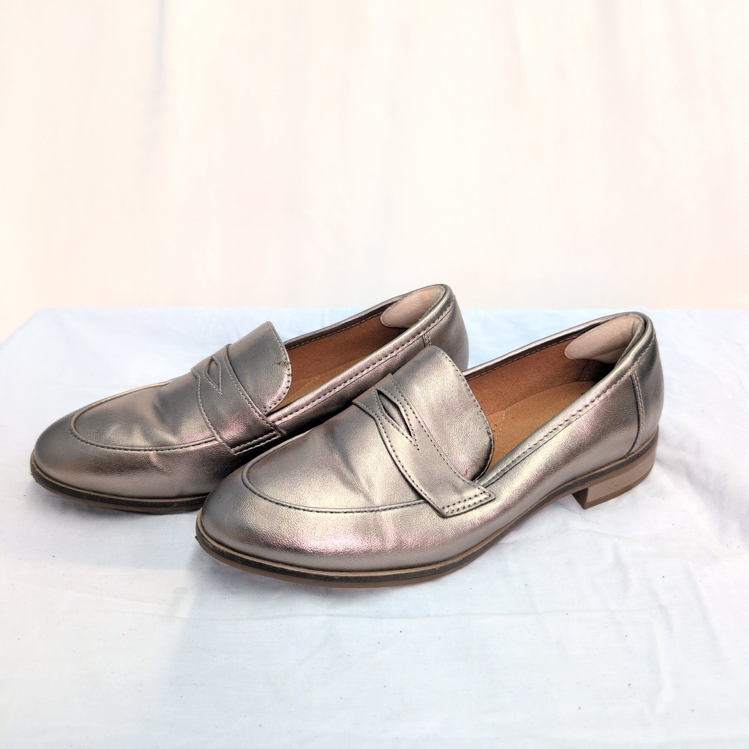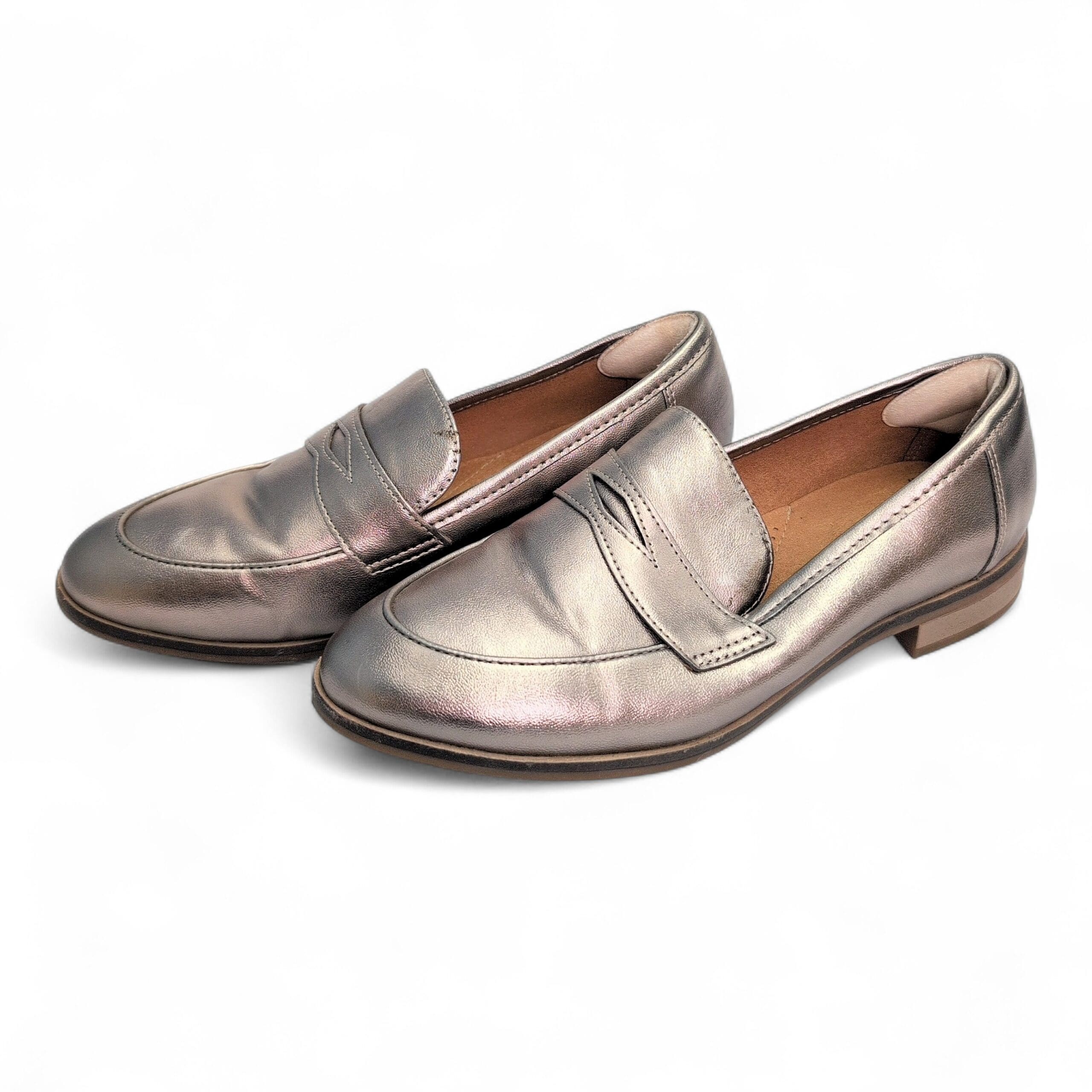 Clarks women’s slip-on loafers in a metallic green finish. Classic penny-loafer silhouette with a low stacked heel and cushioned footbed for comfortable, everyday wear. Size 7 (standard). Gently used — free of major rips, tears, or stains; some marks and scuffs pictured, primarily on the toe and heel areas. Versatile pair that dresses up or down for work, errands, or weekend outfits.