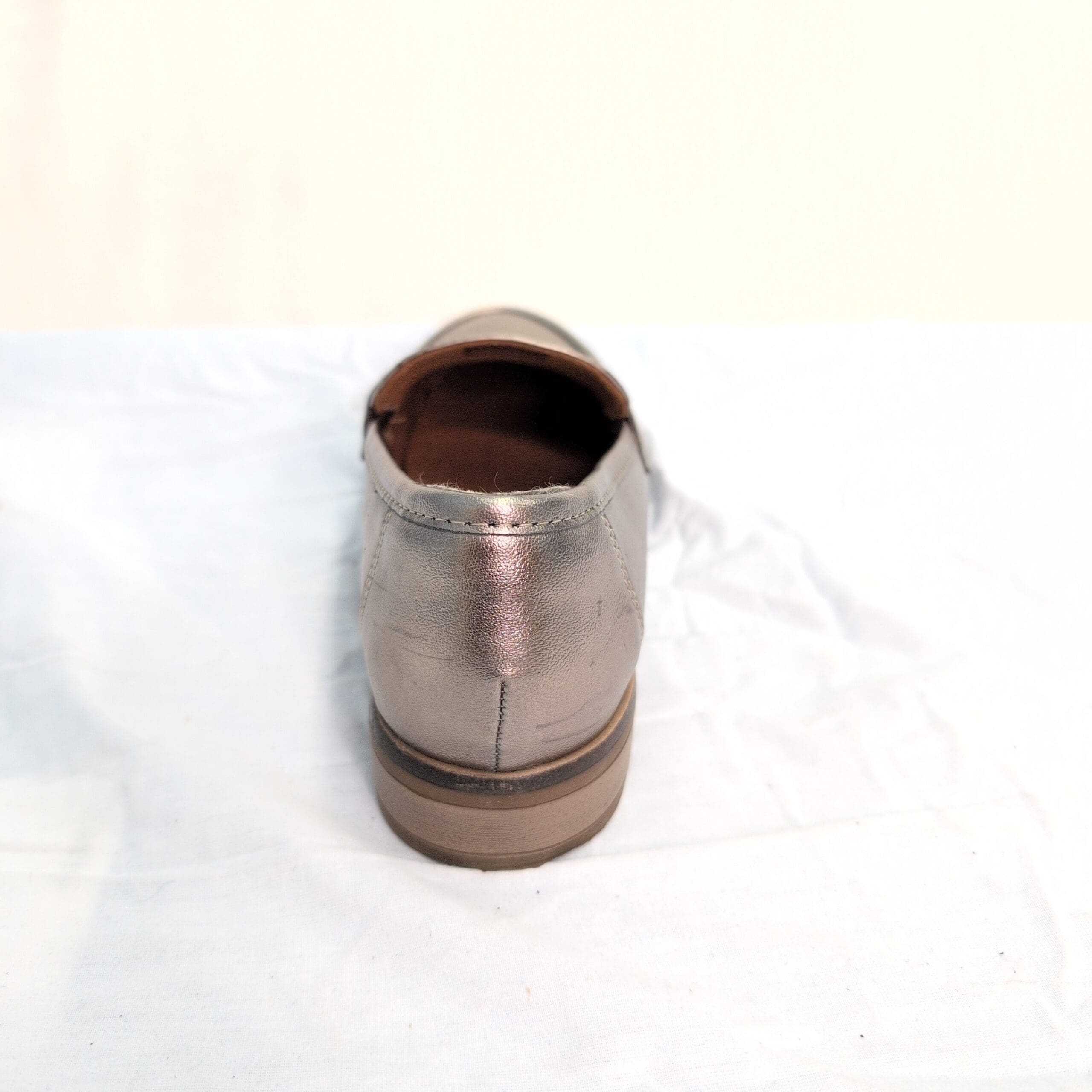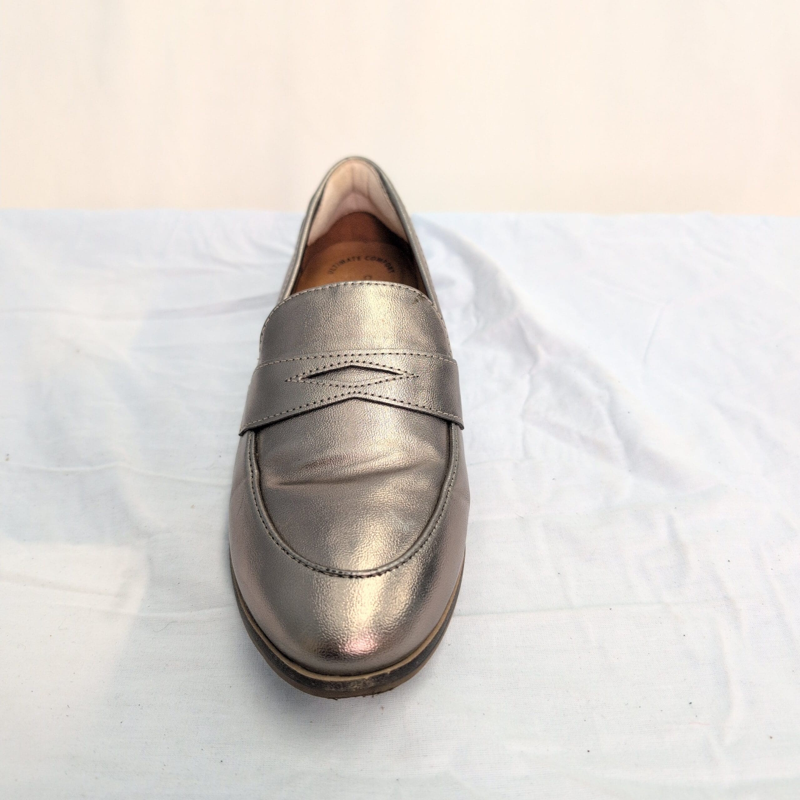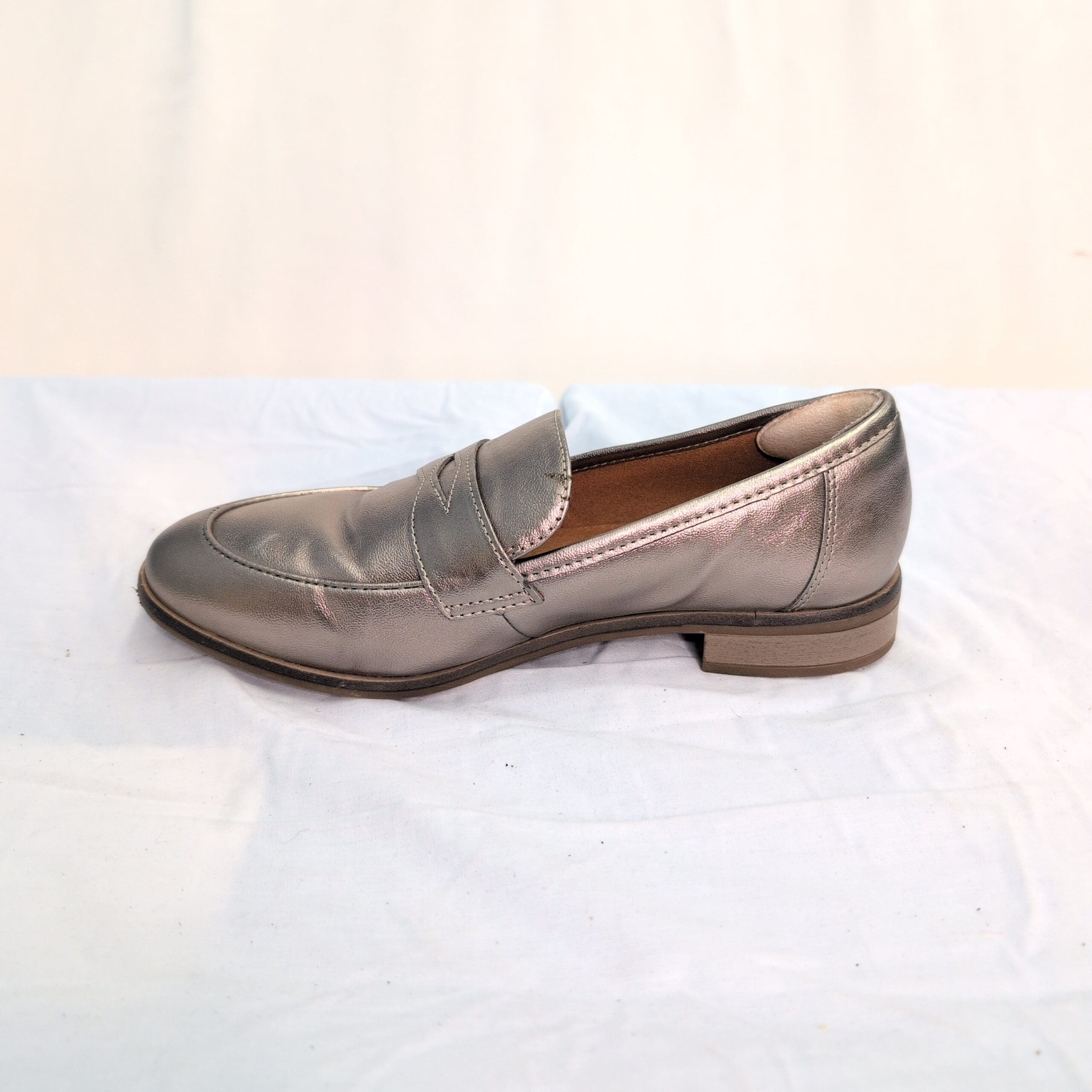 Clarks women’s slip-on loafers in a metallic green finish. Classic penny-loafer silhouette with a low stacked heel and cushioned footbed for comfortable, everyday wear. Size 7 (standard). Gently used — free of major rips, tears, or stains; some marks and scuffs pictured, primarily on the toe and heel areas. Versatile pair that dresses up or down for work, errands, or weekend outfits.