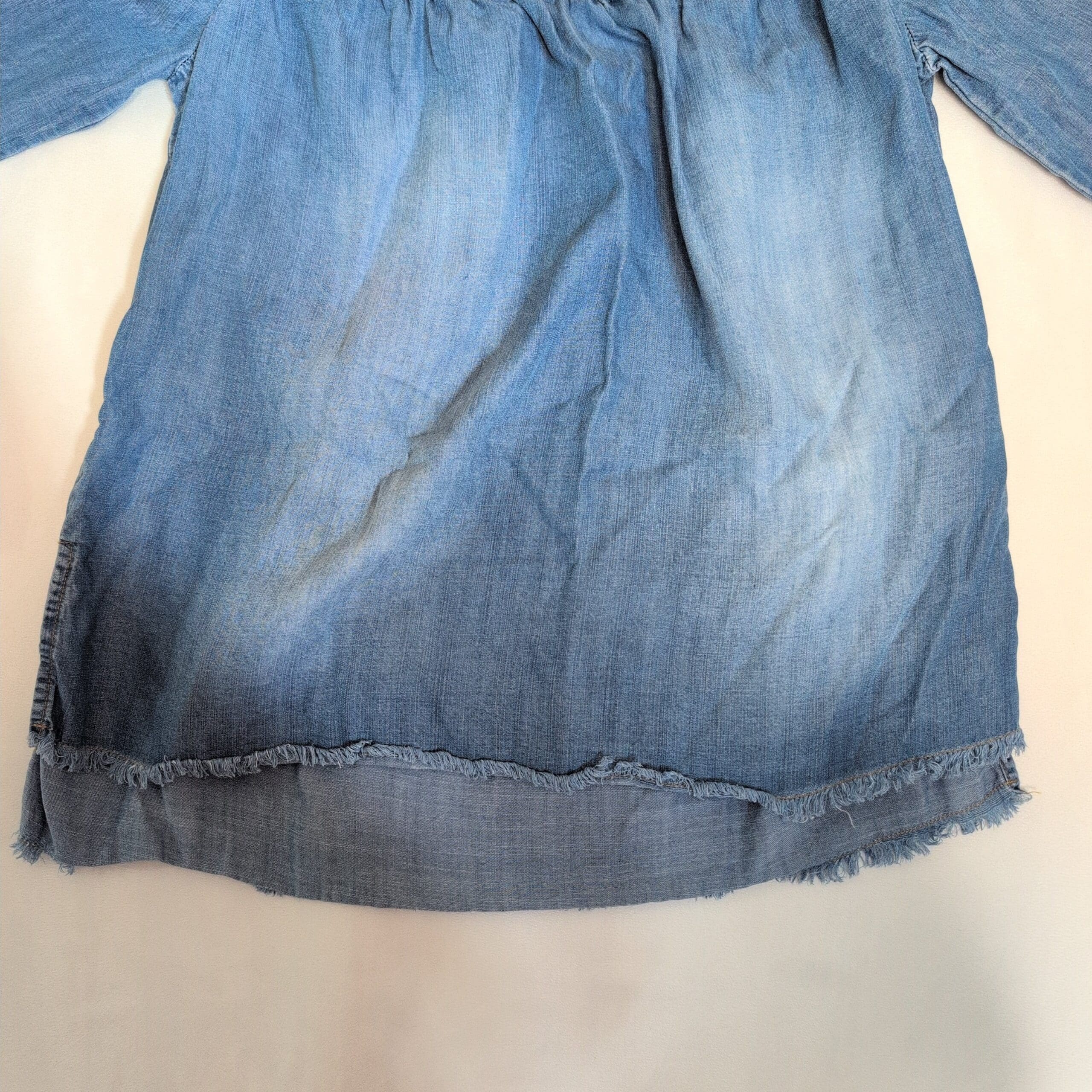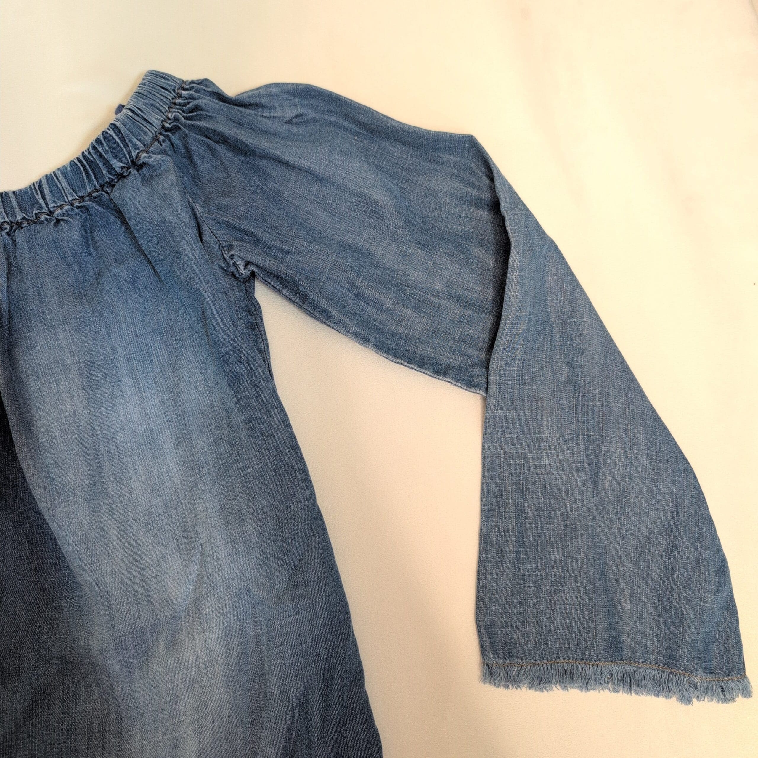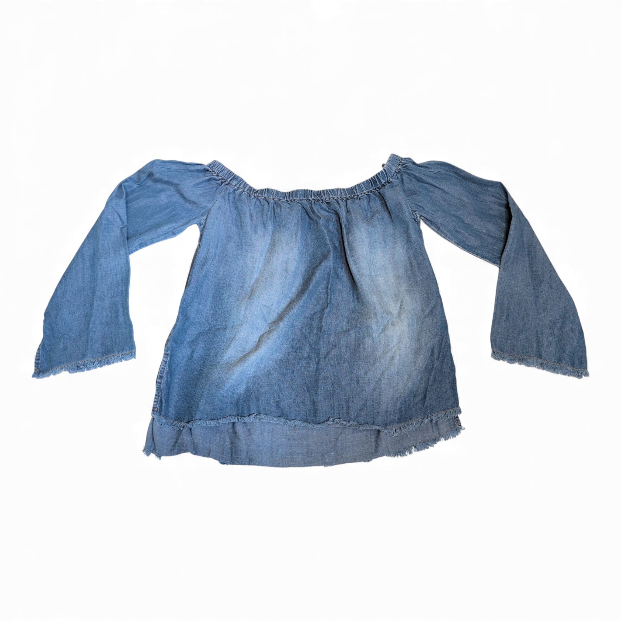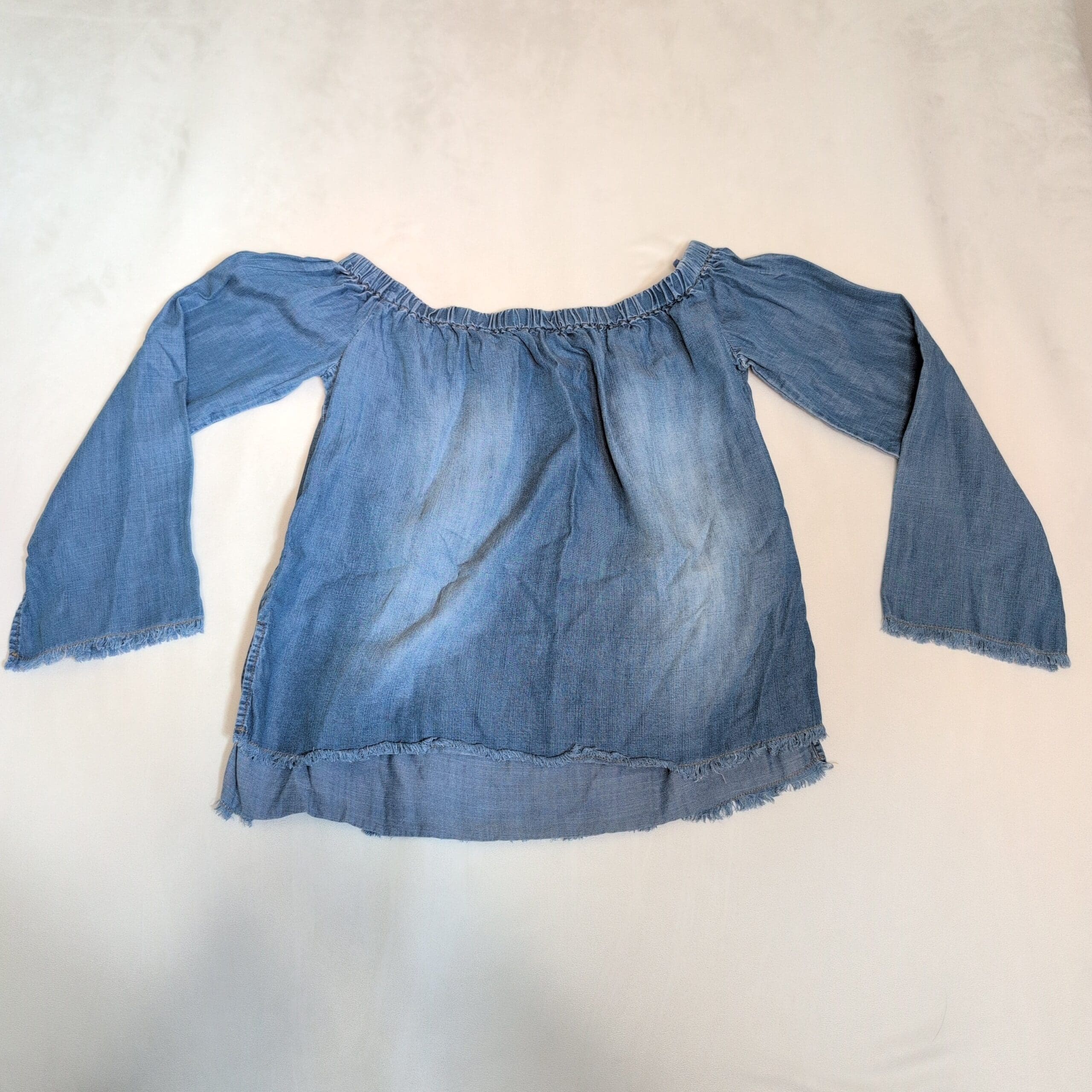Lightweight blue chambray-style off-the-shoulder blouse from Cloth & Stone. Features an elasticized neckline, long bell sleeves, and a raw-frayed hem for a relaxed, boho look. Great for casual outfits, layering, or weekend plans. Size S (see photos for details).