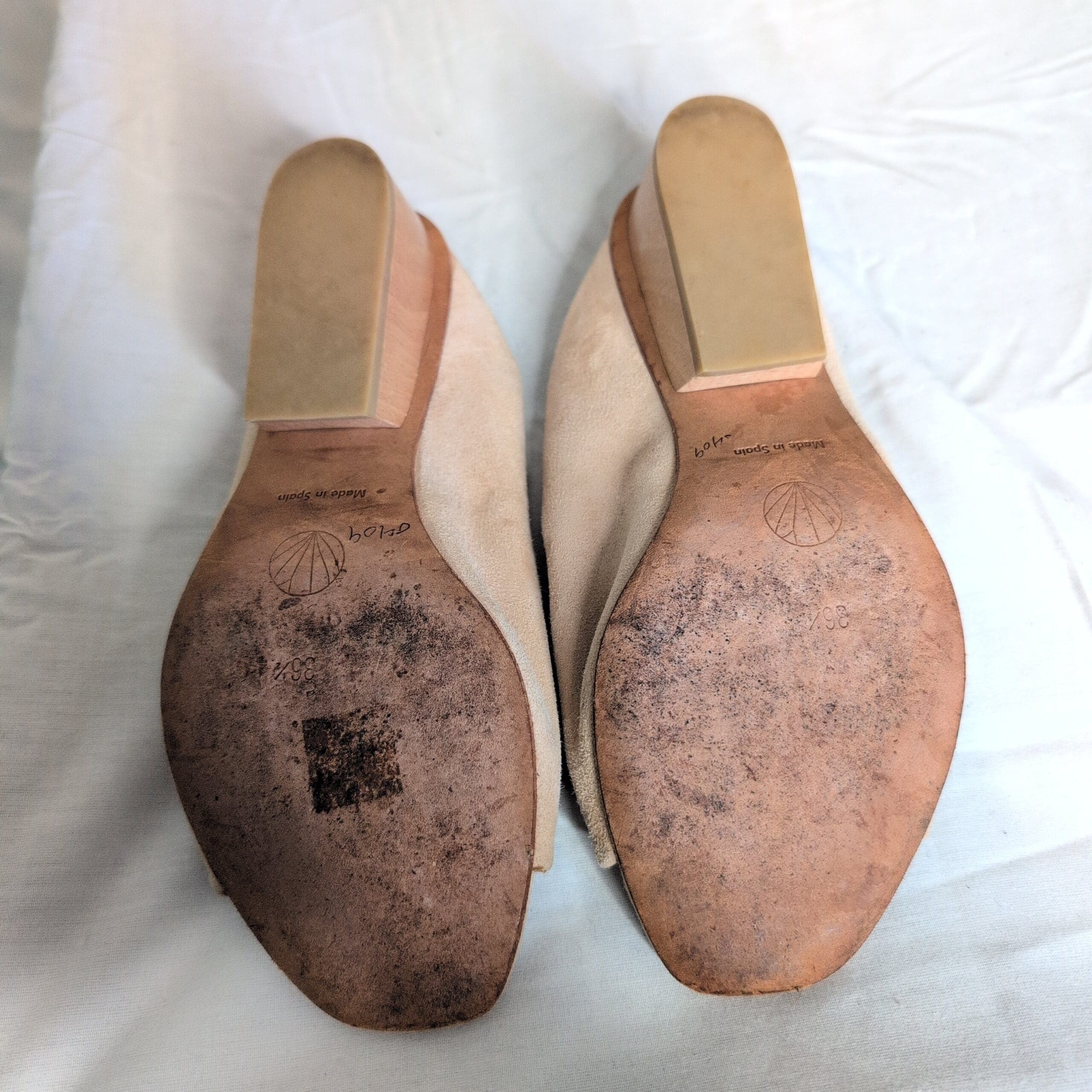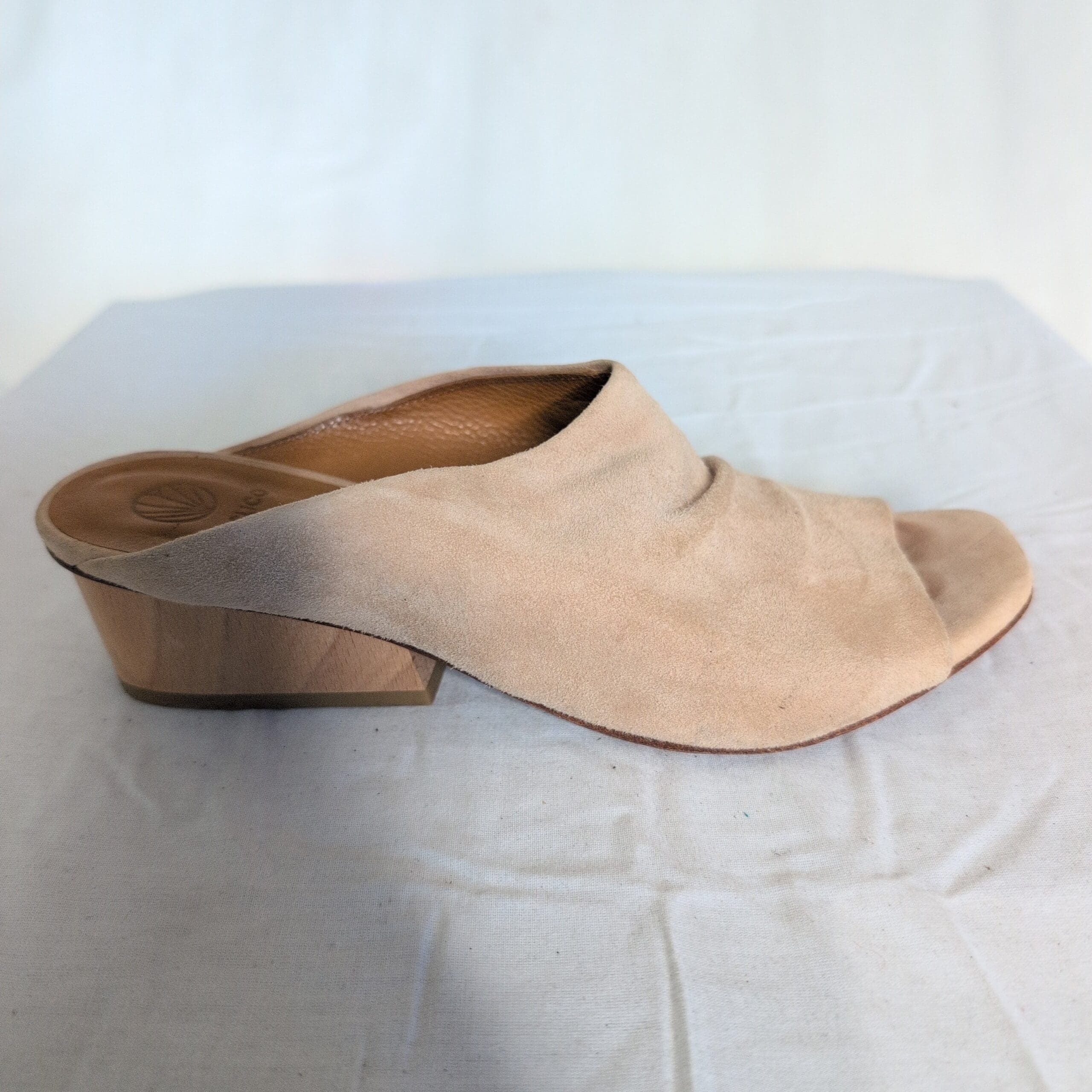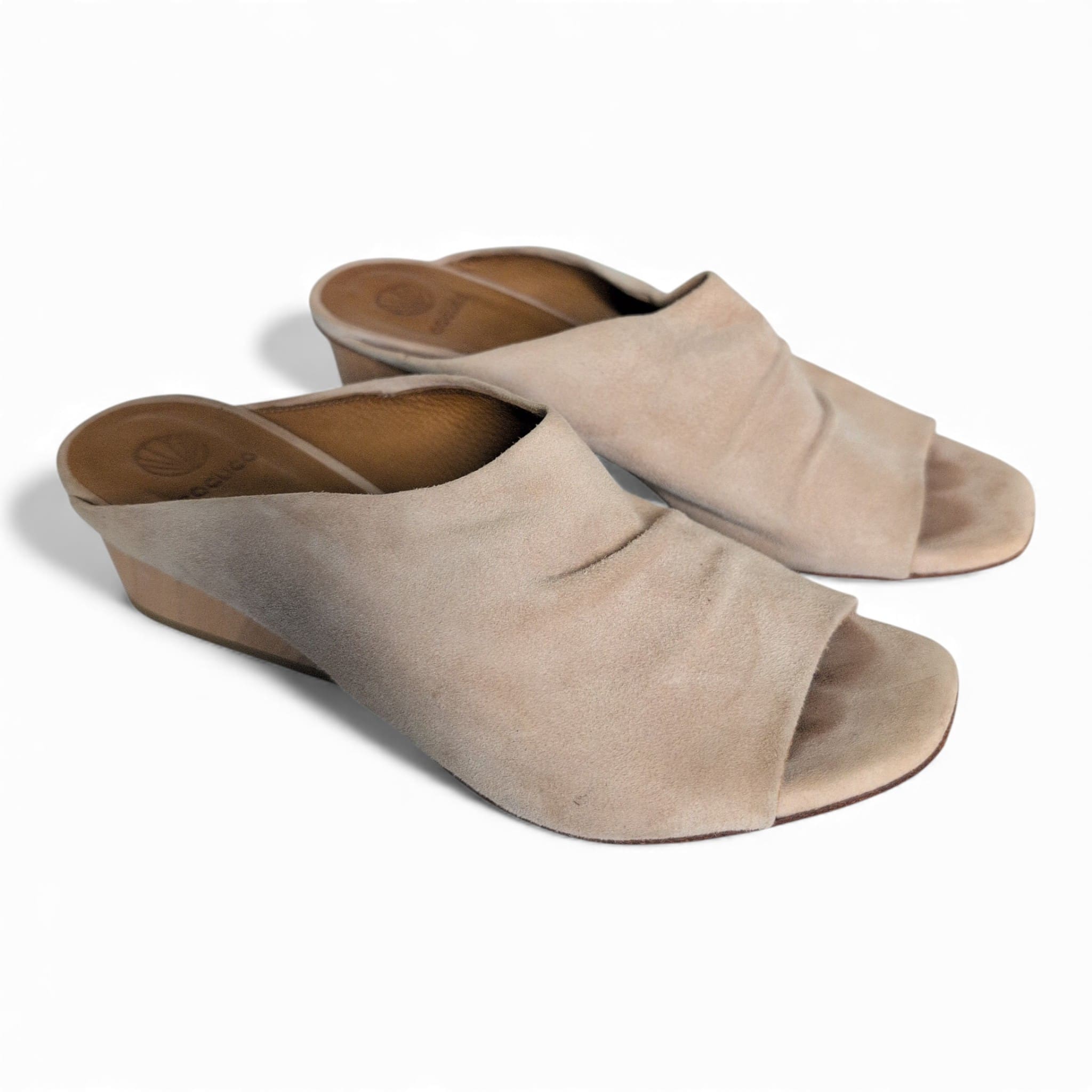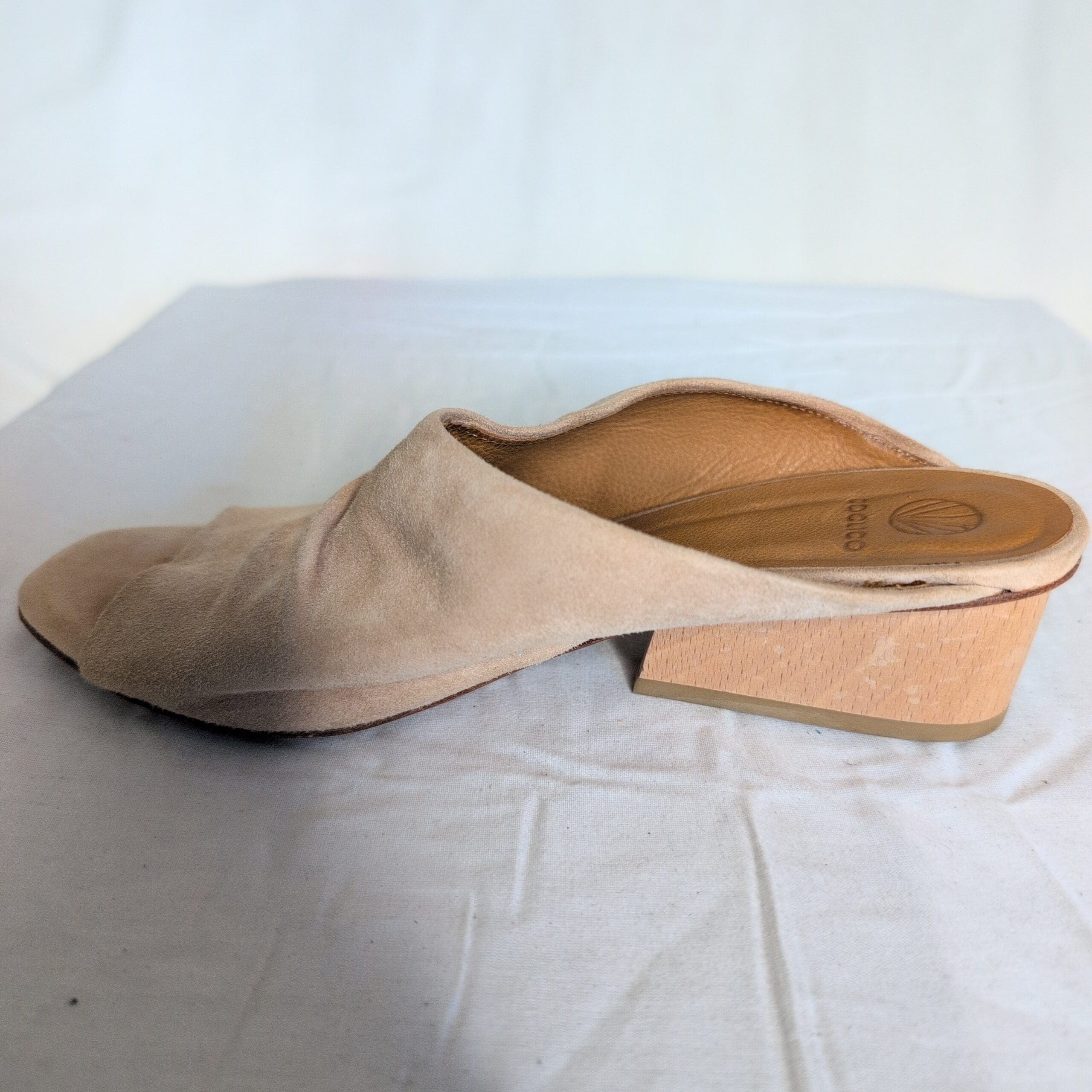 Coclico tan suede open-toe wedge mules in US size 6 (EU 36.5). Soft suede upper with a slip-on silhouette and a lightly cushioned leather footbed for comfortable everyday wear. Good used condition with minor wear — light scuffing and gentle creasing on the suede and light wear to the footbed; please review photos for details. Made in Spain.
