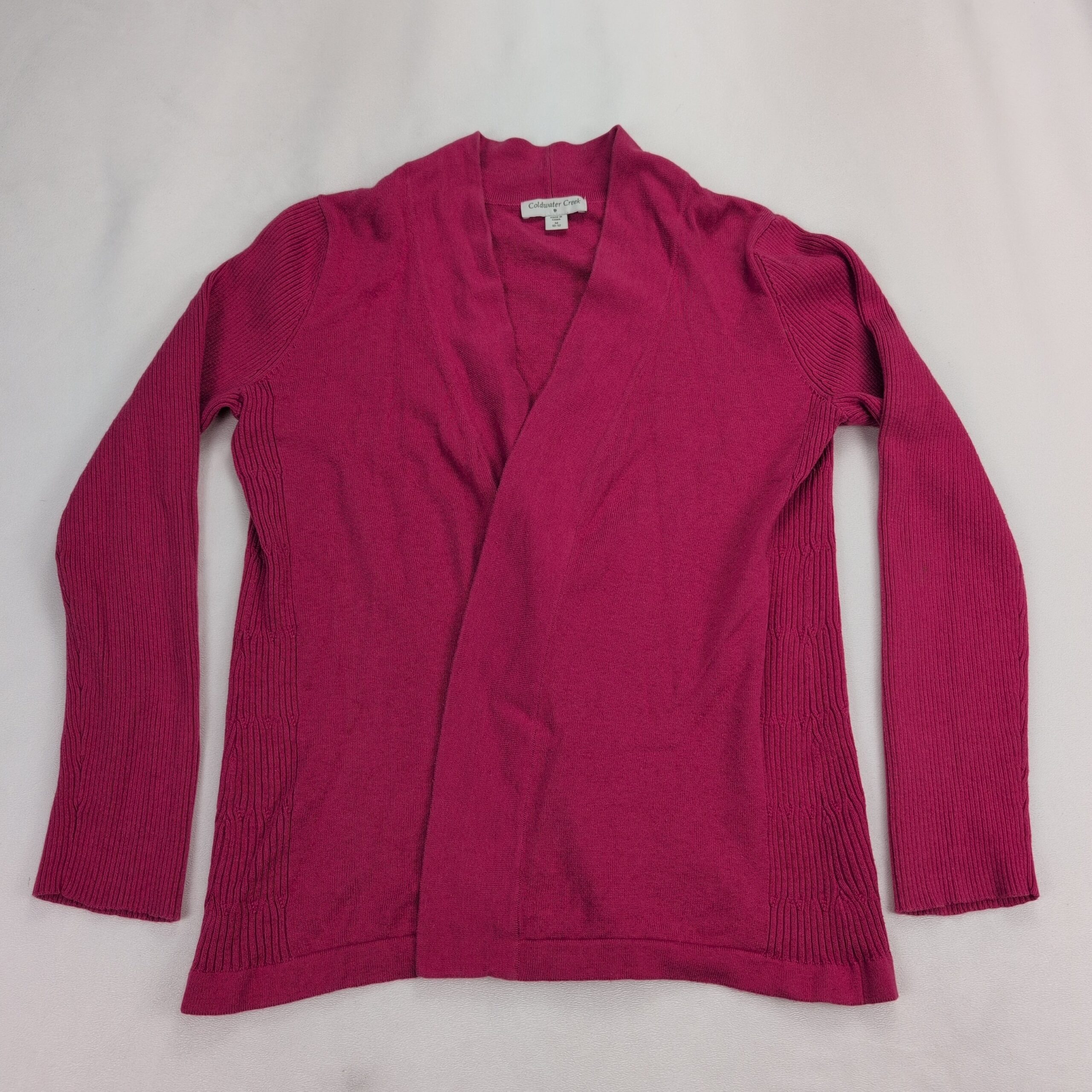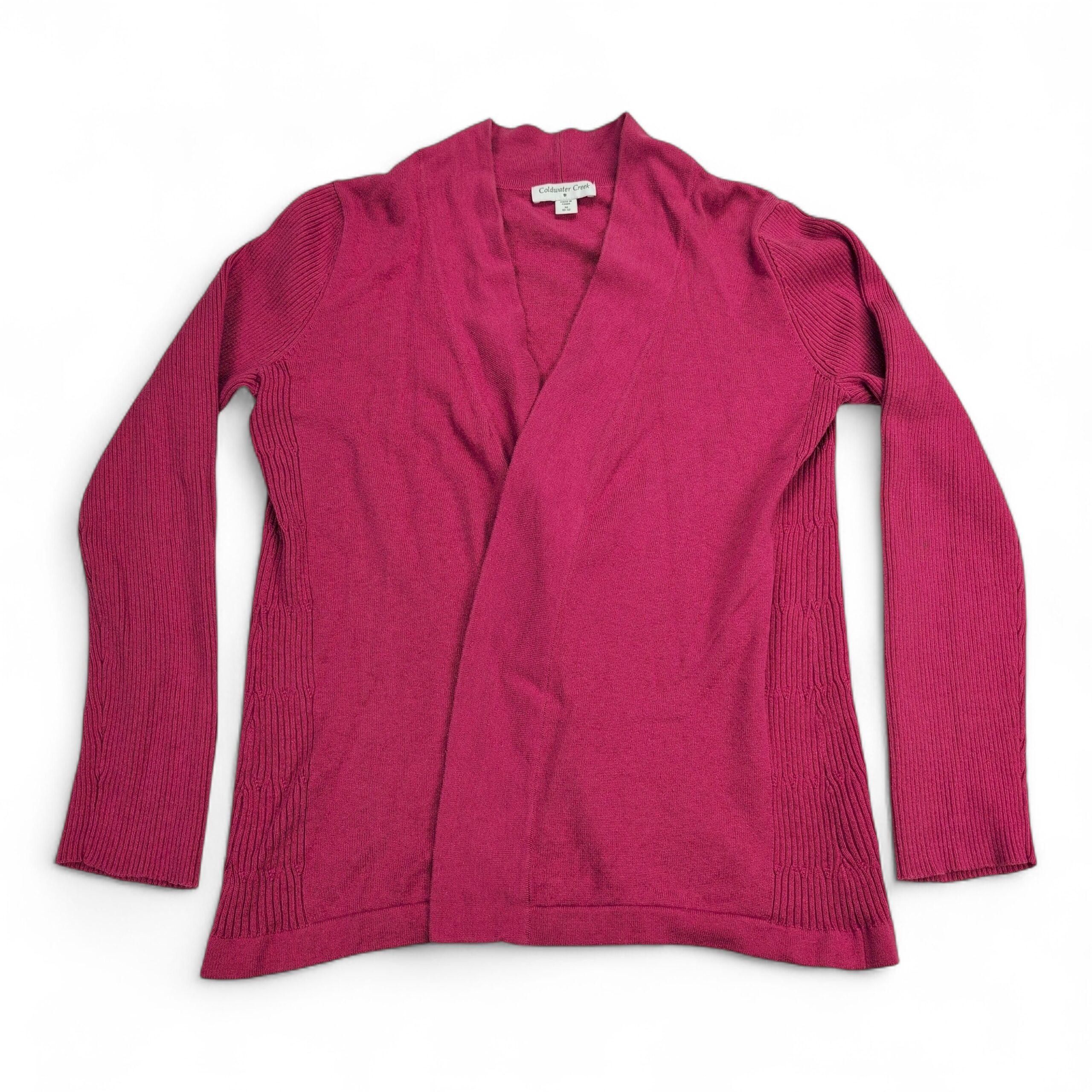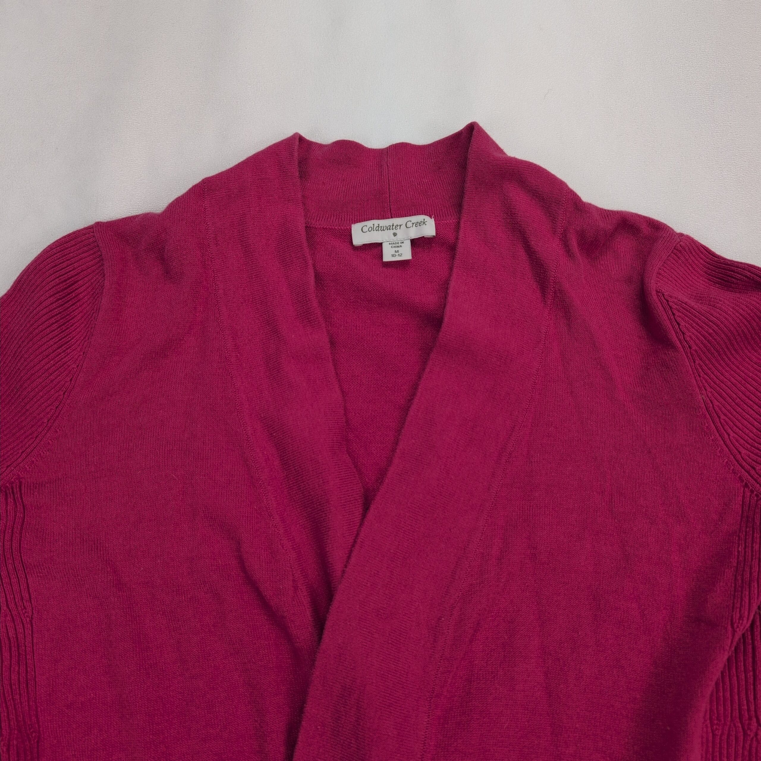 Coldwater Creek women’s open-front cardigan in size 10. Soft knit with ribbed side panels and sleeves, long sleeves, and a relaxed drape for easy layering. Color appears as deep pink (see photos).