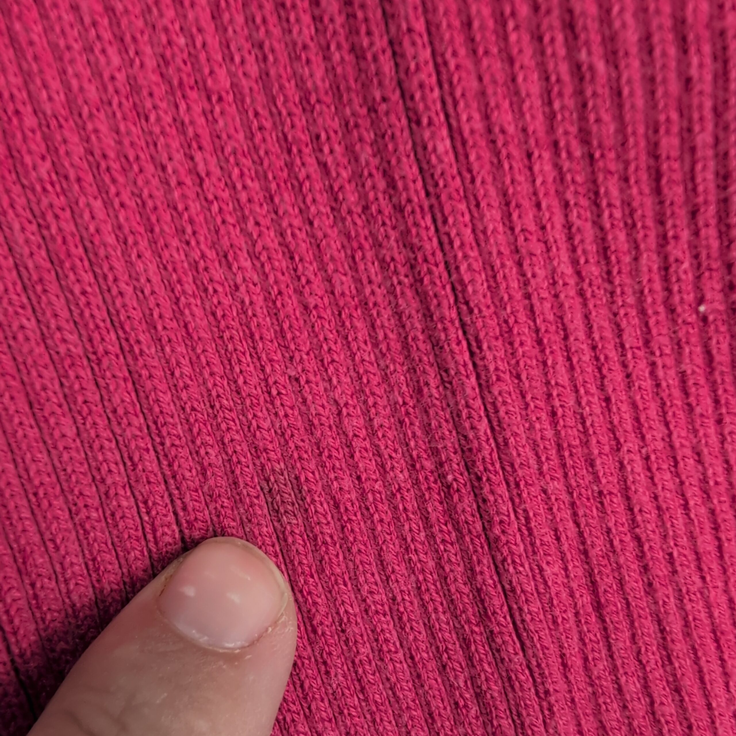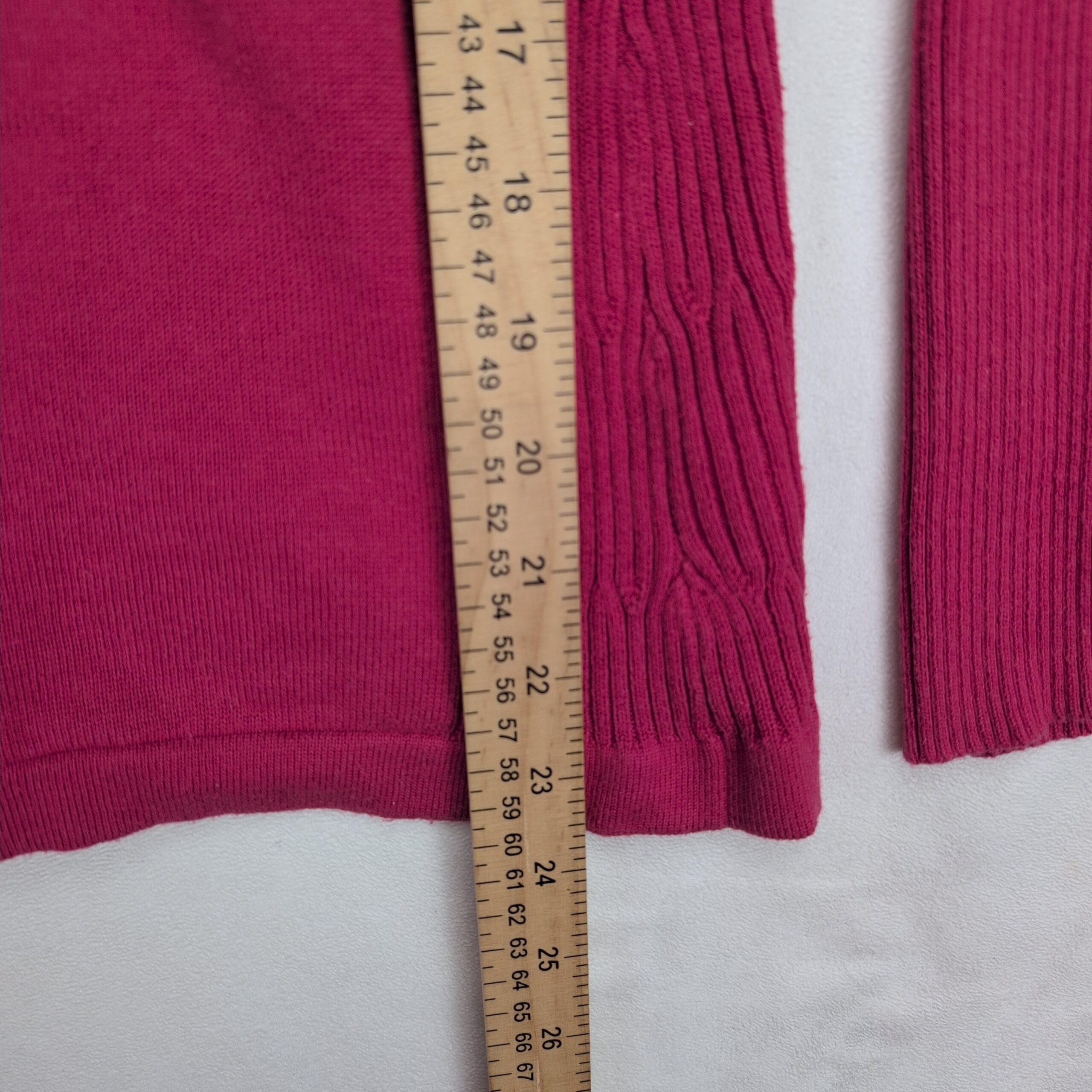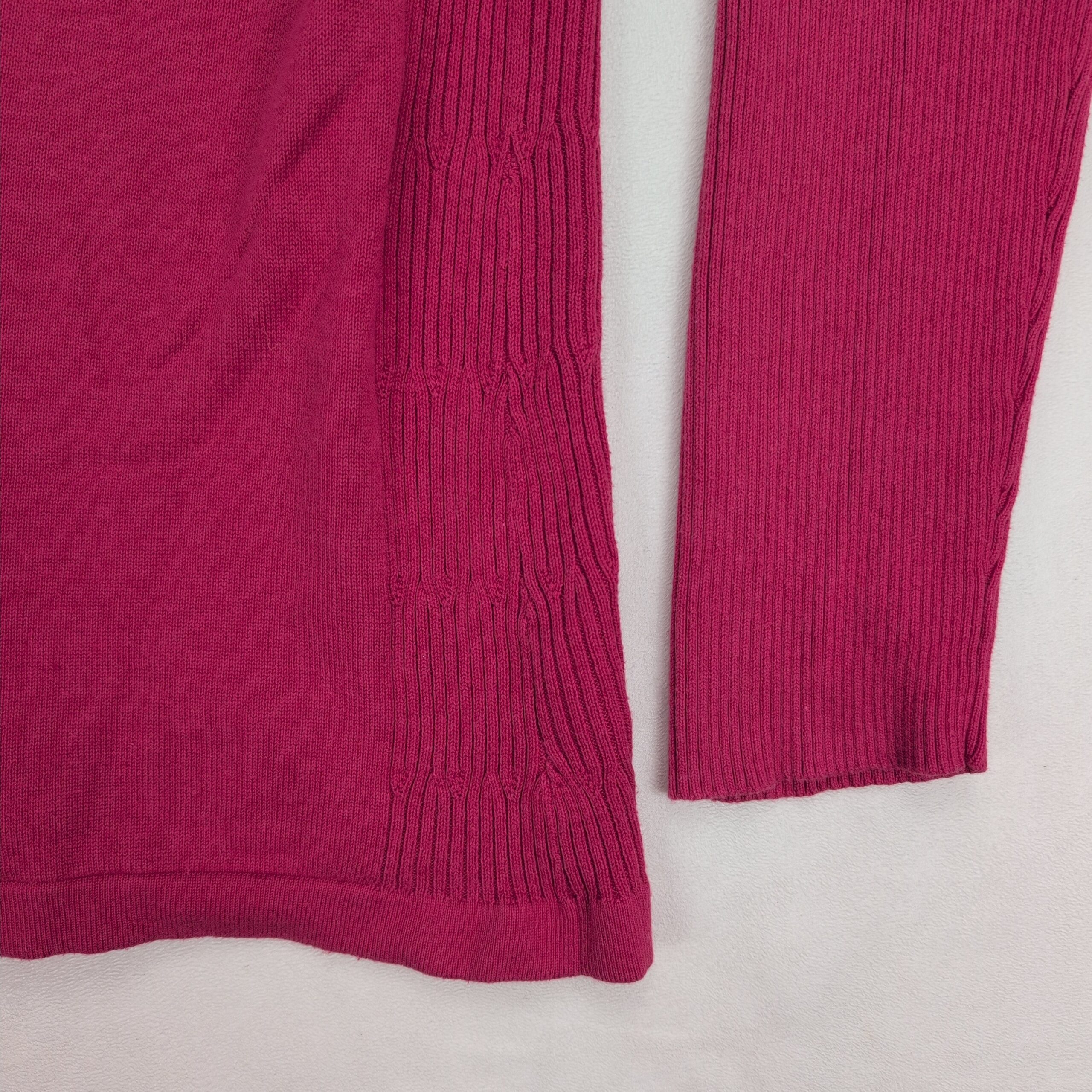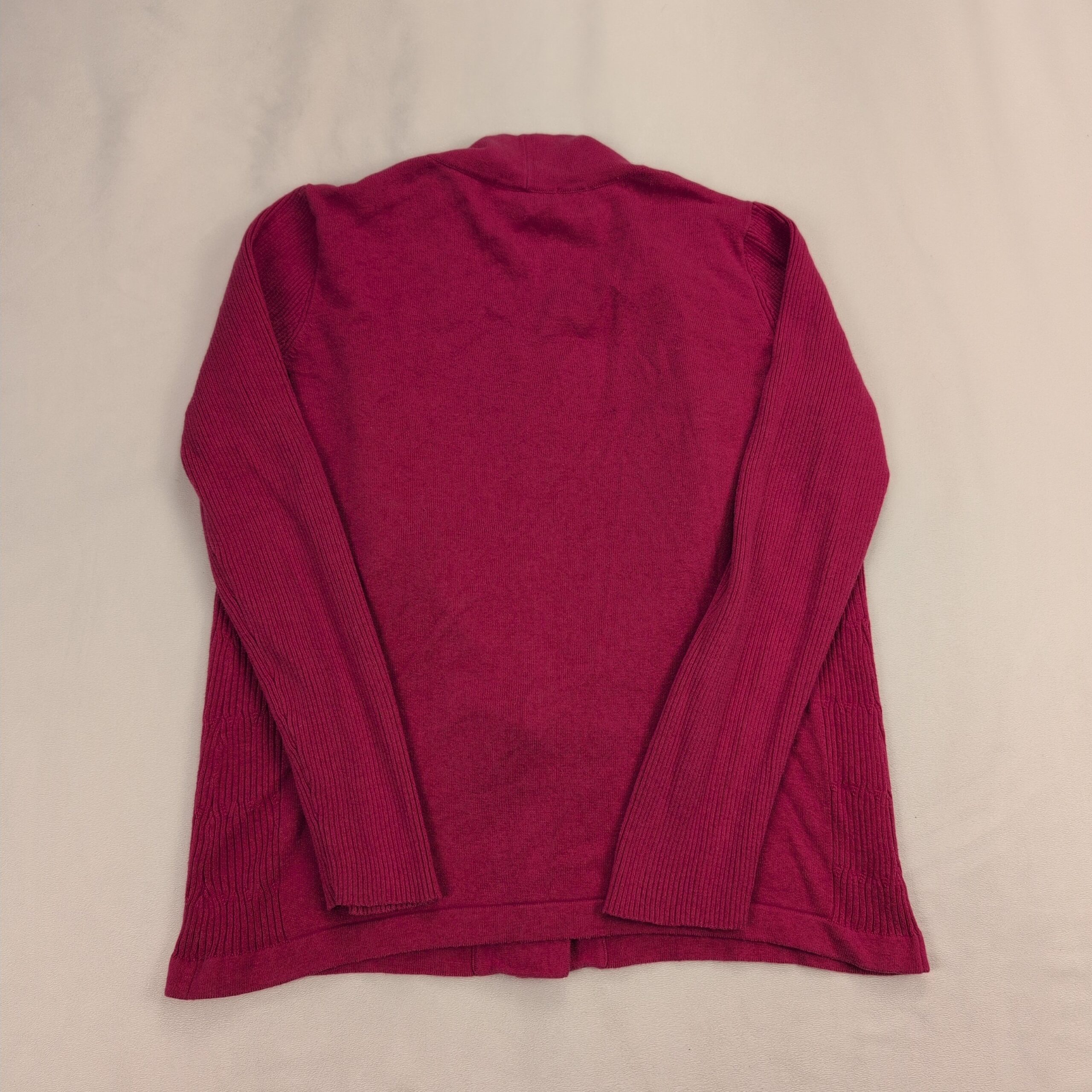 Coldwater Creek women’s open-front cardigan in size 10. Soft knit with ribbed side panels and sleeves, long sleeves, and a relaxed drape for easy layering. Color appears as deep pink (see photos).