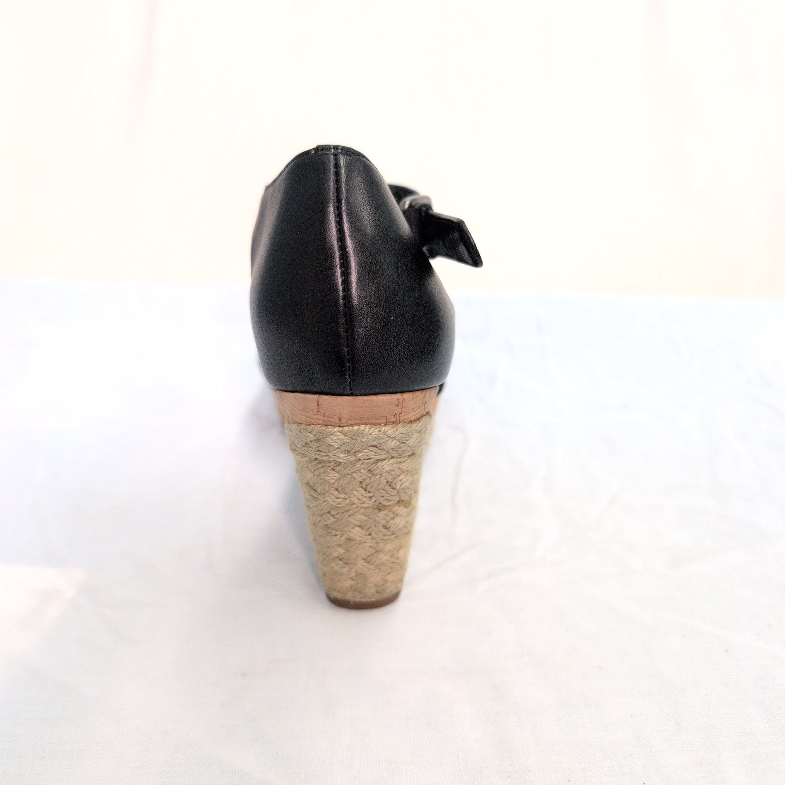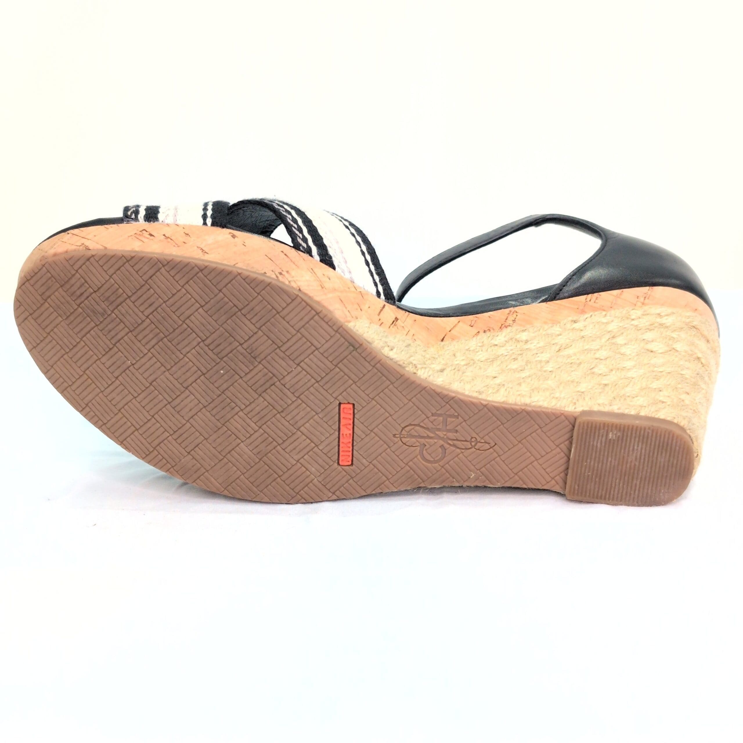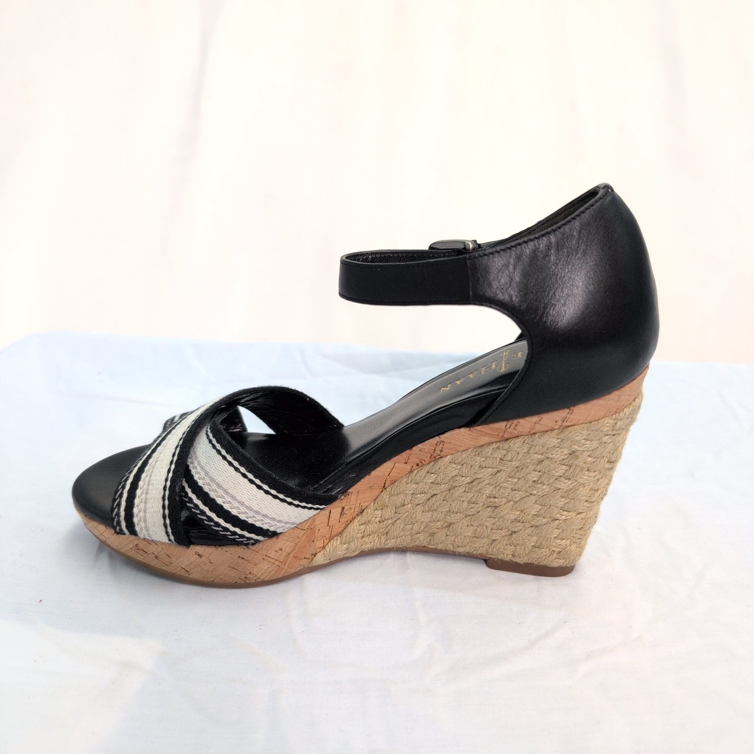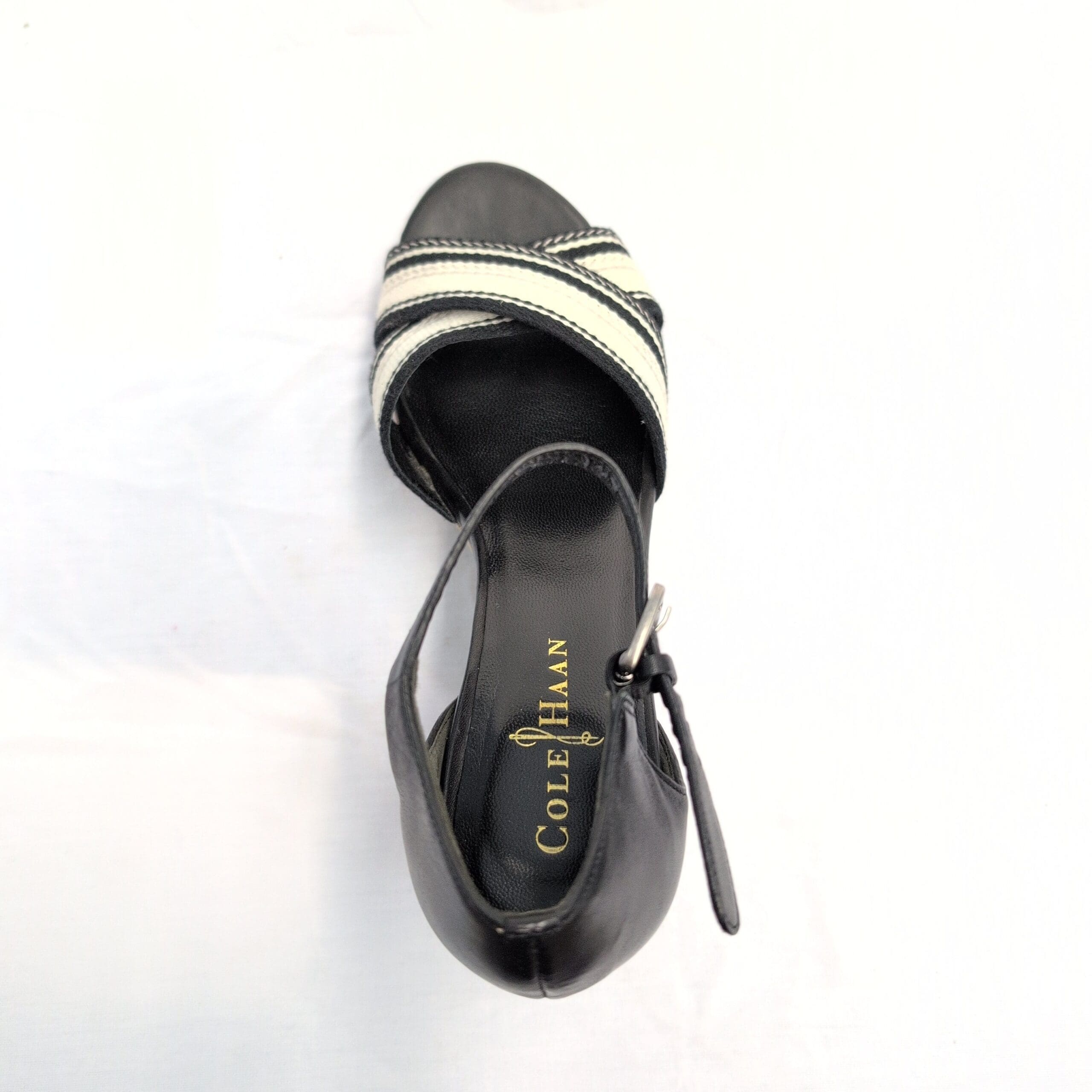Cole Haan women’s black espadrille wedge heels, size 7.5. Features a leather ankle strap with adjustable buckle, woven black-and-white crisscross front, cork-style wedge, and cushioned Nike Air sole for enhanced comfort. Gently used and free of major rips, tears, stains, or flaws; typical light wear may be present on the soles and footbed.