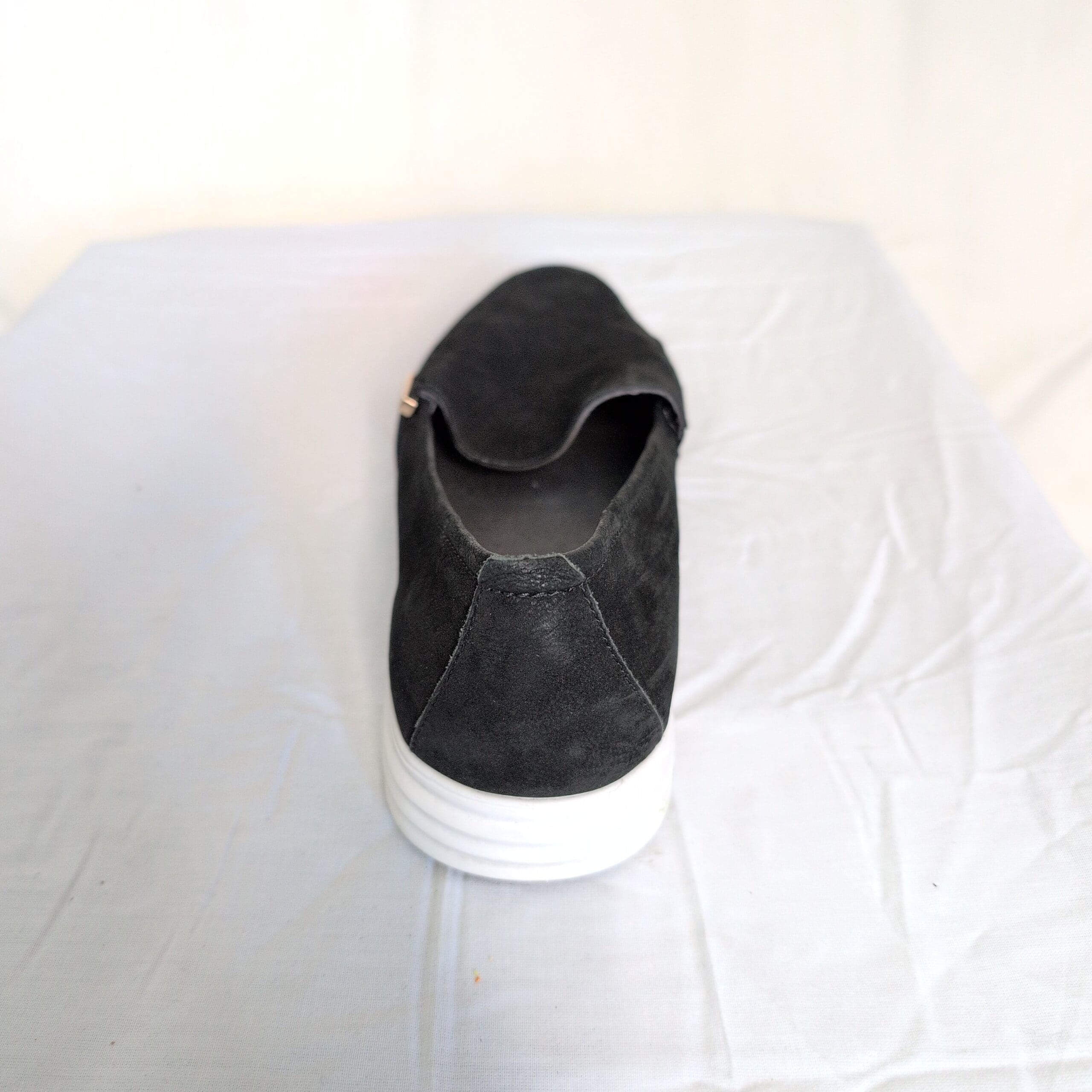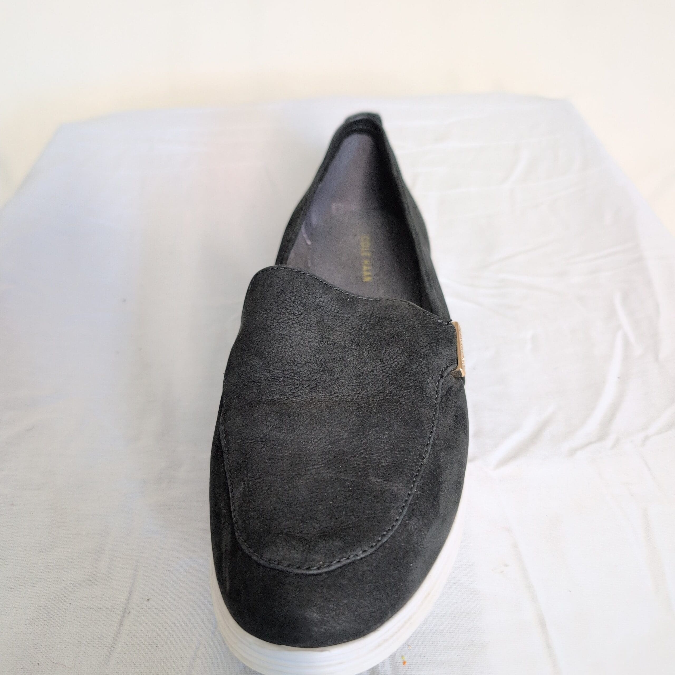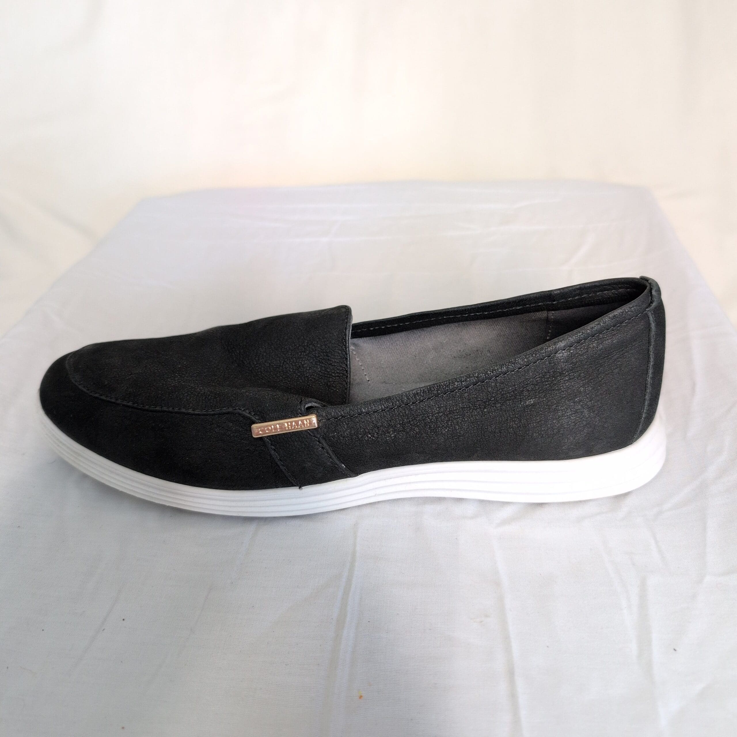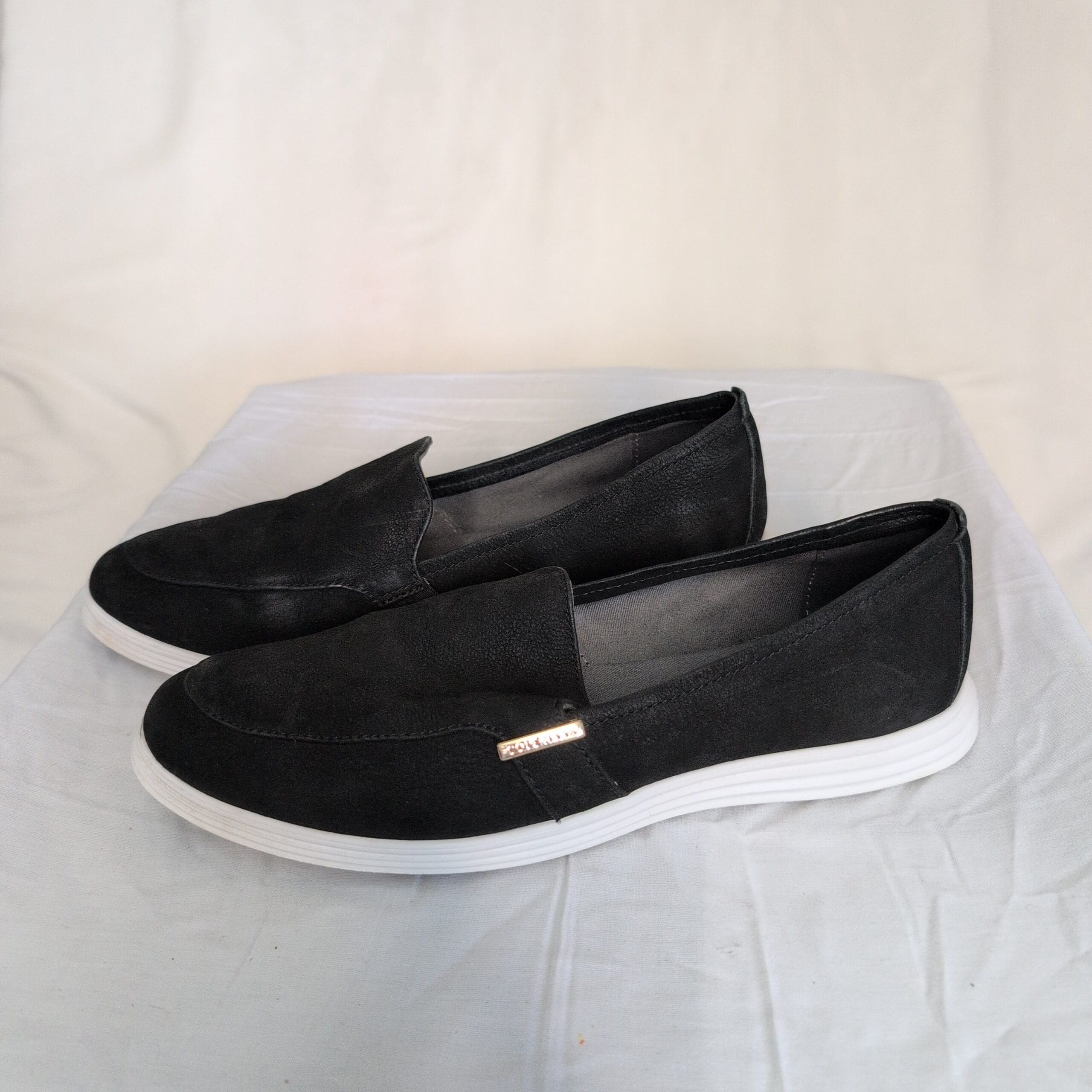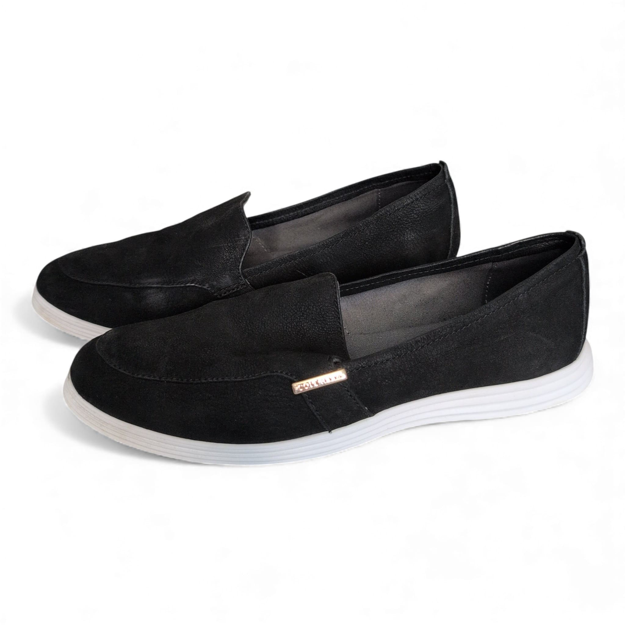 Classic Cole Haan women’s black slip-on loafers in size 9. Sleek low-profile silhouette with a white lightweight sole and a gold-tone Cole Haan logo accent at the vamp. Comfortable, versatile design great for everyday wear, commuting, or casual office looks.