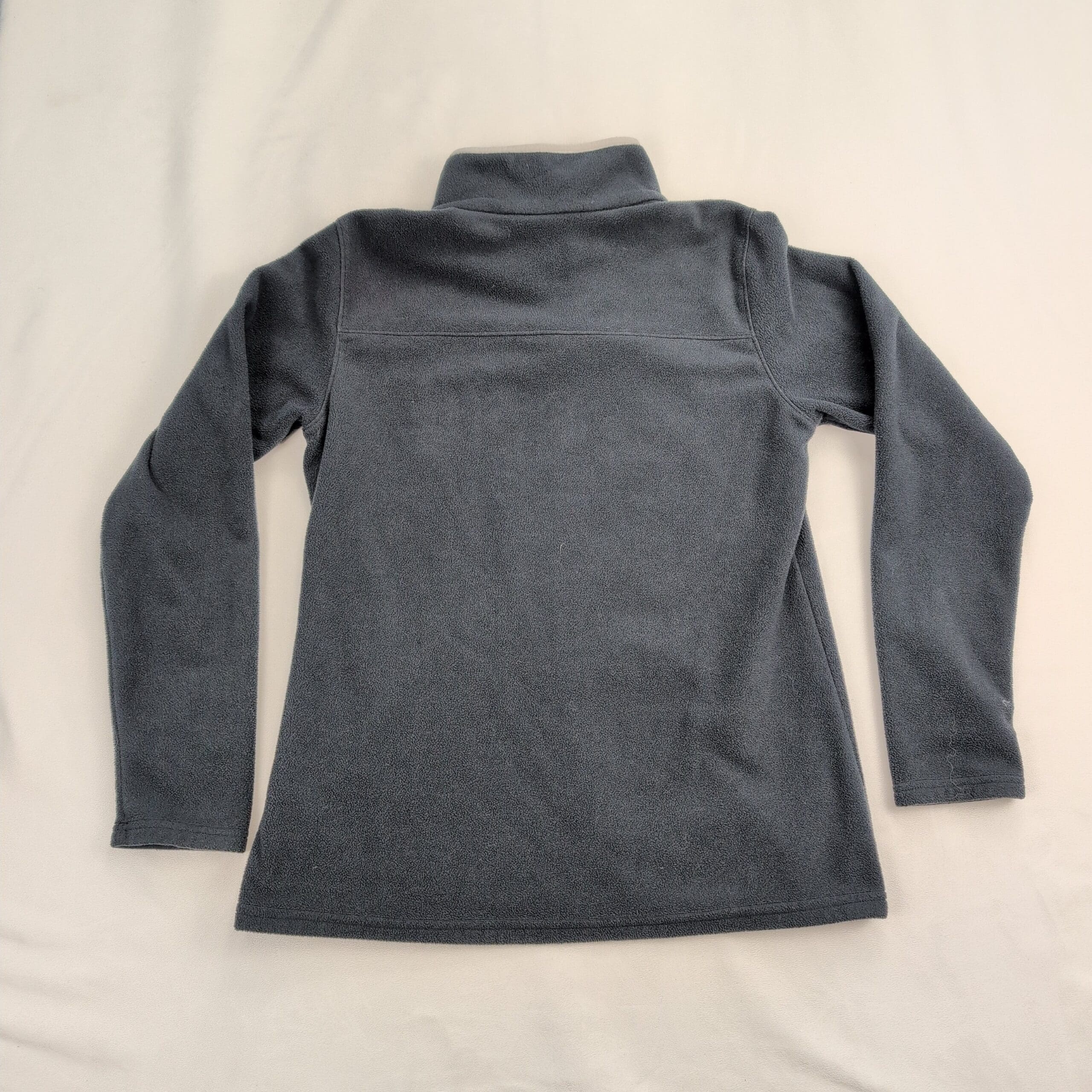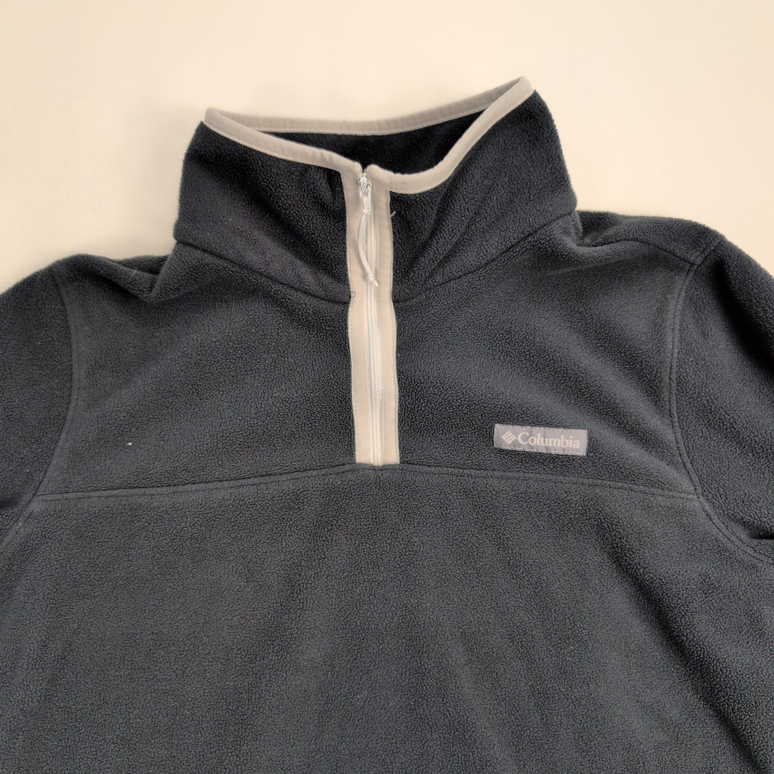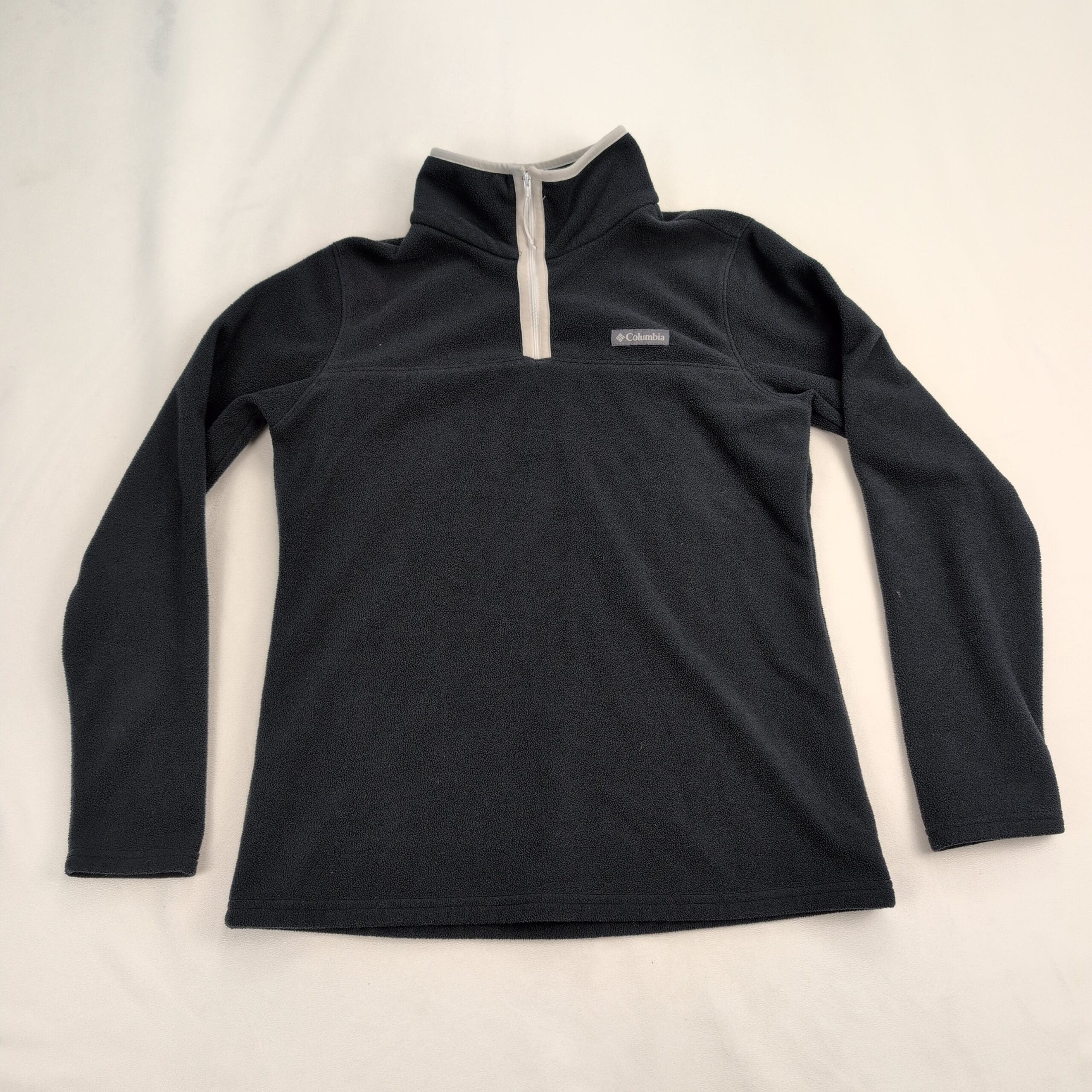Columbia men’s quarter-zip fleece pullover in size M. Dark navy/black midweight fleece with light gray zip trim and embroidered Columbia logo at chest. Stand collar and long sleeves — great for layering and everyday outdoor wear. Excellent used condition: free of major rips, tears, stains, or flaws; shows typical light wear consistent with gentle use. Tagged size: M (men).