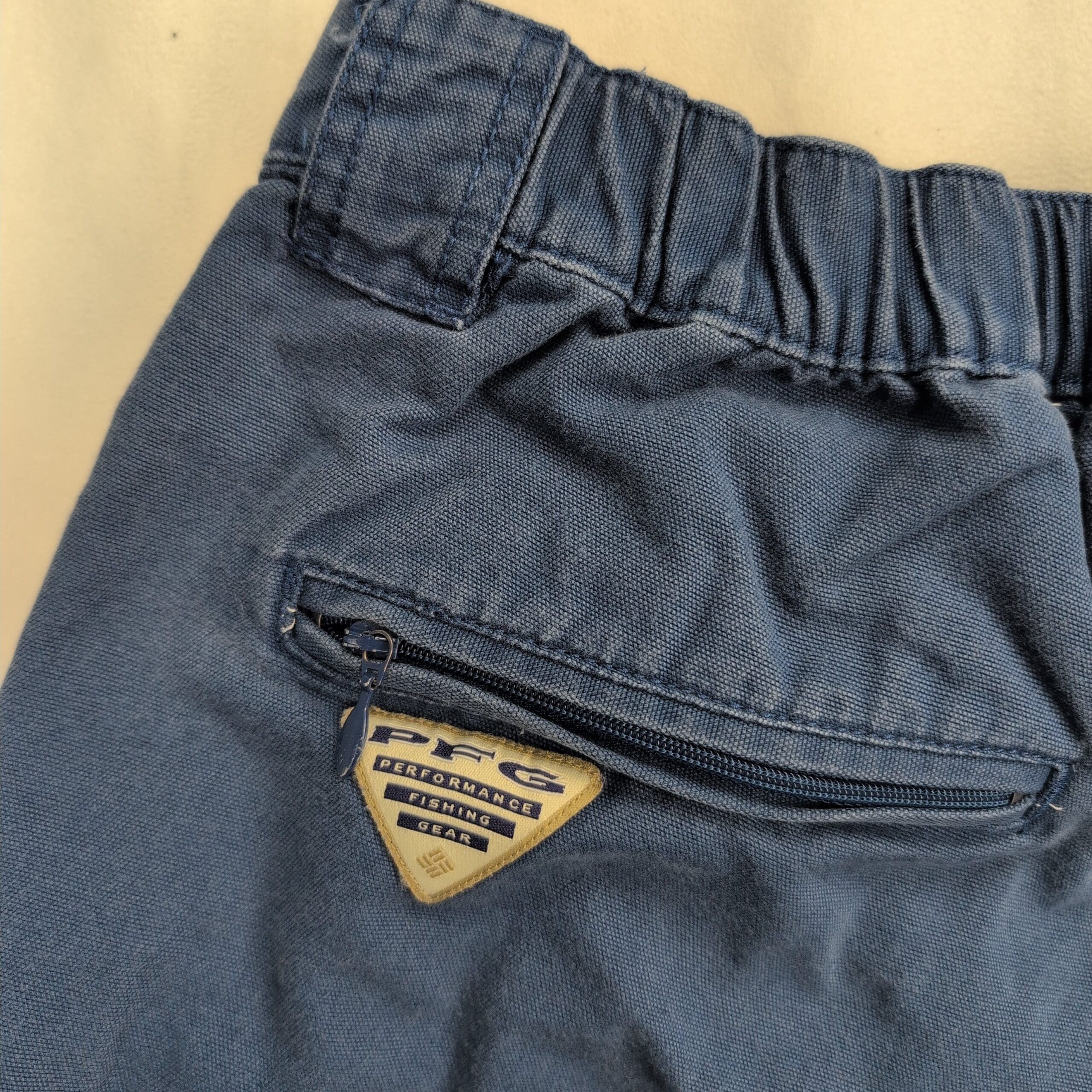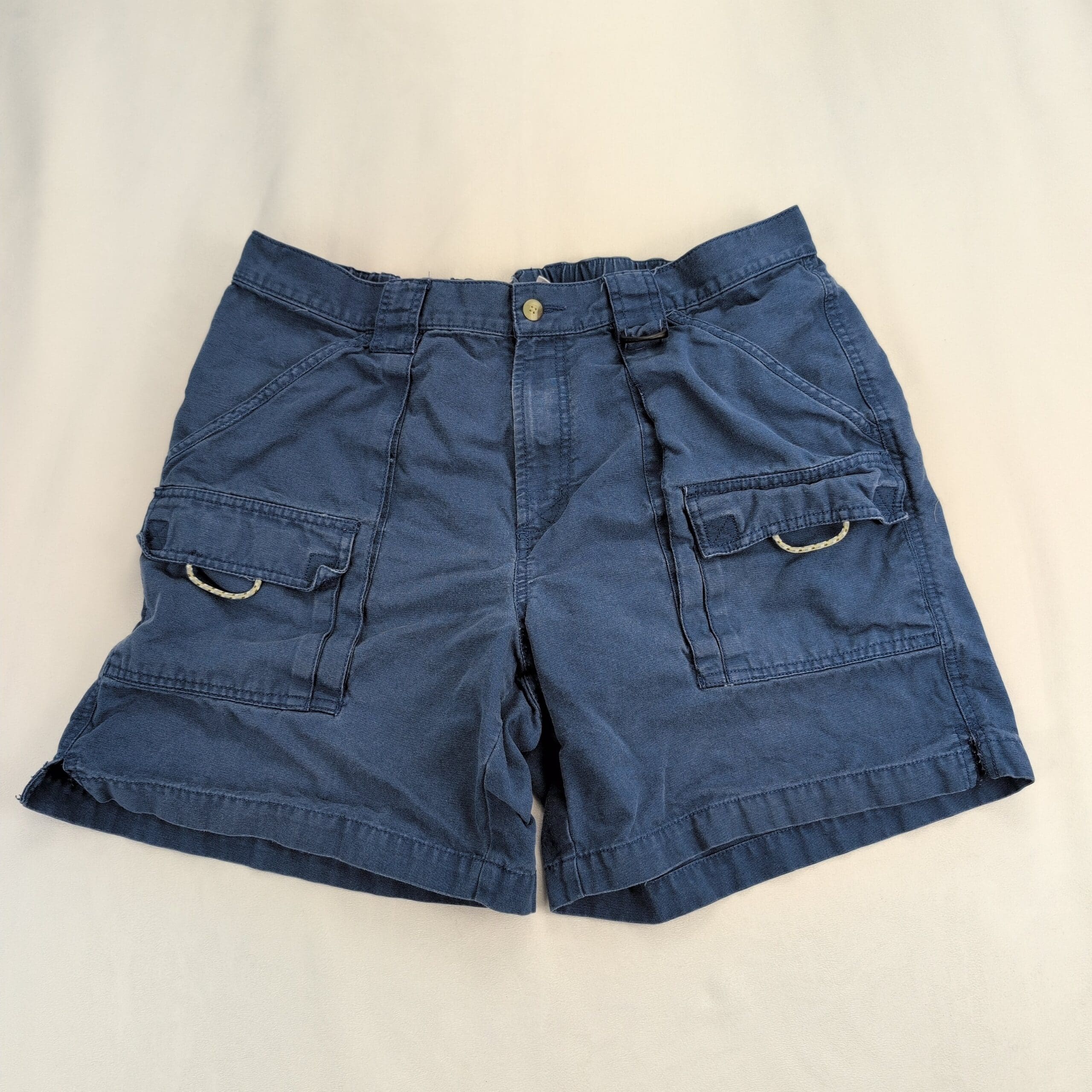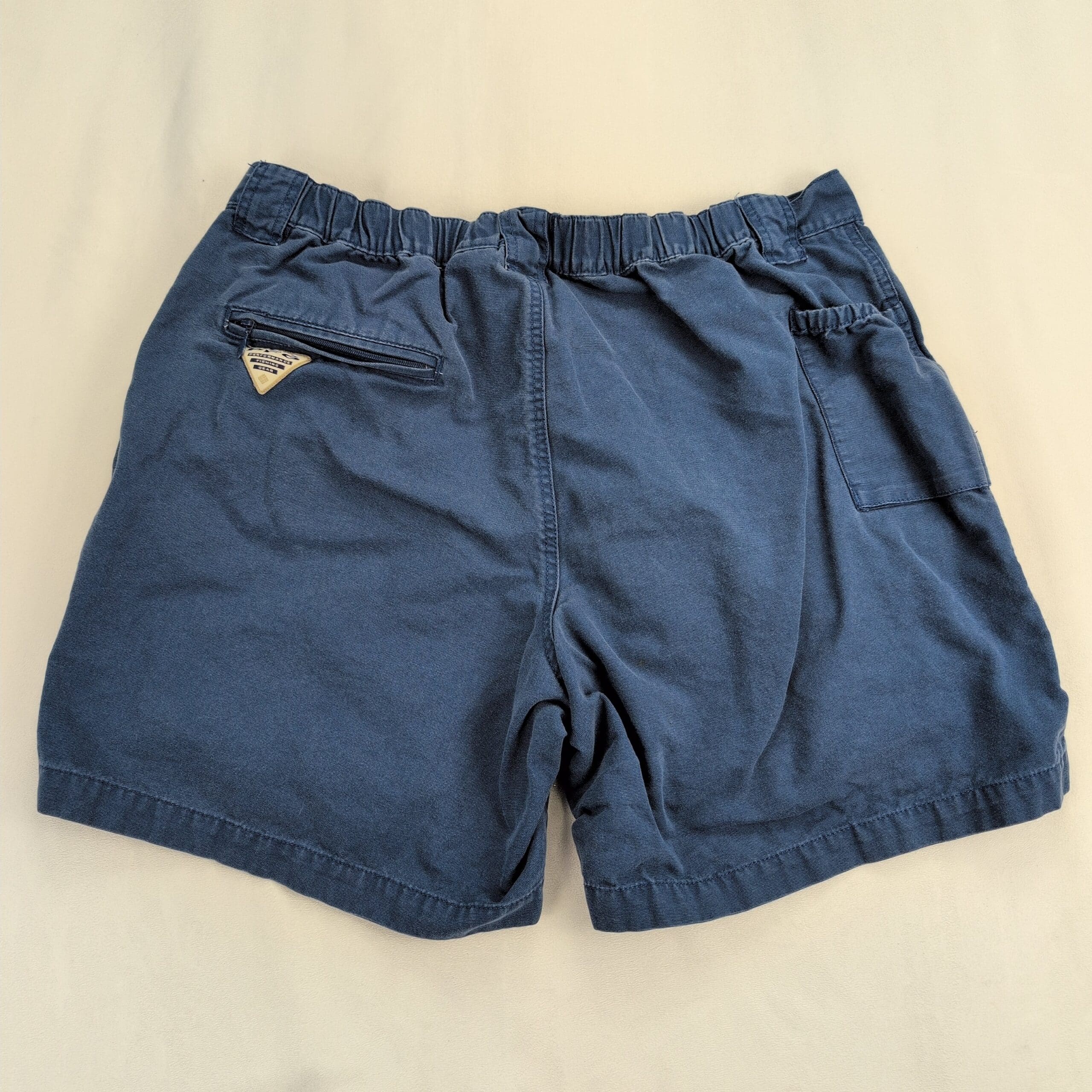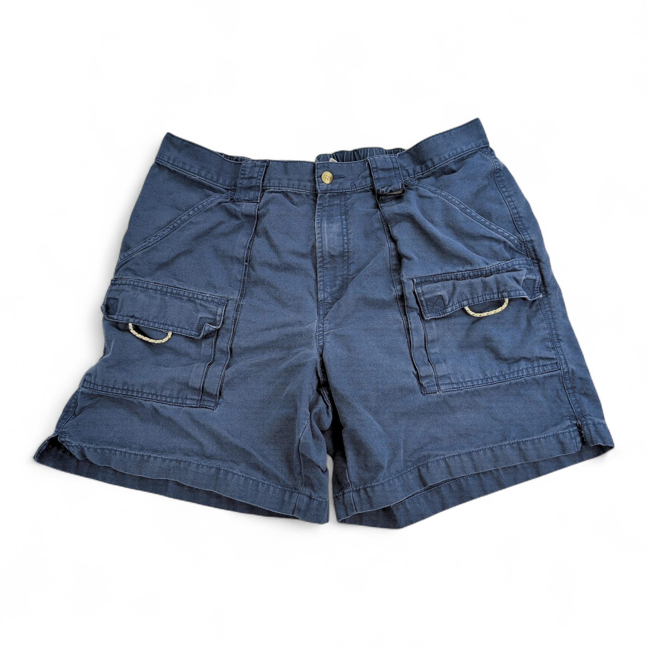 Columbia PFG men’s cargo shorts in navy, size L. Performance Fishing Gear design with multiple utility pockets — two flap cargo pockets with D-rings, slanted hand pockets, belt loops and button waist for secure fit. Rugged casual shorts great for fishing, travel, or everyday wear.