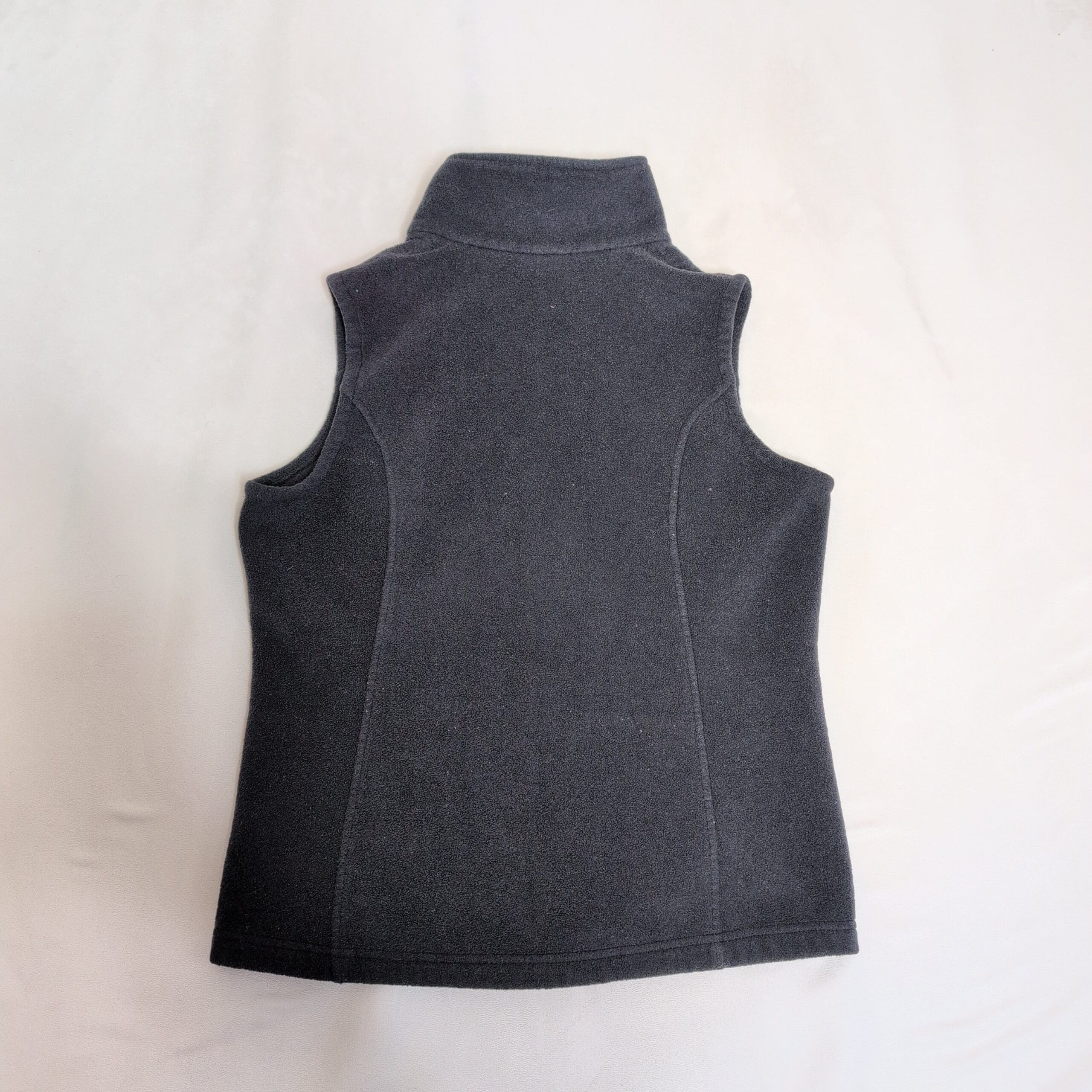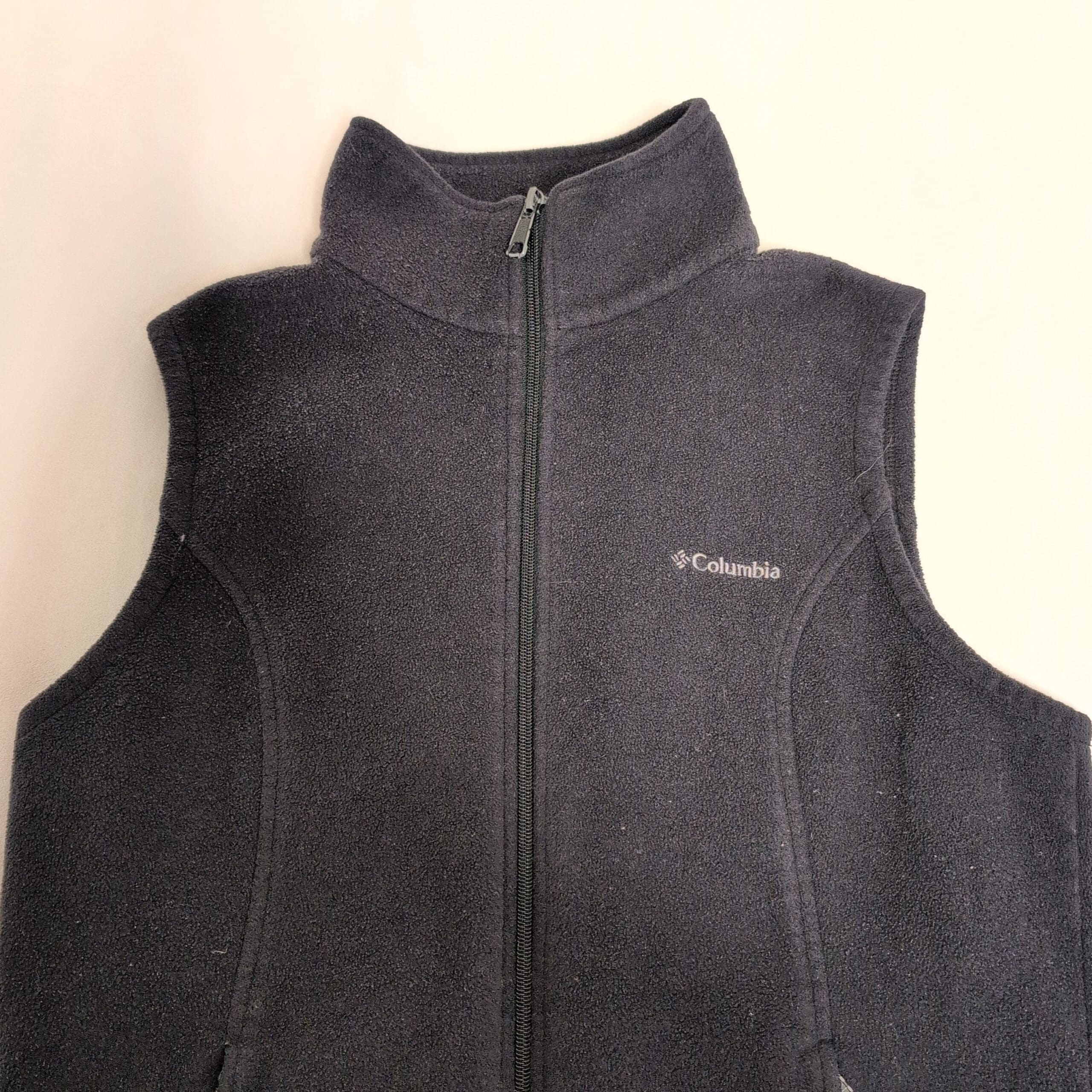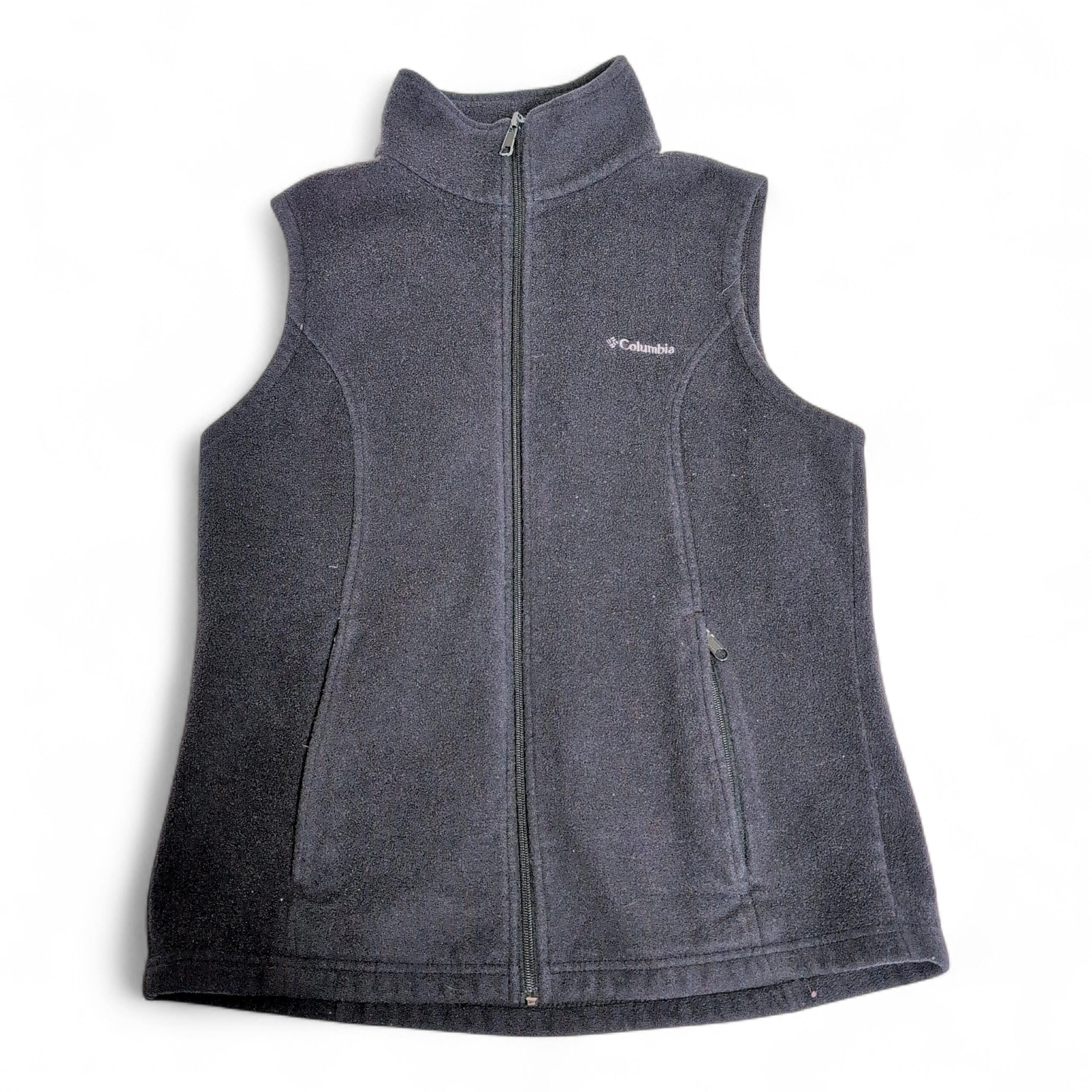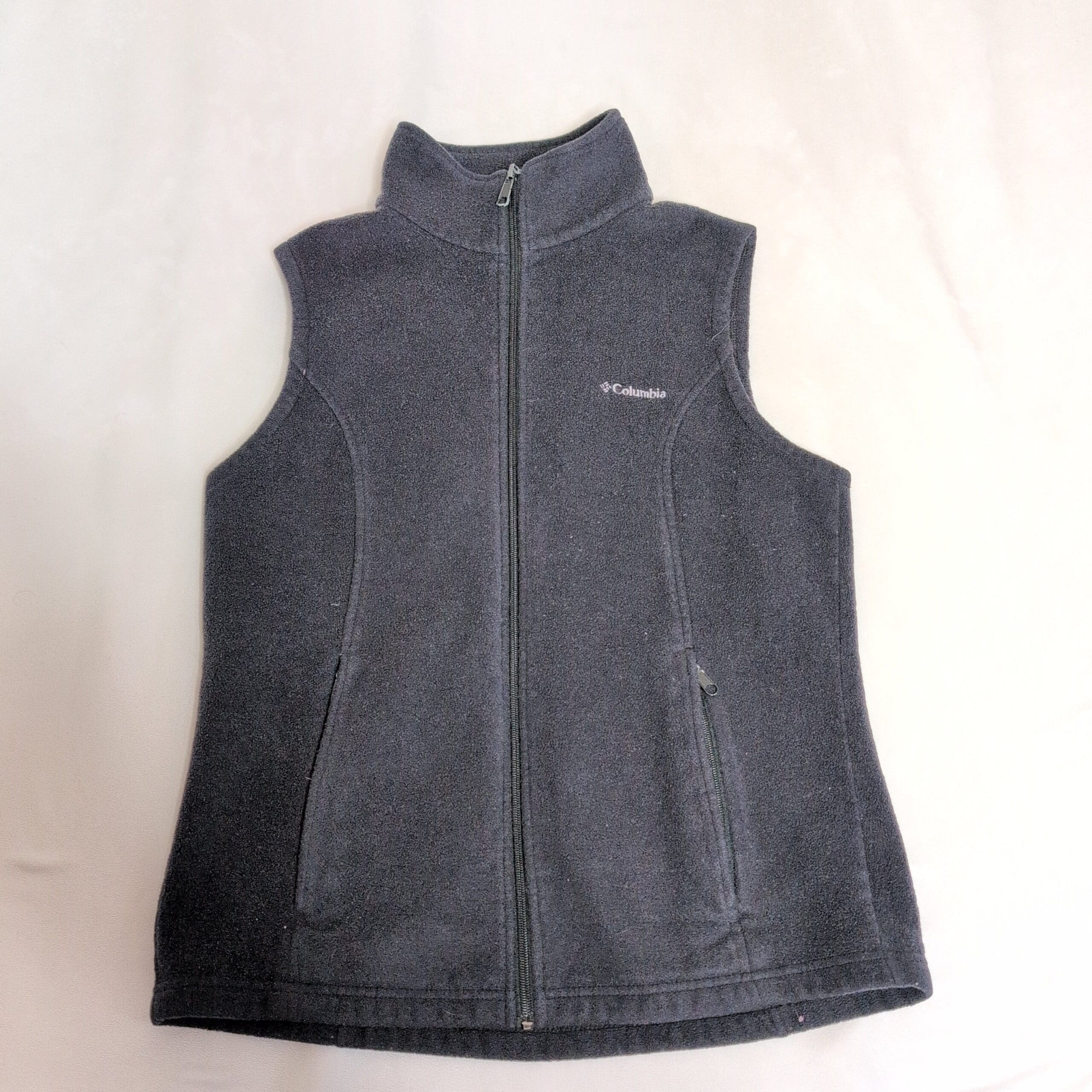 Columbia women’s black fleece vest in size L. Soft midweight fleece with a stand collar and full-length front zipper for easy layering. Features zippered hand pockets, subtle embroidered Columbia logo on the chest, and princess seams for a streamlined, flattering silhouette. Gently used — free of major rips, tears, stains, or flaws; typical light wear from normal use may be present. Ideal for layering on hikes, travel, or everyday casual wear.