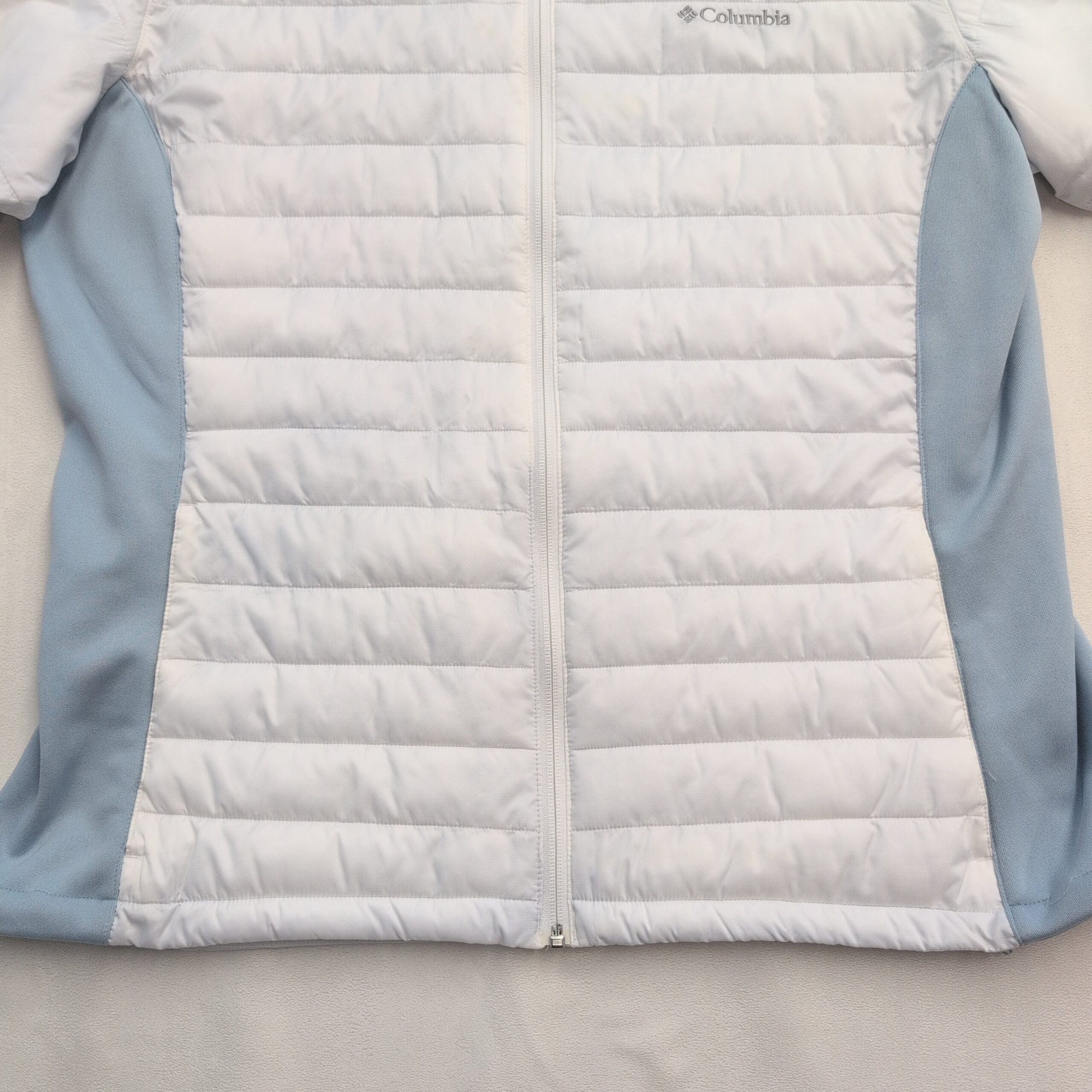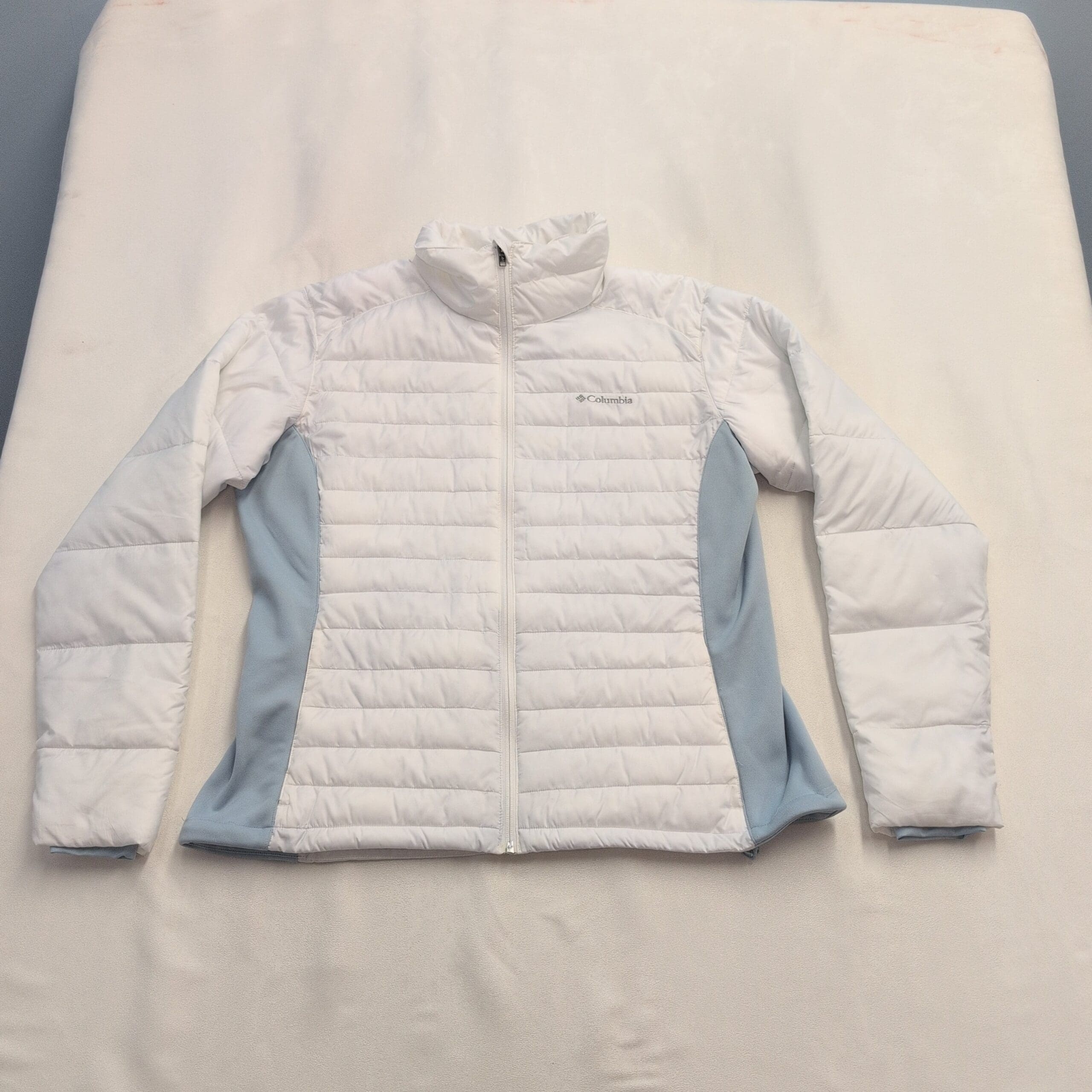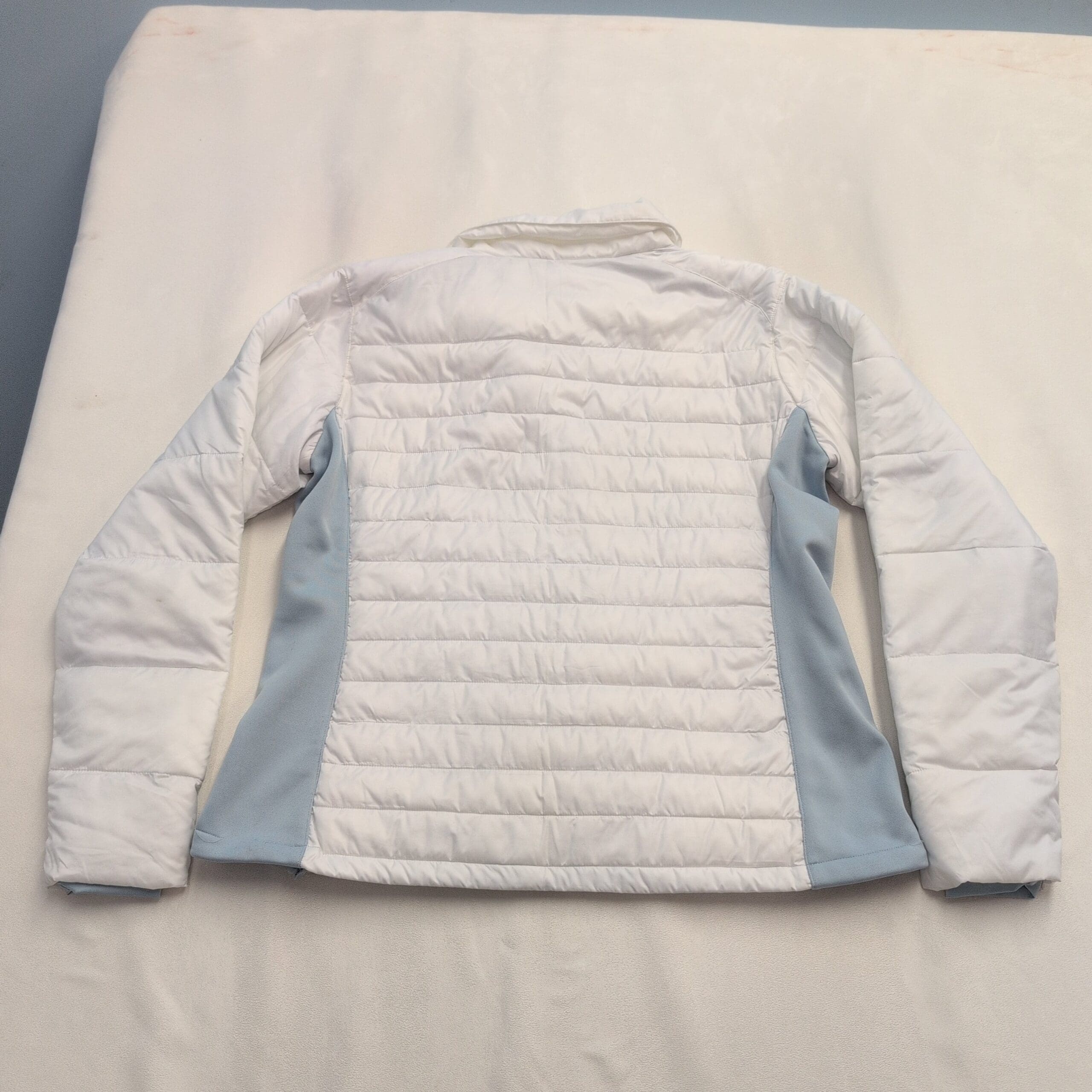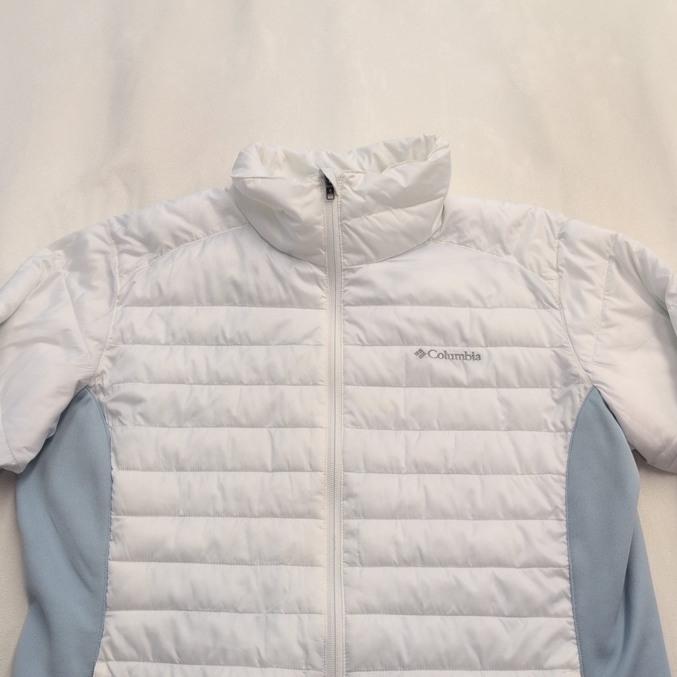 Columbia women’s insulated ski/snow jacket in white with light blue stretch side panels. Size: L (missing size tag but measures about a large). Excellent used condition with typical wear; very faint discoloration spot on the front as pictured. Features full-length zipper, stand collar, horizontal quilted insulation, and stretch side panels for mobility. Columbia logo on chest. See flat-lay measurements and photos for fit and condition details.