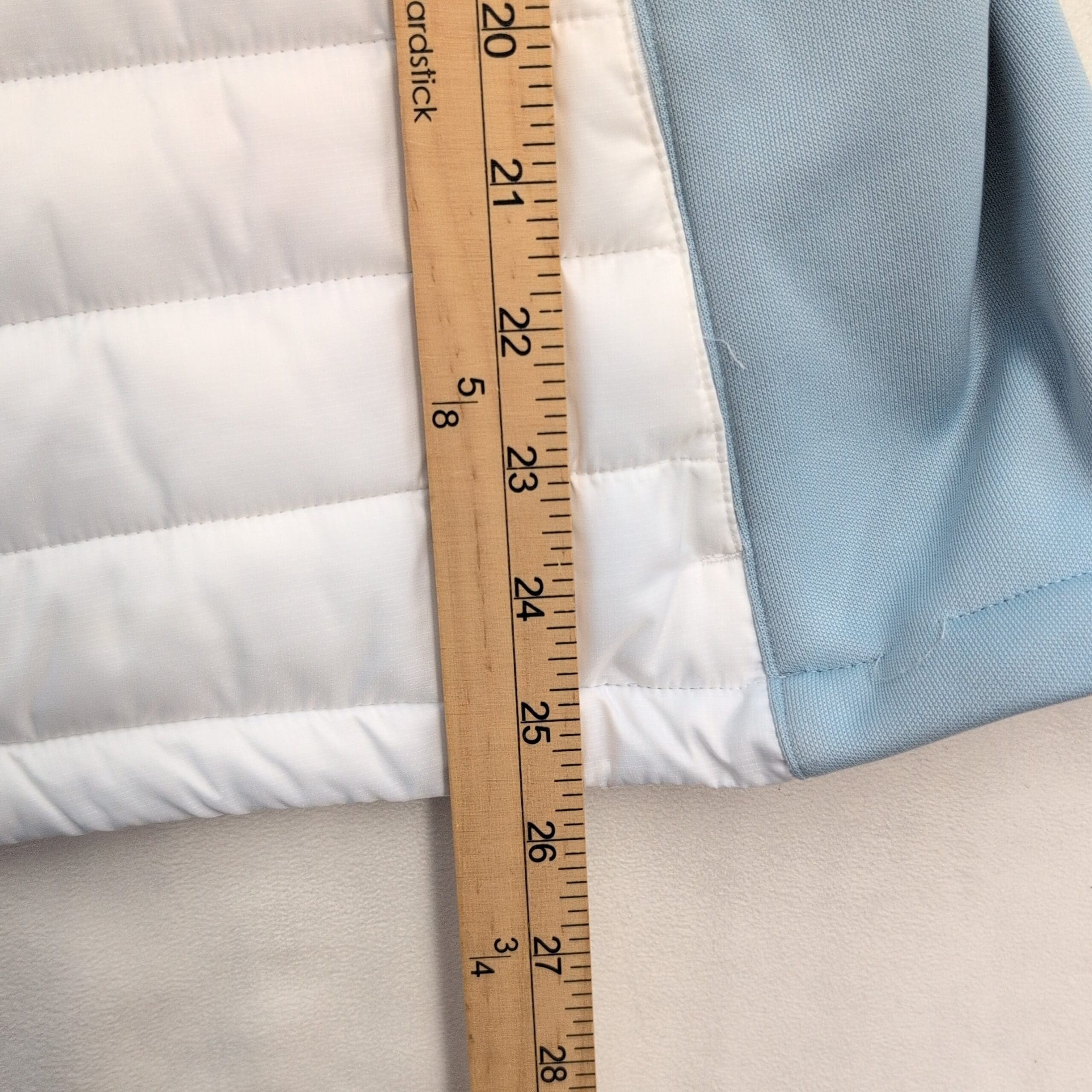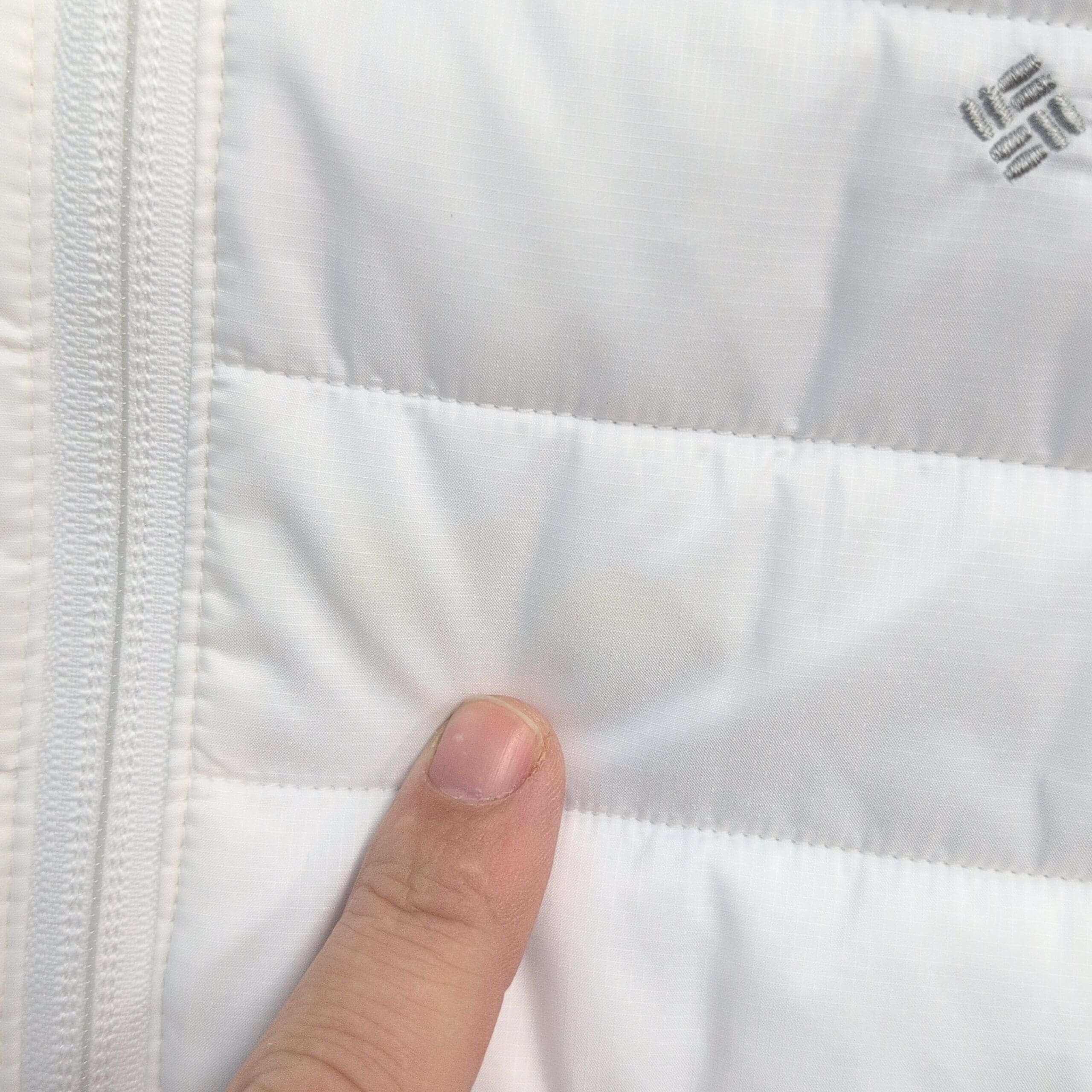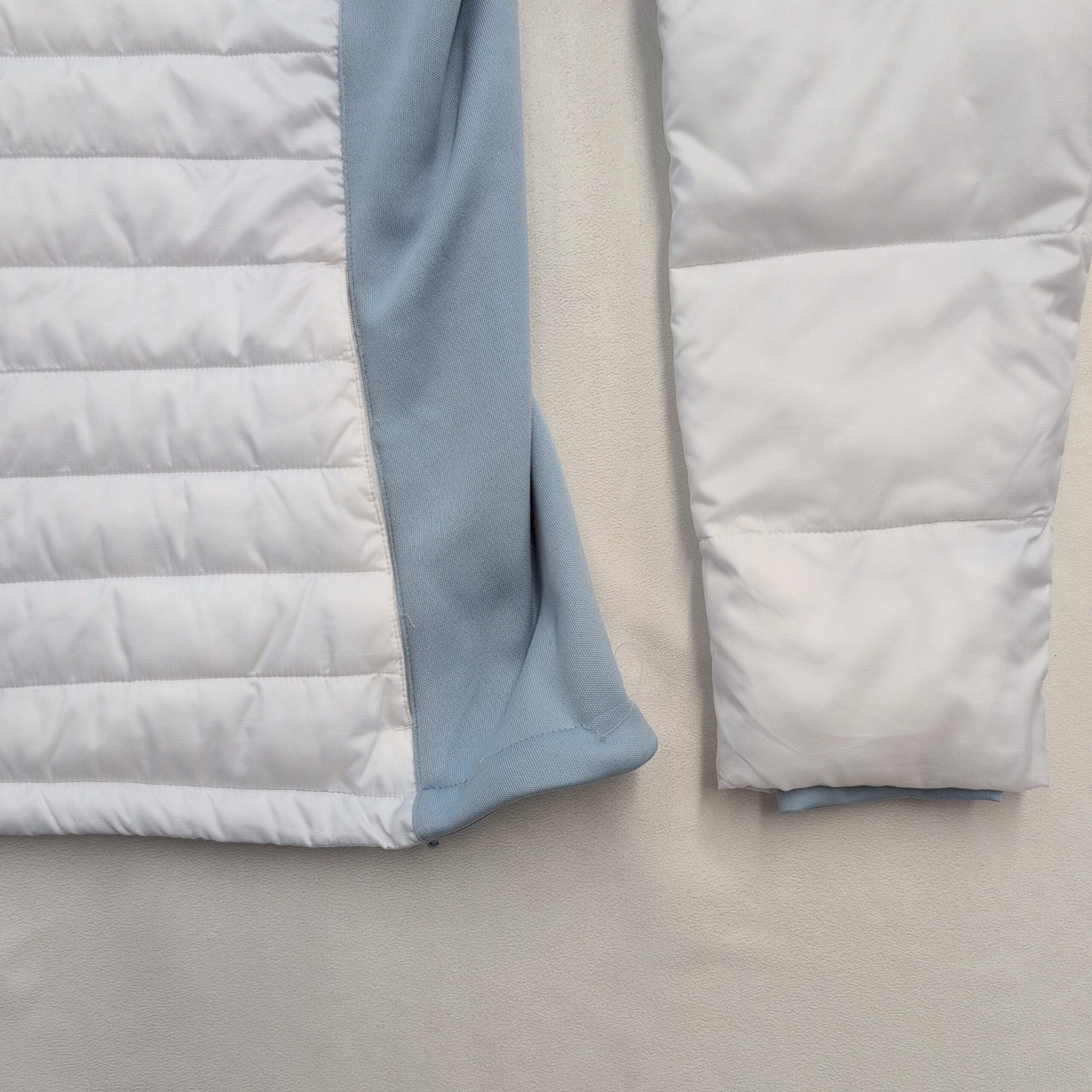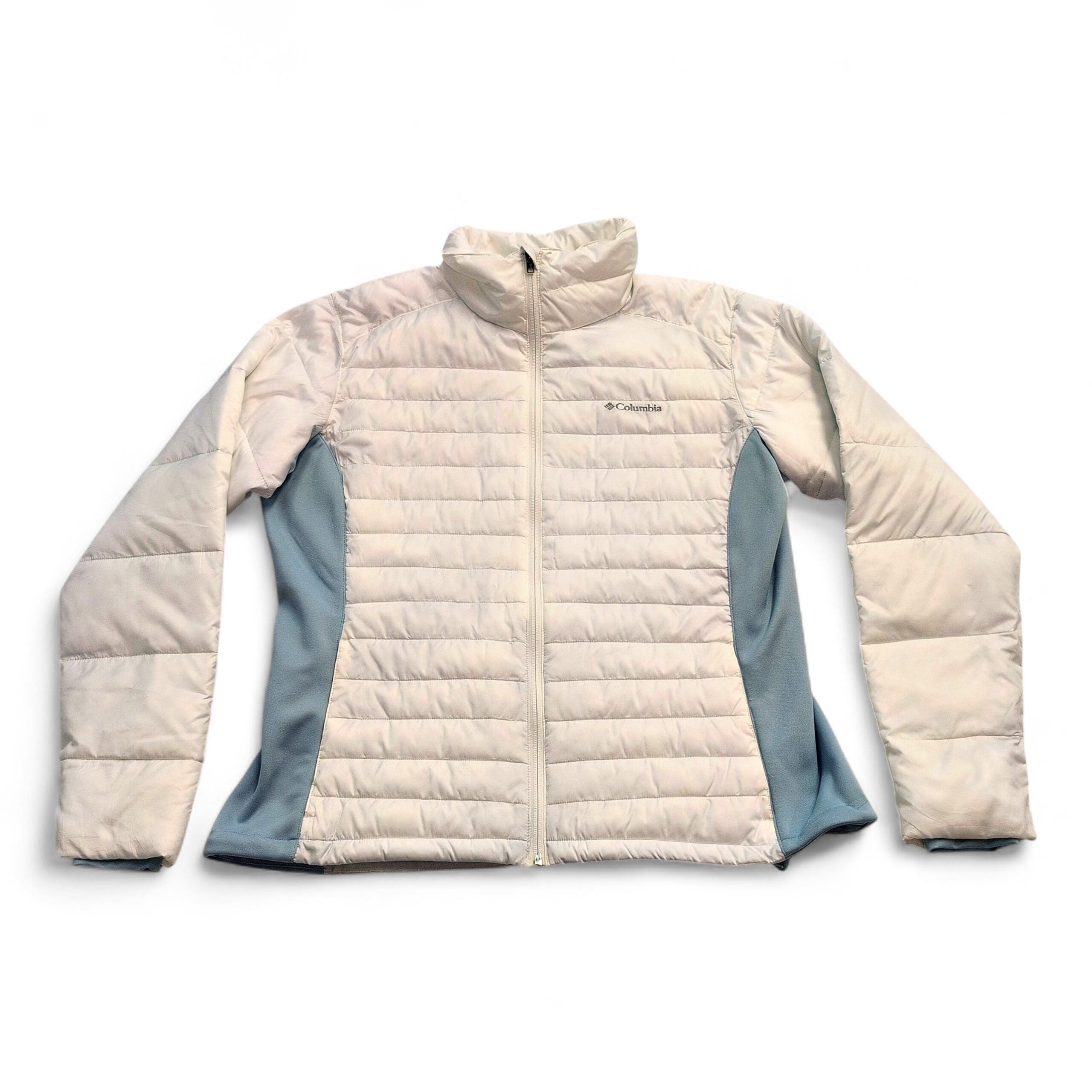 Columbia women’s insulated ski/snow jacket in white with light blue stretch side panels. Size: L (missing size tag but measures about a large). Excellent used condition with typical wear; very faint discoloration spot on the front as pictured. Features full-length zipper, stand collar, horizontal quilted insulation, and stretch side panels for mobility. Columbia logo on chest. See flat-lay measurements and photos for fit and condition details.