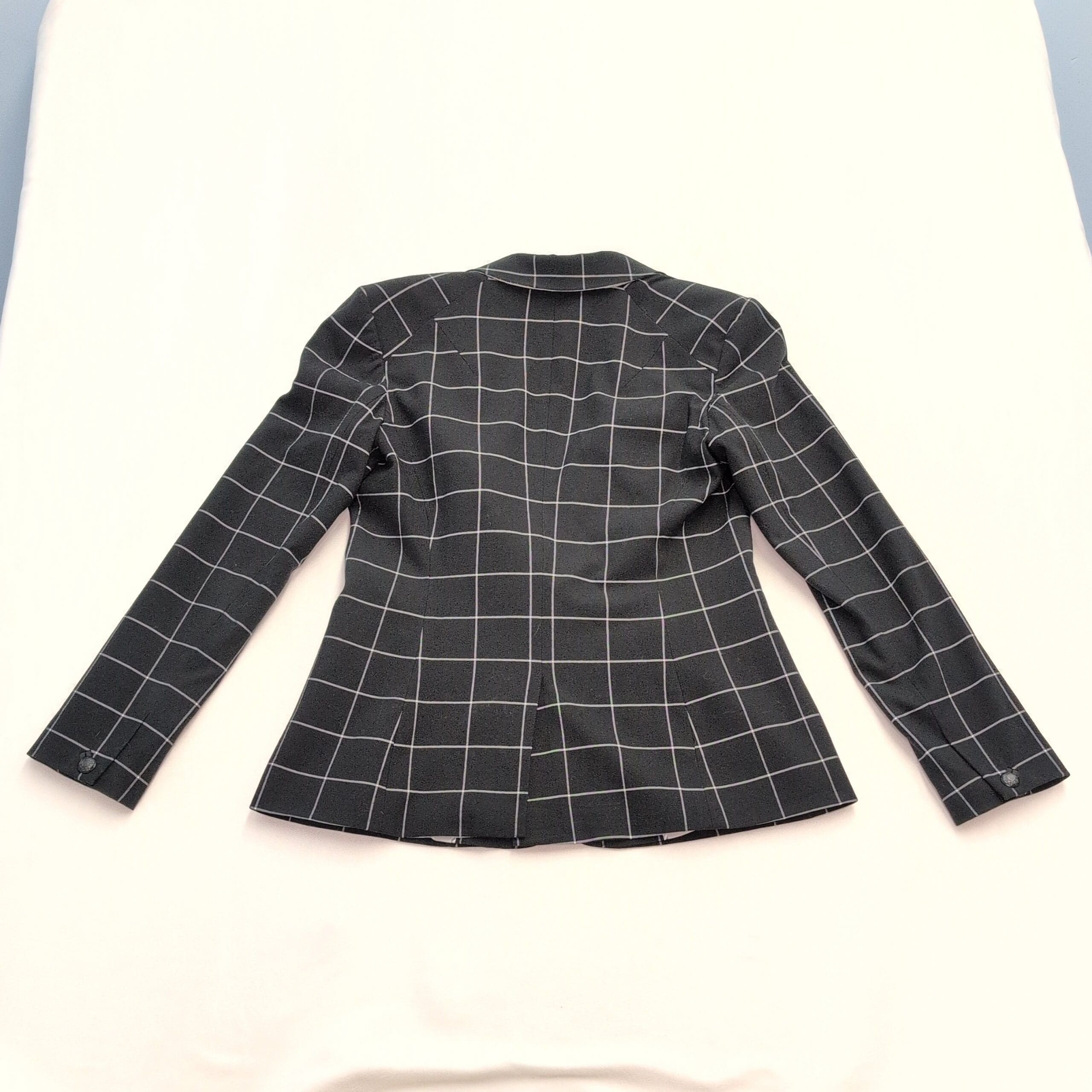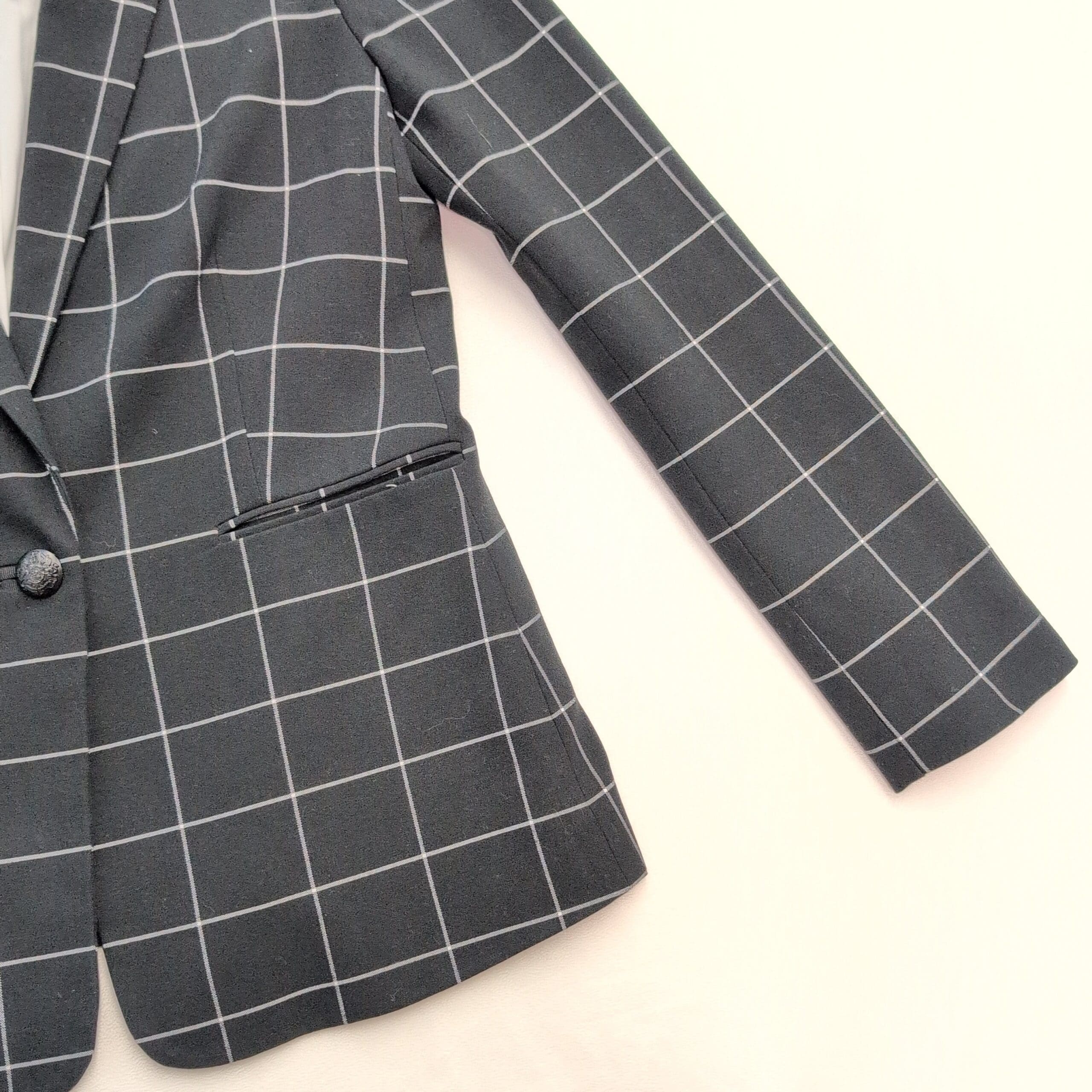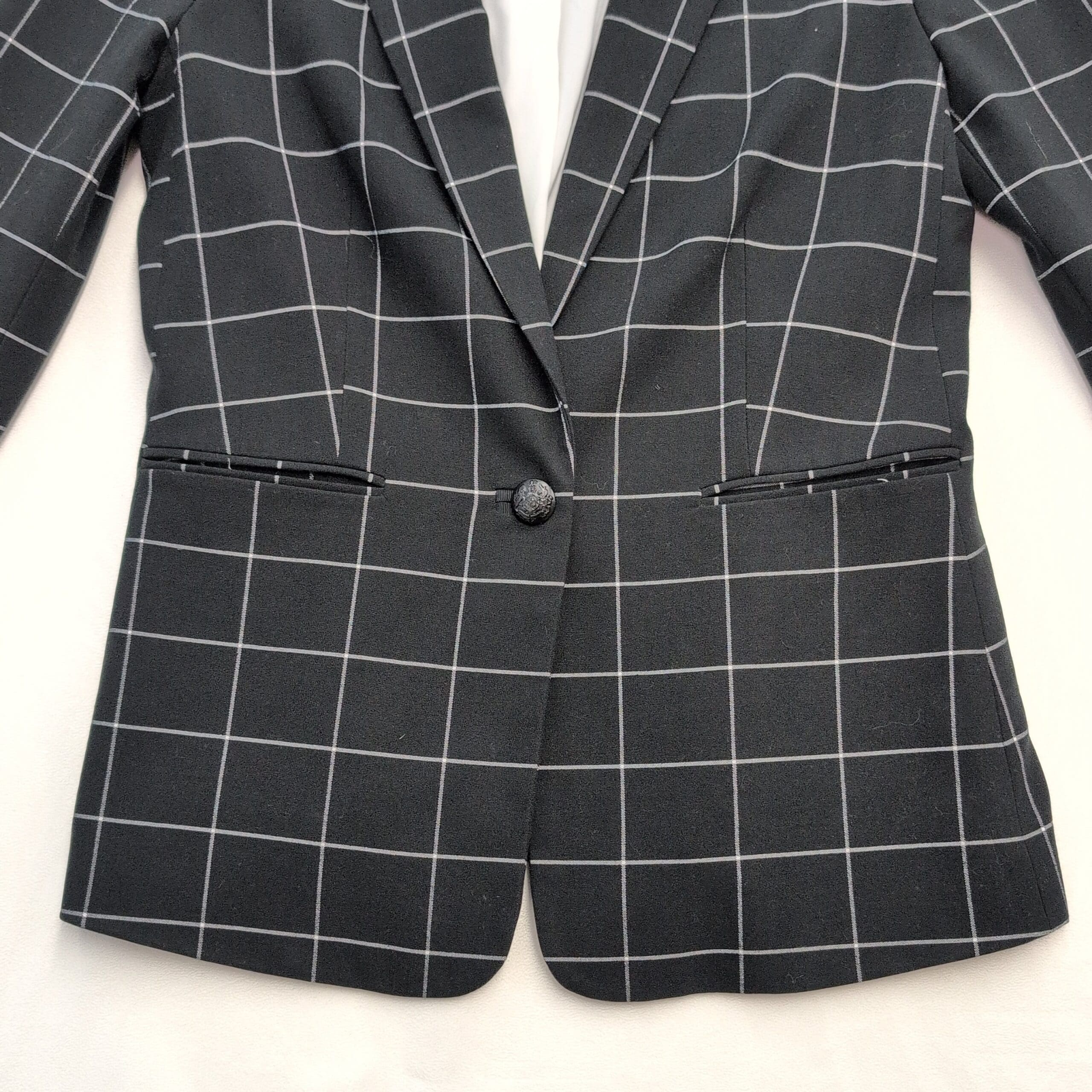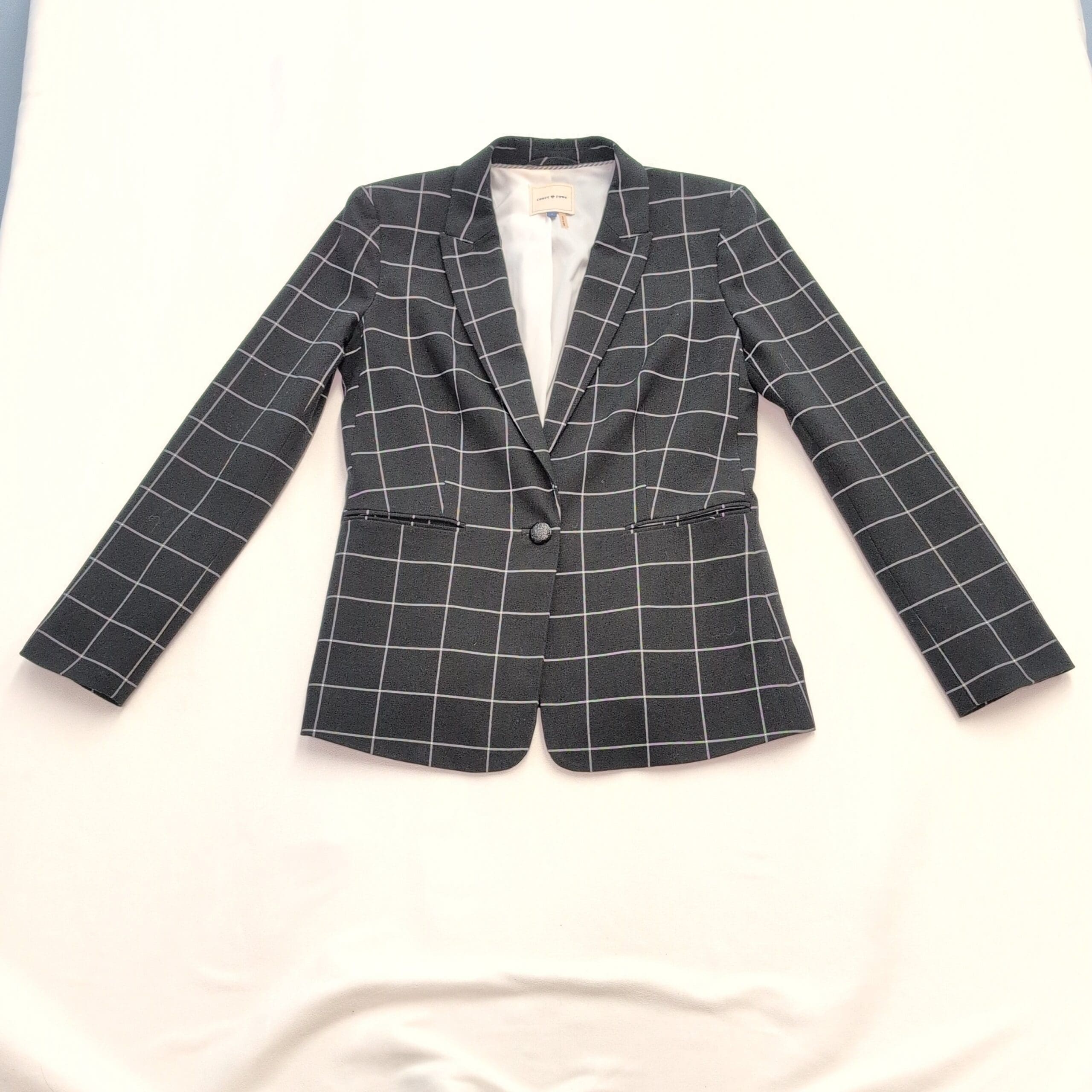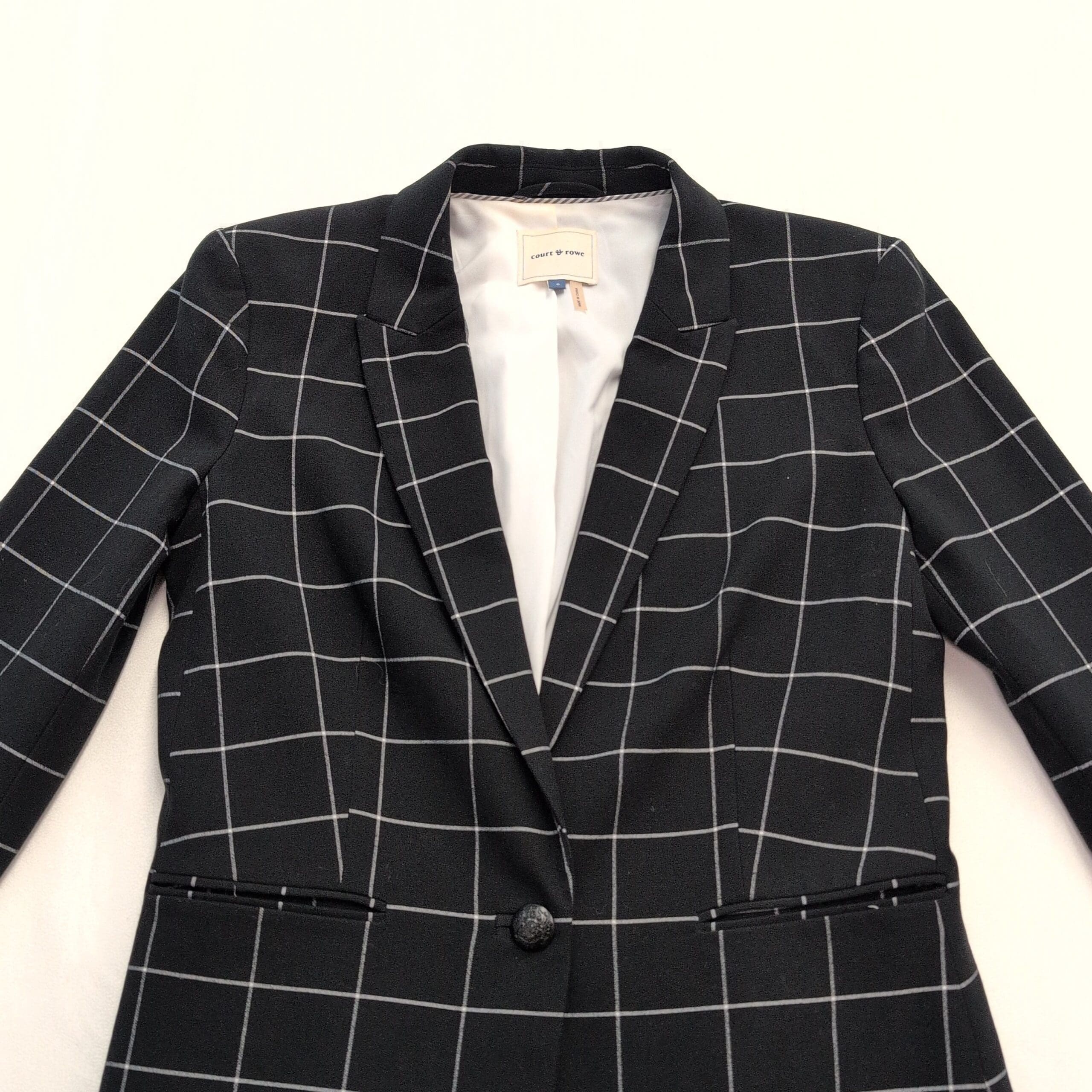 Classic Court & Rowe tailored women’s blazer in black with a white windowpane check. Features a single-button front, notch lapel, long sleeves, two welt pockets, and a fully lined interior for structure and a polished, fitted silhouette. Size 6 (standard). Excellent used condition — free of major rips, tears, stains, or noticeable flaws; typical light wear may be present. See garment tag for fabric content and care instructions. Versatile for office, interviews, or smart-casual outfits.